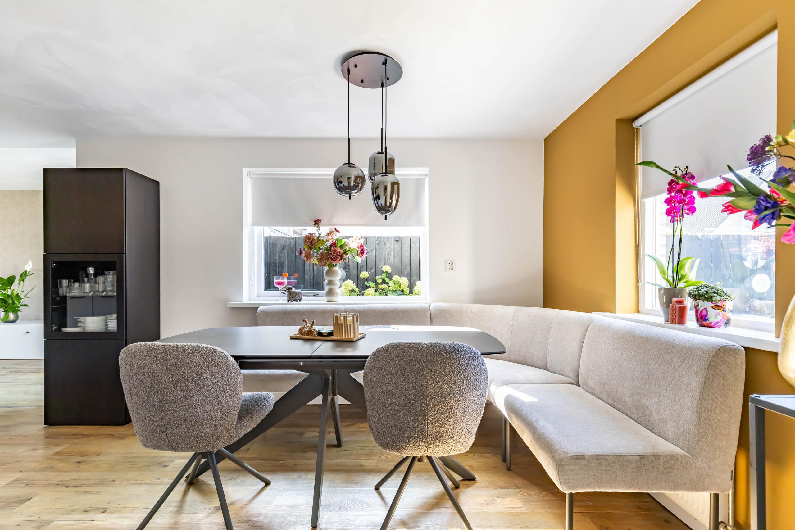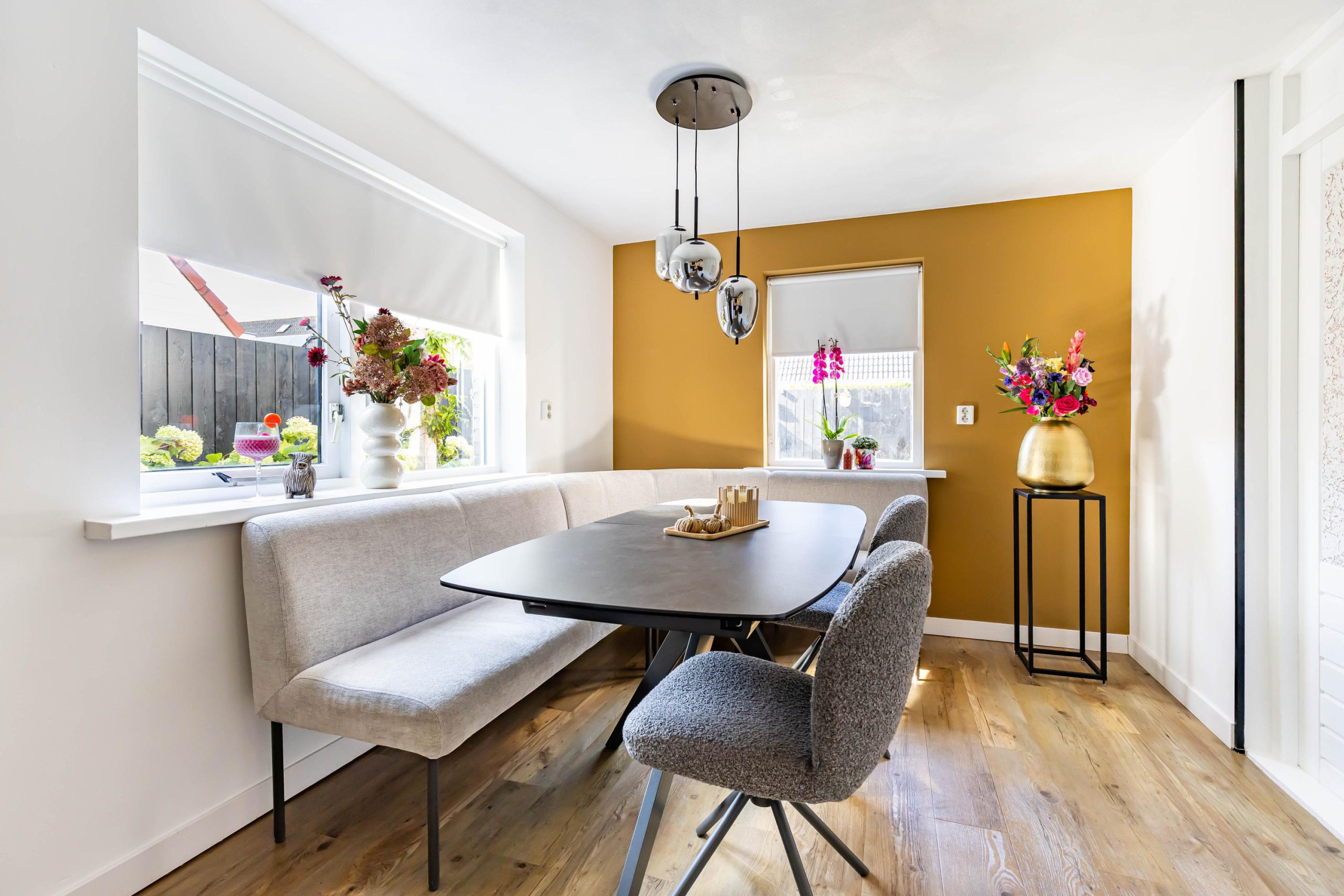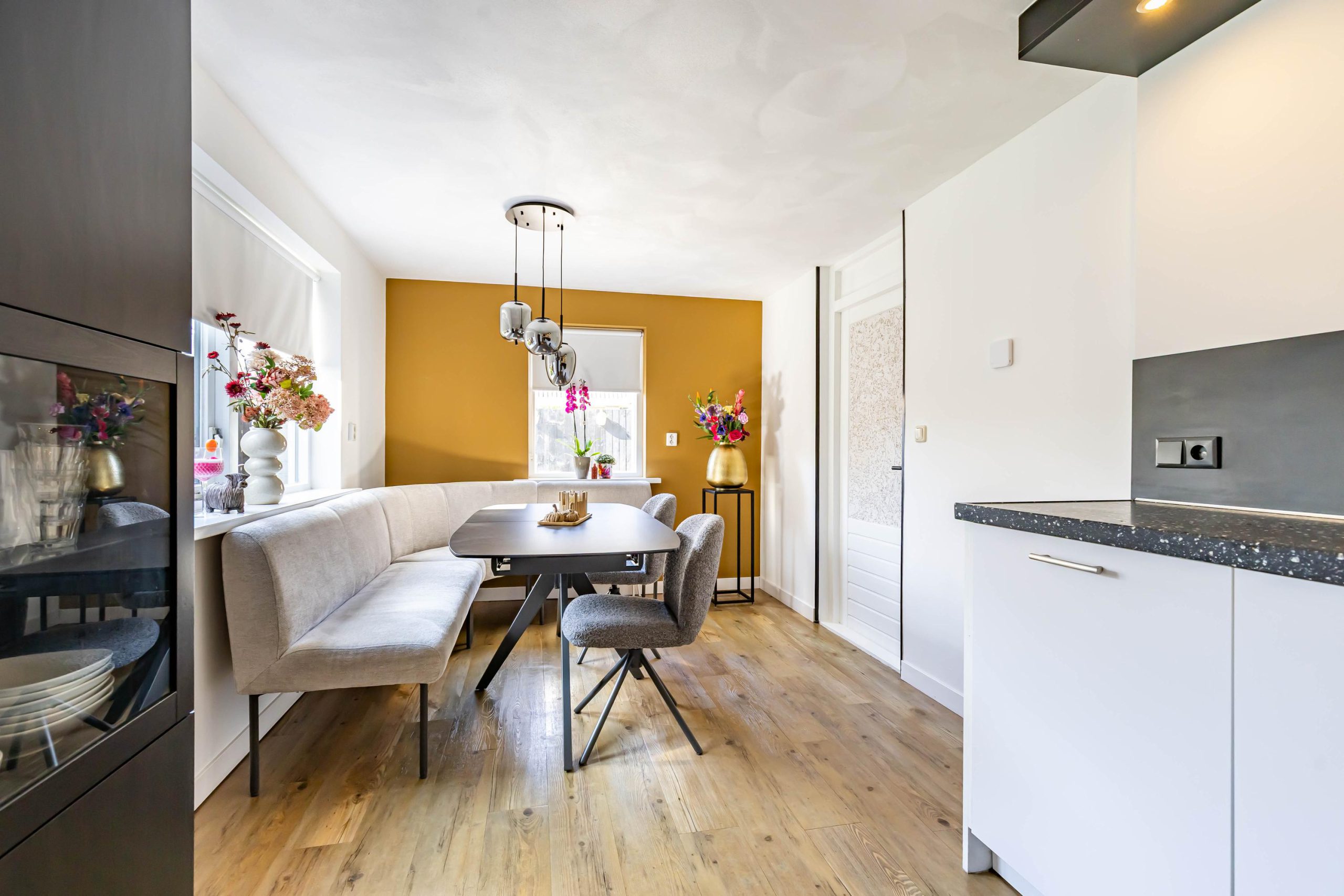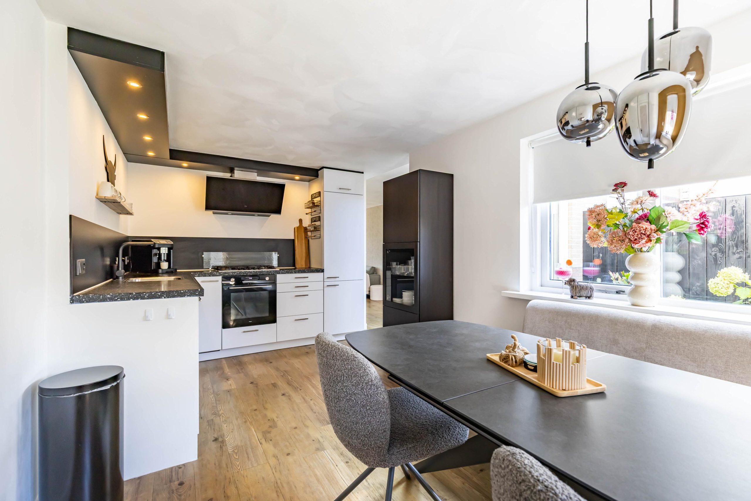 De woonkamer voelt direct ruim en licht dankzij de vele ramen. Hier is ook slim gebruikgemaakt van de ruimte met handige opbergruimte onder de kast. Vanuit de woonkamer stap je via de schuifpui zo de tuin in. De keuken is gezellig en praktisch ingericht, voorzien van een zithoek en moderne apparatuur zoals een 5-pits gasfornuis, een vaatwasser (2024), een koelkast (2024) en een combi-oven. Het geheel maakt dit een fijne plek voor dagelijkse maaltijden en gezellig samenzijn.