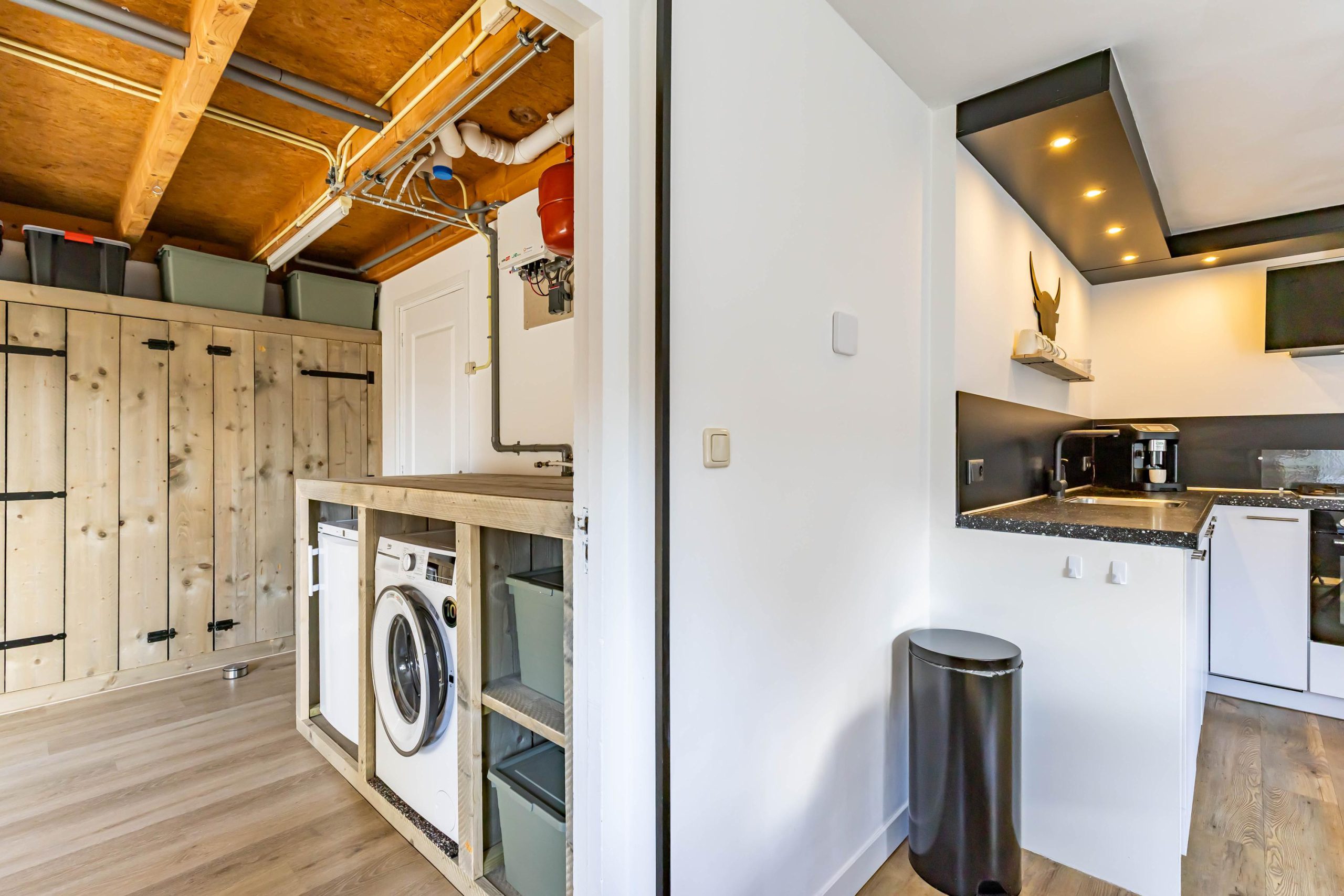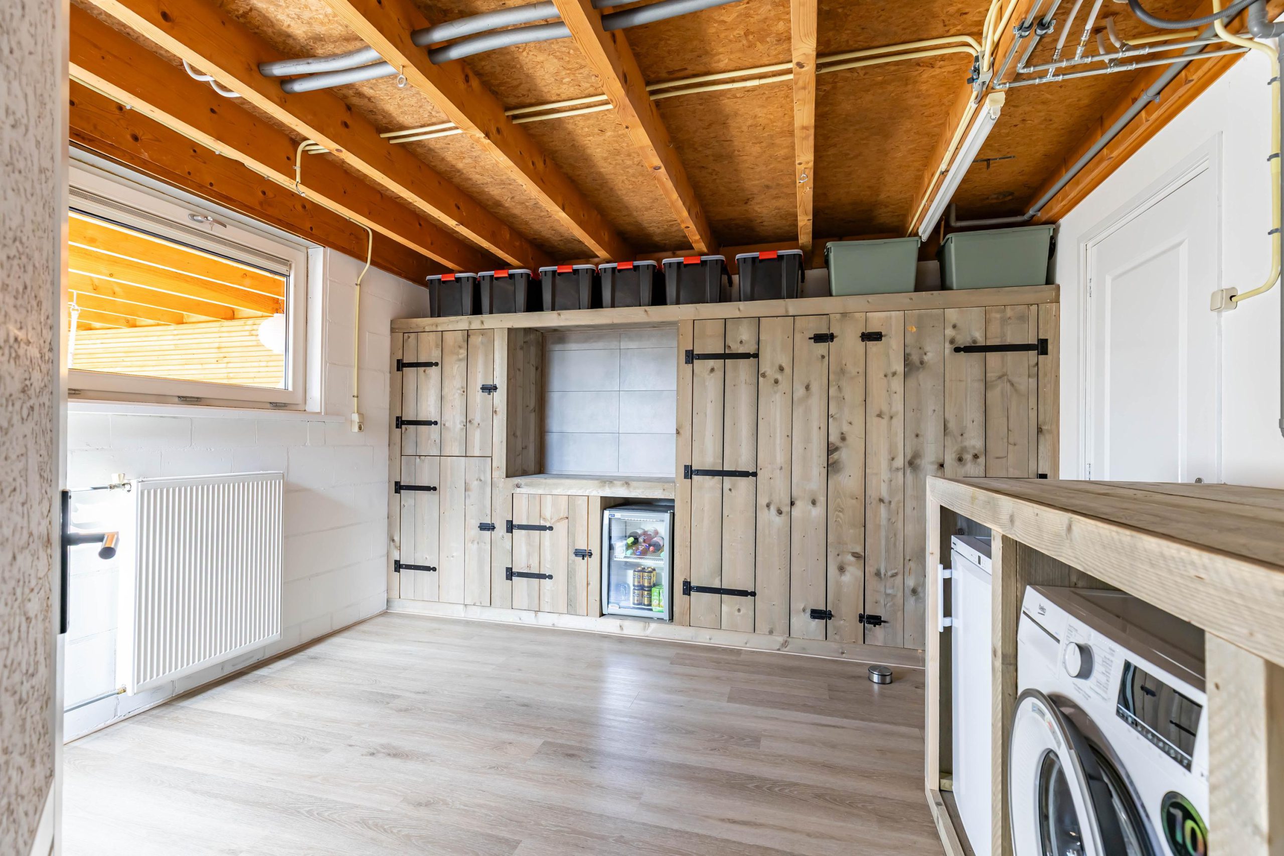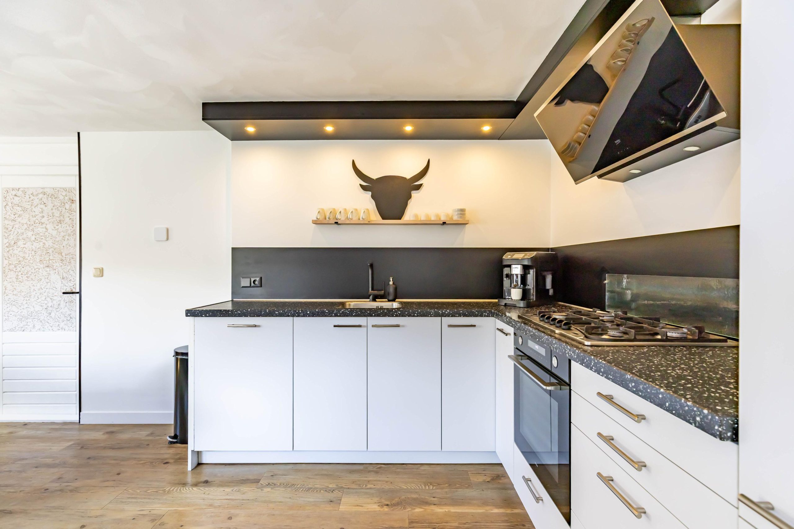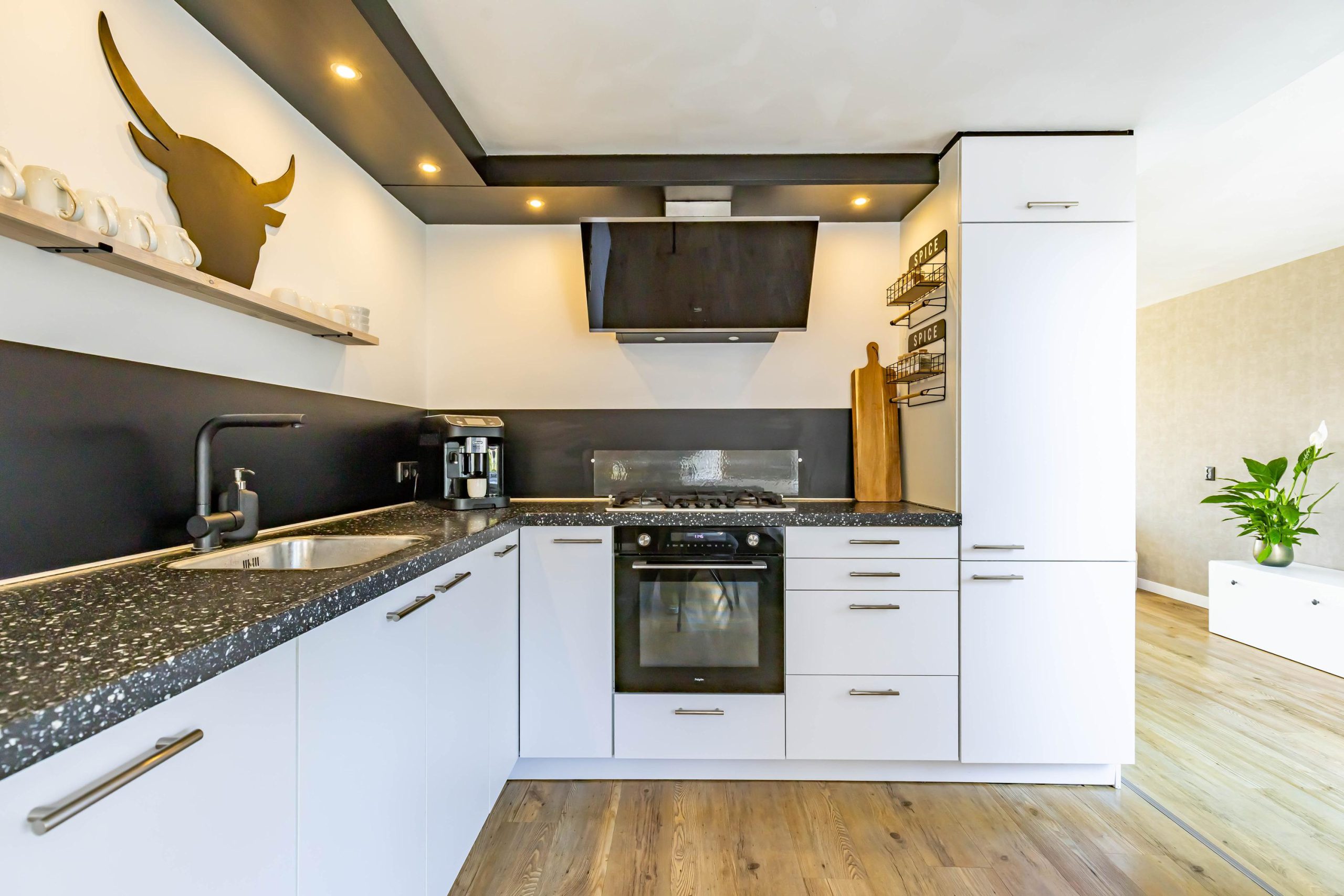 De woonkamer voelt direct ruim en licht dankzij de vele ramen. Hier is ook slim gebruikgemaakt van de ruimte met handige opbergruimte onder de kast. Vanuit de woonkamer stap je via de schuifpui zo de tuin in. De keuken is gezellig en praktisch ingericht, voorzien van een zithoek en moderne apparatuur zoals een 5-pits gasfornuis, een vaatwasser (2024), een koelkast (2024) en een combi-oven. Het geheel maakt dit een fijne plek voor dagelijkse maaltijden en gezellig samenzijn.