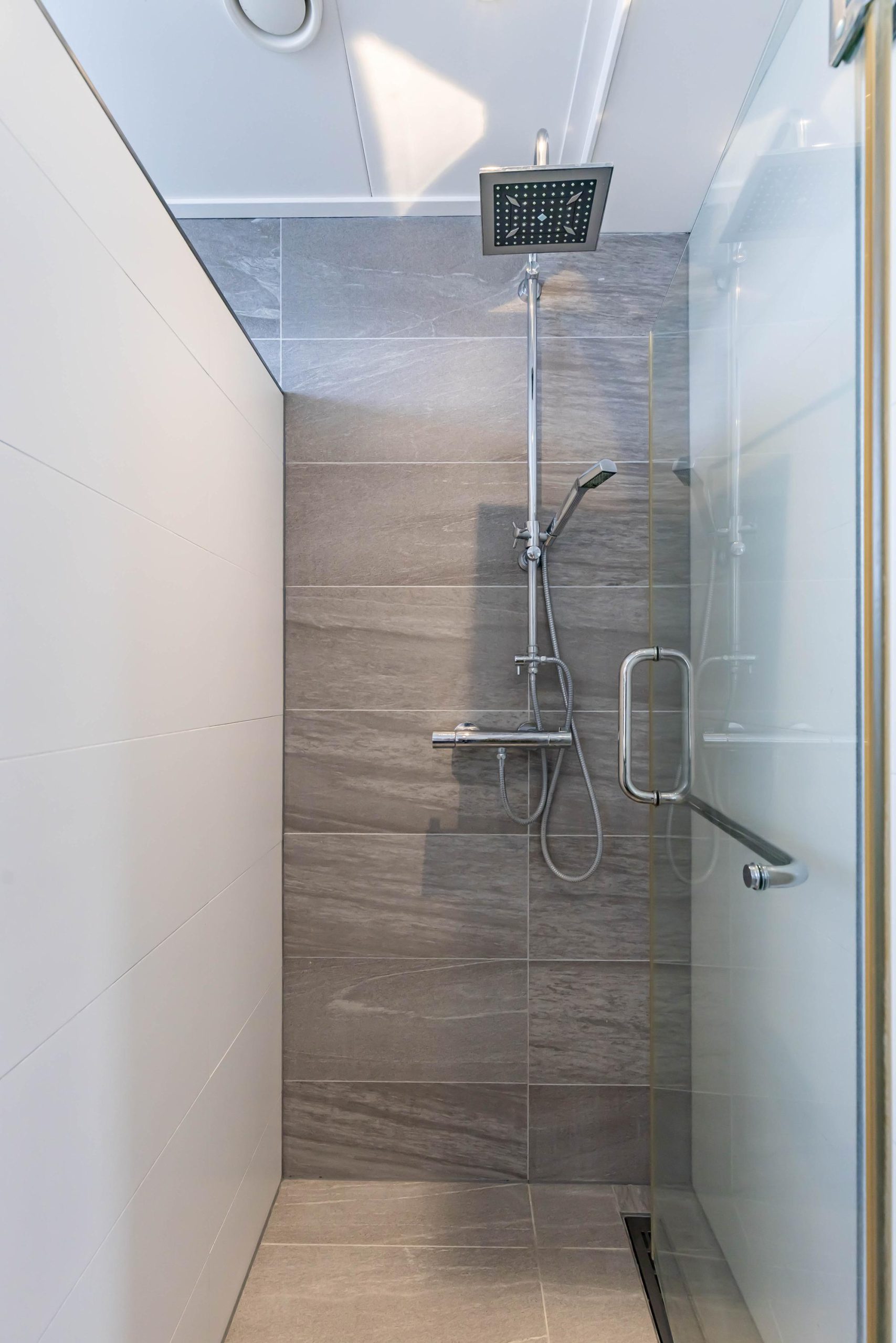 Op de eerste verdieping bevinden zich twee compacte kamers aan de voorzijde en een ruime master bedroom aan de achterzijde. De badkamer is modern en compleet, uitgerust met een dubbel wastafelmeubel, douche en toilet.