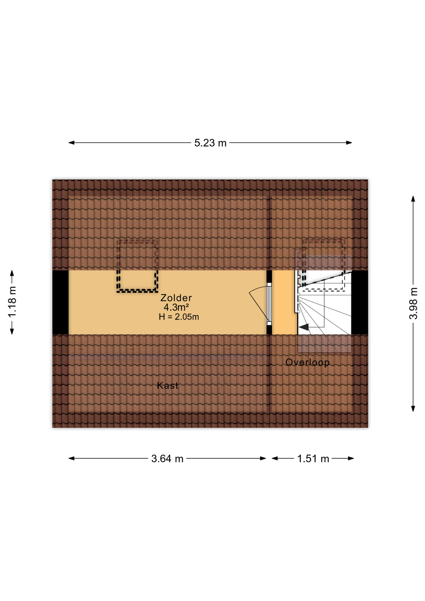 De tweede verdieping biedt nog een extra (zolder)kamer, te gebruiken als bergruimte of eventueel als kinderkamer.