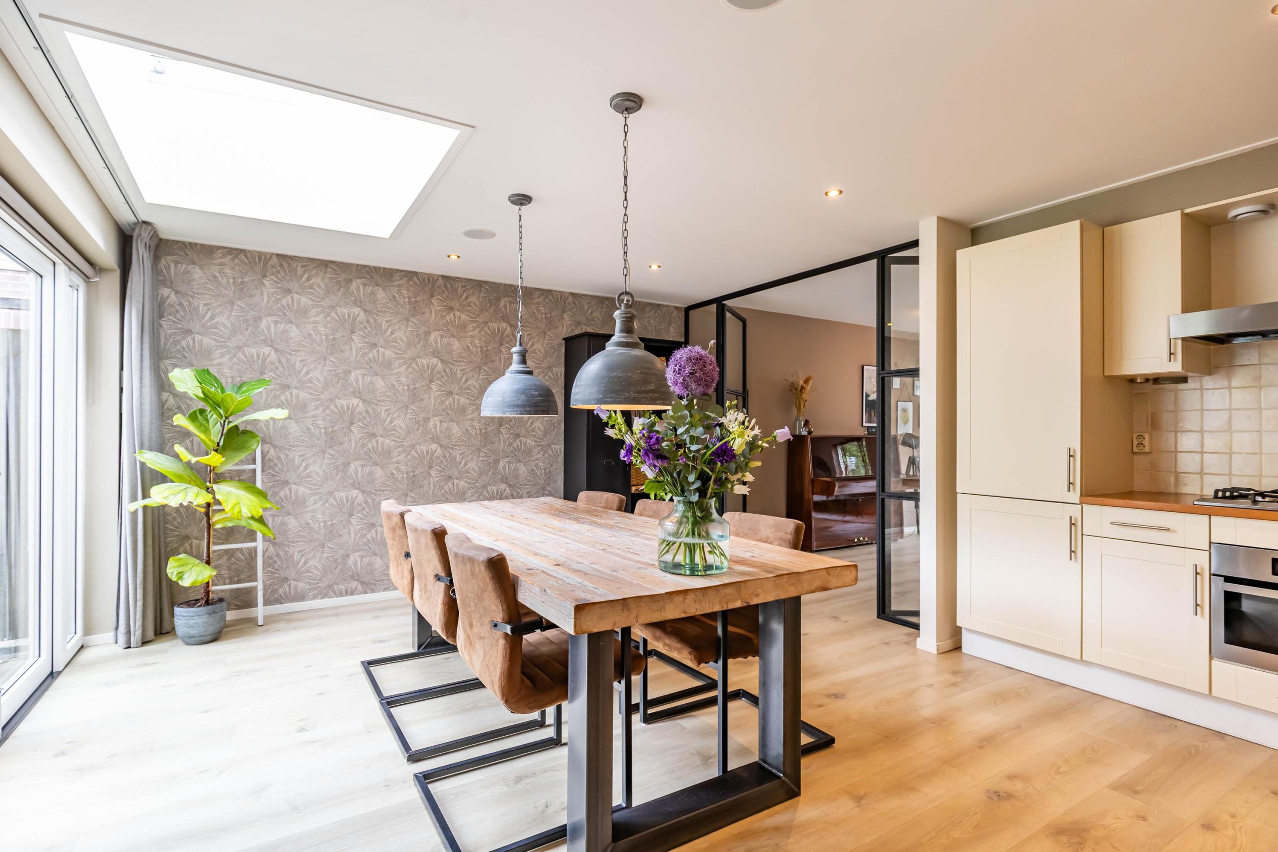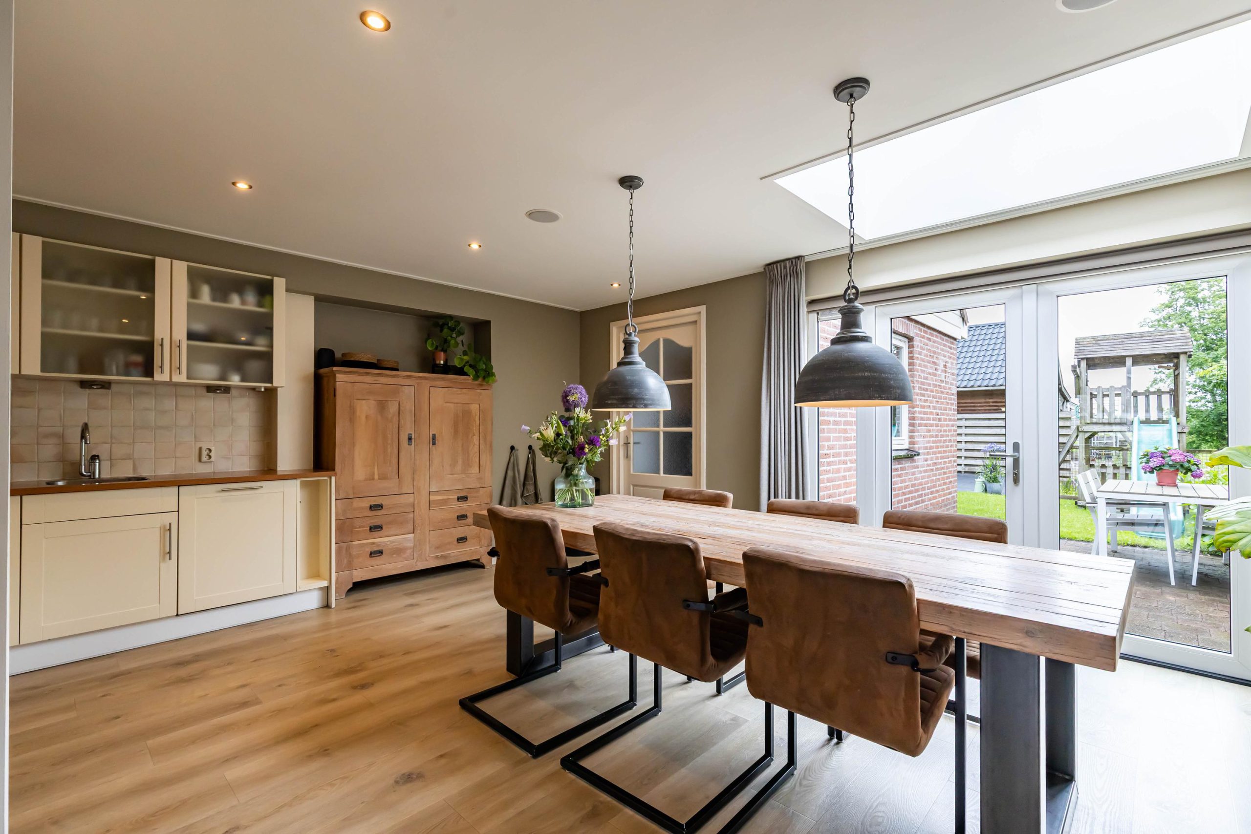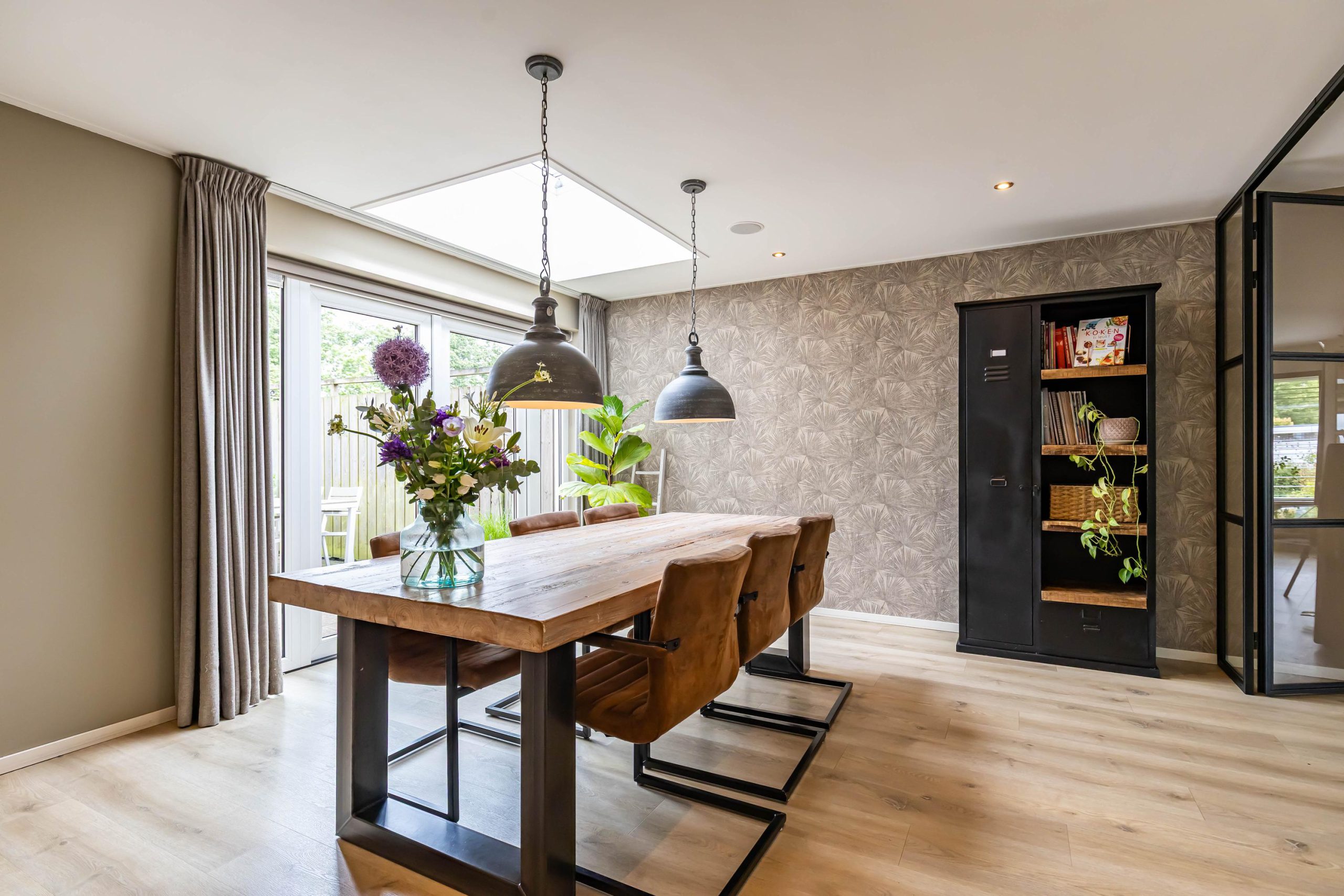 We lopen door naar de eethoek met aansluitend de keuken. Dankzij de lichtstraat valt er hier een zee aan natuurlijk licht binnen. De keuken is voorzien van een kookplaat, combi-oven, koel-vriescombinatie en vaatwasser – alles wat je nodig hebt om een heerlijke maaltijd op tafel te zetten. Vanuit de keuken heb je toegang tot de zonnige achtertuin op het noordoosten met vrij uitzicht over het water en de landerijen. De eendjes in de sloot maken het landelijke plaatje compleet: hier kom je écht tot rust in je eigen tuin.