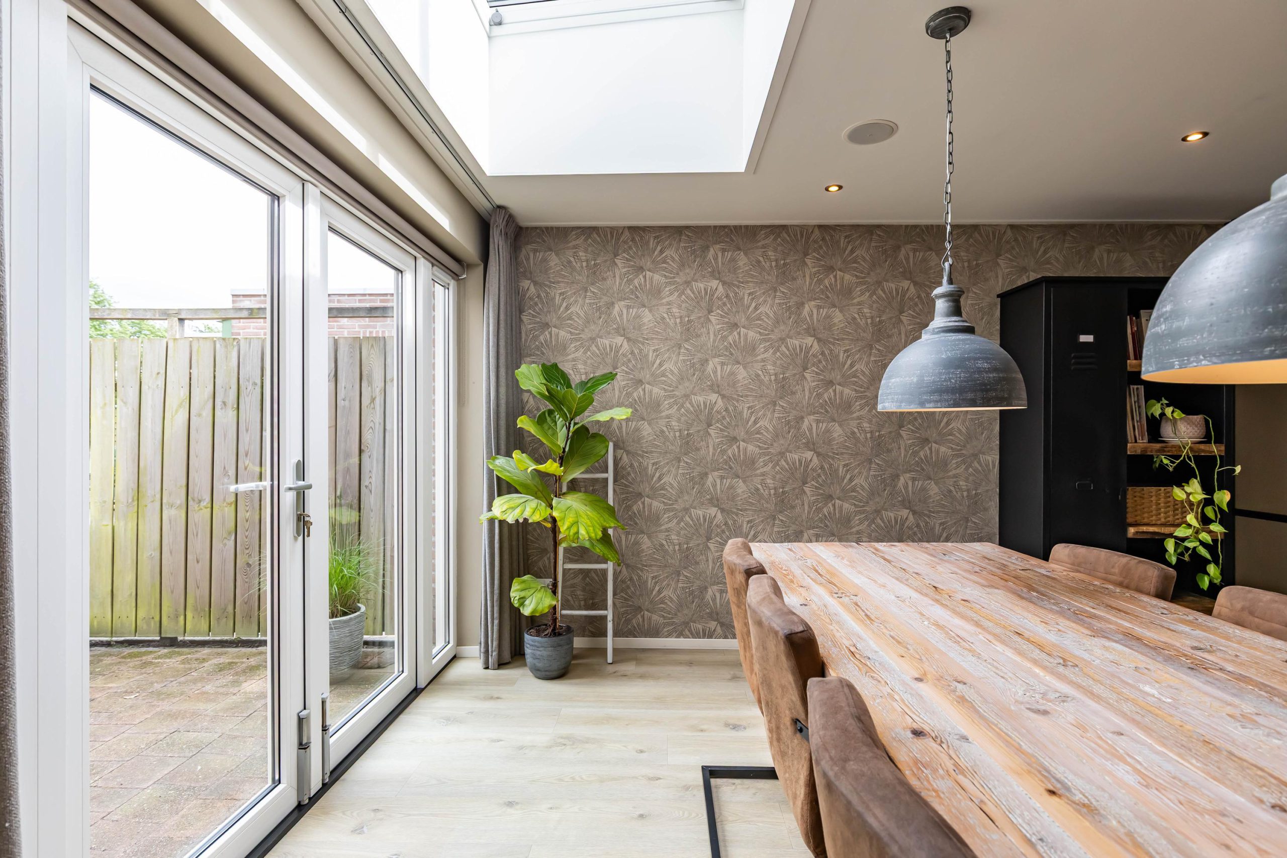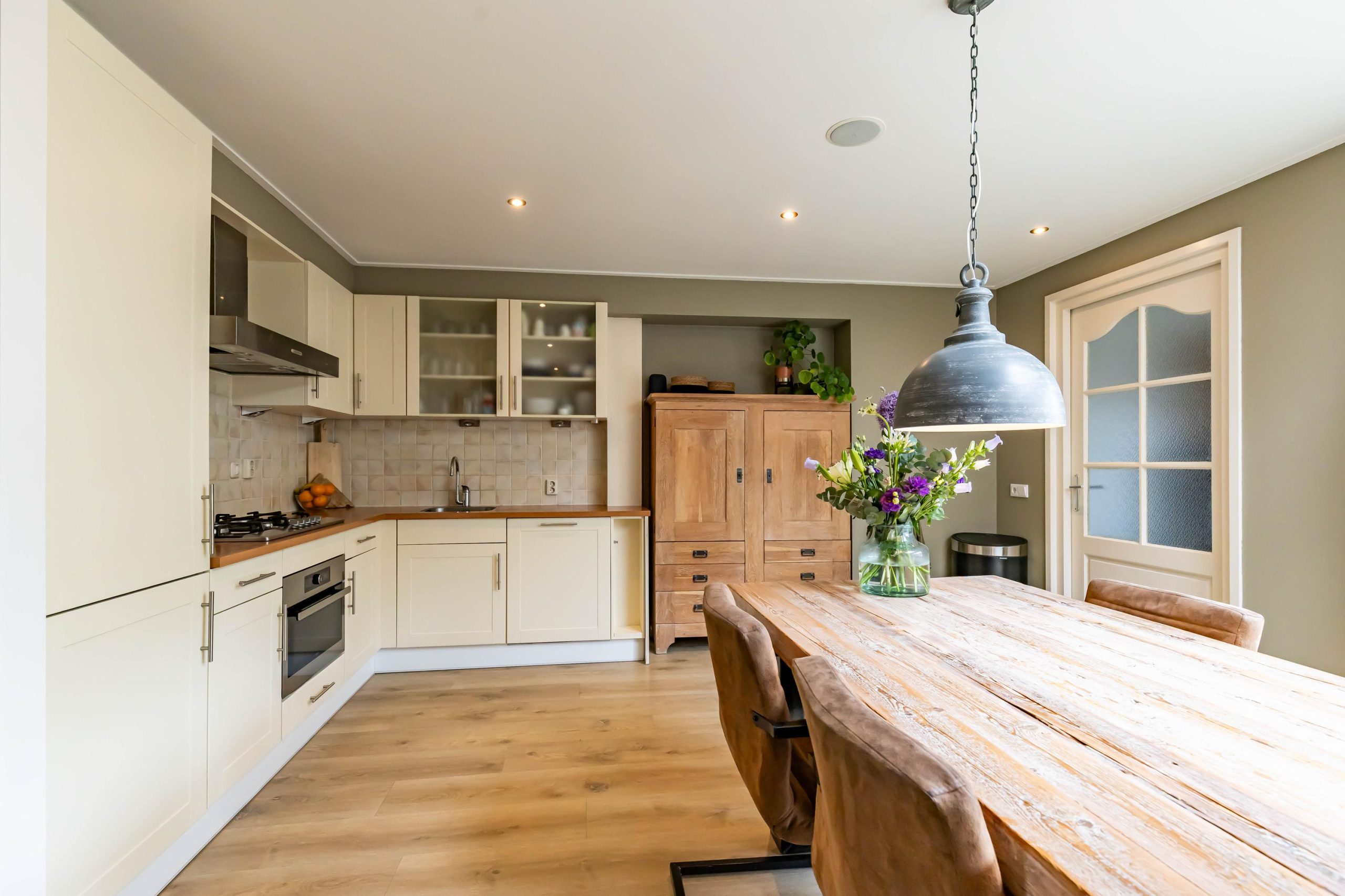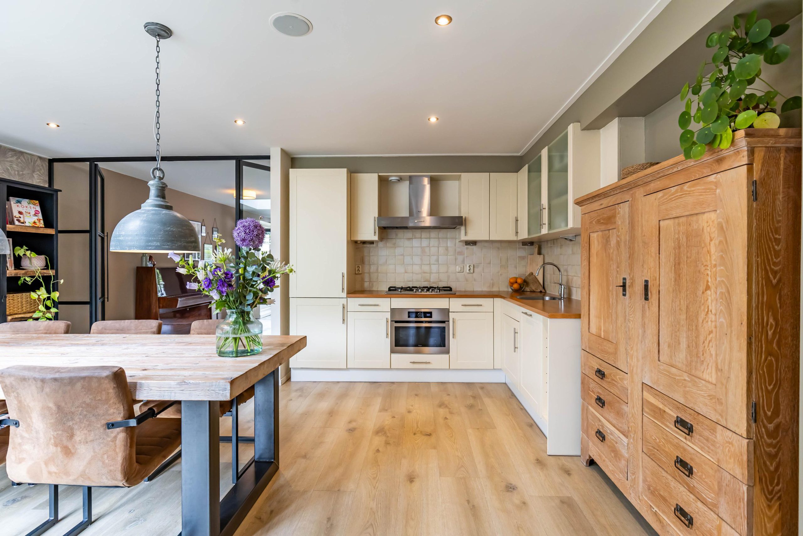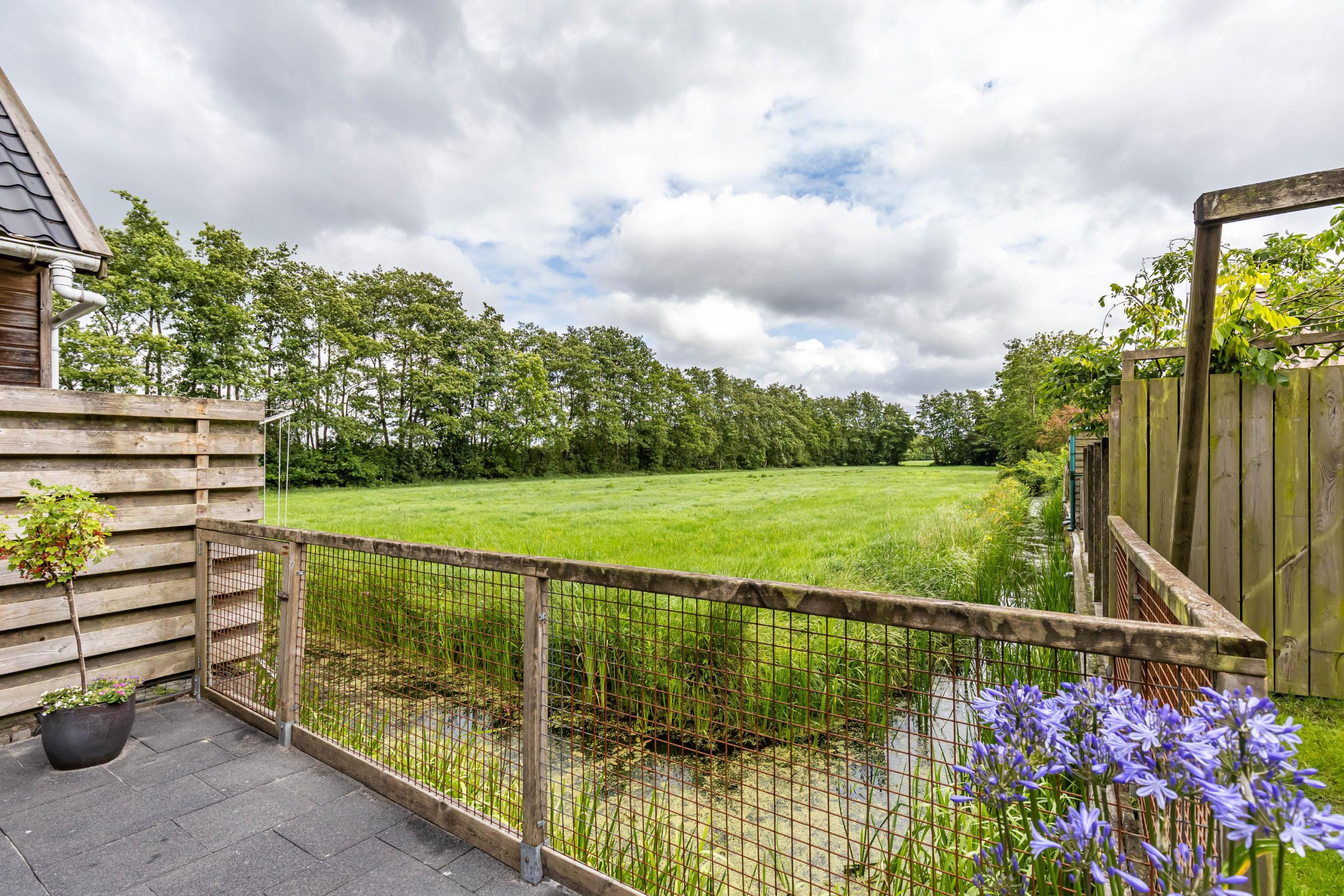 We lopen door naar de eethoek met aansluitend de keuken. Dankzij de lichtstraat valt er hier een zee aan natuurlijk licht binnen. De keuken is voorzien van een kookplaat, combi-oven, koel-vriescombinatie en vaatwasser – alles wat je nodig hebt om een heerlijke maaltijd op tafel te zetten. Vanuit de keuken heb je toegang tot de zonnige achtertuin op het noordoosten met vrij uitzicht over het water en de landerijen. De eendjes in de sloot maken het landelijke plaatje compleet: hier kom je écht tot rust in je eigen tuin.