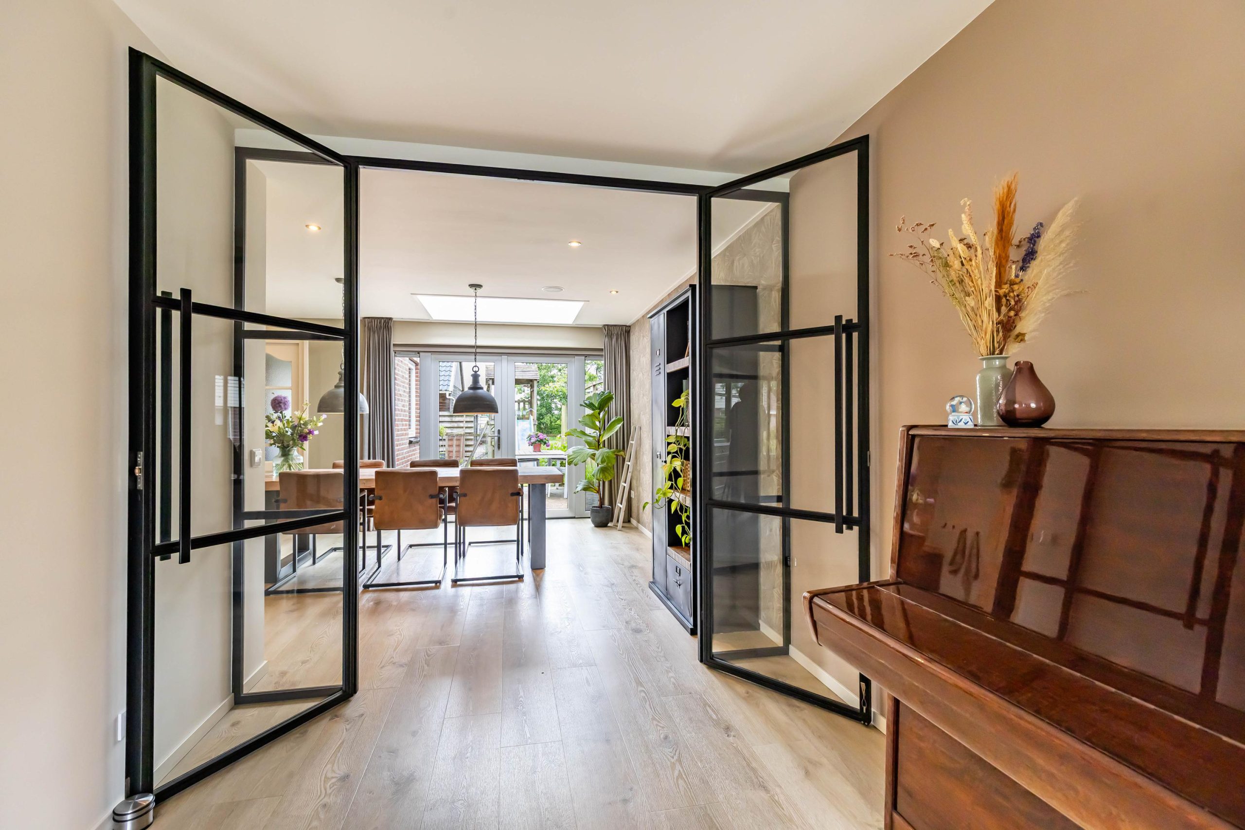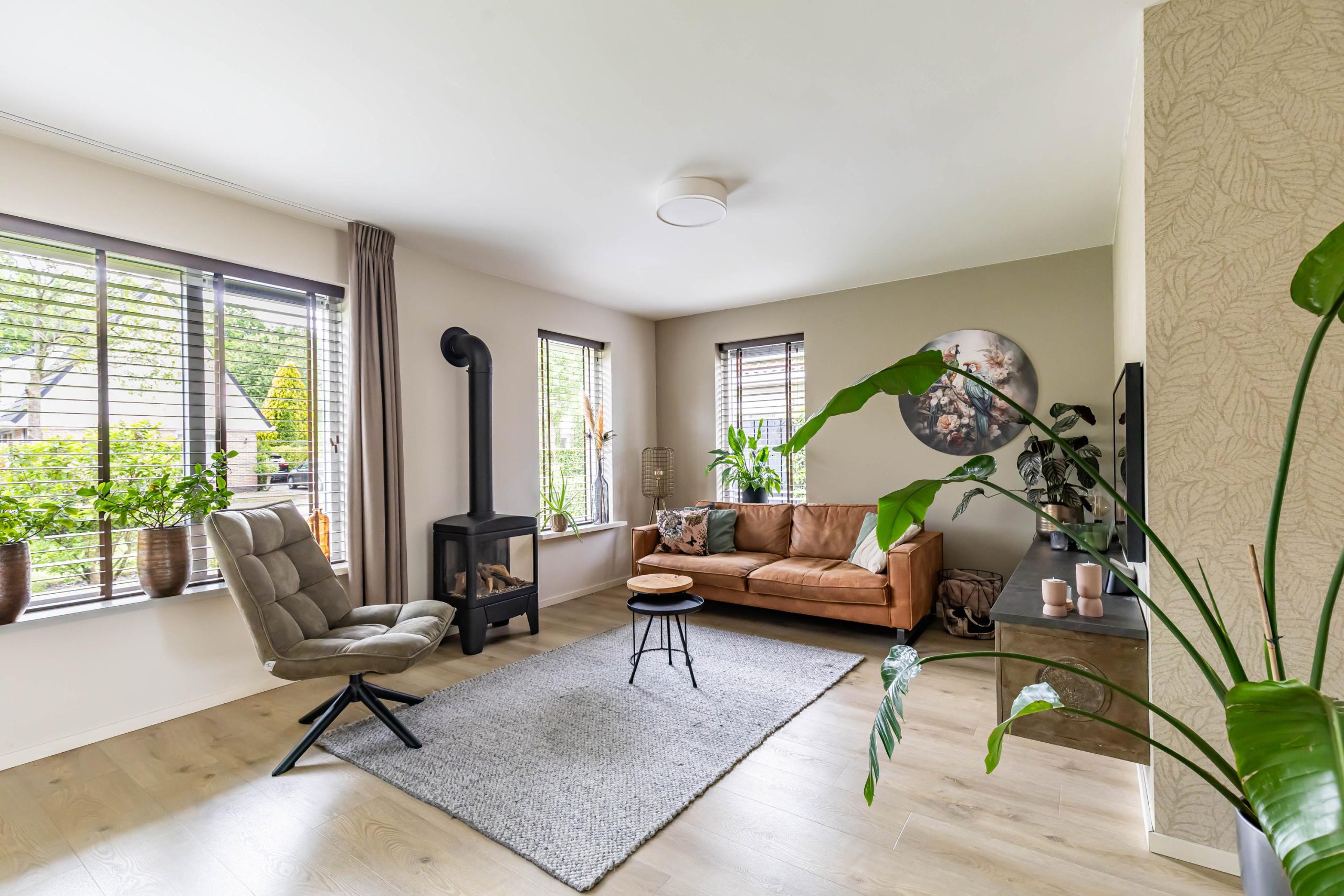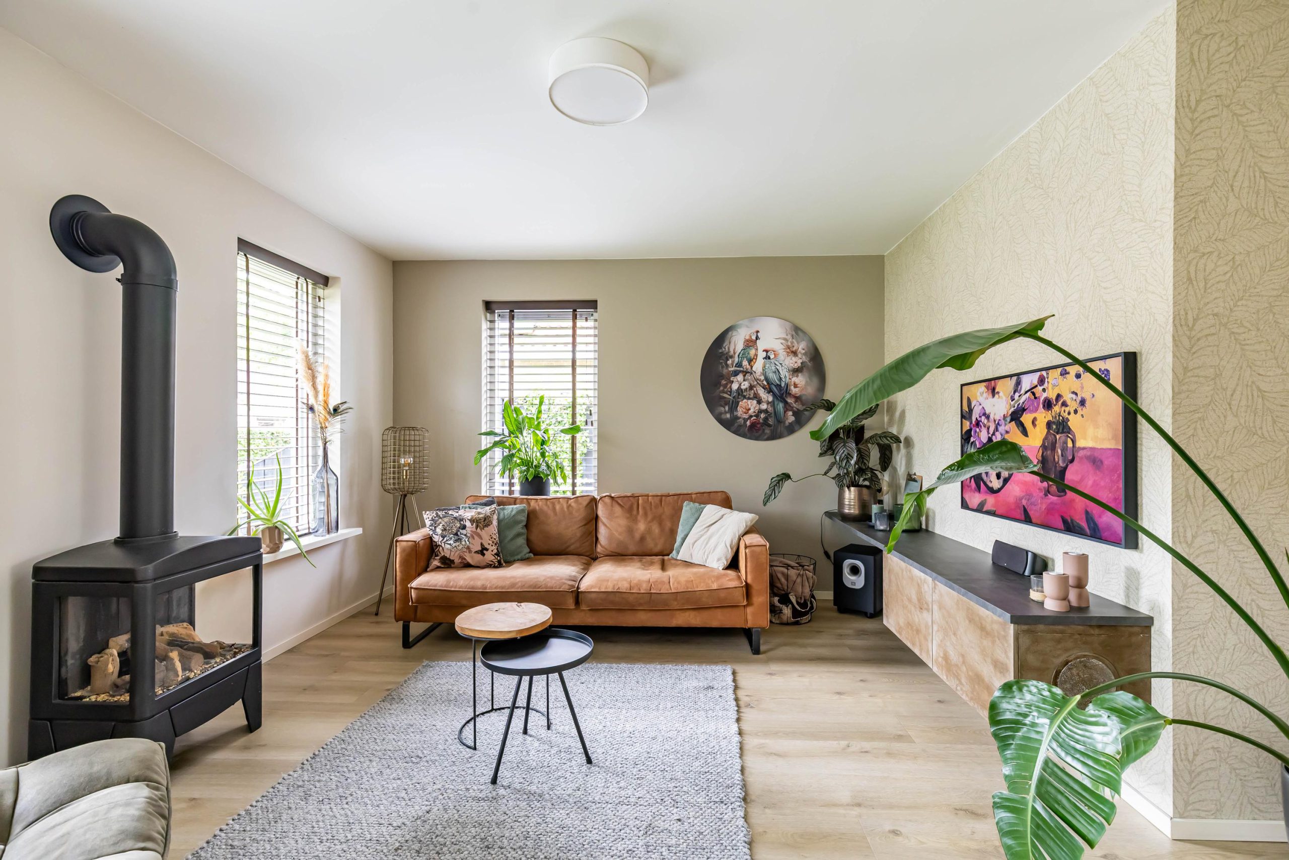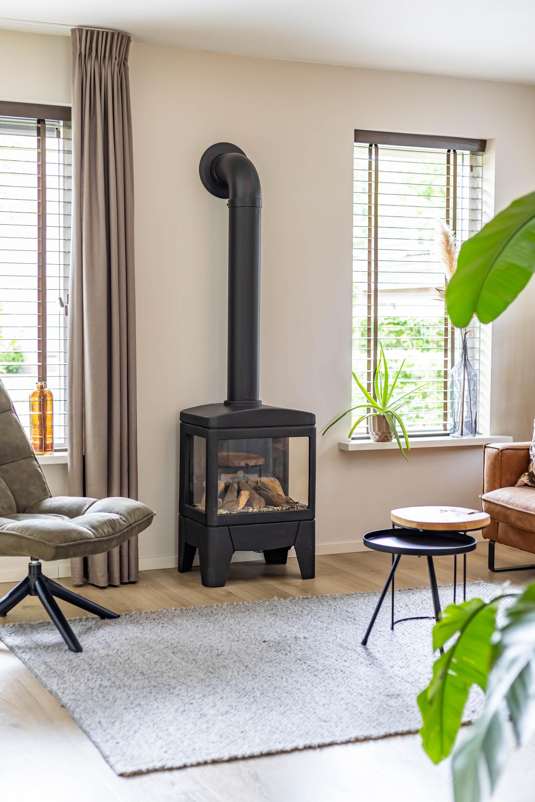 De L-vormige woonkamer is heerlijk licht dankzij de ramen rondom. De sfeervolle gaskachel – die lijkt op een echte houtkachel – zorgt voor extra gezelligheid op koude dagen. De woonkamer en keuken worden van elkaar gescheiden door fraaie stalen glazen deuren: stijlvol én praktisch, met behoud van ruimtelijkheid. Op de begane grond ligt een mooie PVC vloer met comfortabele vloerverwarming (m.u.v. de bijkeuken).