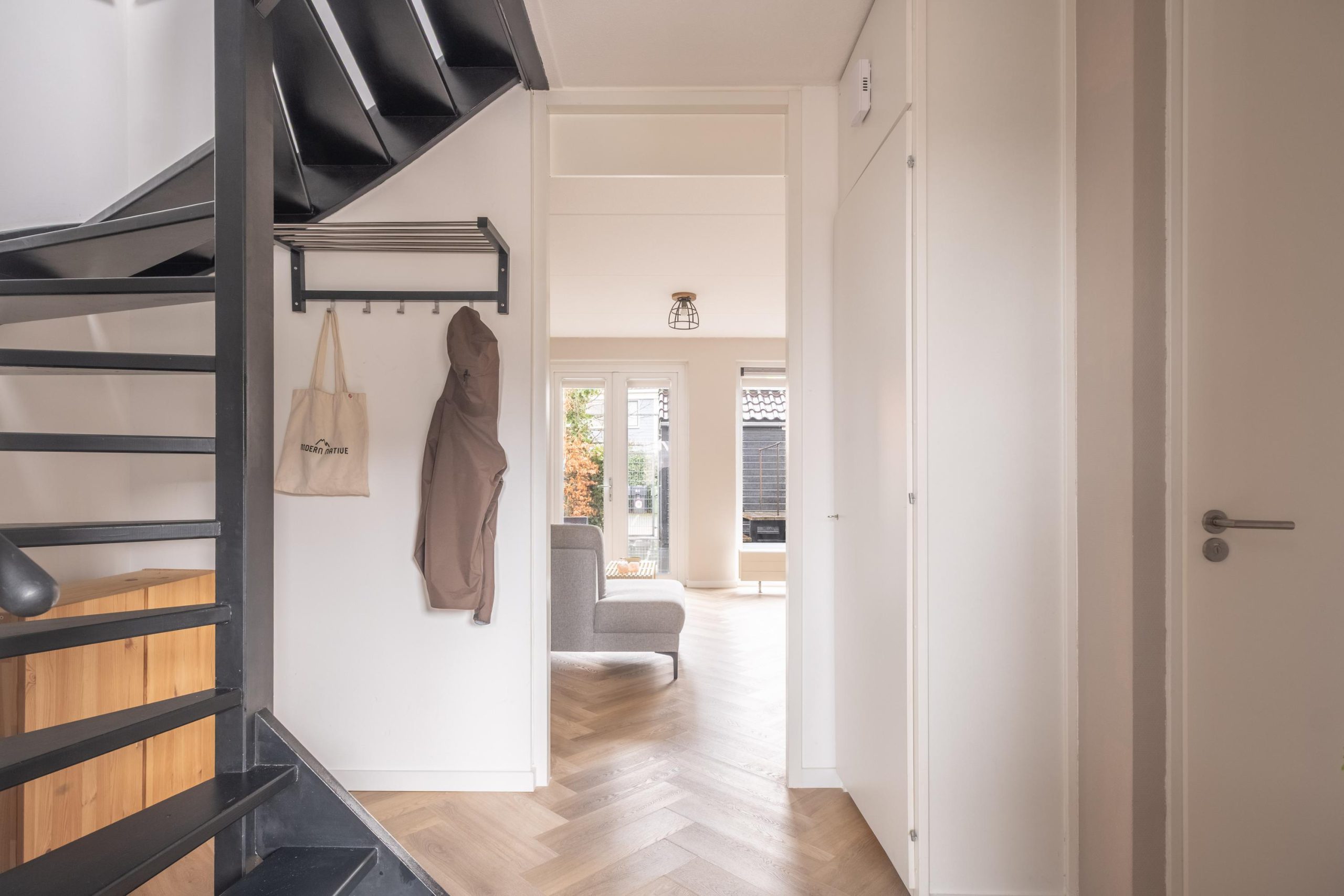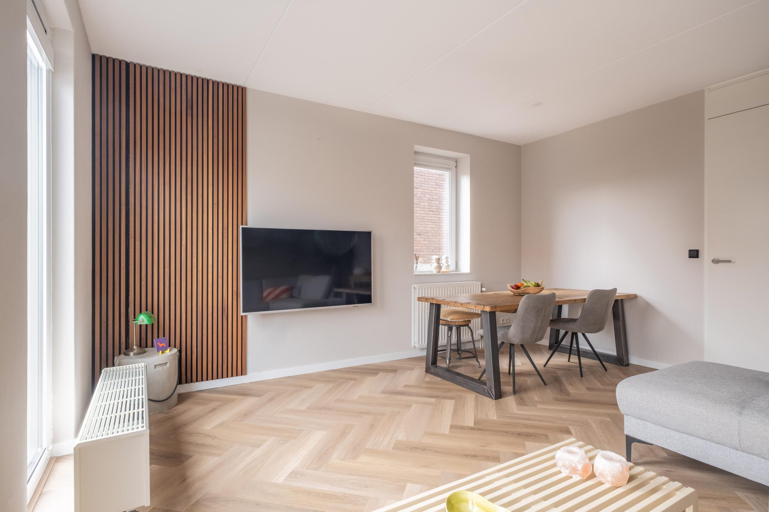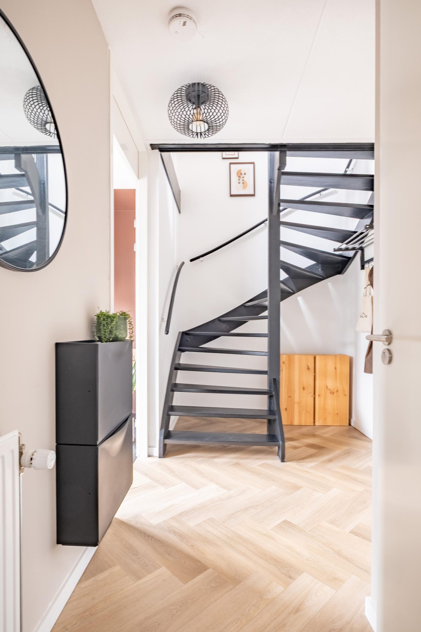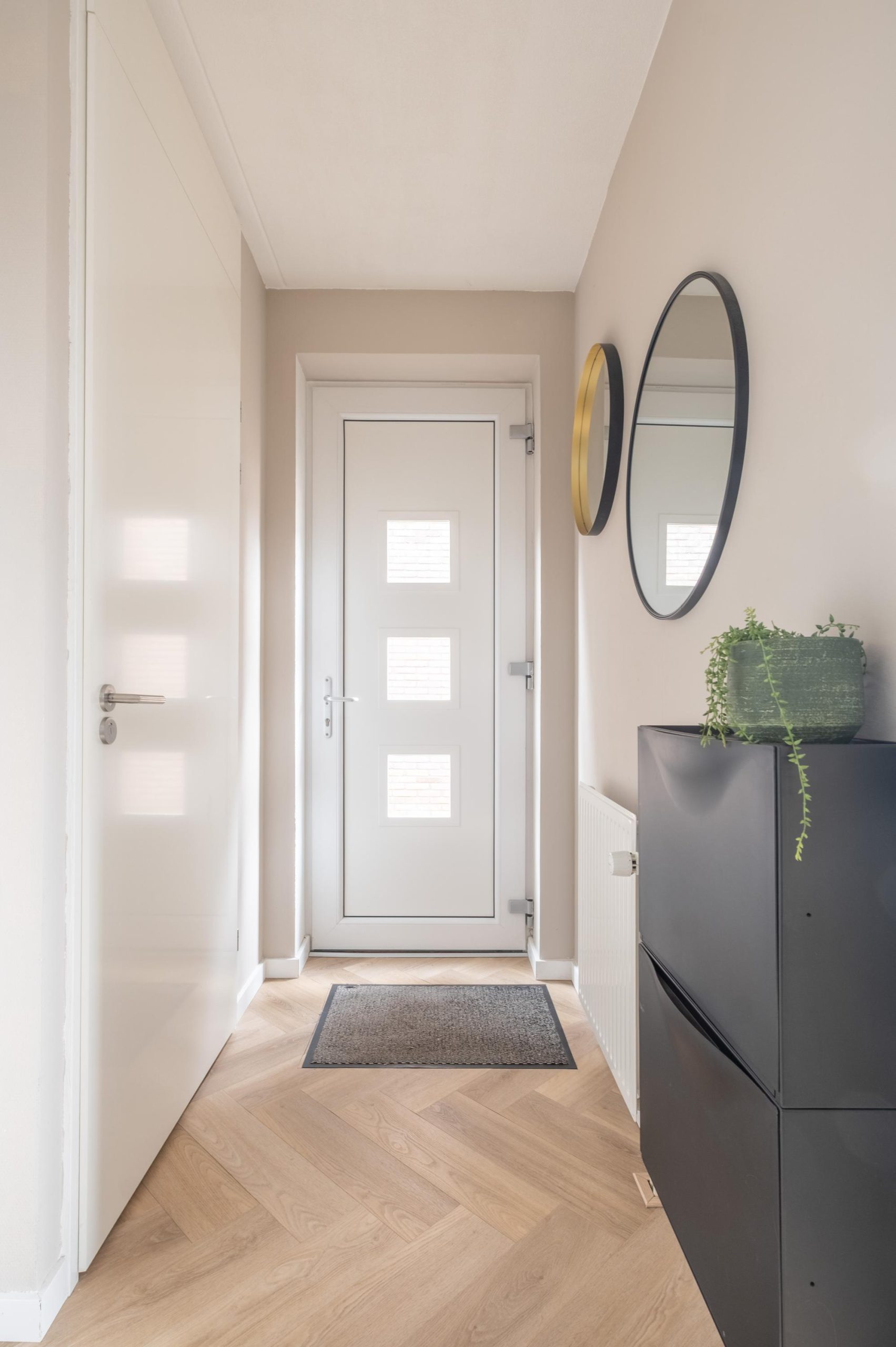 We nemen je mee naar binnen. Via de entree aan de zijkant van de woning kom je in de moderne, lichte hal met het toilet, de open trapopgang en toegang tot zowel de woonkamer als de keuken. Deze hal is direct uitnodigend dankzij de prettige lichtinval en strakke afwerking. De woonkamer ligt aan de tuinzijde en voelt dankzij de openslaande deuren heerlijk licht en ruim aan. Ook hier geniet je van een strakke afwerking, terwijl de visgraat click pvc-vloer het geheel een moderne en warme uitstraling geeft. In de zomer zet je de deuren naar de tuin open en loopt binnen moeiteloos over in buiten.