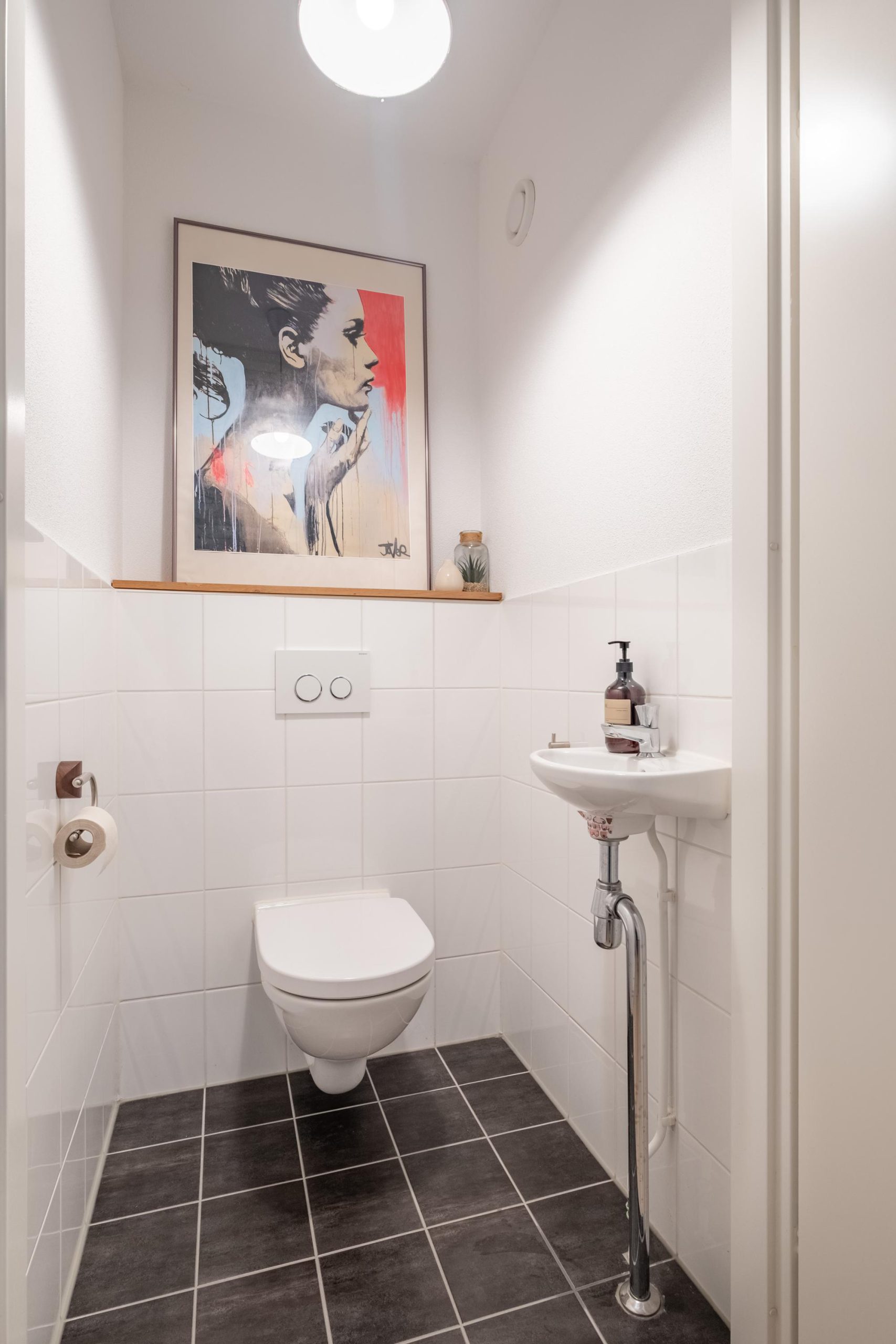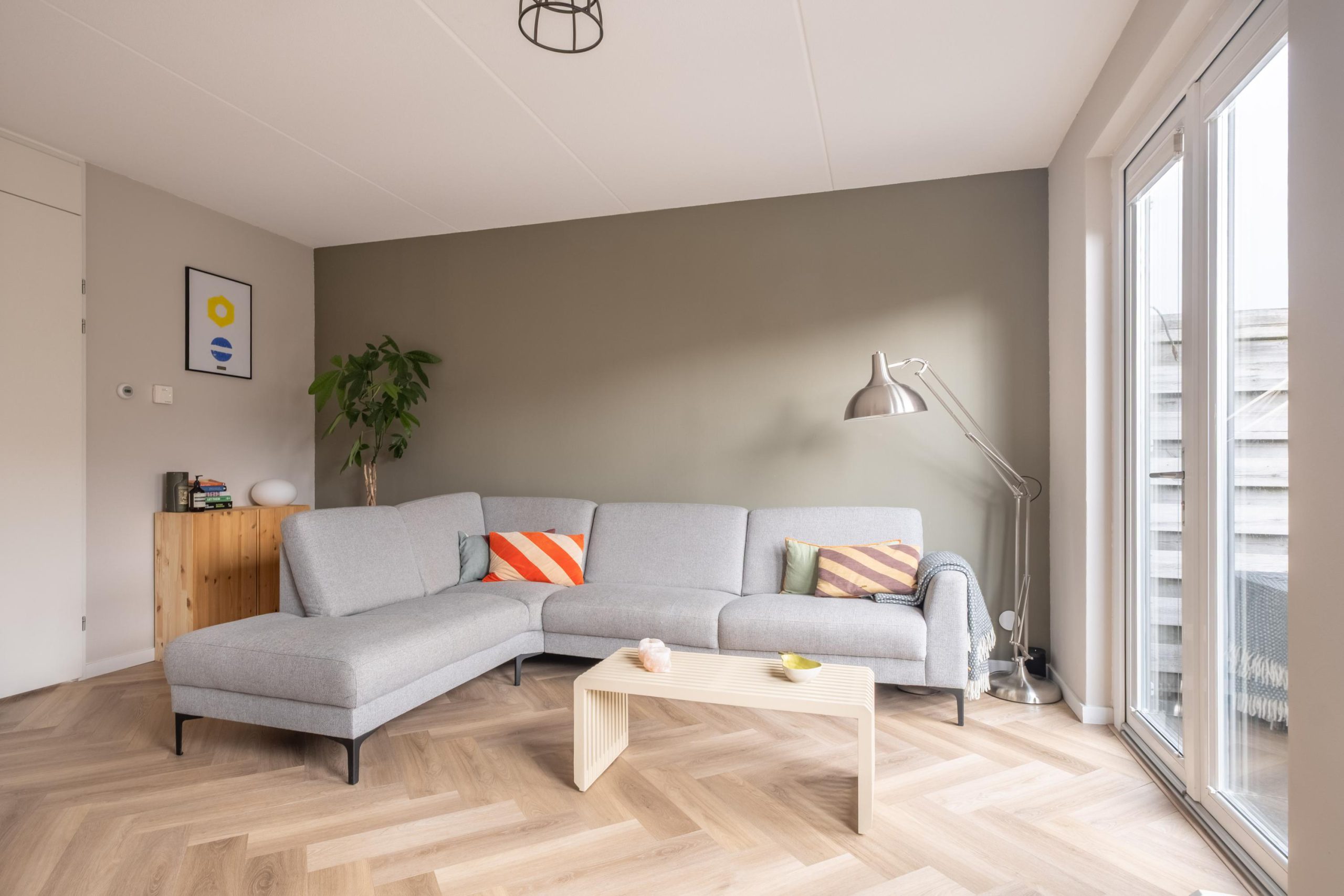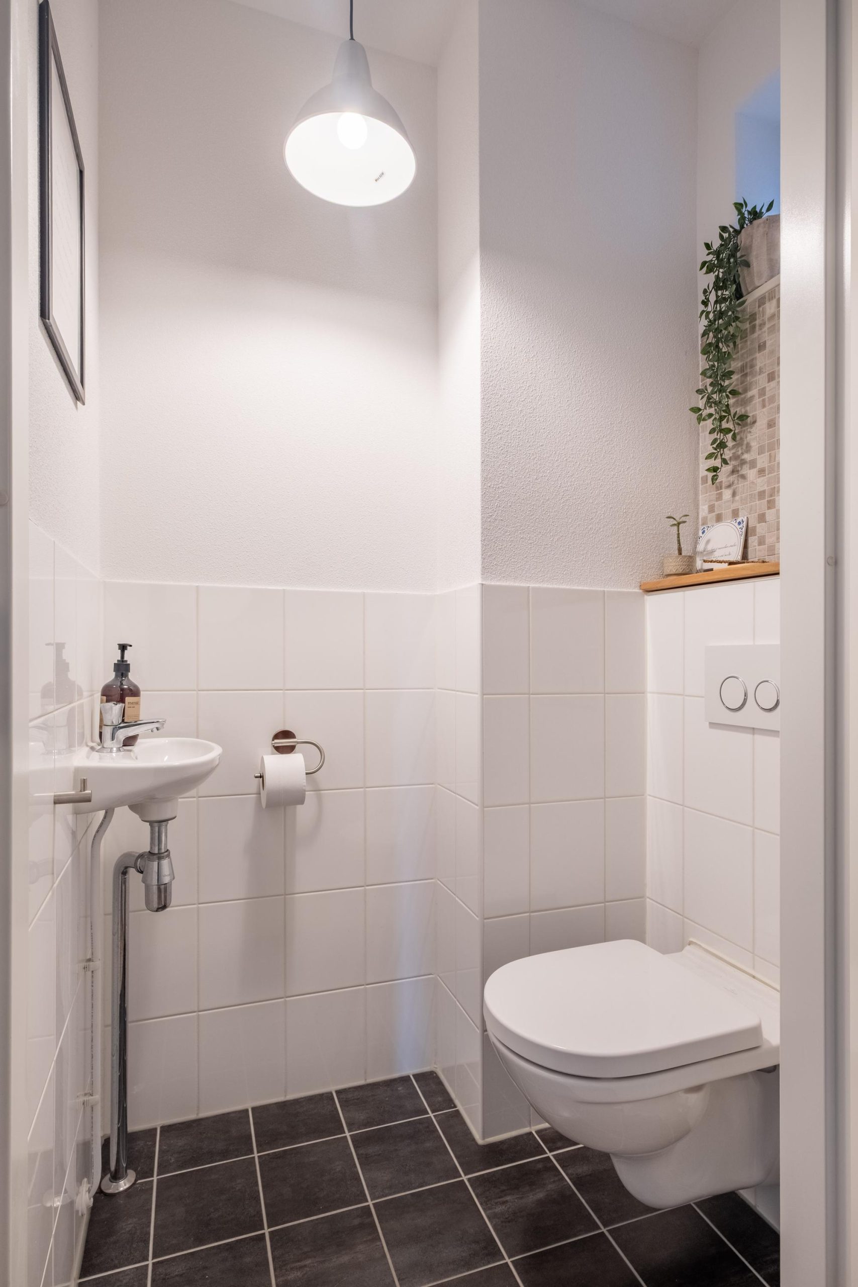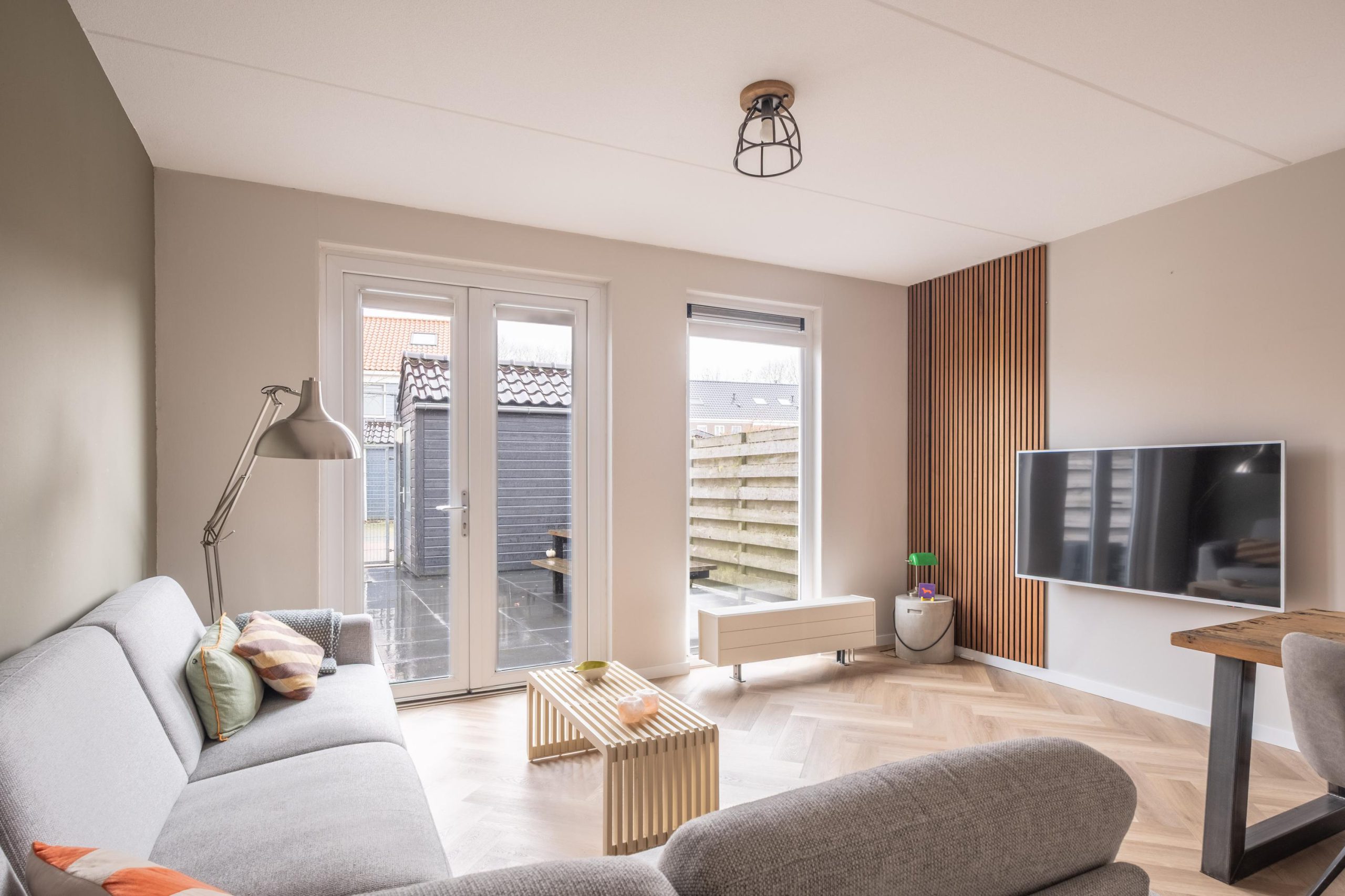 We nemen je mee naar binnen. Via de entree aan de zijkant van de woning kom je in de moderne, lichte hal met het toilet, de open trapopgang en toegang tot zowel de woonkamer als de keuken. Deze hal is direct uitnodigend dankzij de prettige lichtinval en strakke afwerking. De woonkamer ligt aan de tuinzijde en voelt dankzij de openslaande deuren heerlijk licht en ruim aan. Ook hier geniet je van een strakke afwerking, terwijl de visgraat click pvc-vloer het geheel een moderne en warme uitstraling geeft. In de zomer zet je de deuren naar de tuin open en loopt binnen moeiteloos over in buiten.