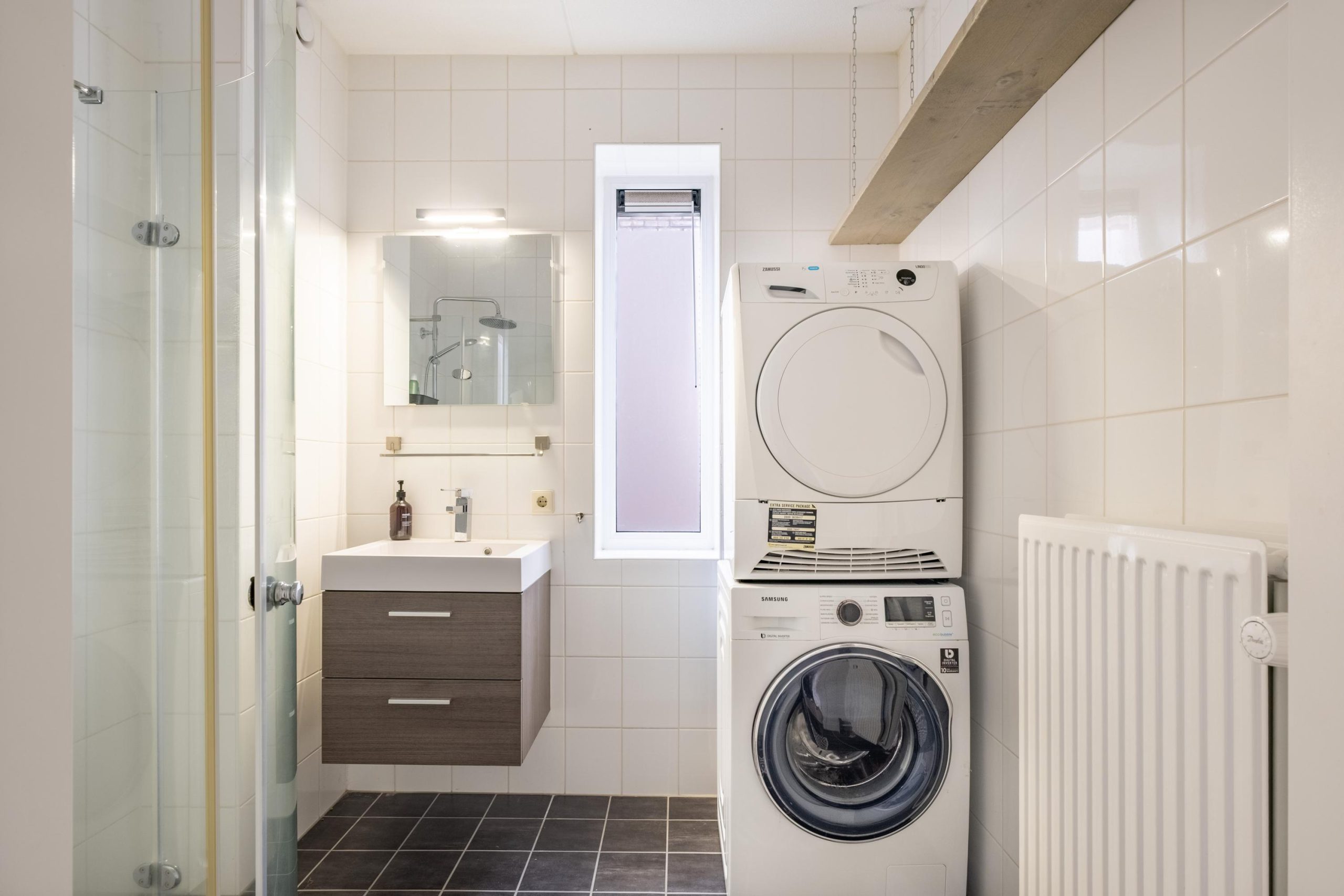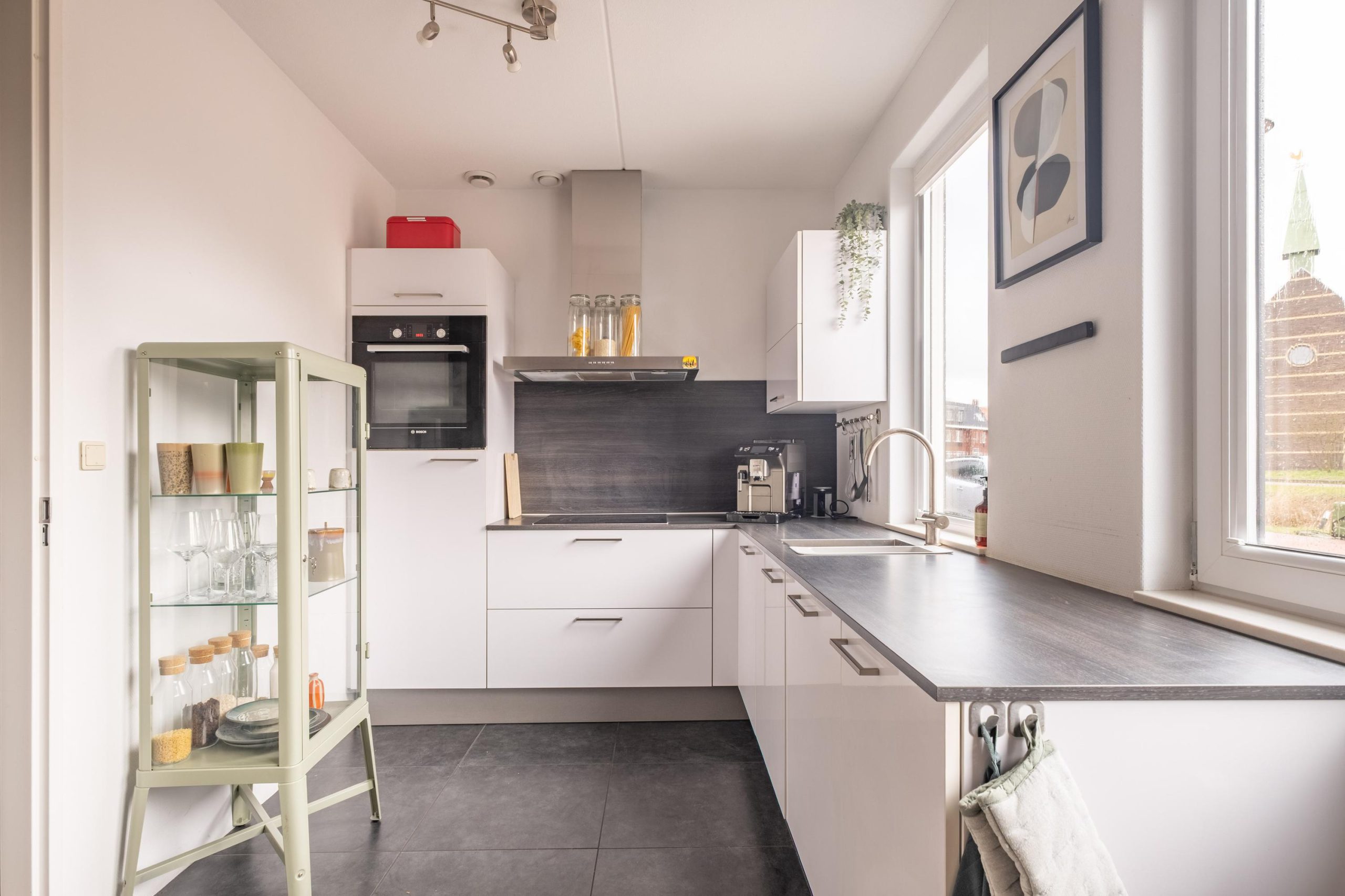 Aan de voorzijde van de woning bevindt zich de keuken, die los van de woonkamer is geplaatst. Een prettige plek met uitzicht op de straat en voorzien van diverse inbouwapparatuur, waaronder een koelkast, inductiekookplaat en vaatwasser. Hier kook je comfortabel terwijl je lekker naar buiten kijkt.