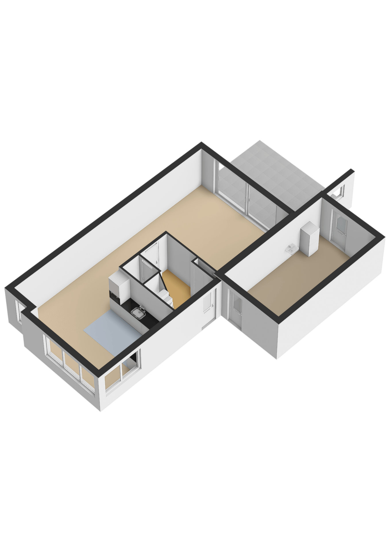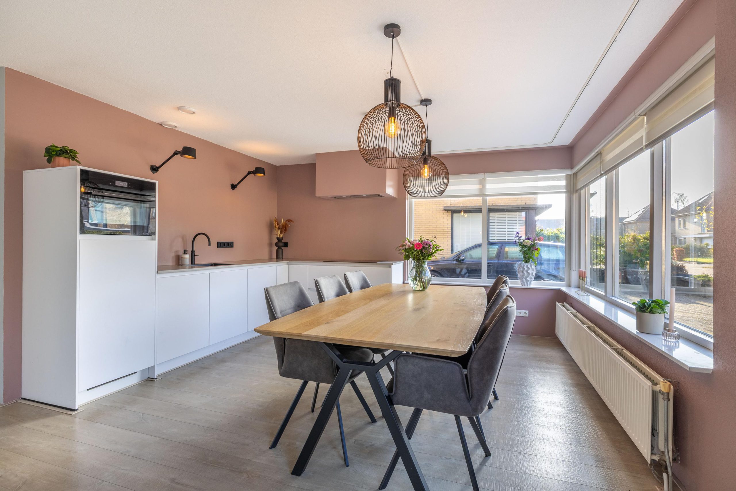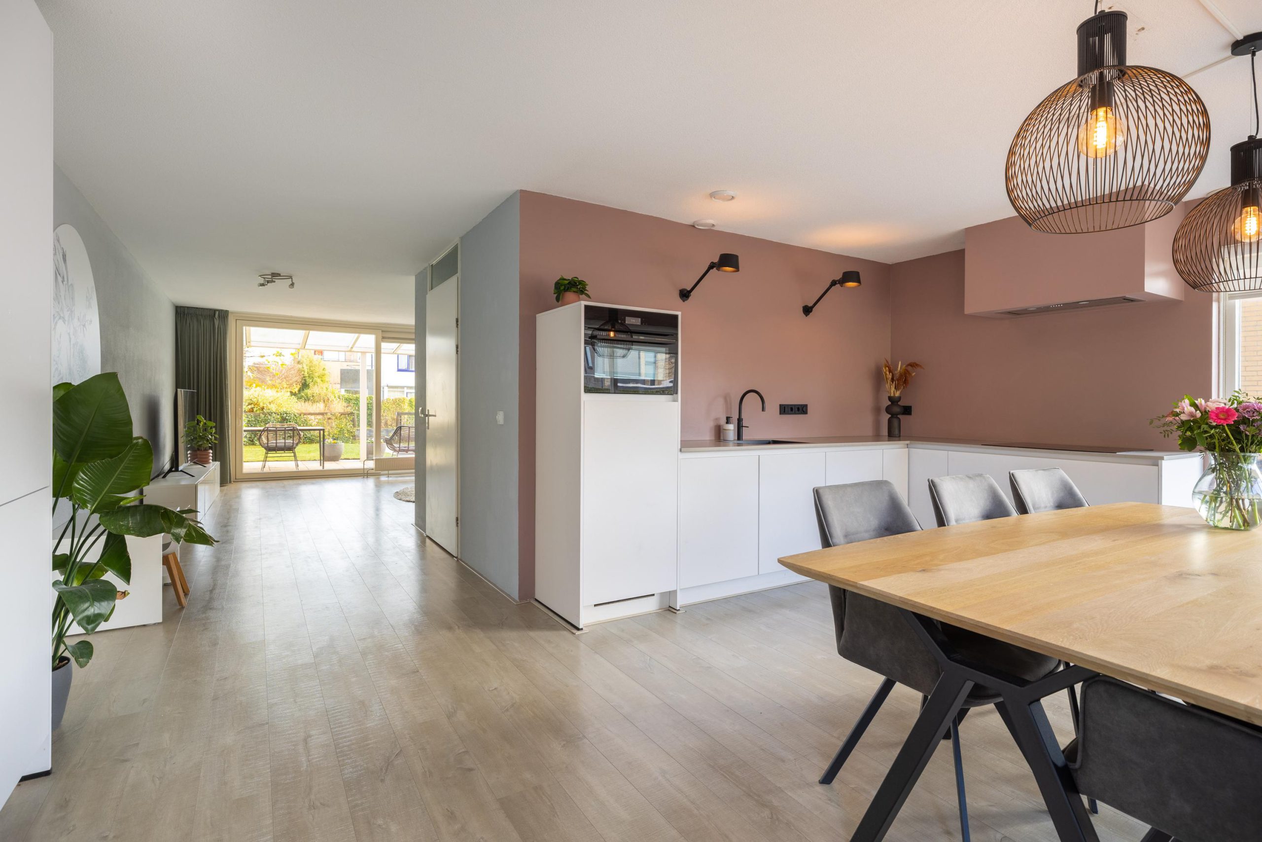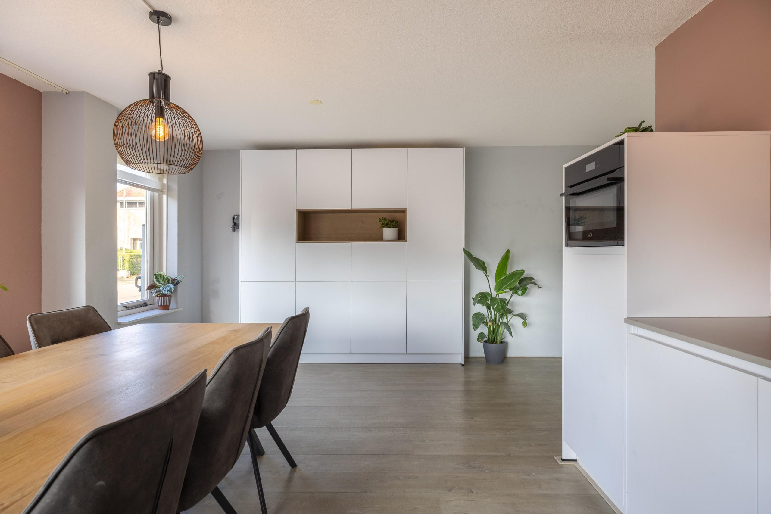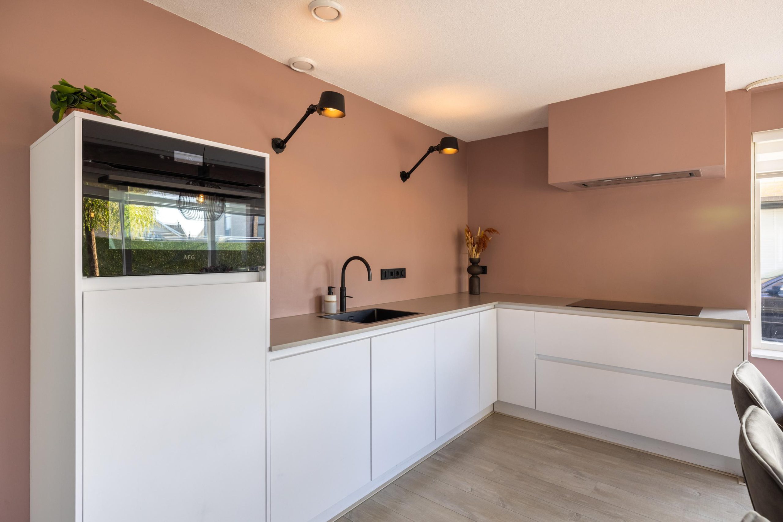 Aan de voorzijde vind je de moderne keuken, strak vormgegeven en uitgerust met een oven, koelkast, vaatwasser en inductiekookplaat. De opstelling is praktisch en ruim opgezet, waardoor je hier prettig kunt koken. Door de open verbinding met de eethoek blijft het contact met de rest van de leefruimte altijd aanwezig, perfect voor wie graag uitgebreid kookt of juist snel wil kunnen aanschuiven.