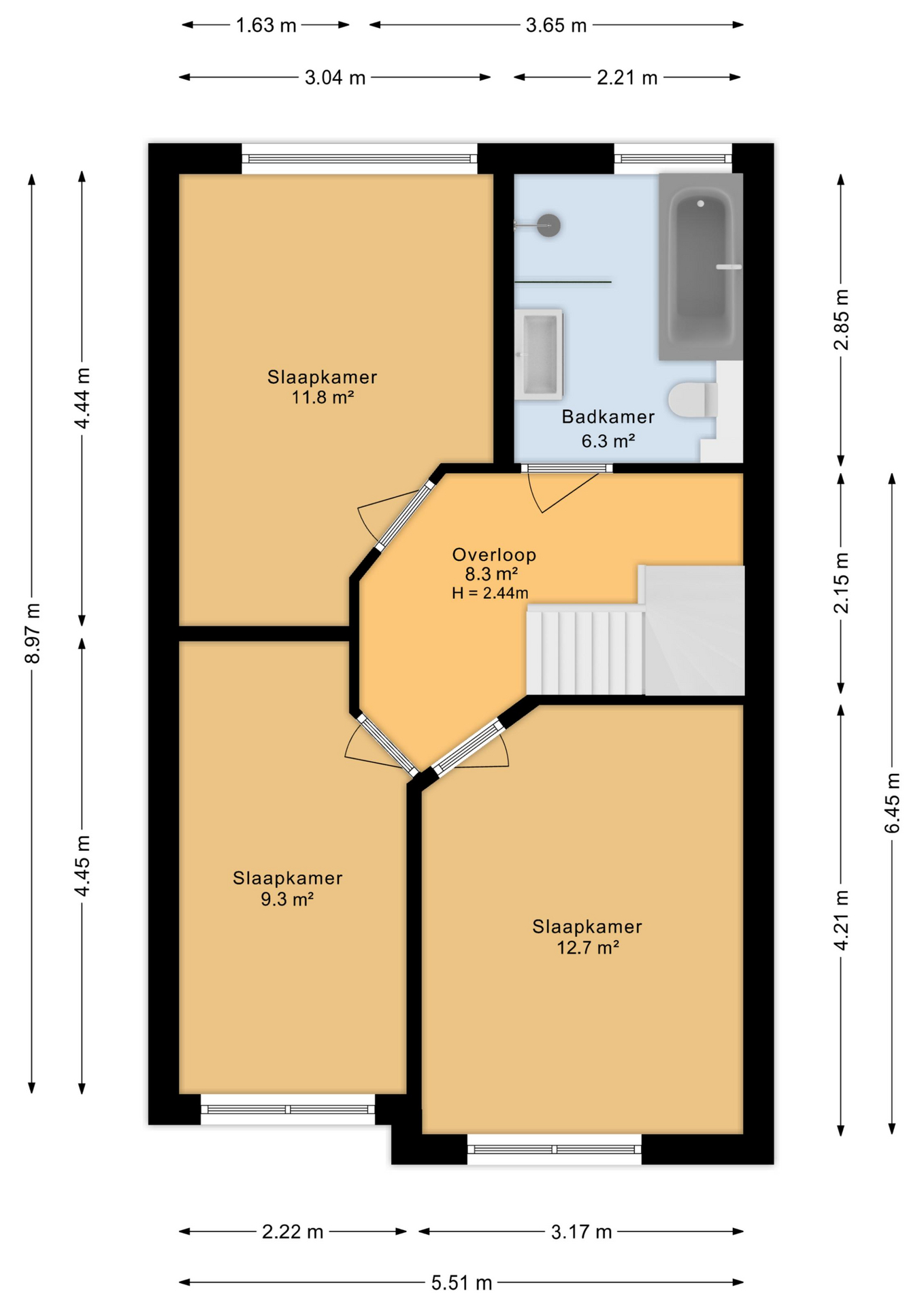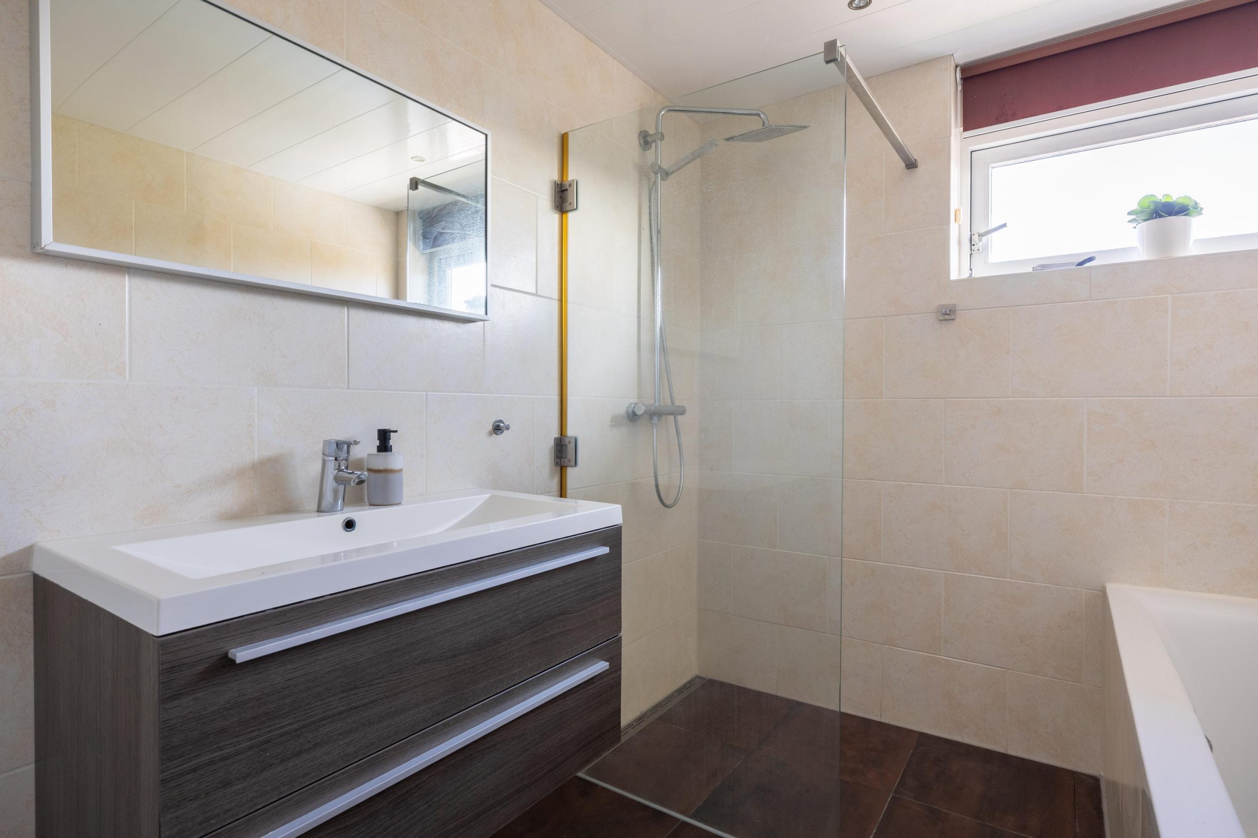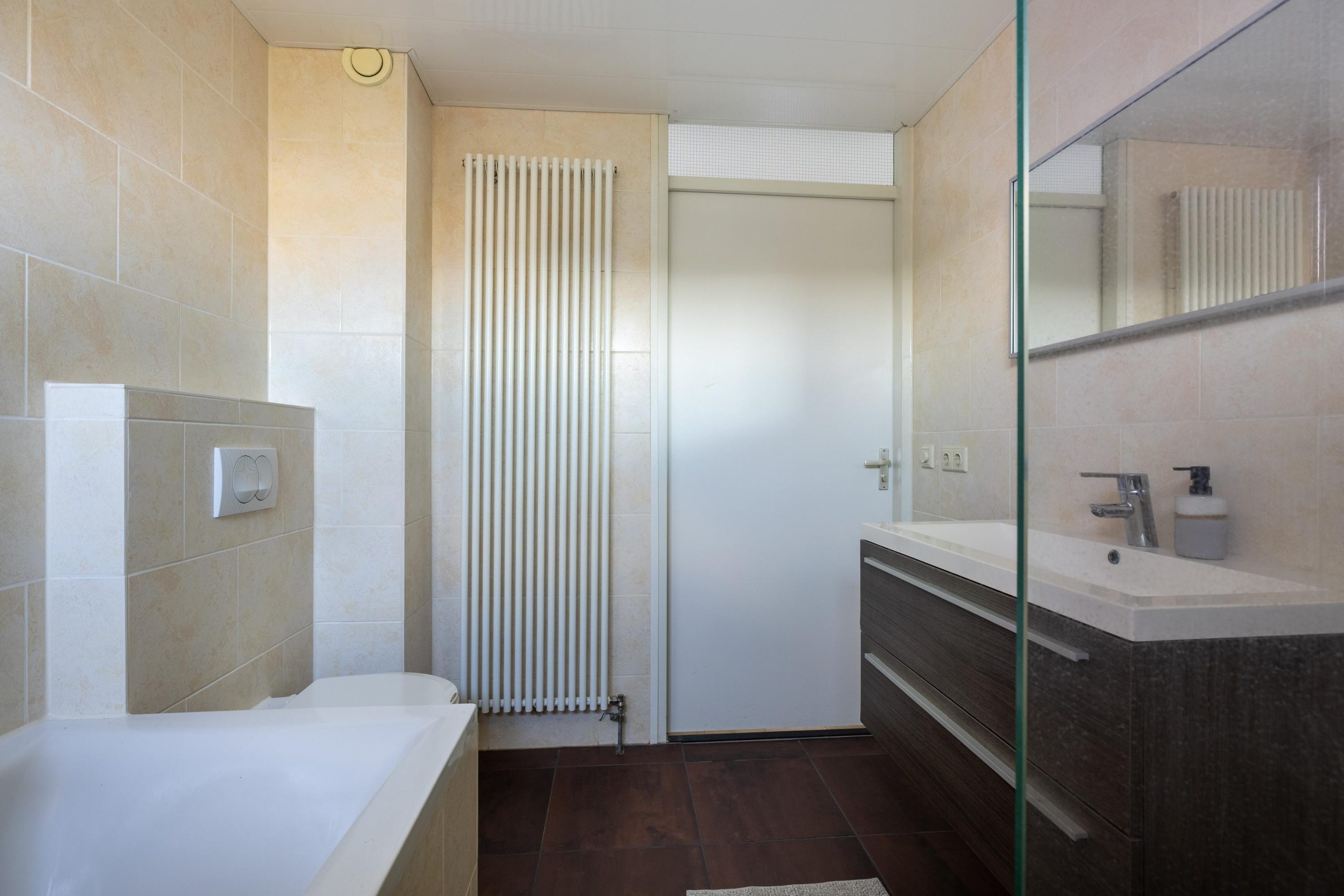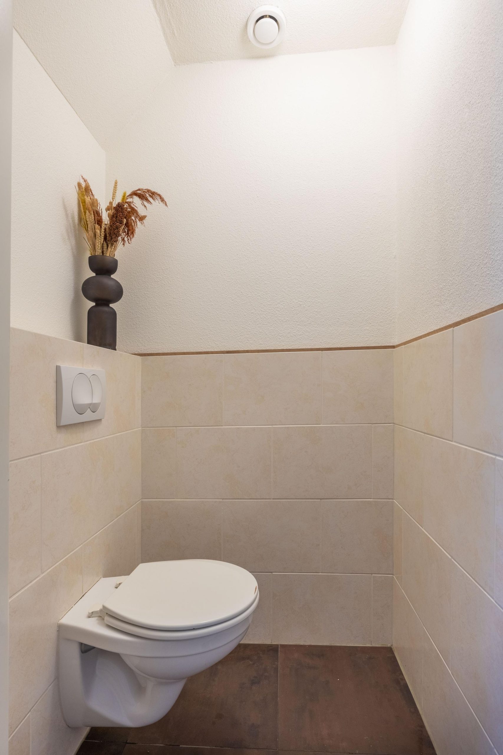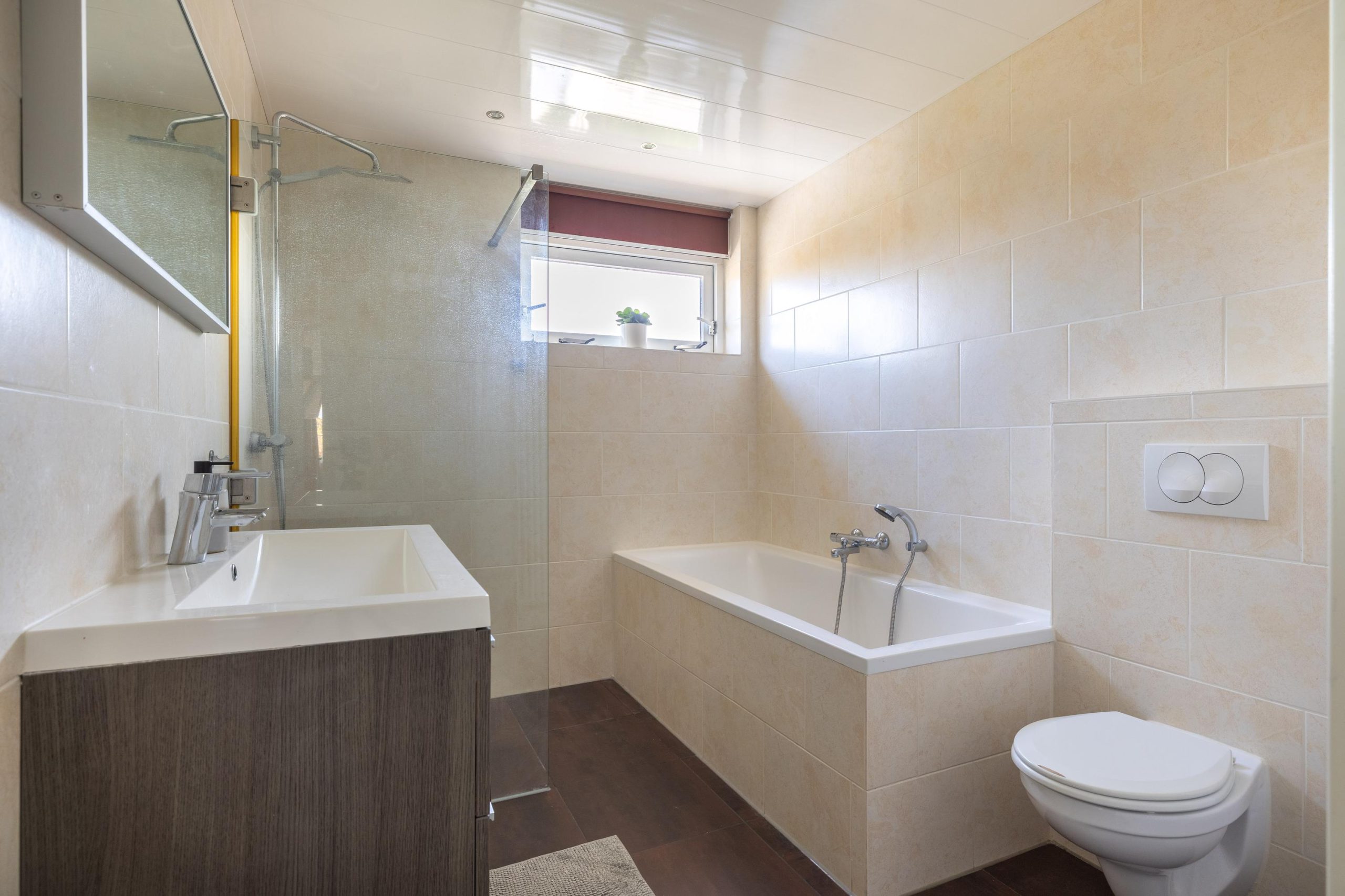 Op de eerste verdieping liggen drie fijne slaapkamers, stuk voor stuk netjes afgewerkt en met een prettige lichtinval. De badkamer is ruim opgezet en voorzien van een ligbad, aparte douche, toilet en wastafelmeubel. De afwerking is rustig en tijdloos, waardoor je hier direct een ontspannen sfeer ervaart.