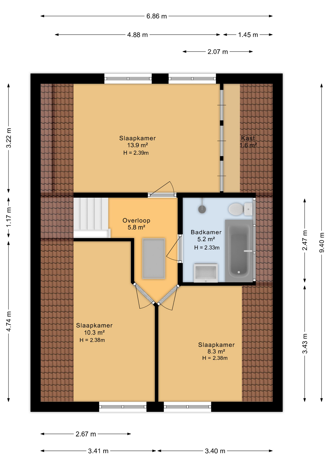 Op de eerste verdieping vind je een overloop met drie slaapkamers van goed formaat. De badkamer is compleet uitgerust met een ligbad, douche, tweede toilet en wastafel – alles wat je nodig hebt!