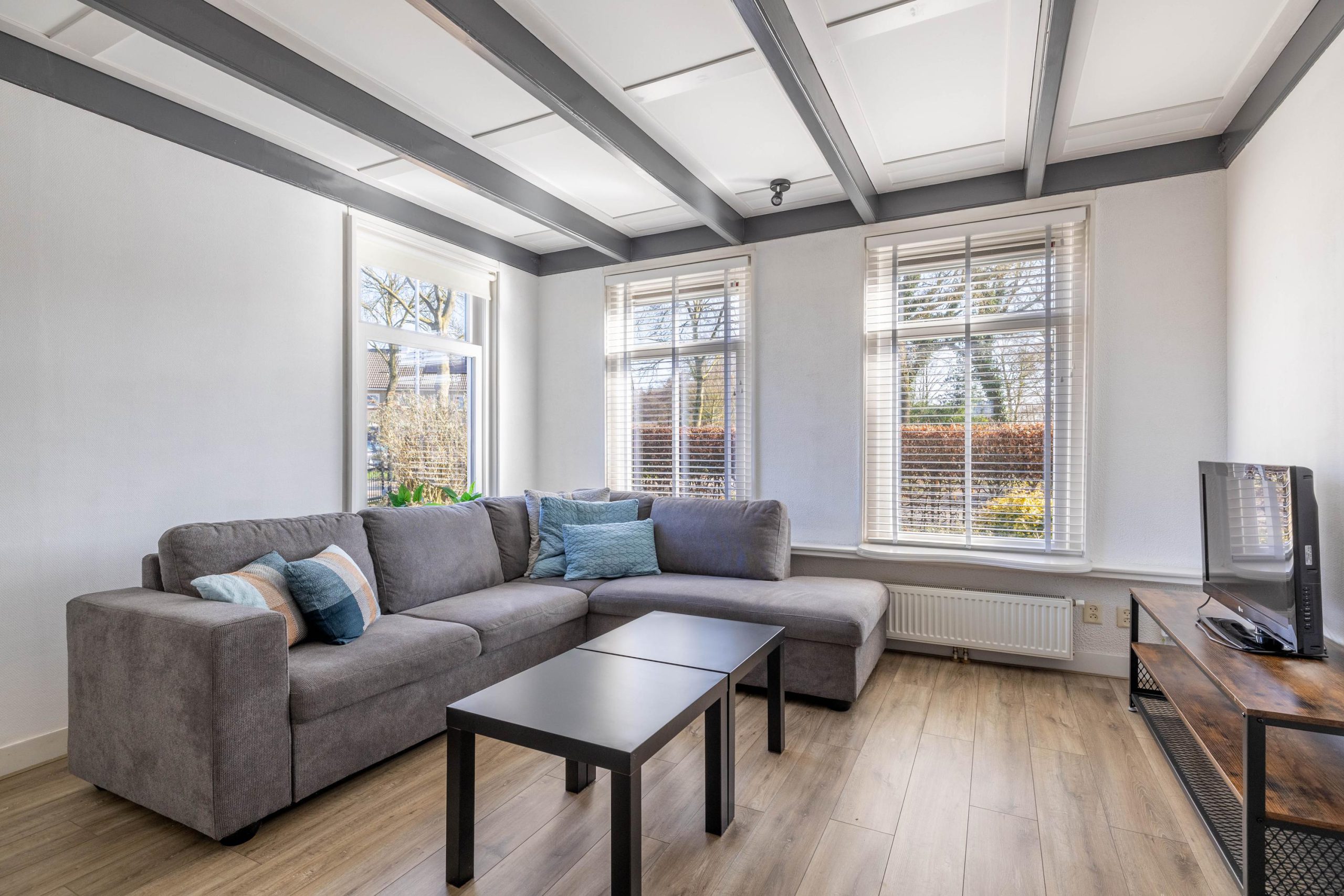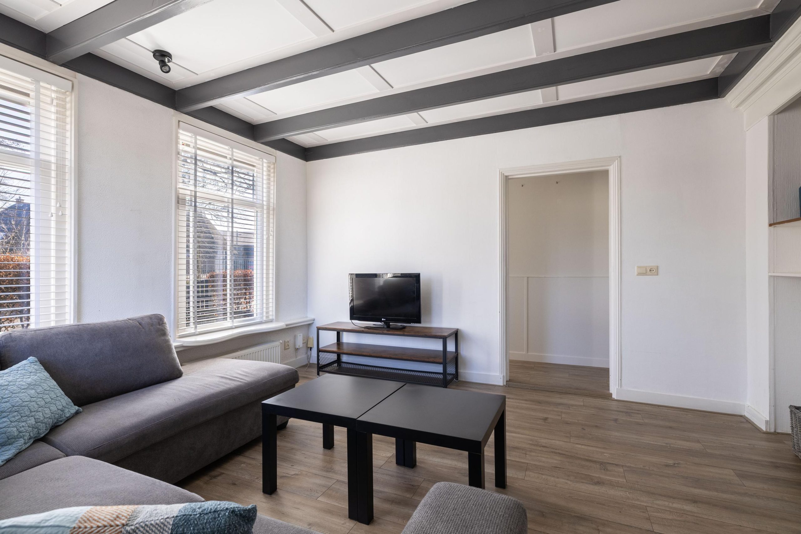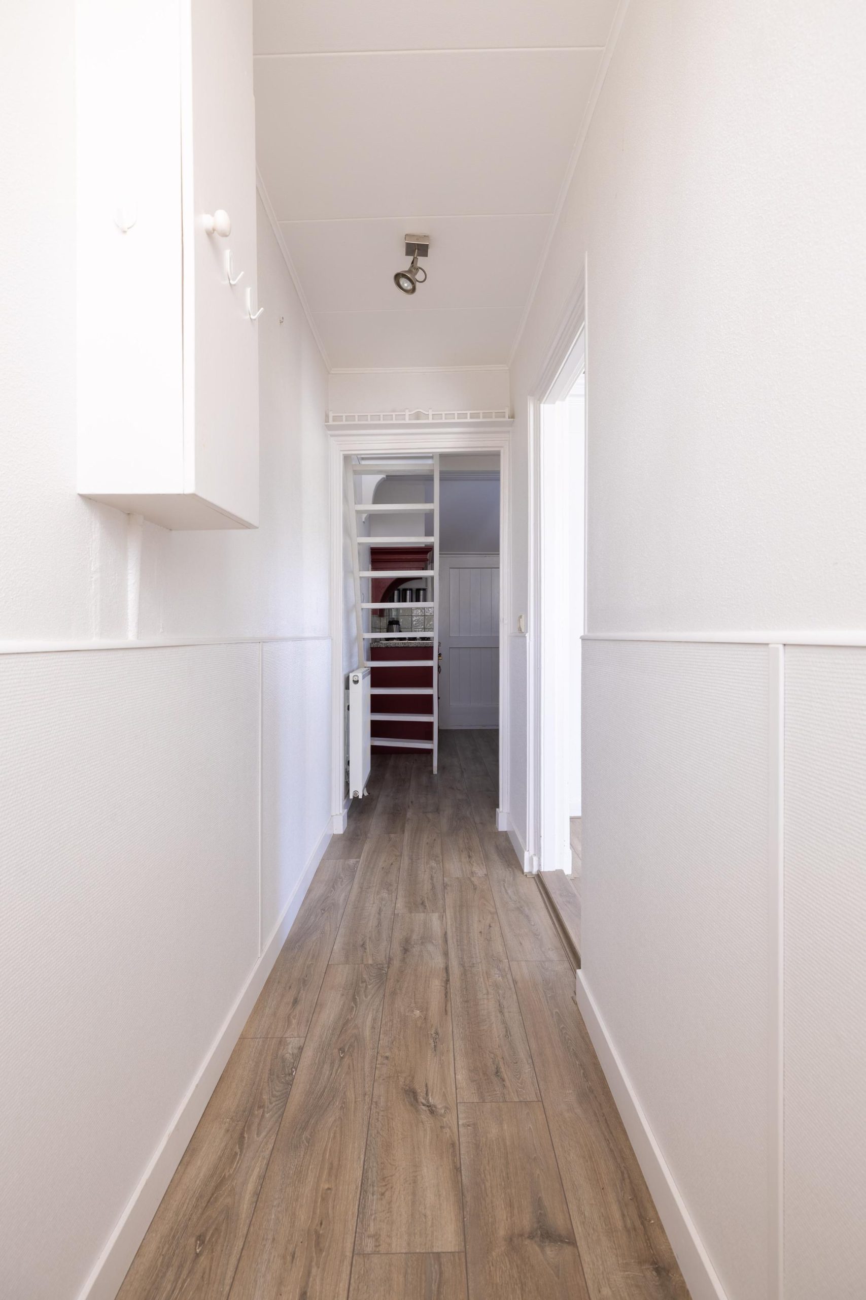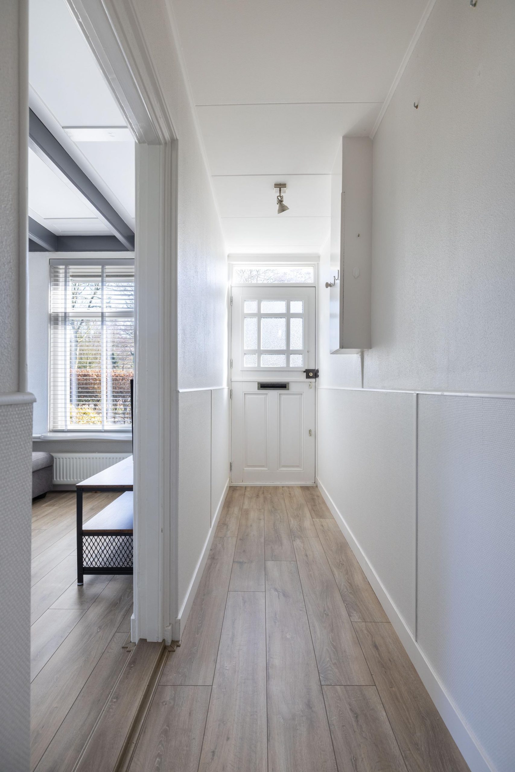 Via het voortuintje stap je de woning binnen in de hal. Rechts vind je de woonkamer, een fijne ruimte die je helemaal naar eigen smaak kunt inrichten. Zie je het al voor je? Een comfortabele bank bij het raam, een goede kop koffie in de hand en uitzicht op het groen.