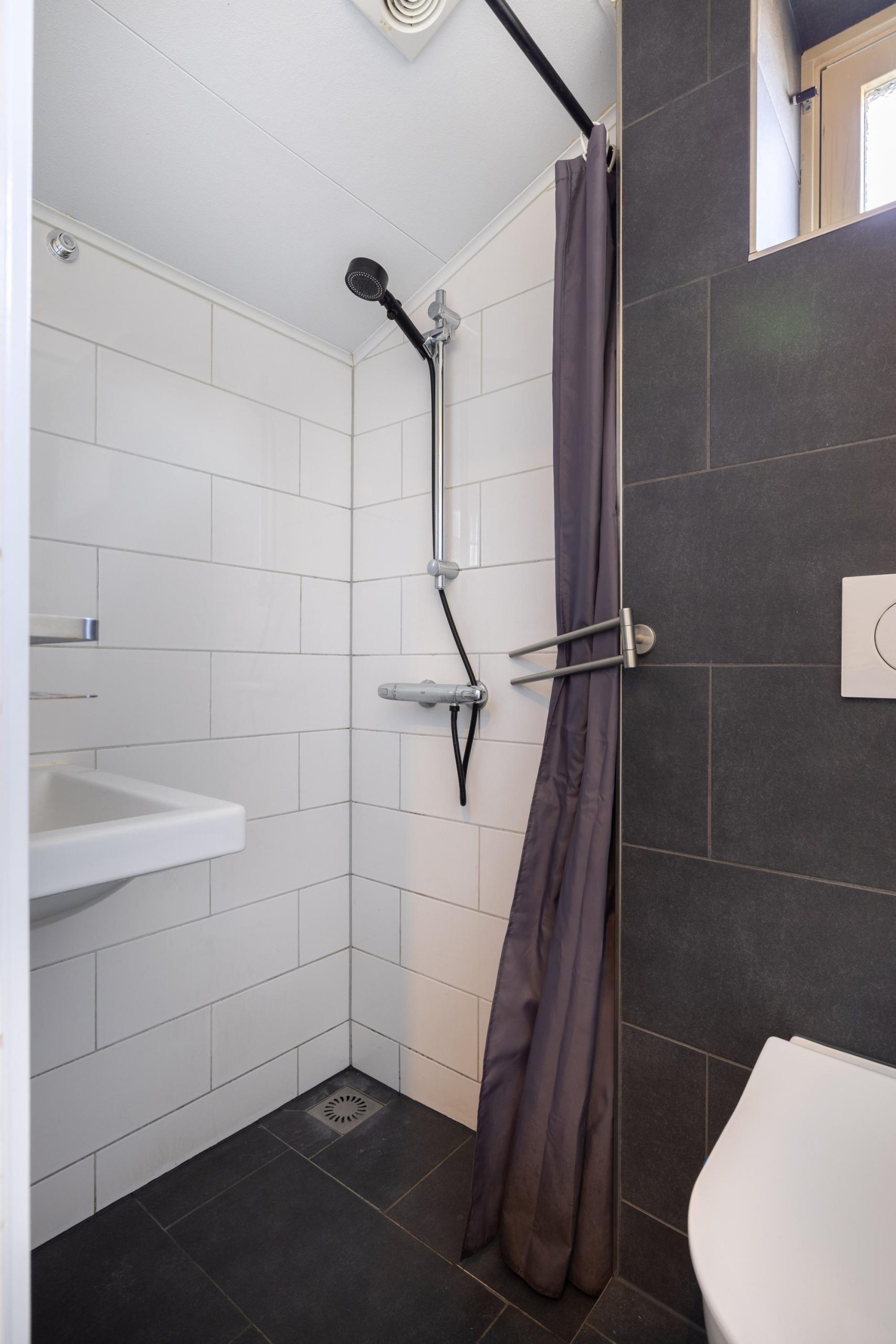 Loop je verder, dan kom je in de keuken. Deze is helemaal in stijl met het huis en voorzien van alles wat je nodig hebt om lekker te koken. Aansluitend vind je de badkamer met toilet, douche en wastafel. Praktisch en compleet. Ook is er een bijkeuken waar je eenvoudig je wasmachine kwijt kunt en extra bergruimte hebt.