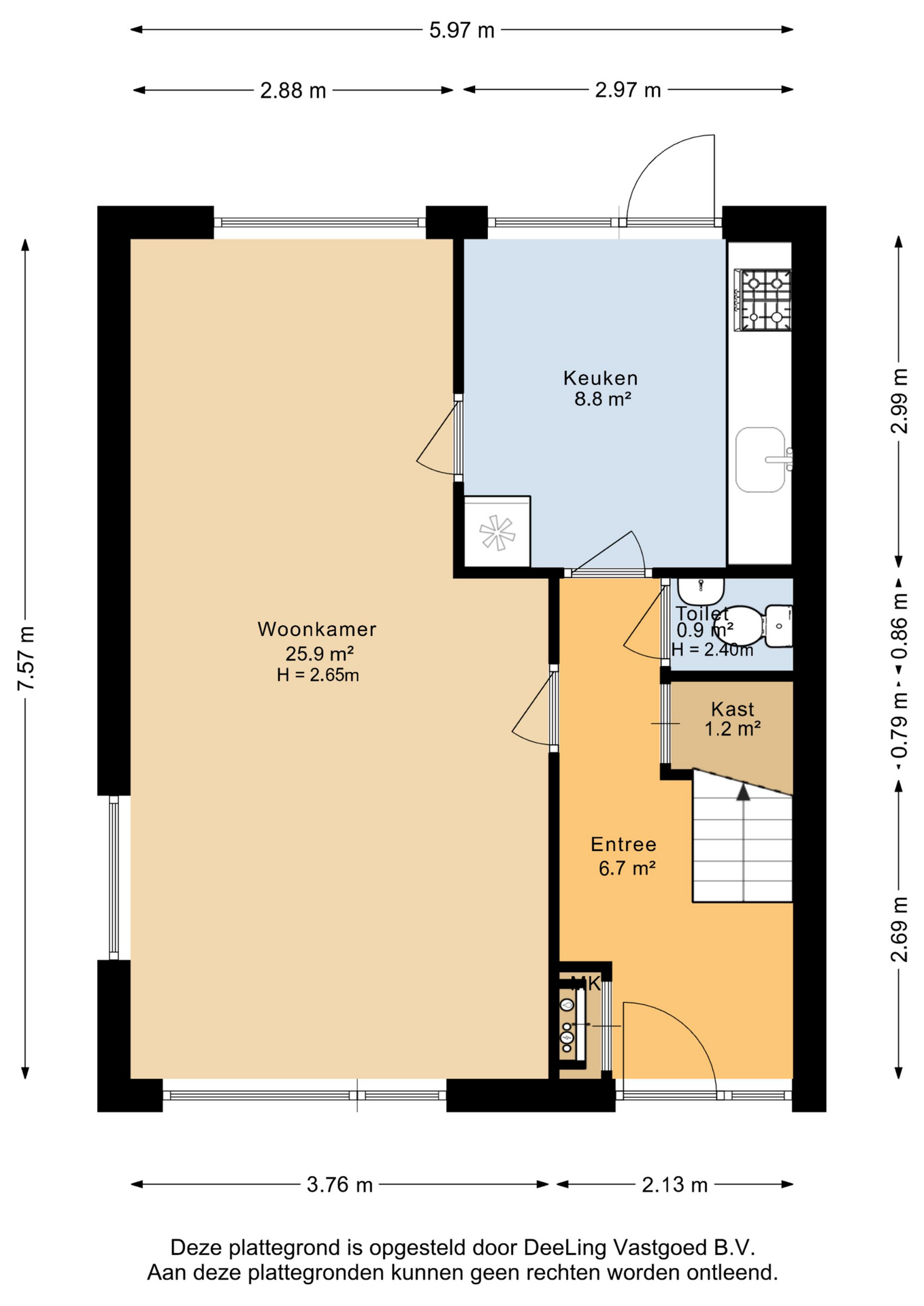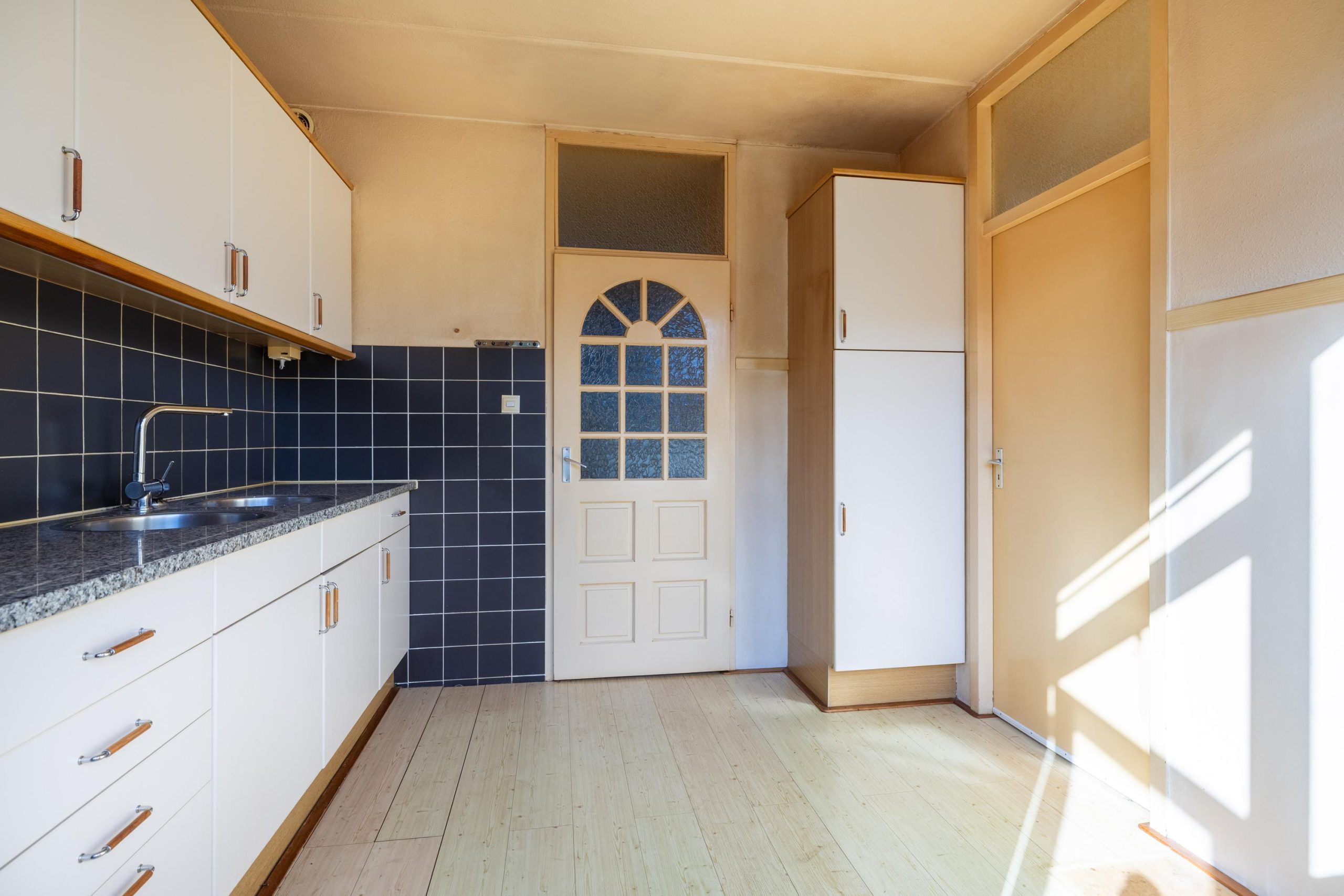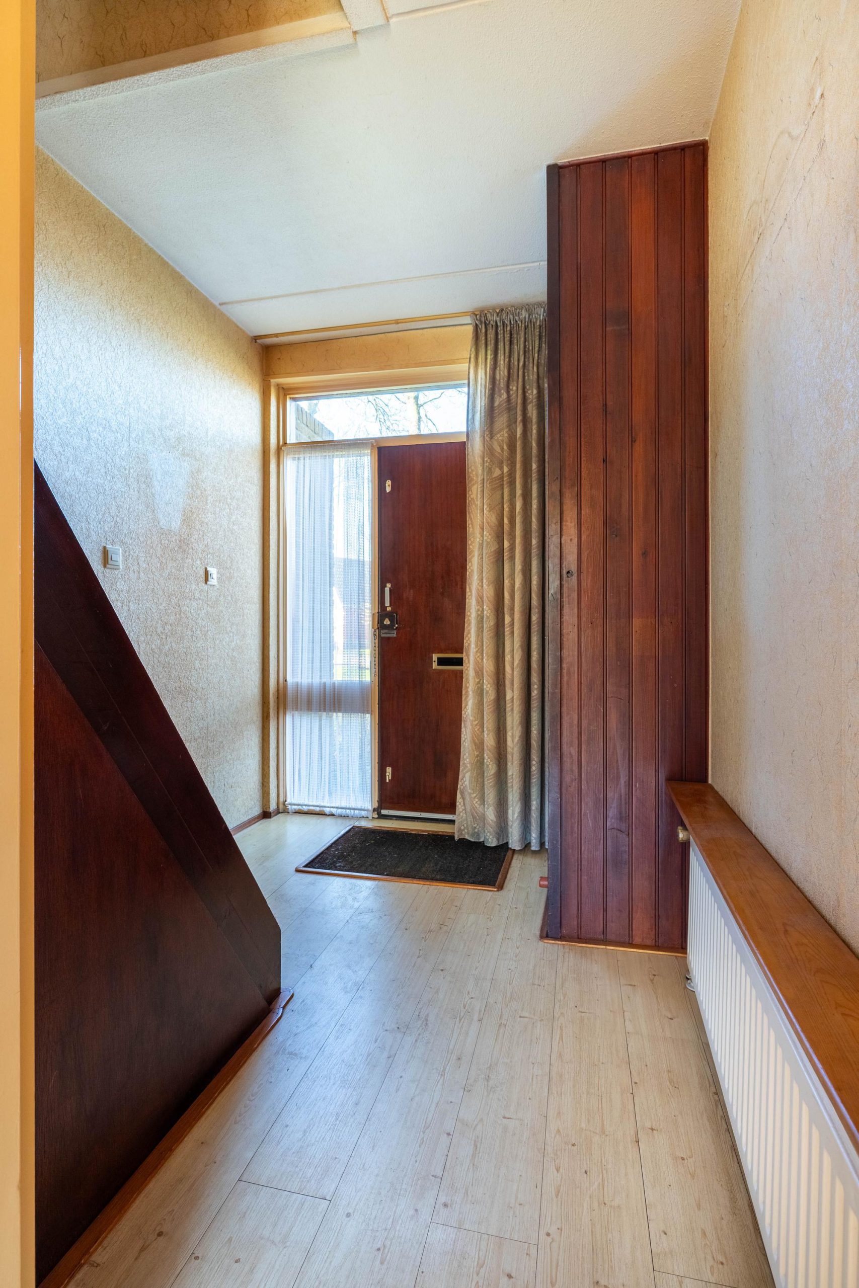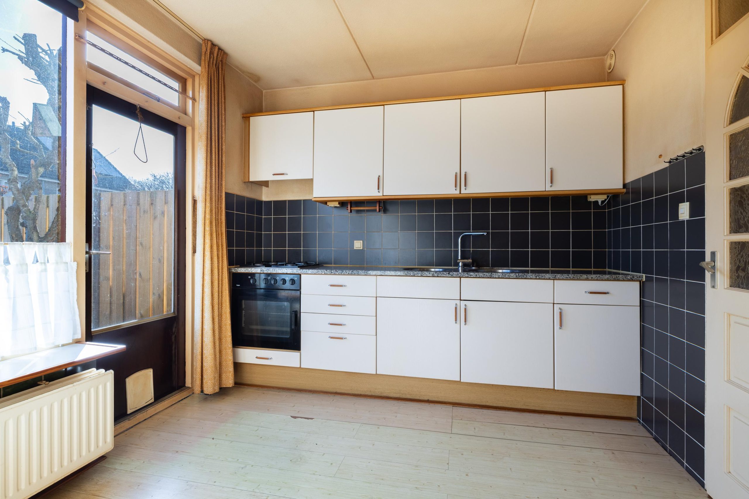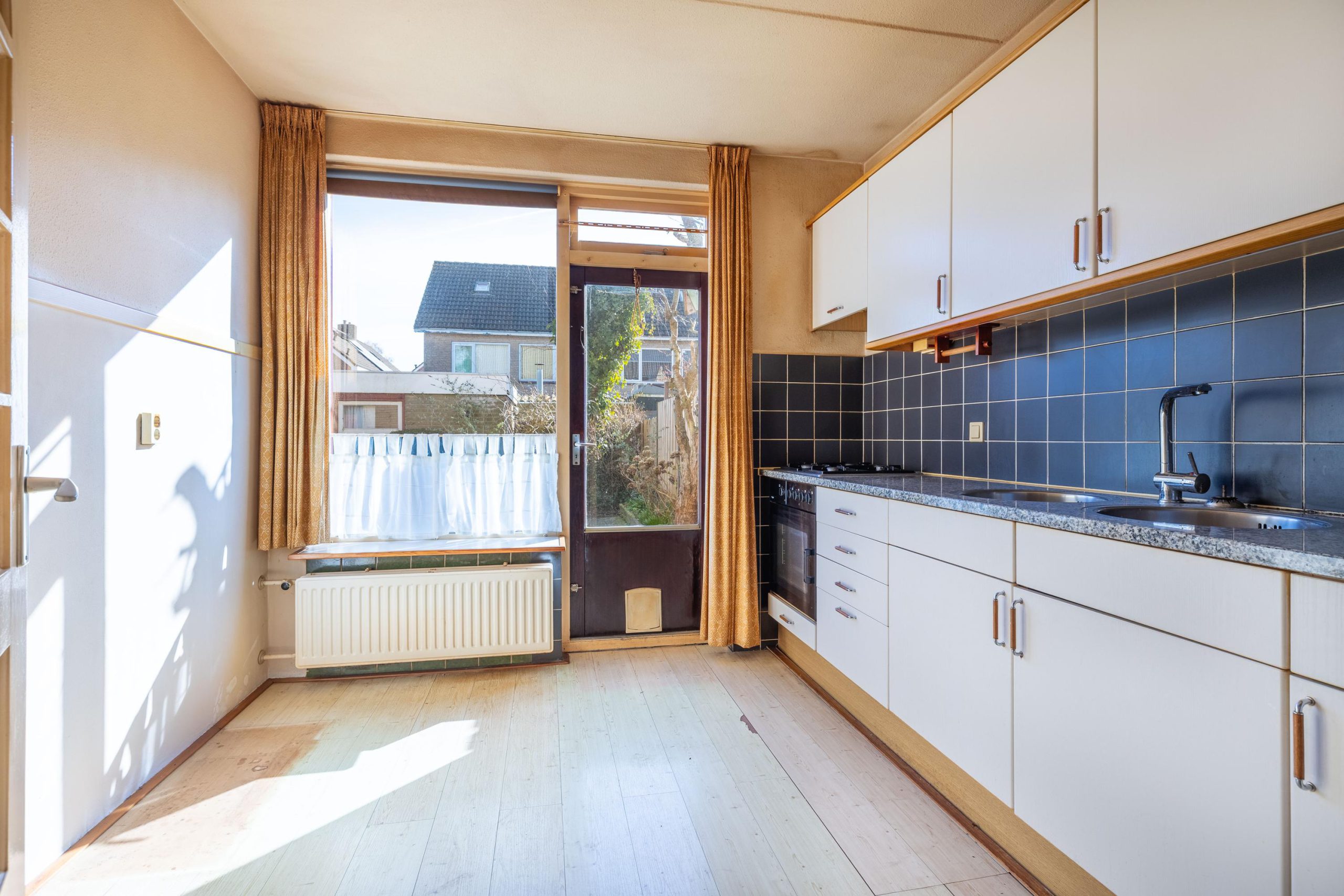 Je komt binnen in een ruime hal met direct een praktische trapkast onder de trap en een toilet. Vanuit hier loop je door naar de woonkamer aan de linkerzijde, waar de vele ramen zorgen voor een prettige lichtinval en een open gevoel. De woonkamer staat in verbinding met de keuken, die zowel vanuit de hal als vanuit de woonkamer bereikbaar is. De keuken voorzien van een oven en een 4-pits gasfornuis, maar biedt volop mogelijkheden om hier jouw eigen droomkeuken te realiseren.