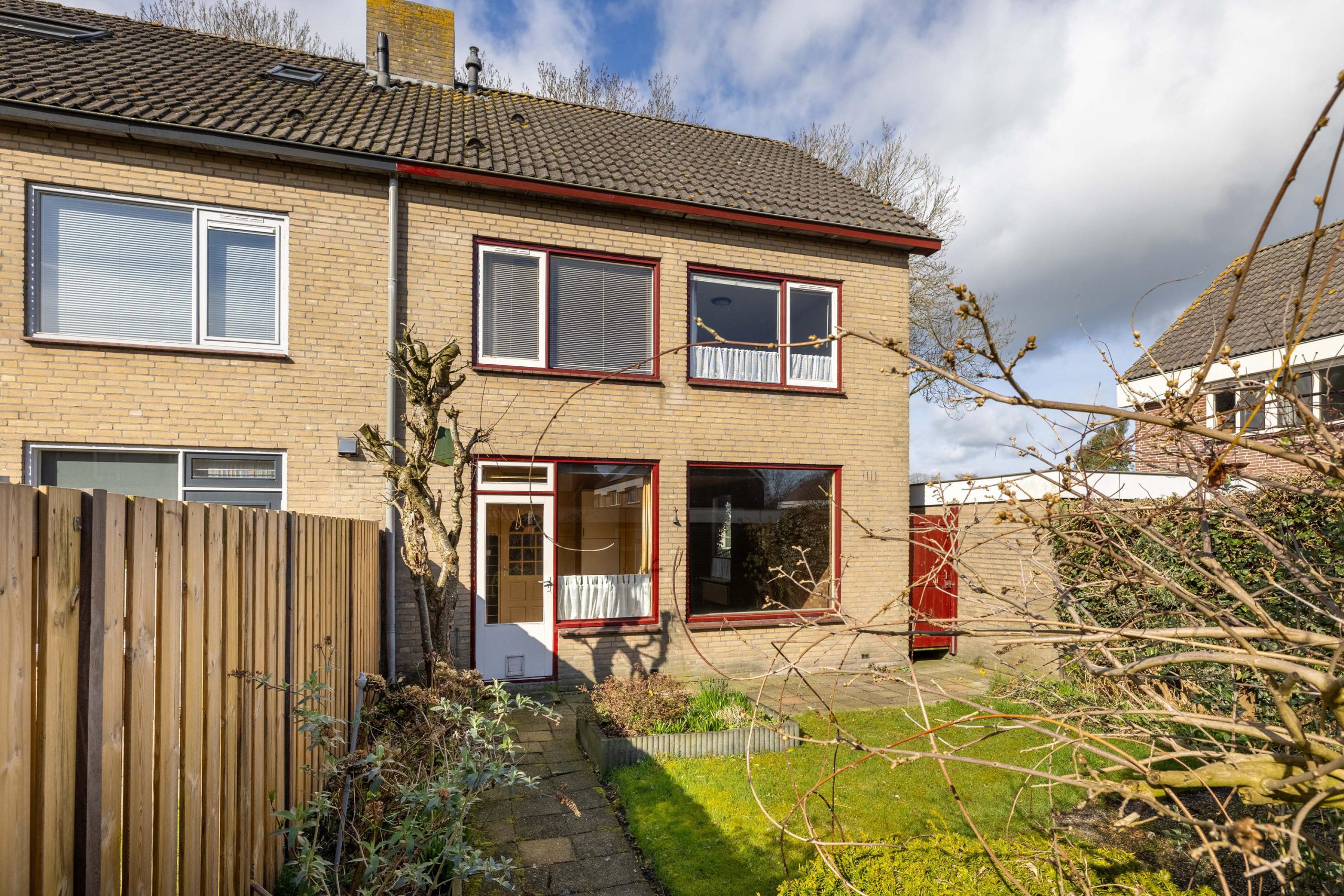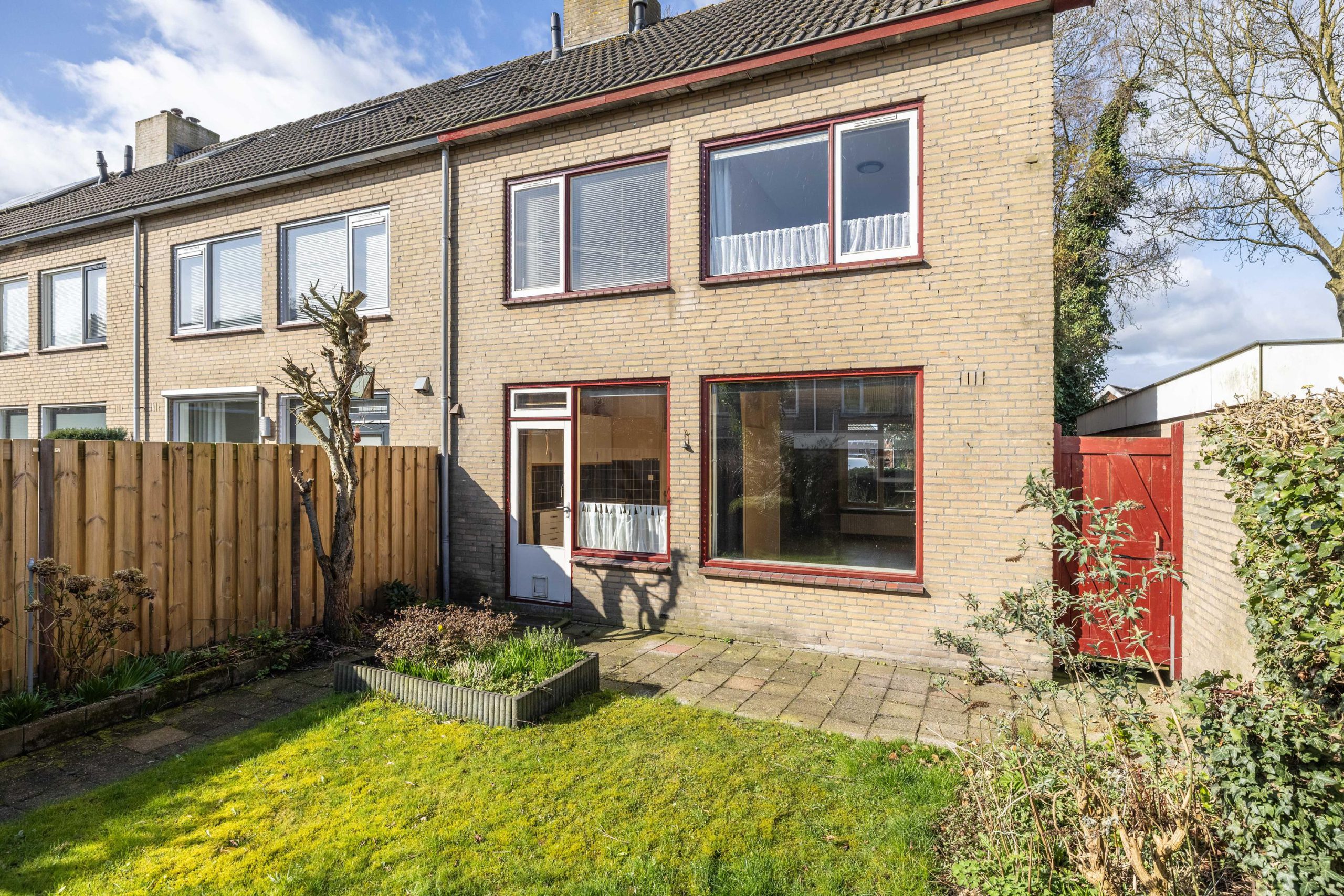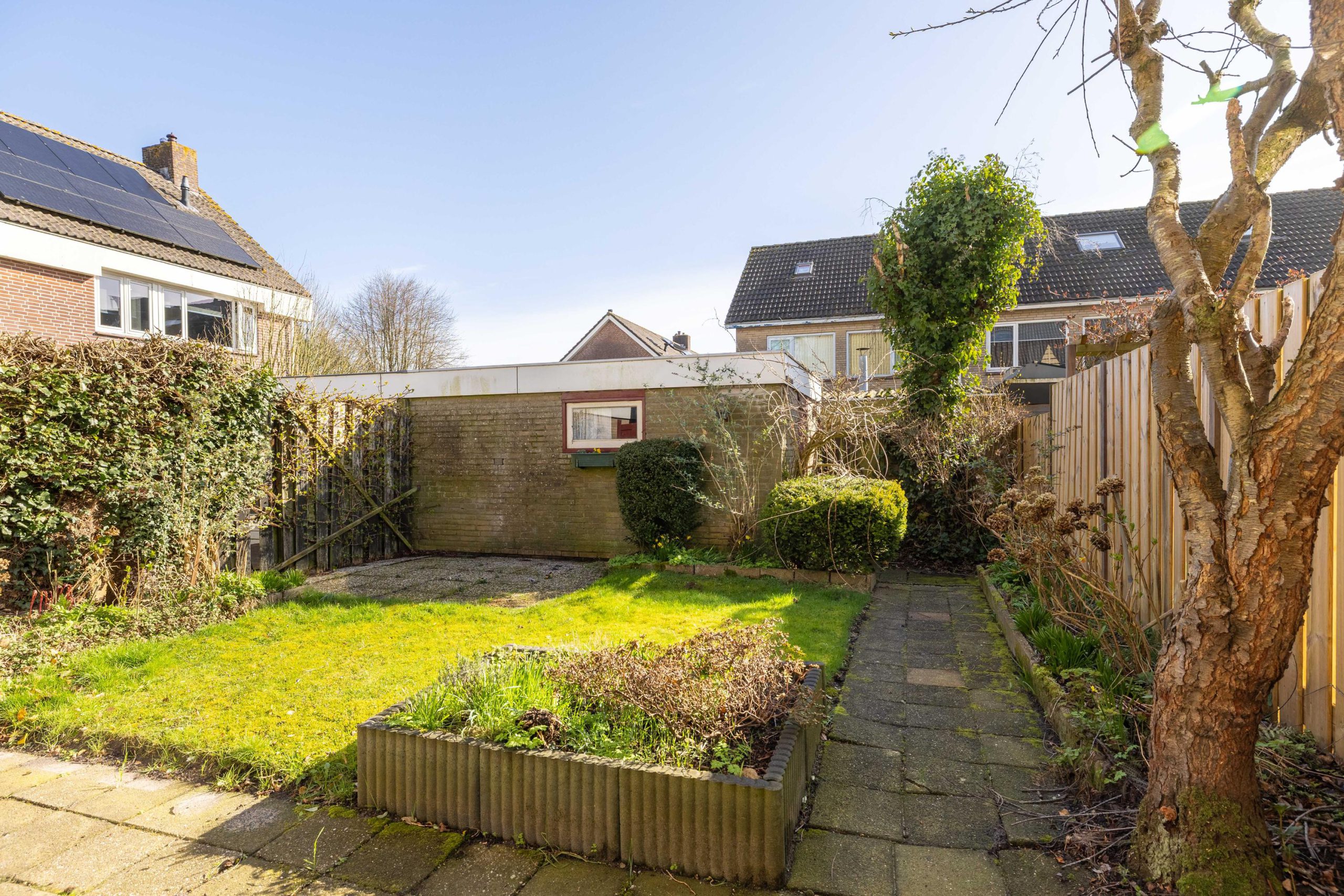 Vanuit de keuken stap je zo de achtertuin in. Een zonnige plek waar je al snel lekker buiten zit. De tuin beschikt over een stenen berging en is extra praktisch dankzij de achterom, zowel aan de achterzijde als via de zijkant van de woning.