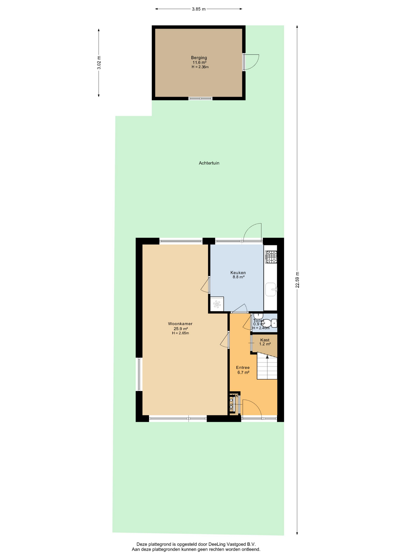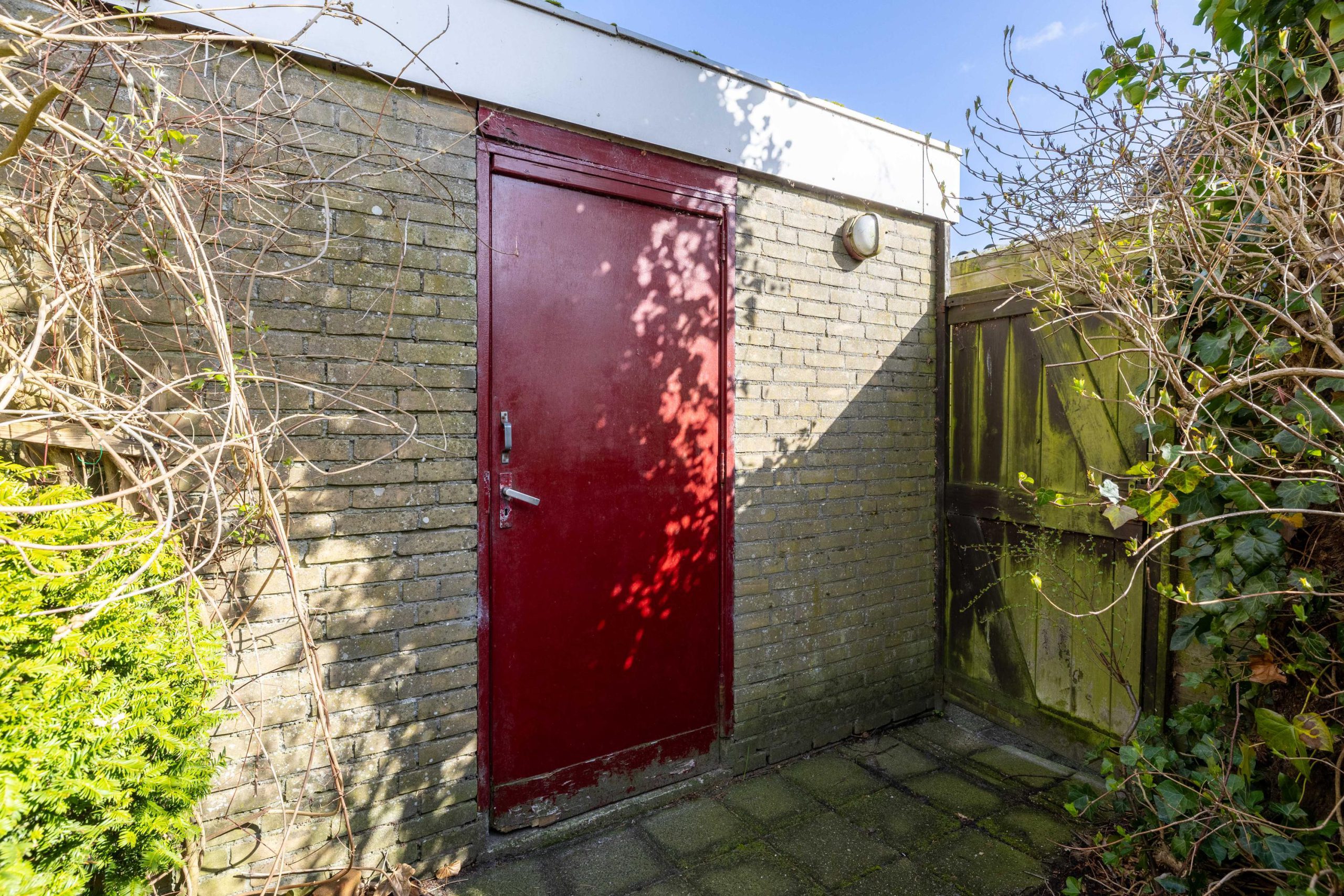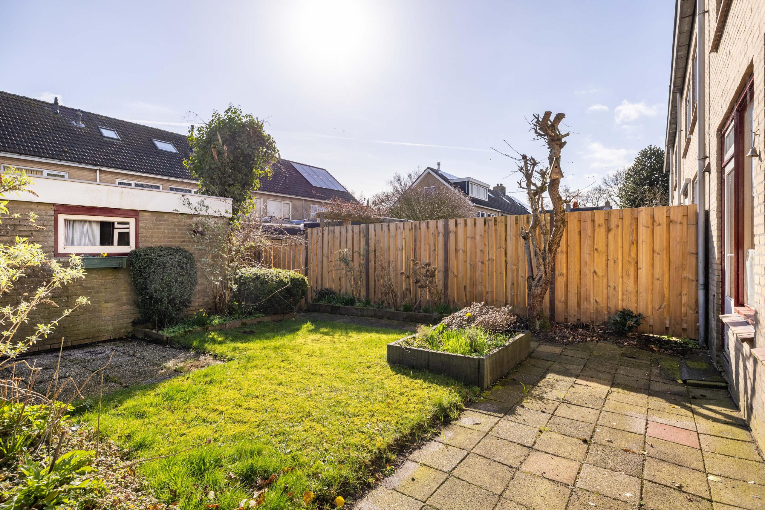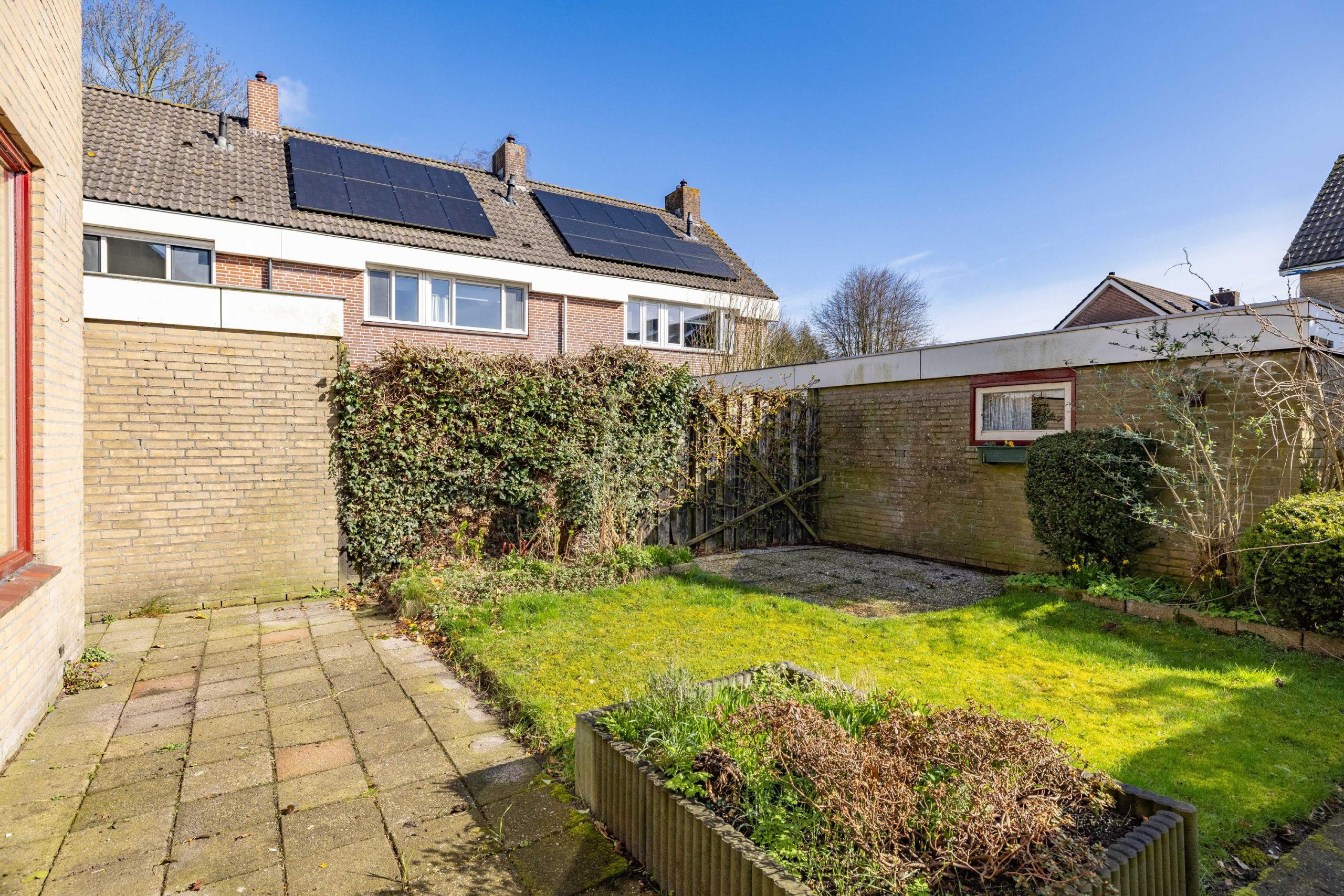 Vanuit de keuken stap je zo de achtertuin in. Een zonnige plek waar je al snel lekker buiten zit. De tuin beschikt over een stenen berging en is extra praktisch dankzij de achterom, zowel aan de achterzijde als via de zijkant van de woning.