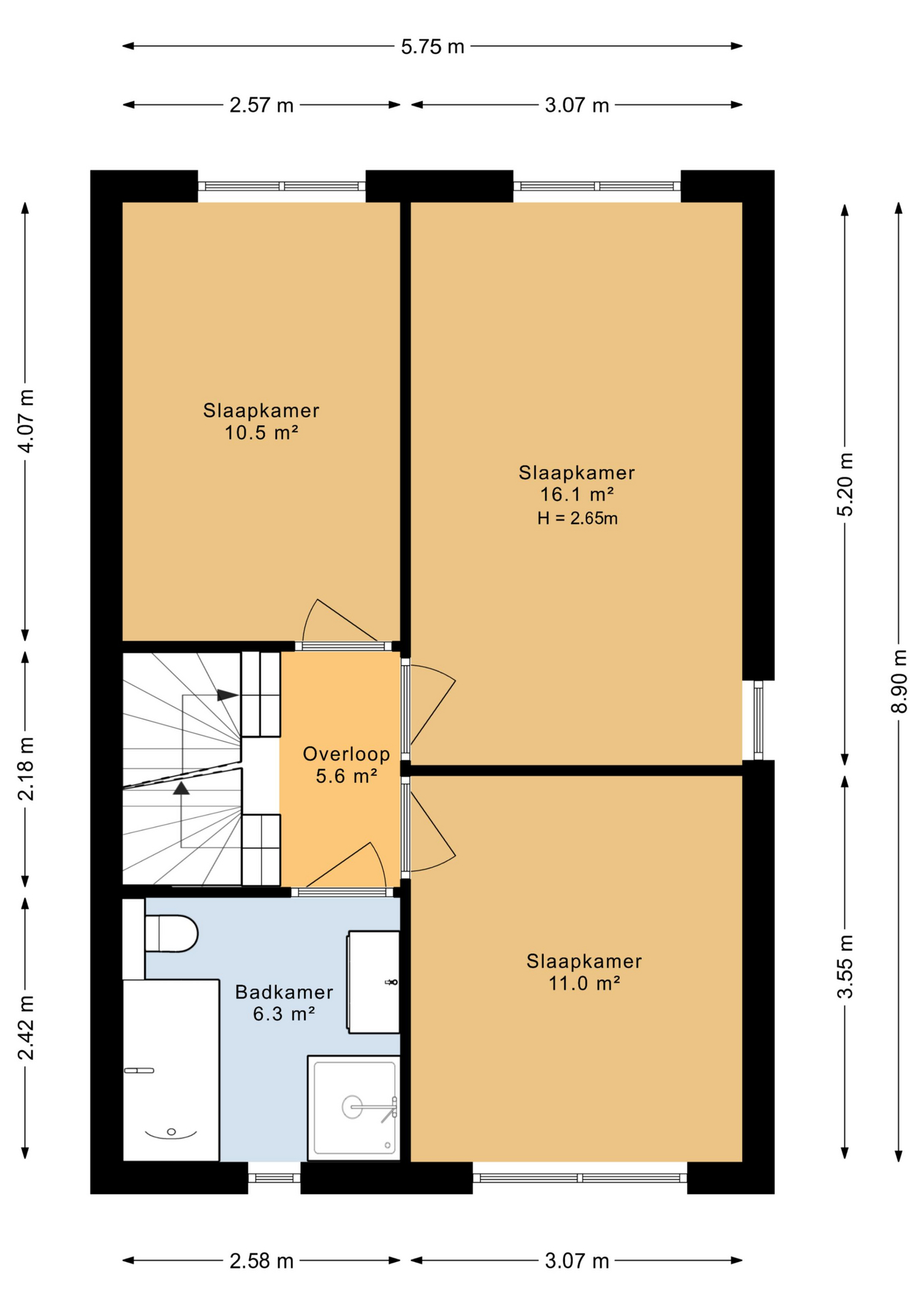 Op de eerste verdieping bevinden zich drie slaapkamers, prettig van formaat en flexibel in te delen. De badkamer is compleet uitgevoerd en gerenoveerd in 2018 met een wastafel, douche, ligbad en toilet.