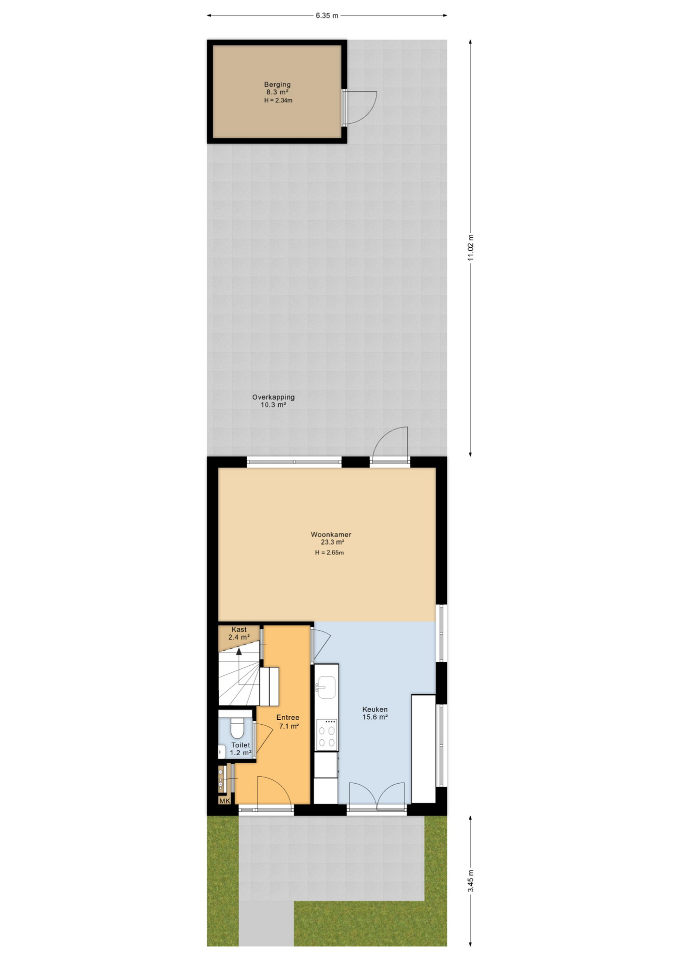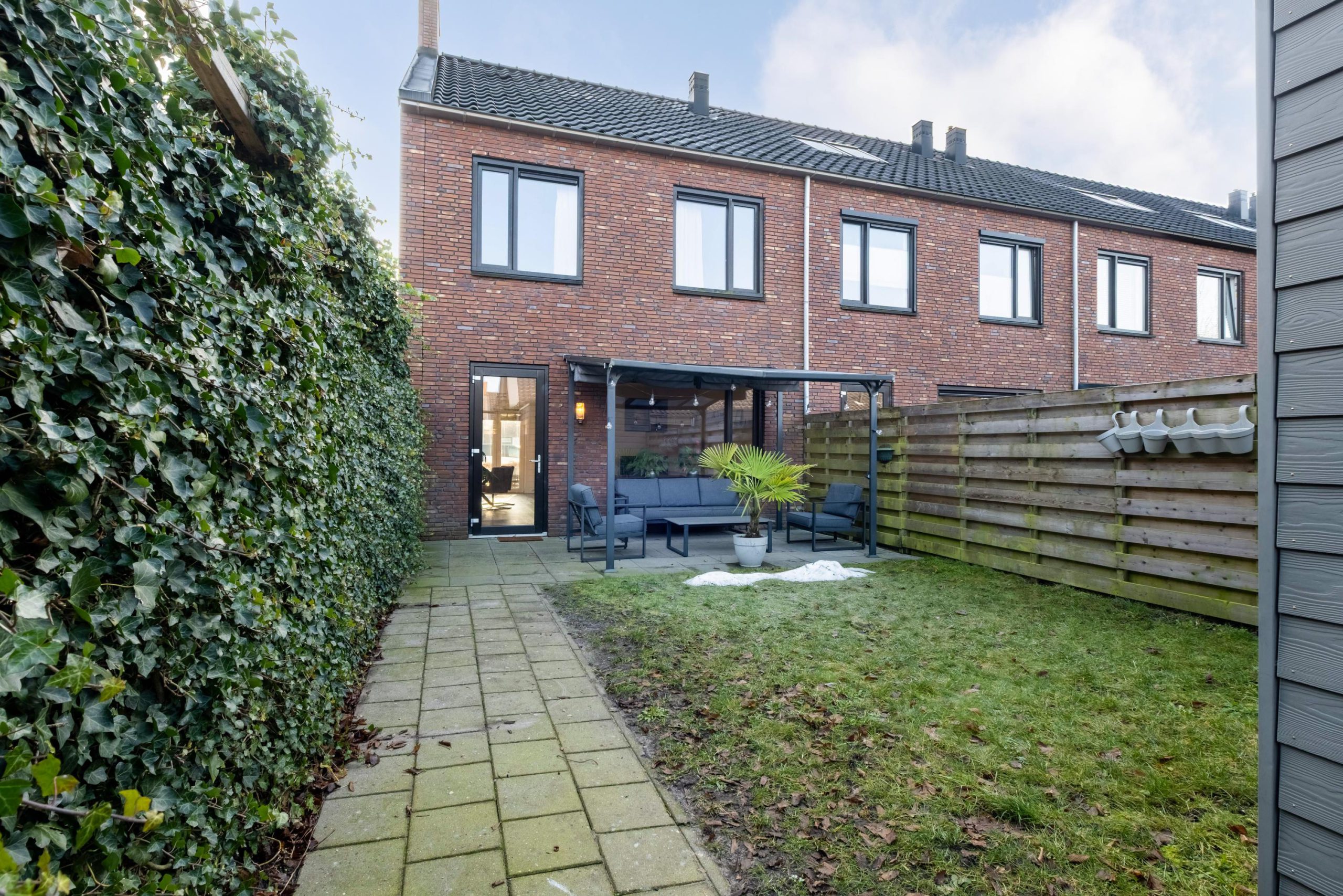 - Achtertuin op het noordwesten met achterom en houten schuur
