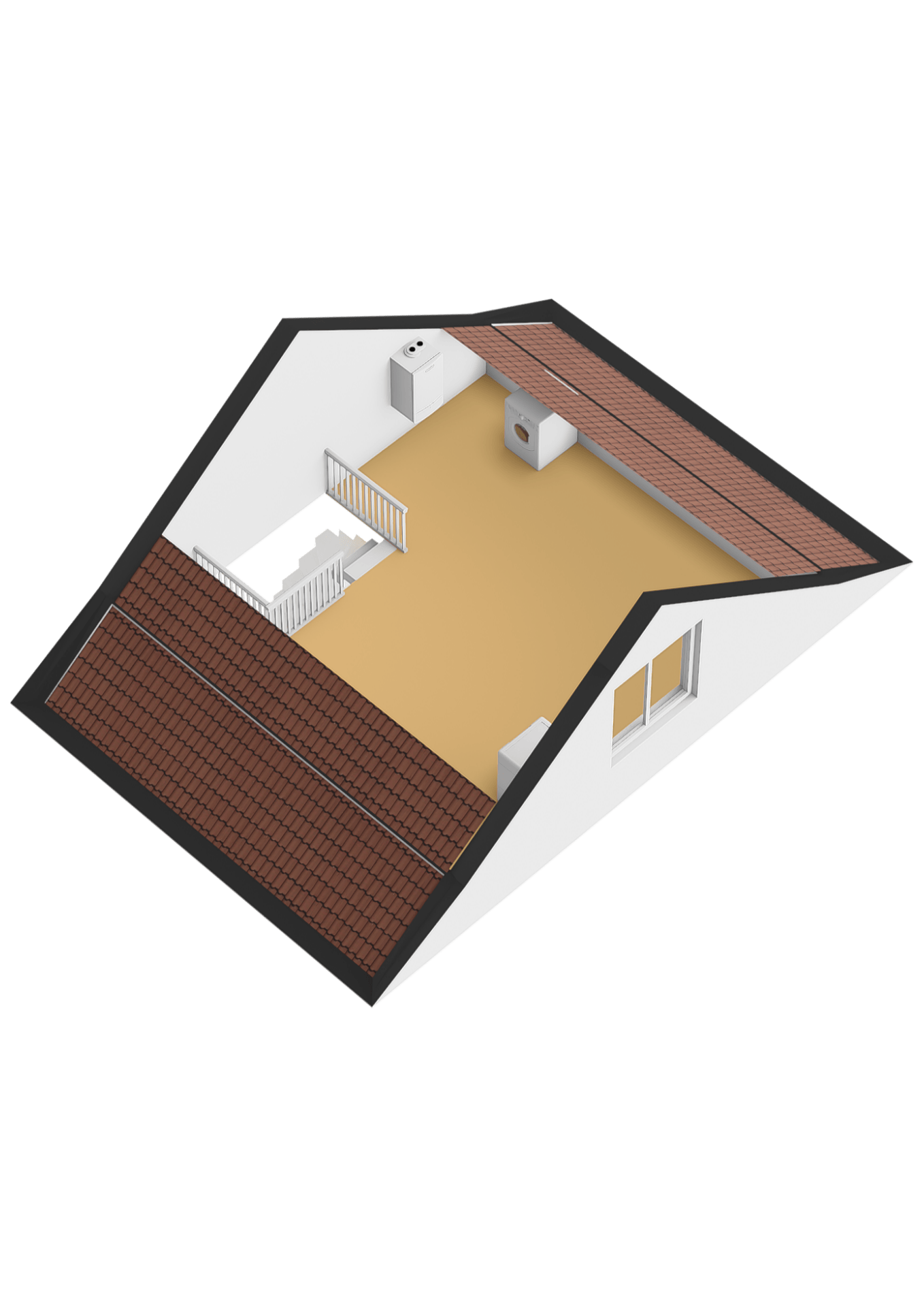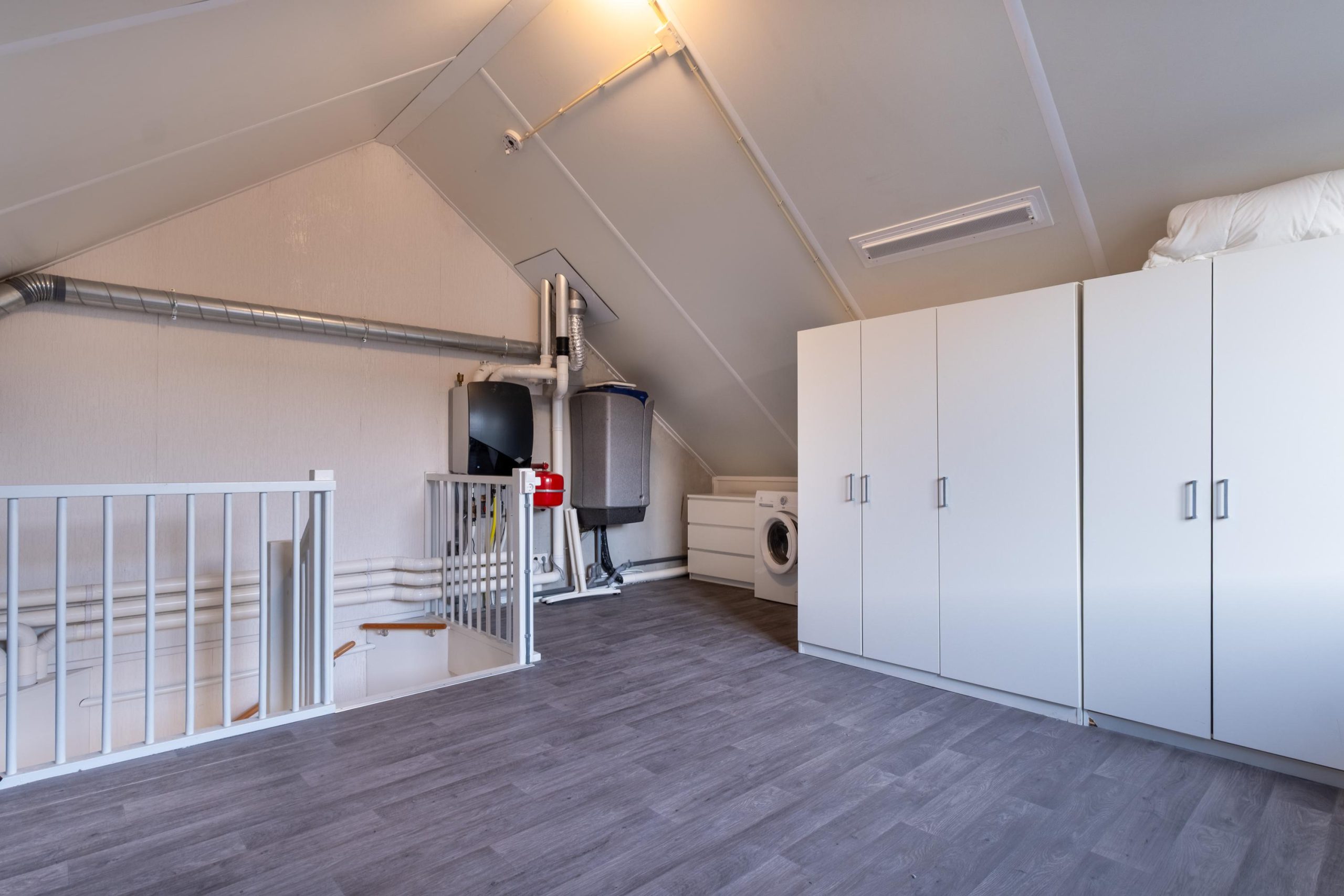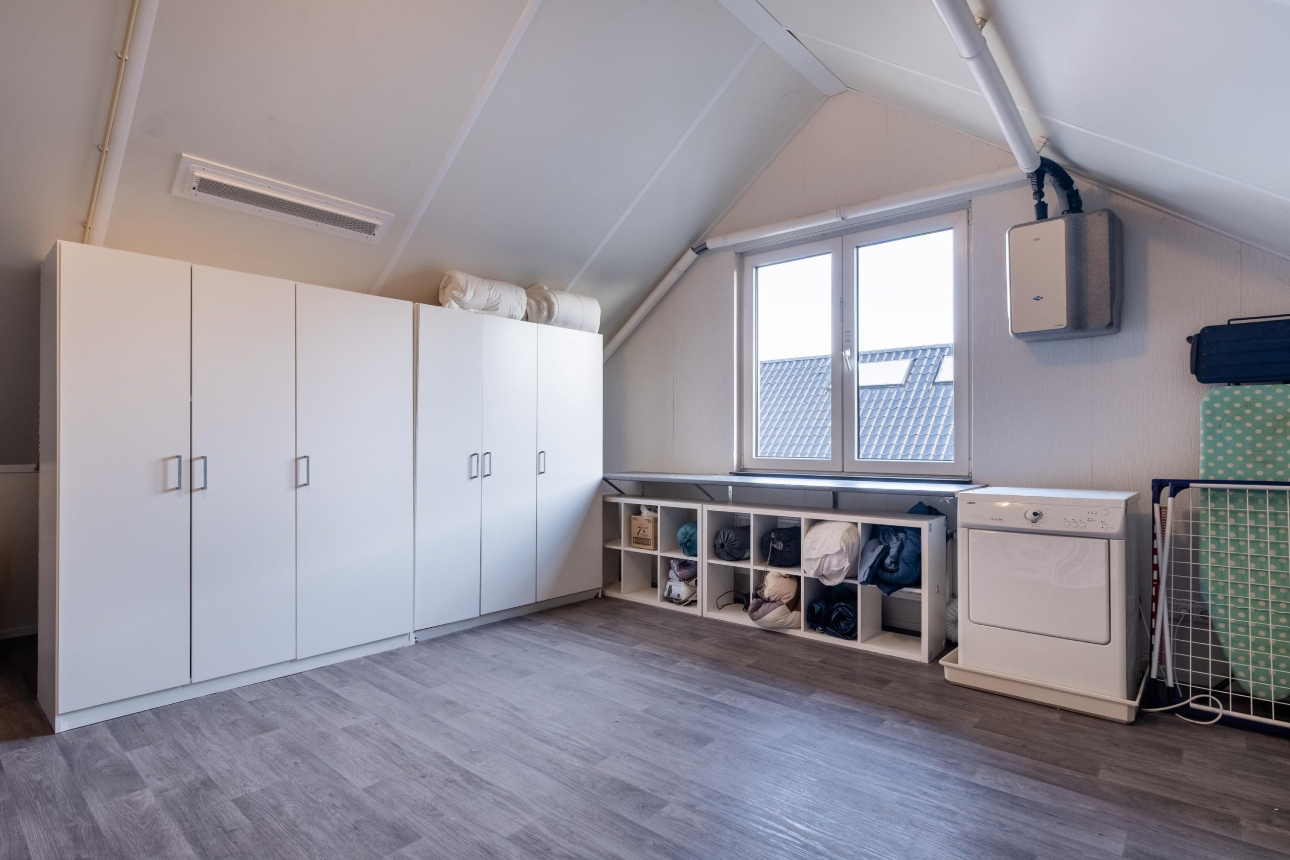De tweede verdieping is ingericht als zolder met wasruimte. Hier bevinden zich ook de cv opstelling en de boiler. Een praktische en multifunctionele ruimte met volop bergruimte of zelfs een plek waar een extra slaapkamer kan komen.