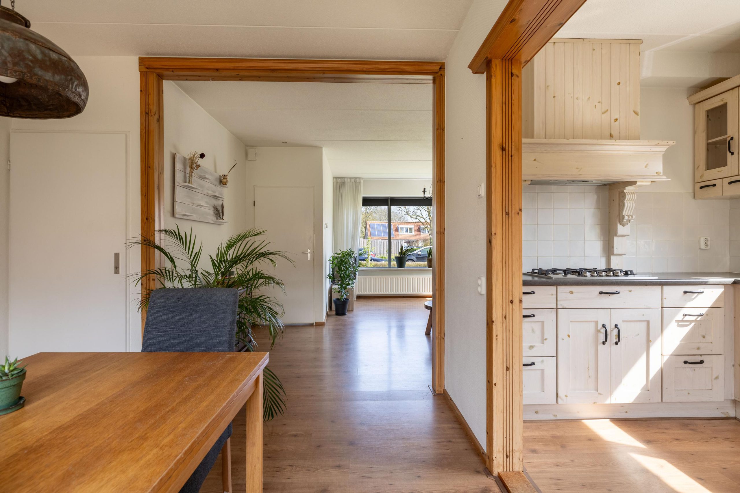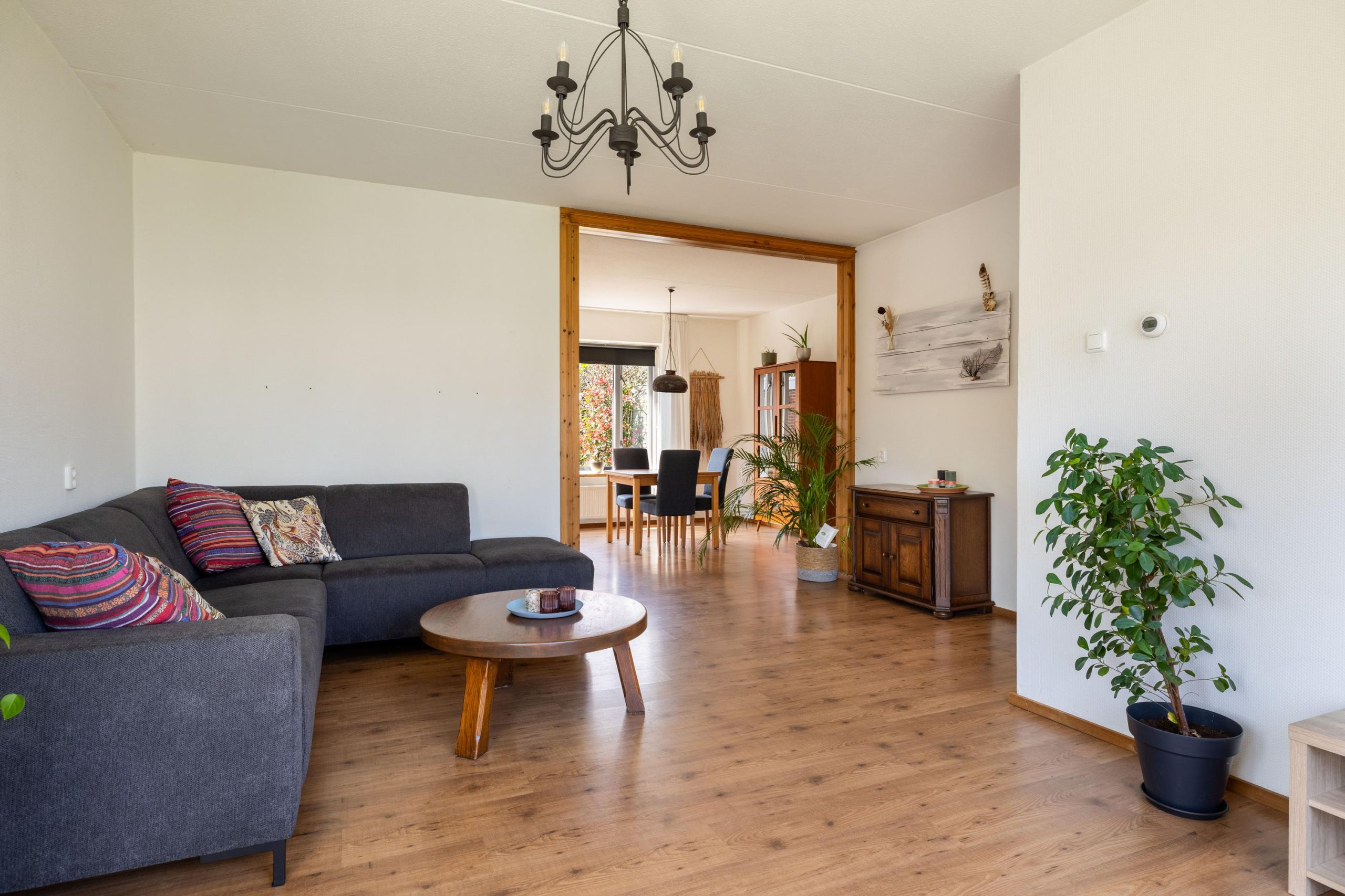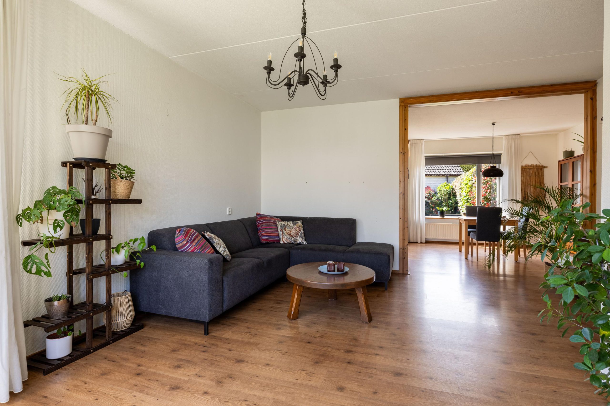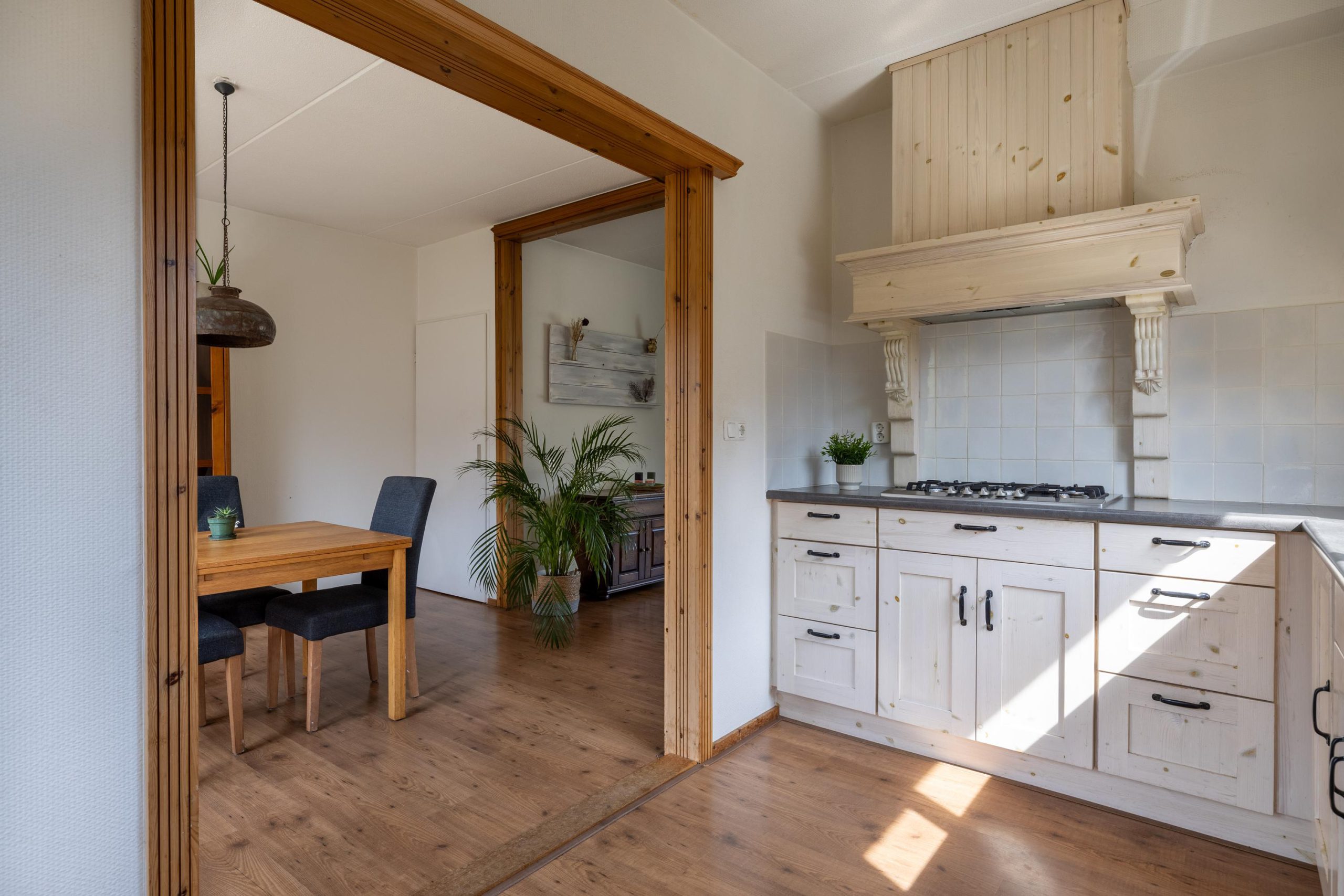 De woonkamer voelt verrassend ruim en open aan. - De huidige indeling is gericht op licht en verbinding en de houten bogen geven karakter aan de ruimte. De woonkamer loopt naadloos over in de keuken, wat zorgt voor een fijne, open leefomgeving.