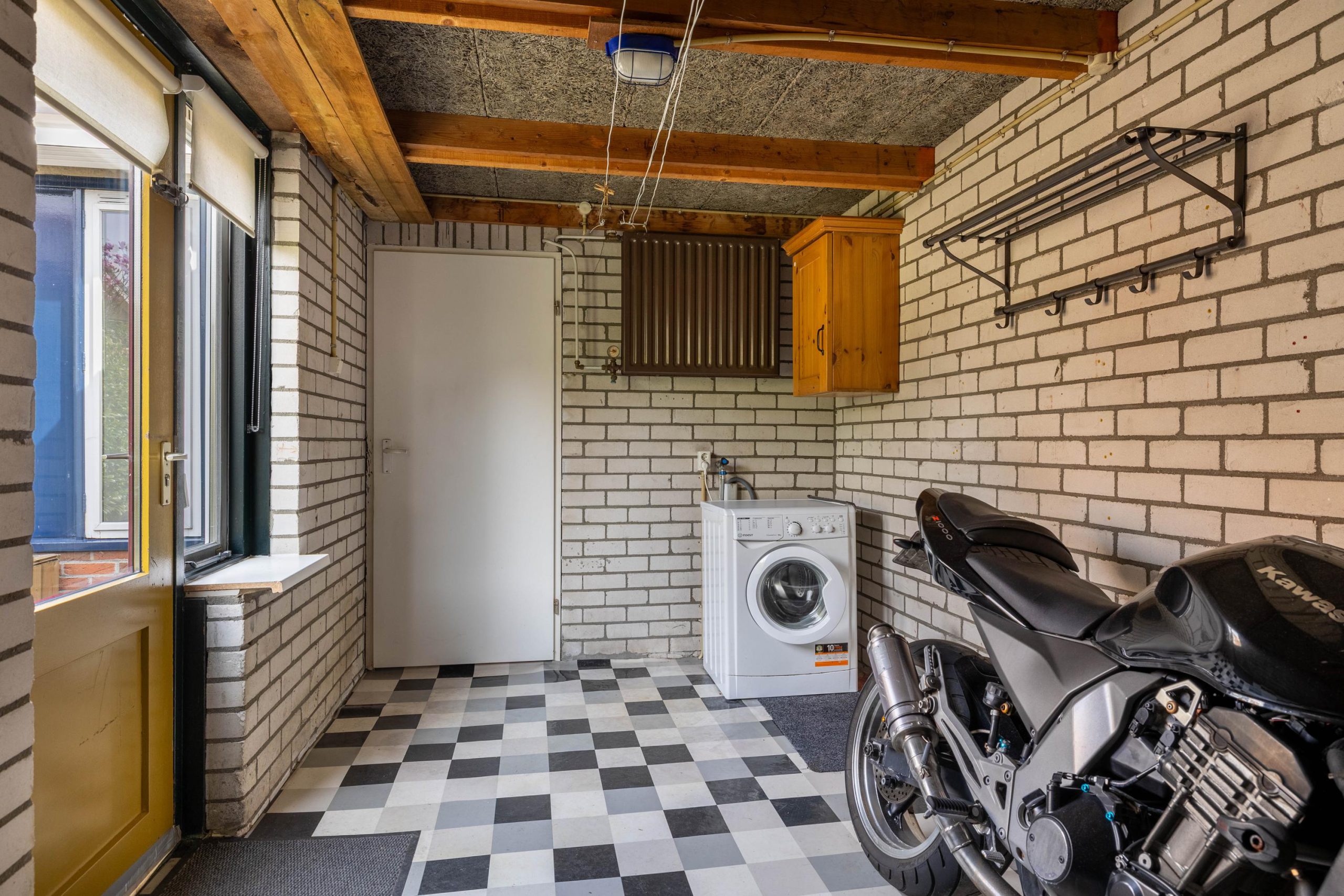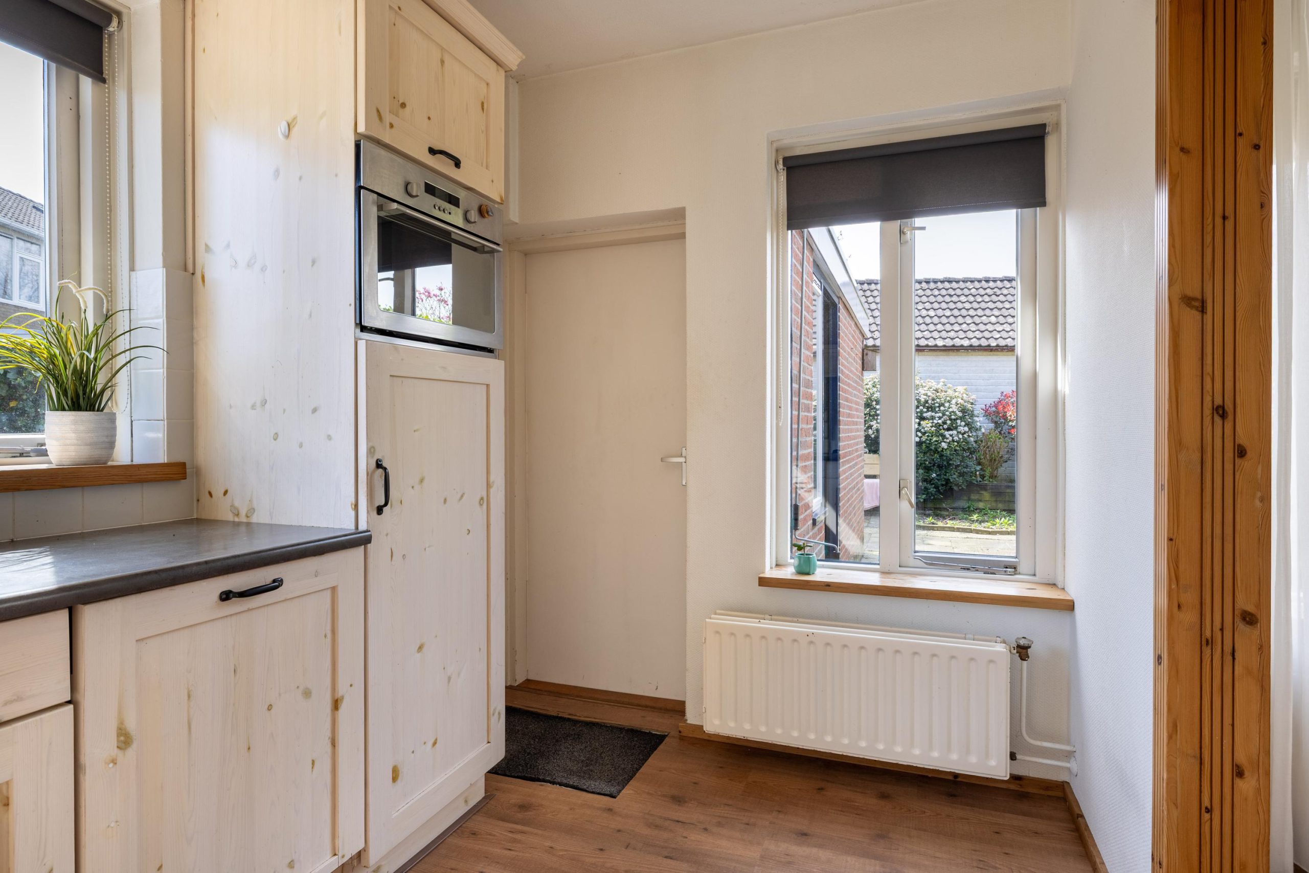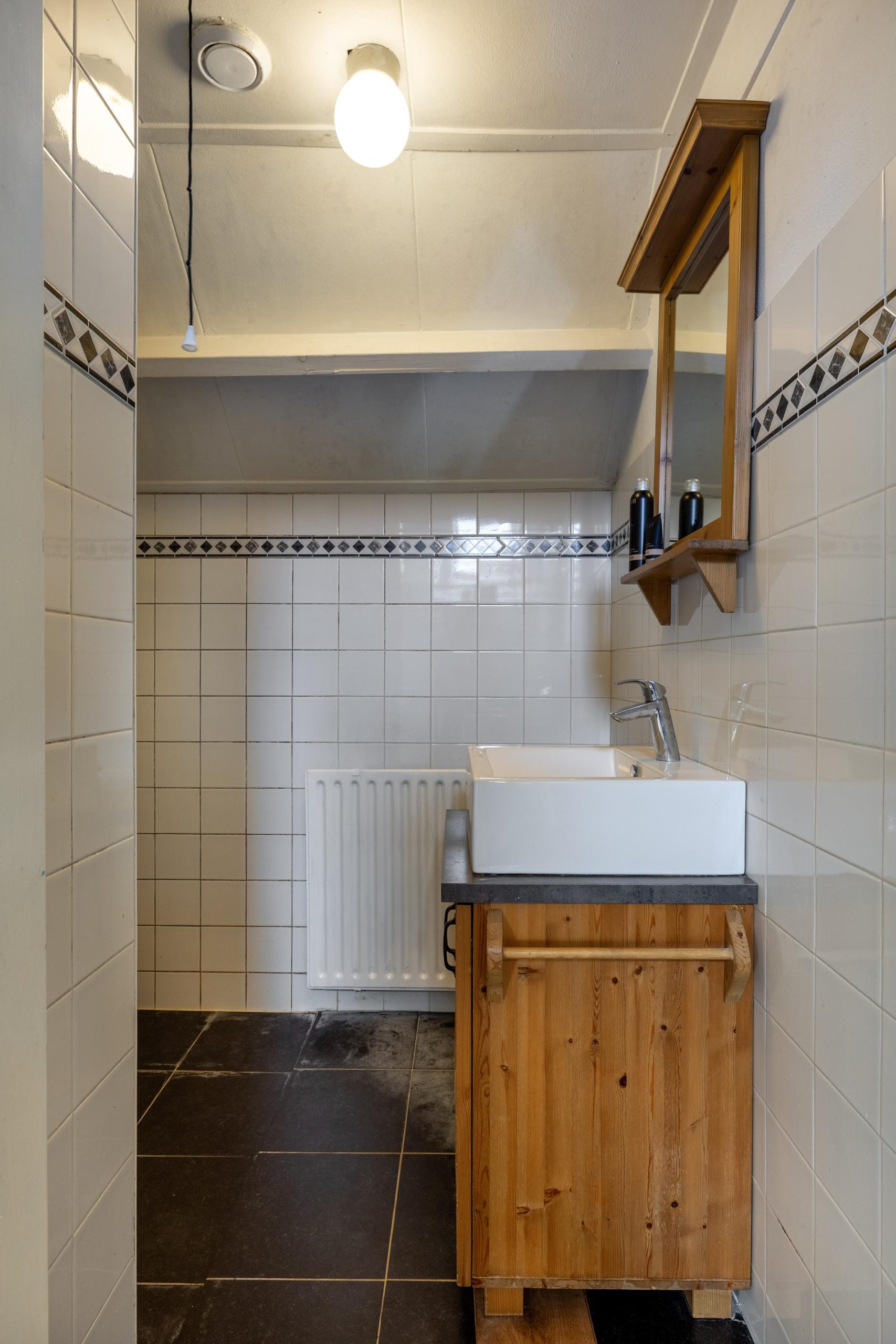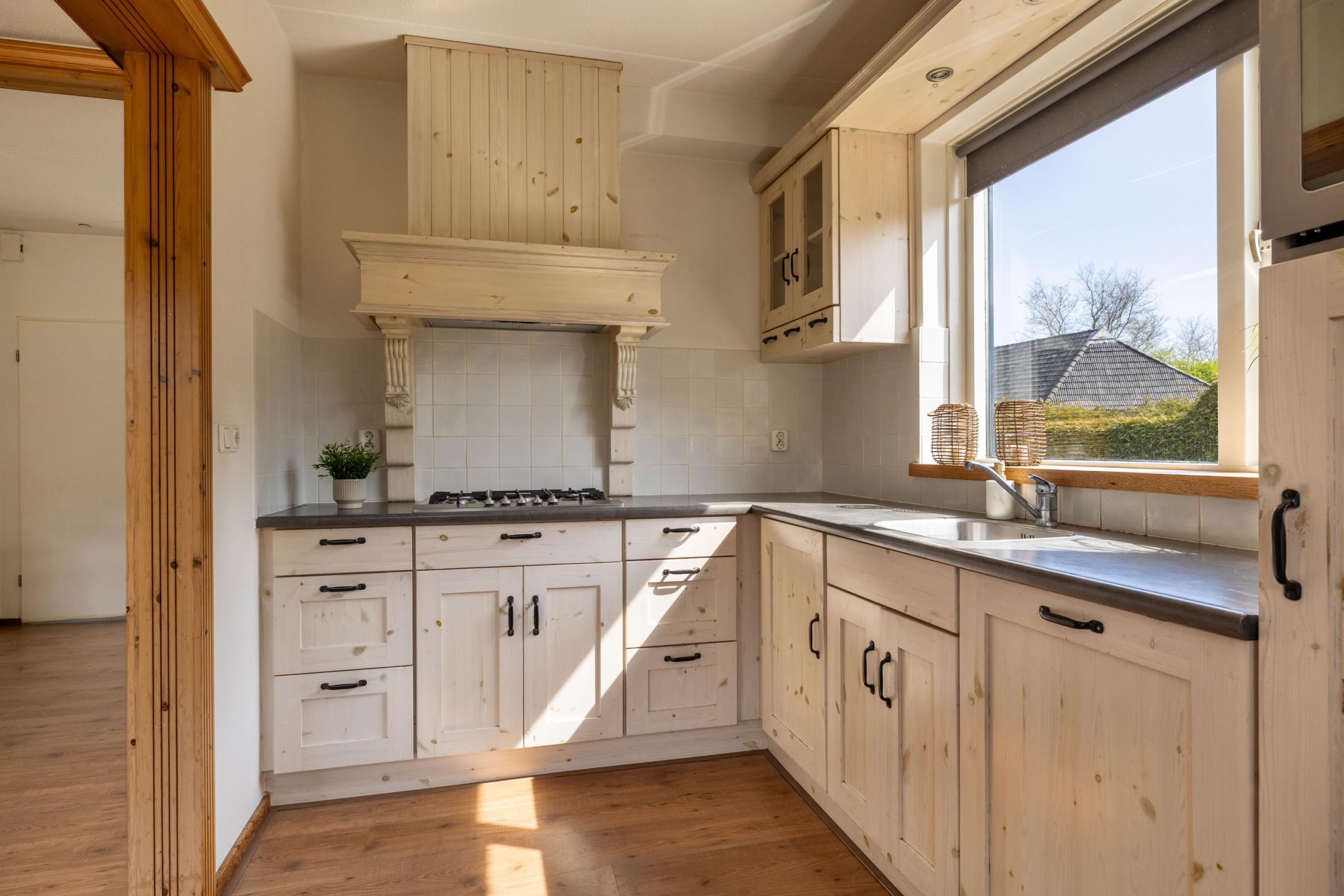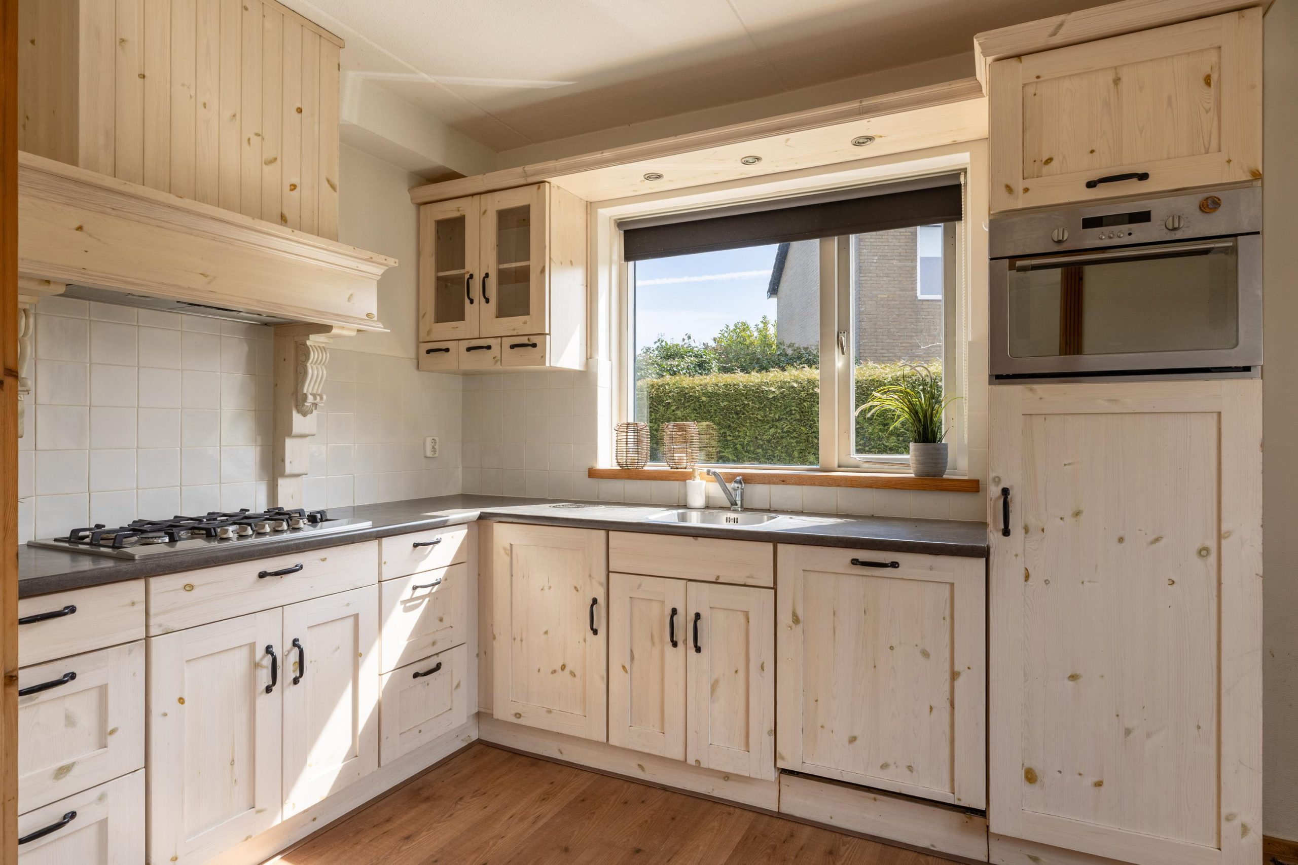 De keuken is praktisch én sfeervol ingericht, met onder andere een koelkast, kookplaat en vaatwasser binnen handbereik. Het is een fijne plek waar koken en gezelligheid vanzelf in elkaar overlopen. Vanuit hier loop je zo door naar de aangebouwde stenen berging, een verlengstuk van het wooncomfort. Deze ruimte is voorzien van stroom, water en verwarming en biedt volop plek voor de wasmachine én extra bergruimte.