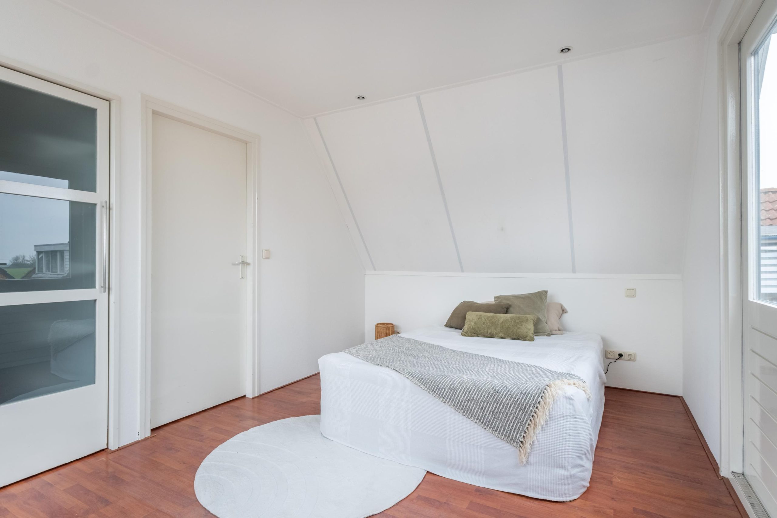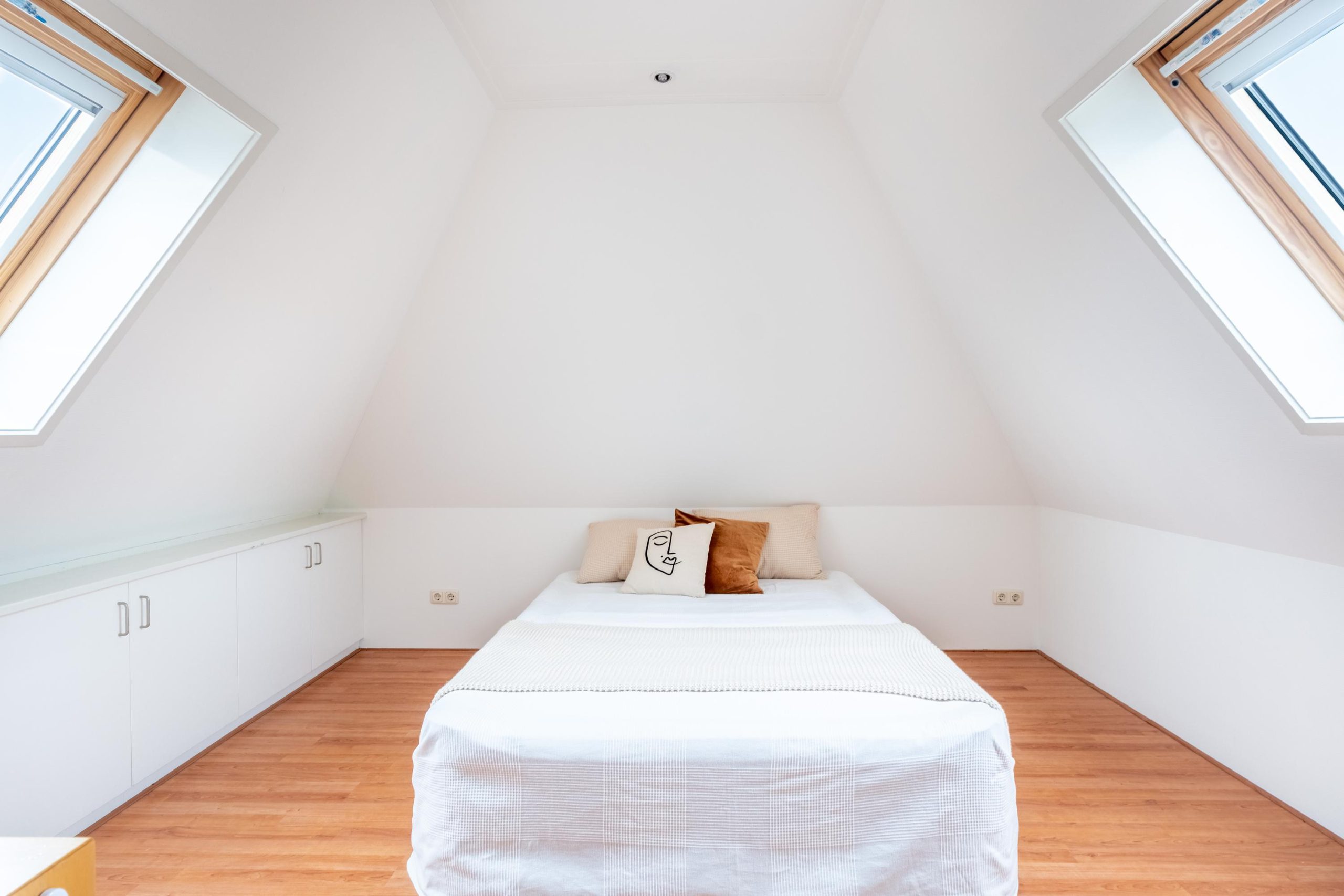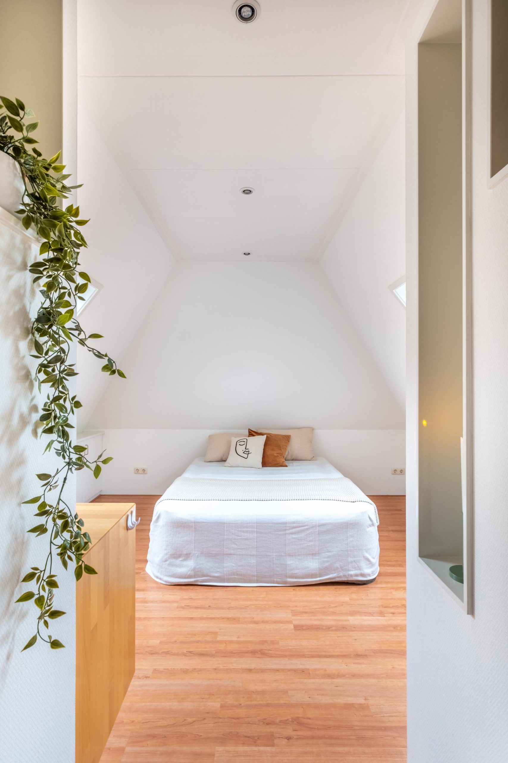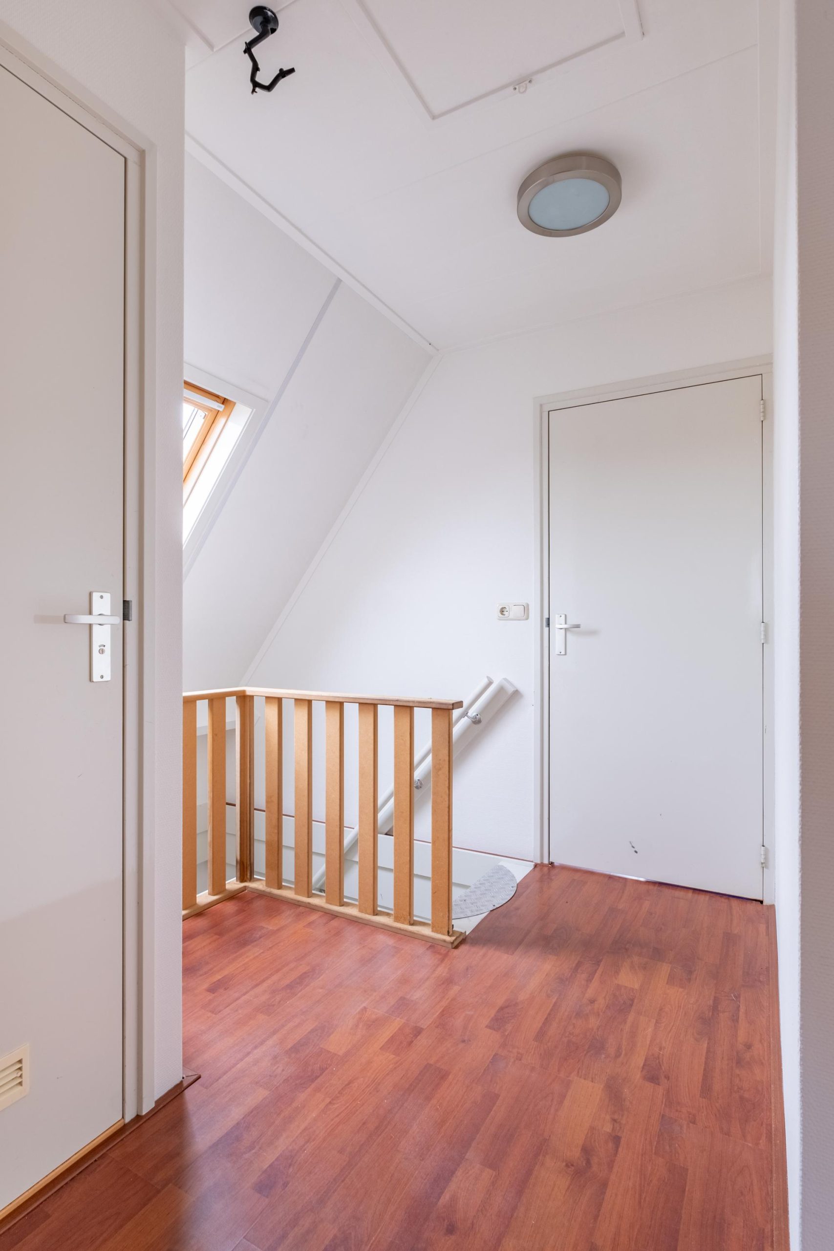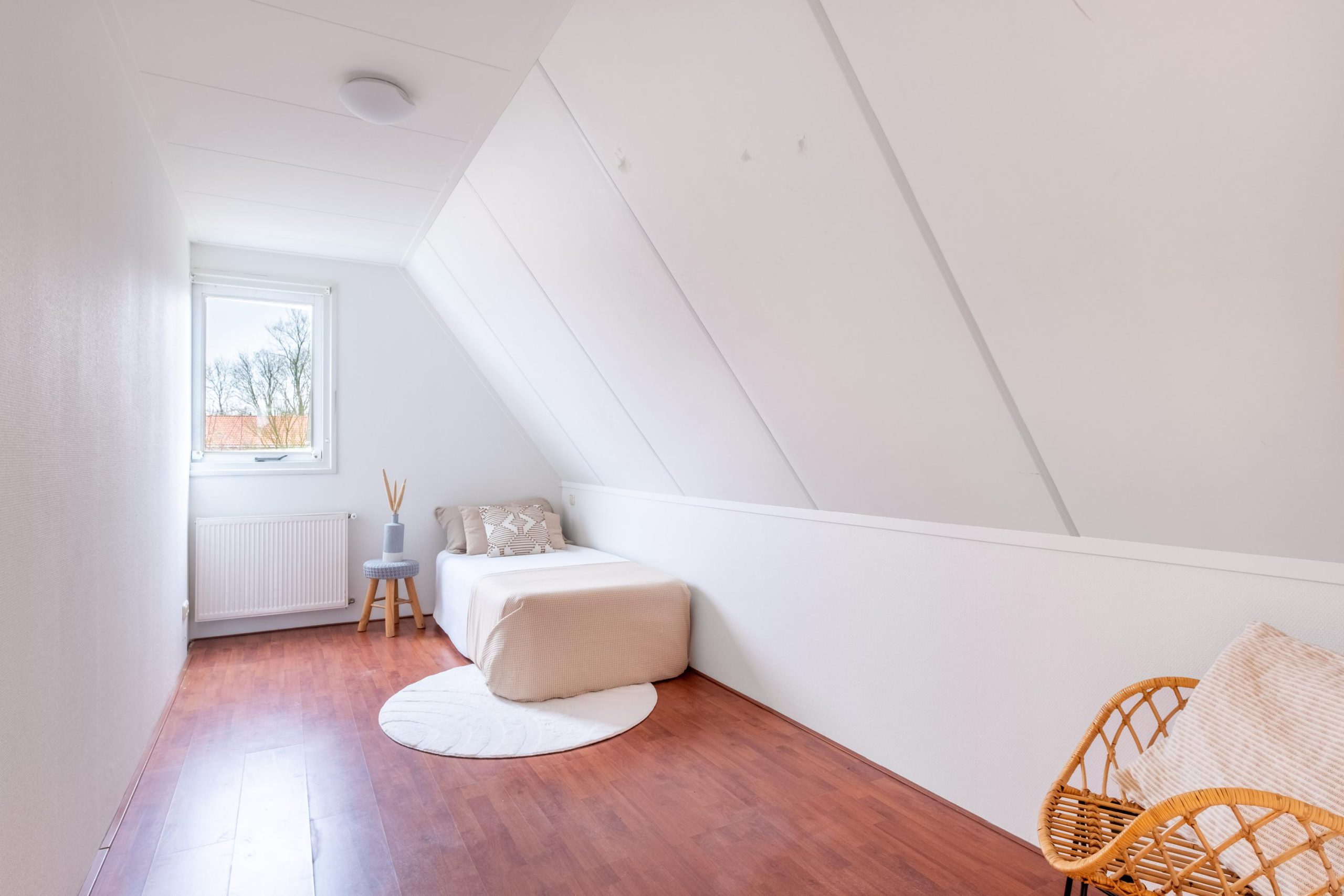 Via de trap in de woonkamer komen we terecht op de eerste verdieping. Hier vind je vier ruime slaapkamers, allemaal voorzien van een nette laminaatvloer en houten kozijnen. De kamers hebben elk een fijne lichtinval en bieden voldoende ruimte voor een bed en opbergmogelijkheden. De grootste slaapkamer heeft bovendien toegang tot een eigen balkon, waar je kunt genieten van het uitzicht over het dorp. Op deze verdieping bevindt zich een toilet. De zolderverdieping, bereikbaar via een vlizotrap, is goed geïsoleerd dankzij een unidek dak. Deze ruimte biedt veel opbergruimte.