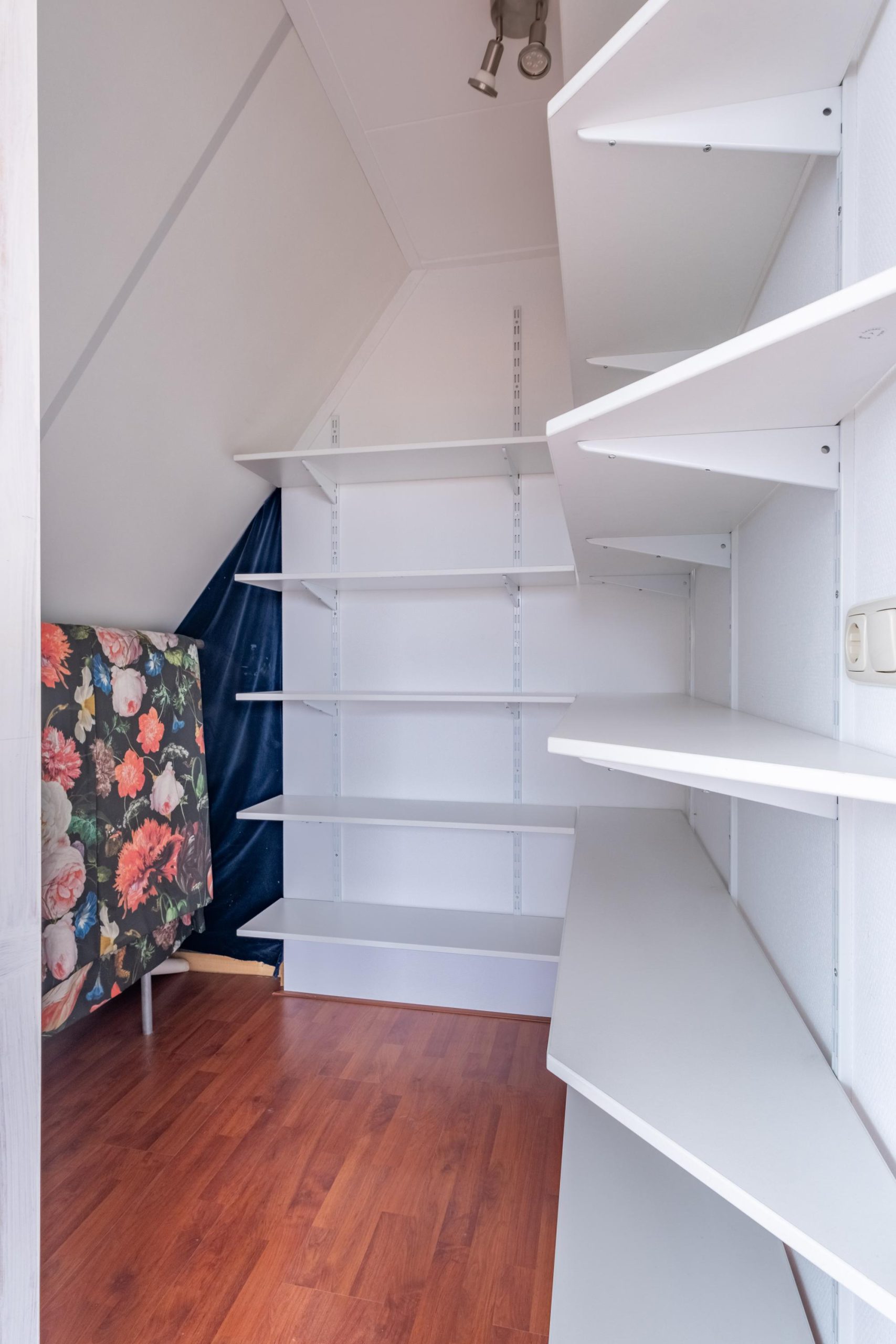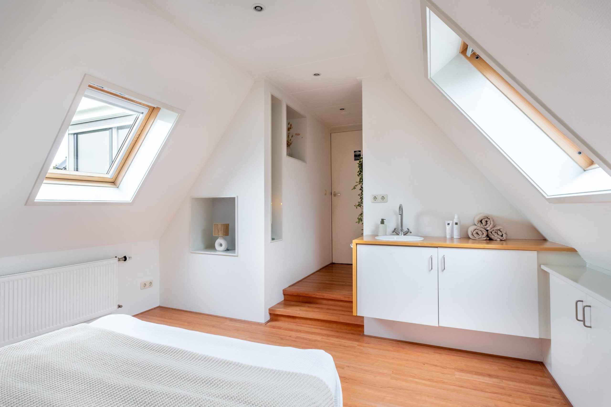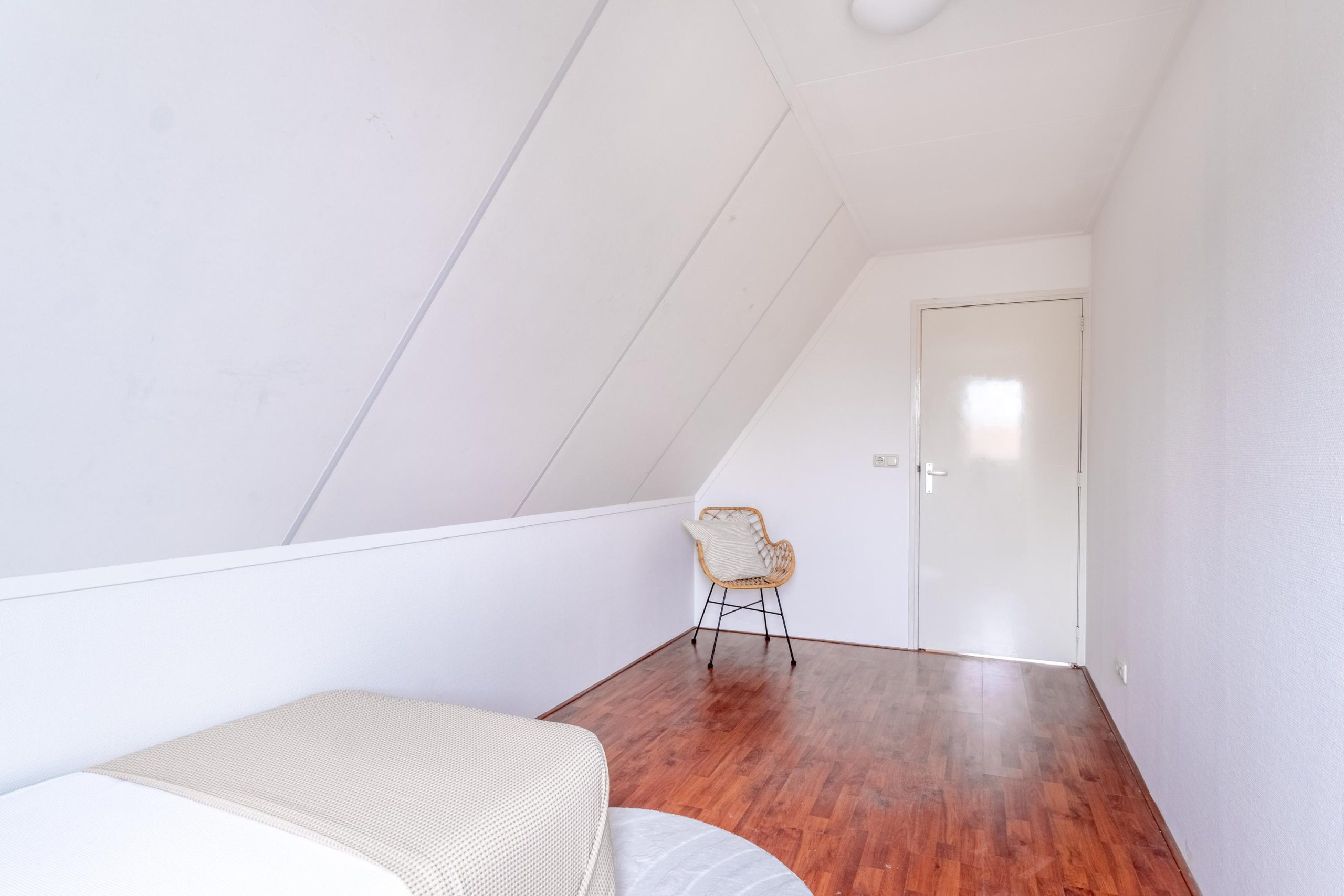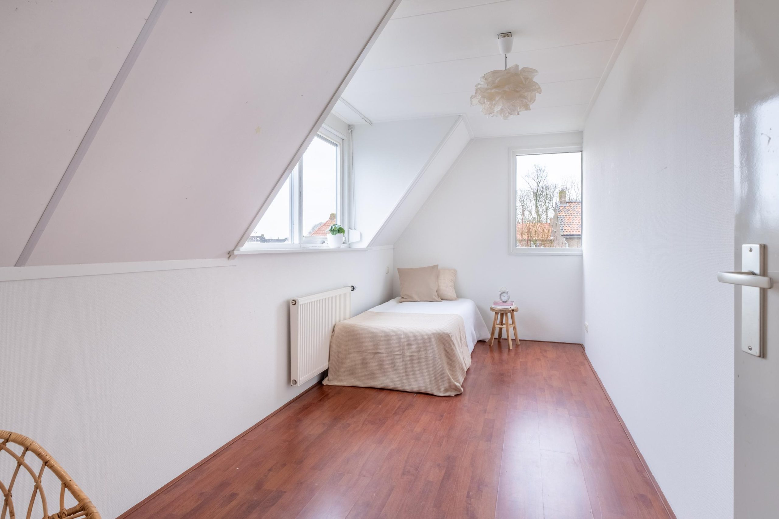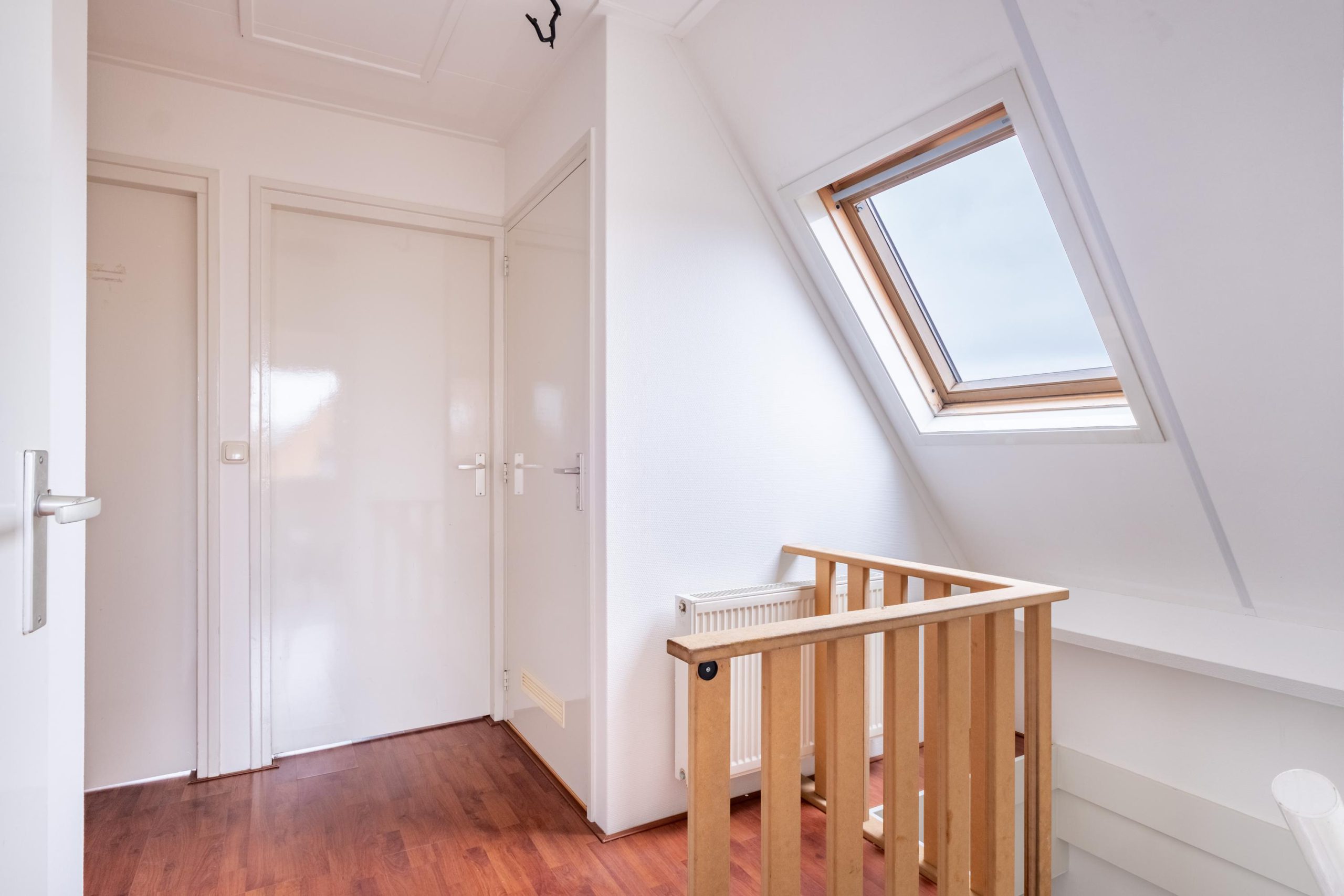 Via de trap in de woonkamer komen we terecht op de eerste verdieping. Hier vind je vier ruime slaapkamers, allemaal voorzien van een nette laminaatvloer en houten kozijnen. De kamers hebben elk een fijne lichtinval en bieden voldoende ruimte voor een bed en opbergmogelijkheden. De grootste slaapkamer heeft bovendien toegang tot een eigen balkon, waar je kunt genieten van het uitzicht over het dorp. Op deze verdieping bevindt zich een toilet. De zolderverdieping, bereikbaar via een vlizotrap, is goed geïsoleerd dankzij een unidek dak. Deze ruimte biedt veel opbergruimte.