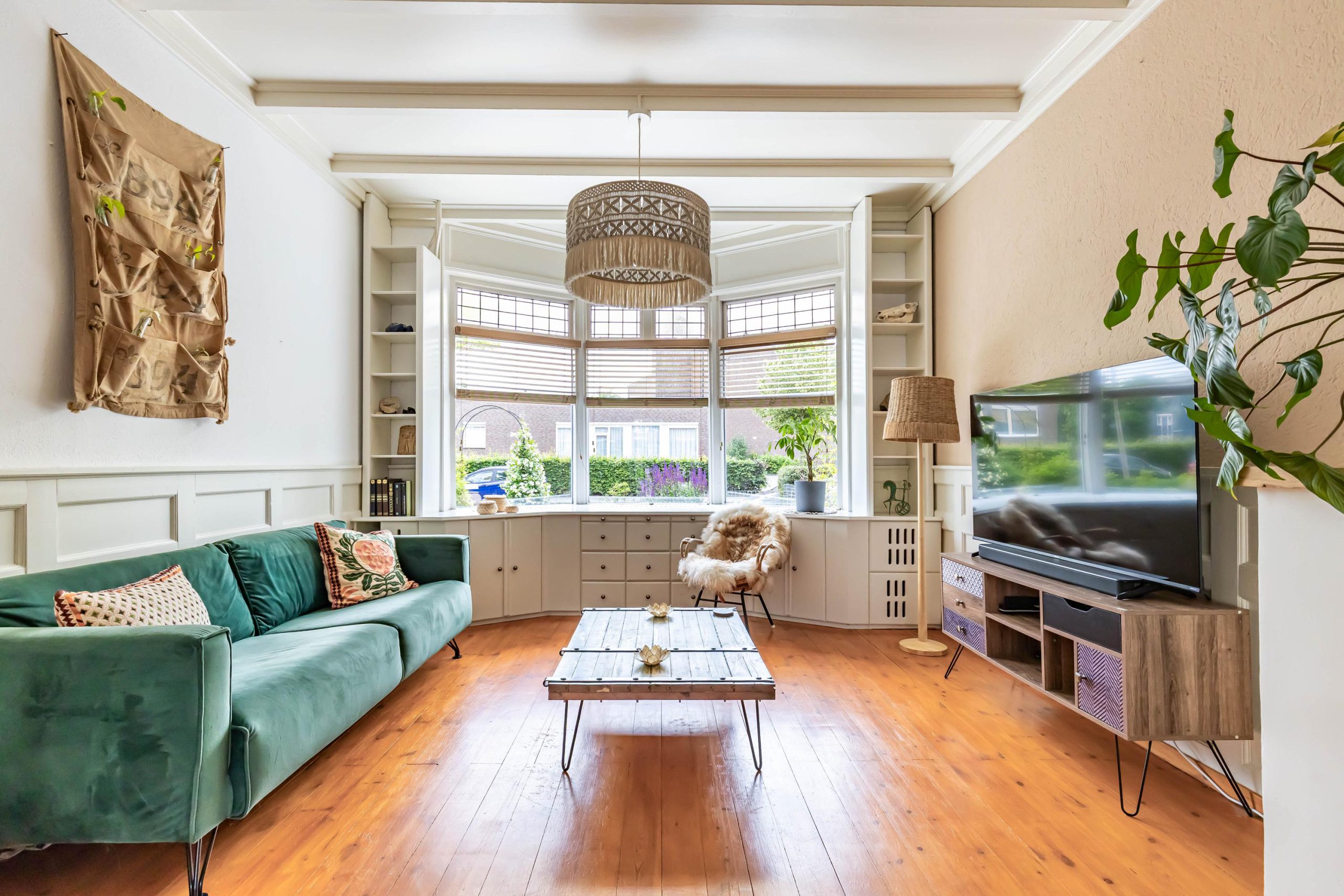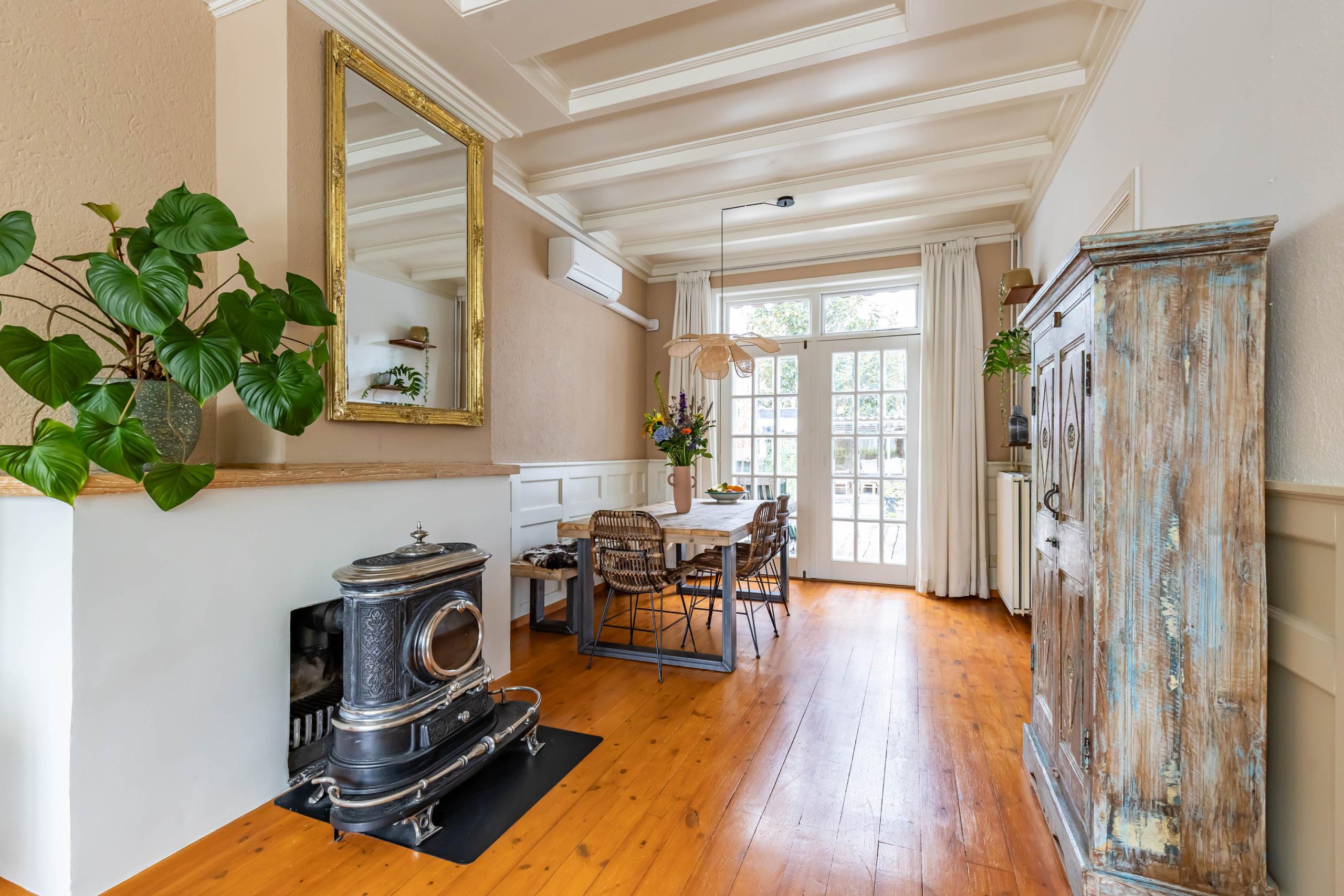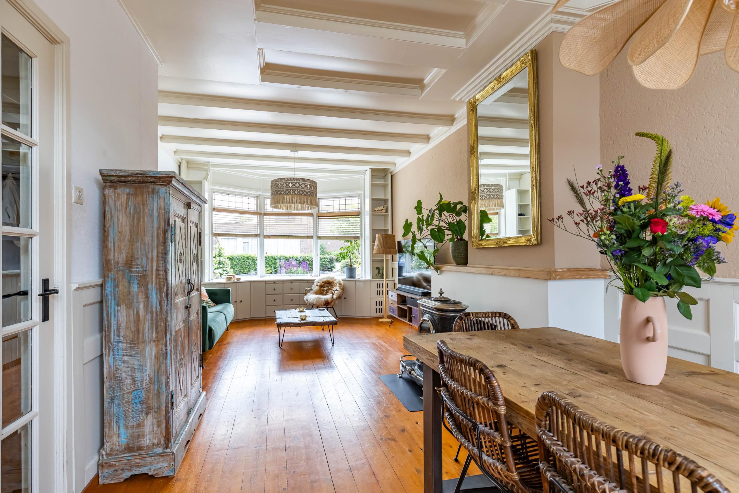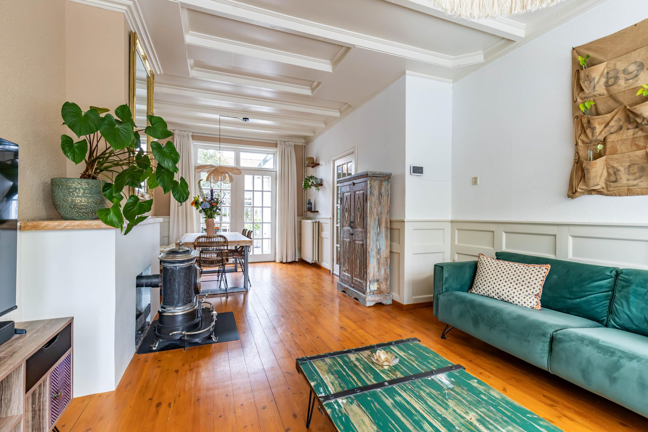 Je komt binnen in een ruime hal met originele jaren ’30 details zoals lambrisering, glas-in-lood en een hoog plafond. Onder de trap bevindt zich een praktische kelder. De gezellige woonkamer heeft aan de voorzijde een erker met handige inbouwkasten en glas-in-loodramen. Via de openslaande deuren stap je direct de zonnige achtertuin in, ook bereikbaar via een buitendeur in de keuken. De houtkachel in de woonkamer zorgt voor extra sfeer en warmte.