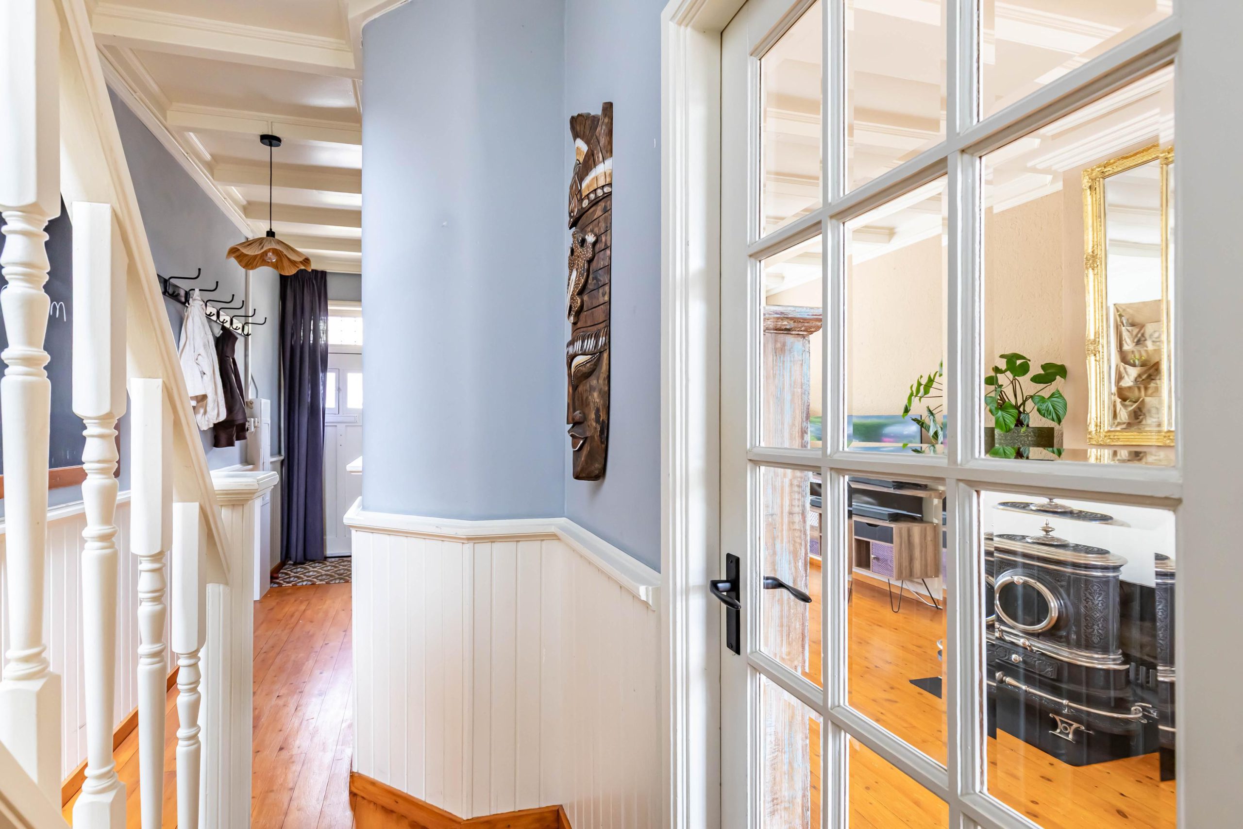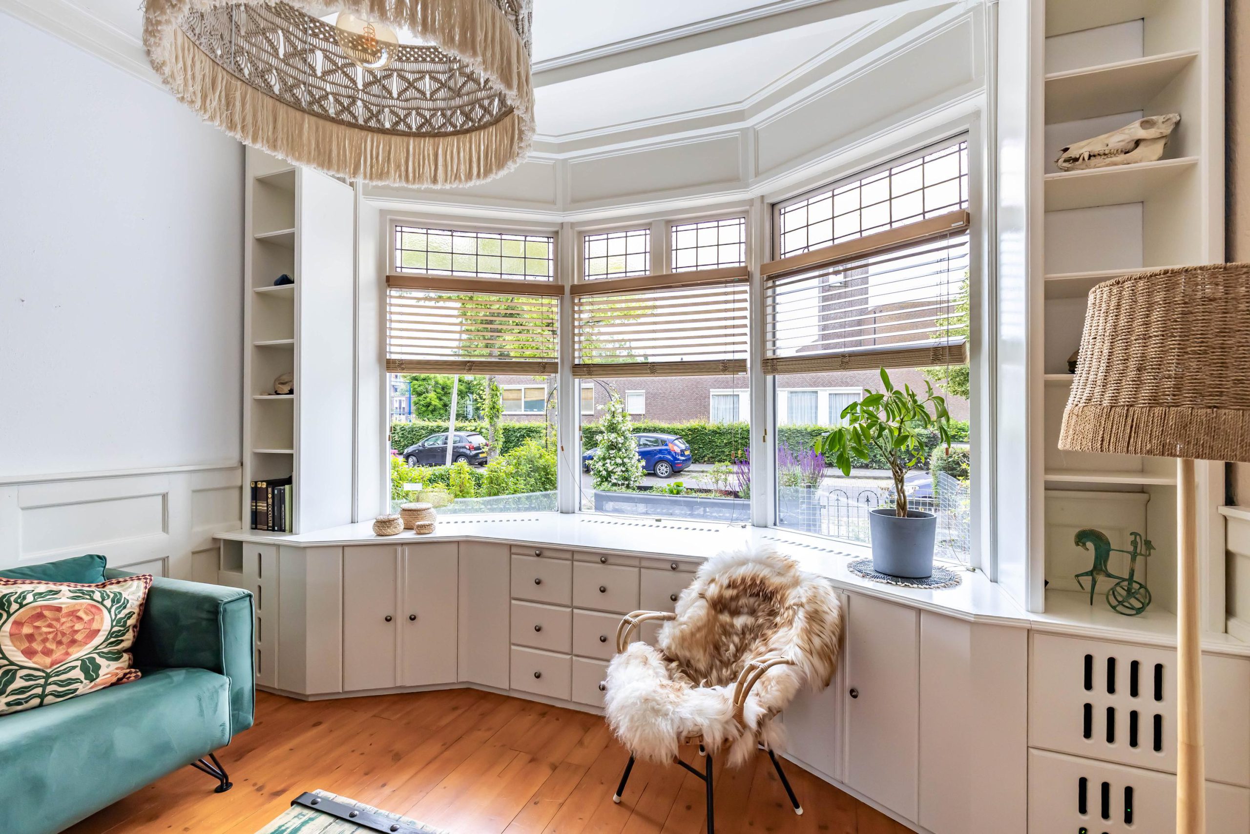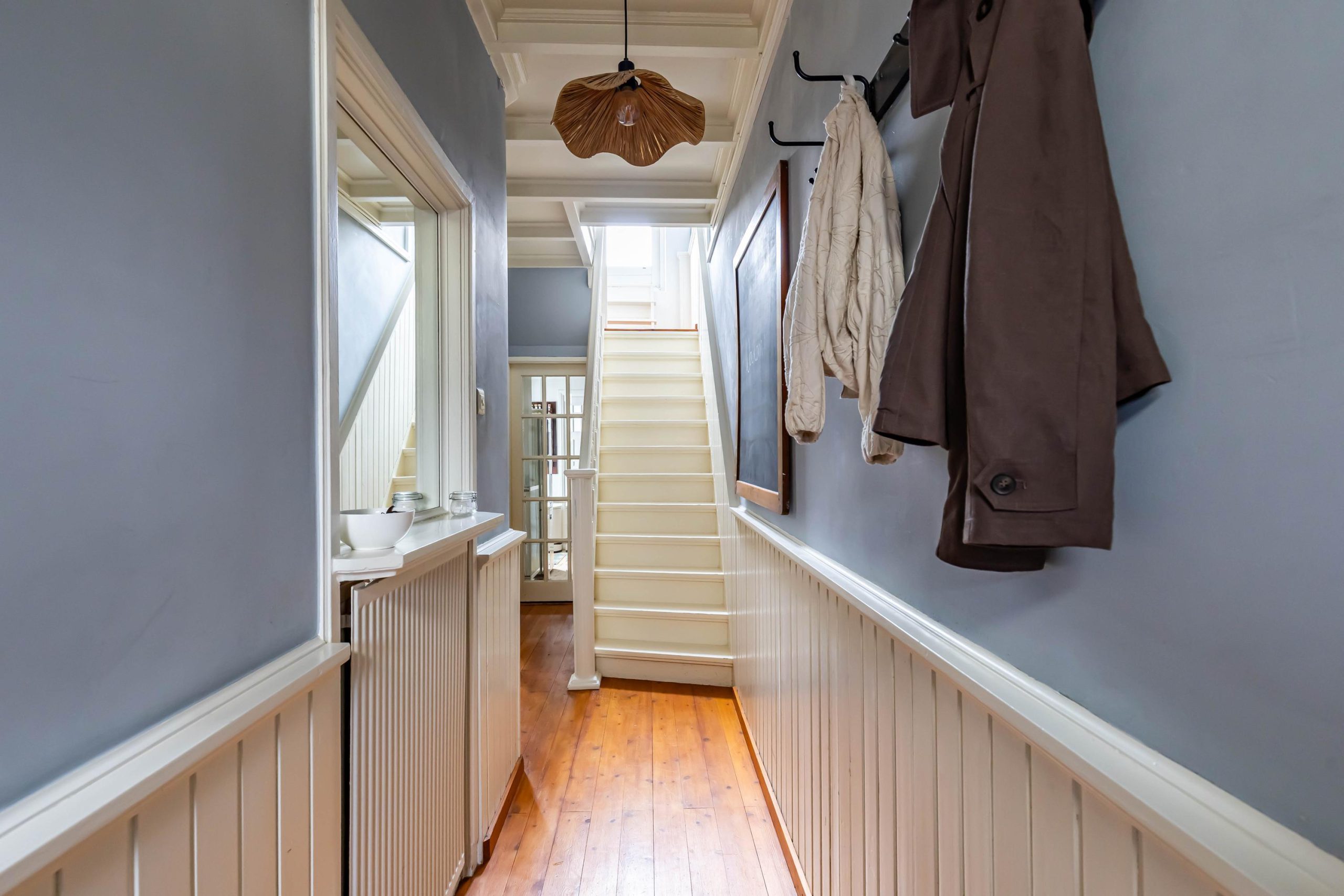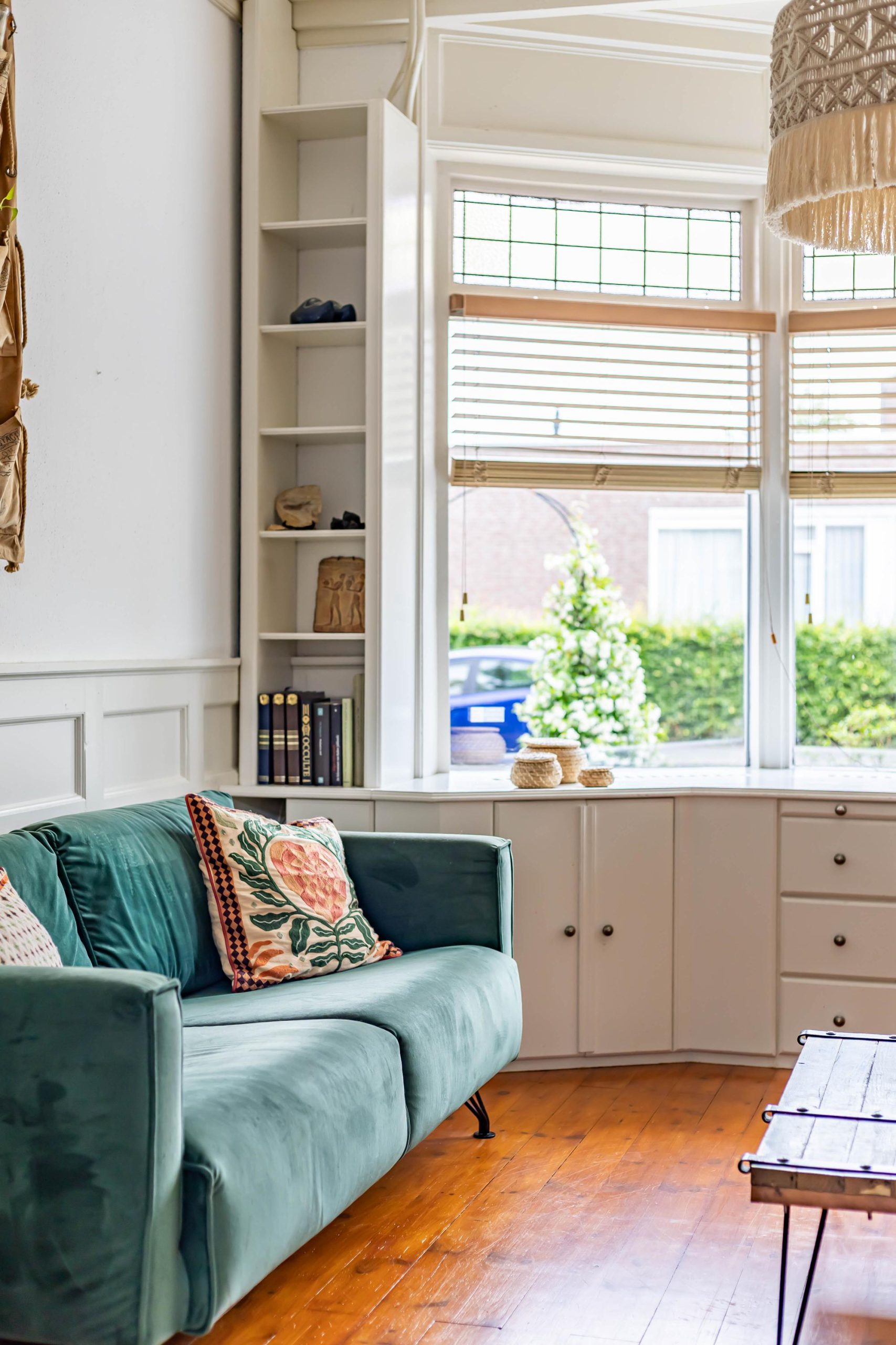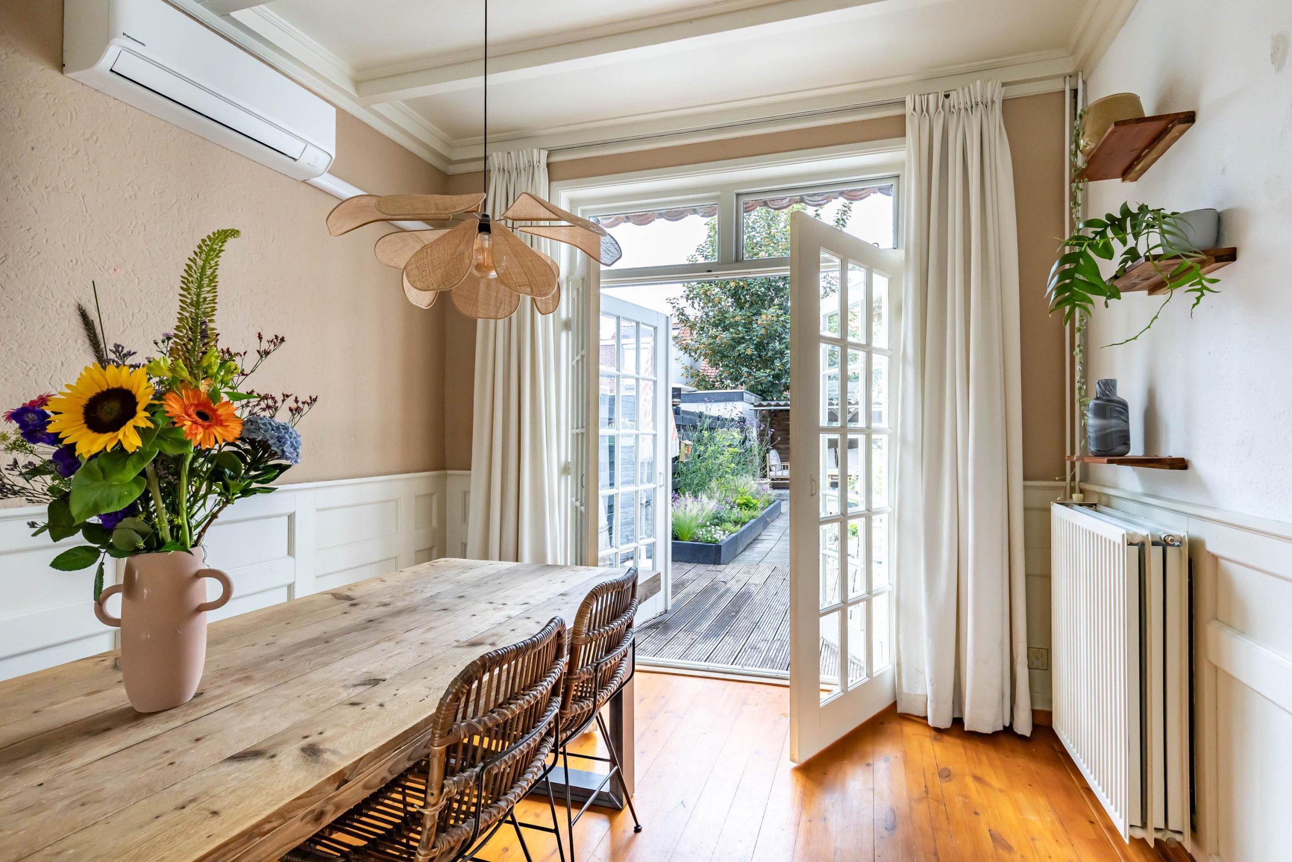 Je komt binnen in een ruime hal met originele jaren ’30 details zoals lambrisering, glas-in-lood en een hoog plafond. Onder de trap bevindt zich een praktische kelder. De gezellige woonkamer heeft aan de voorzijde een erker met handige inbouwkasten en glas-in-loodramen. Via de openslaande deuren stap je direct de zonnige achtertuin in, ook bereikbaar via een buitendeur in de keuken. De houtkachel in de woonkamer zorgt voor extra sfeer en warmte.