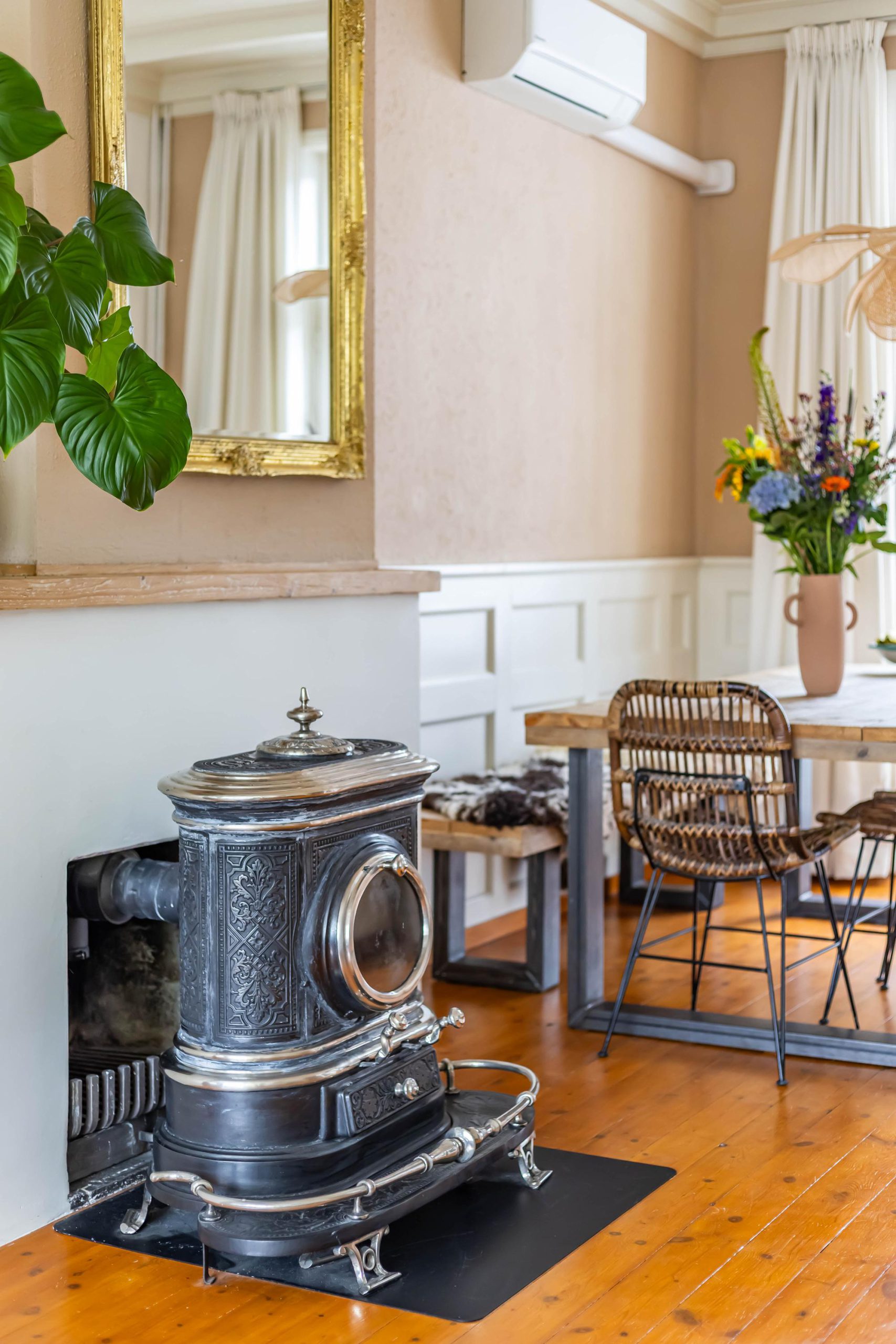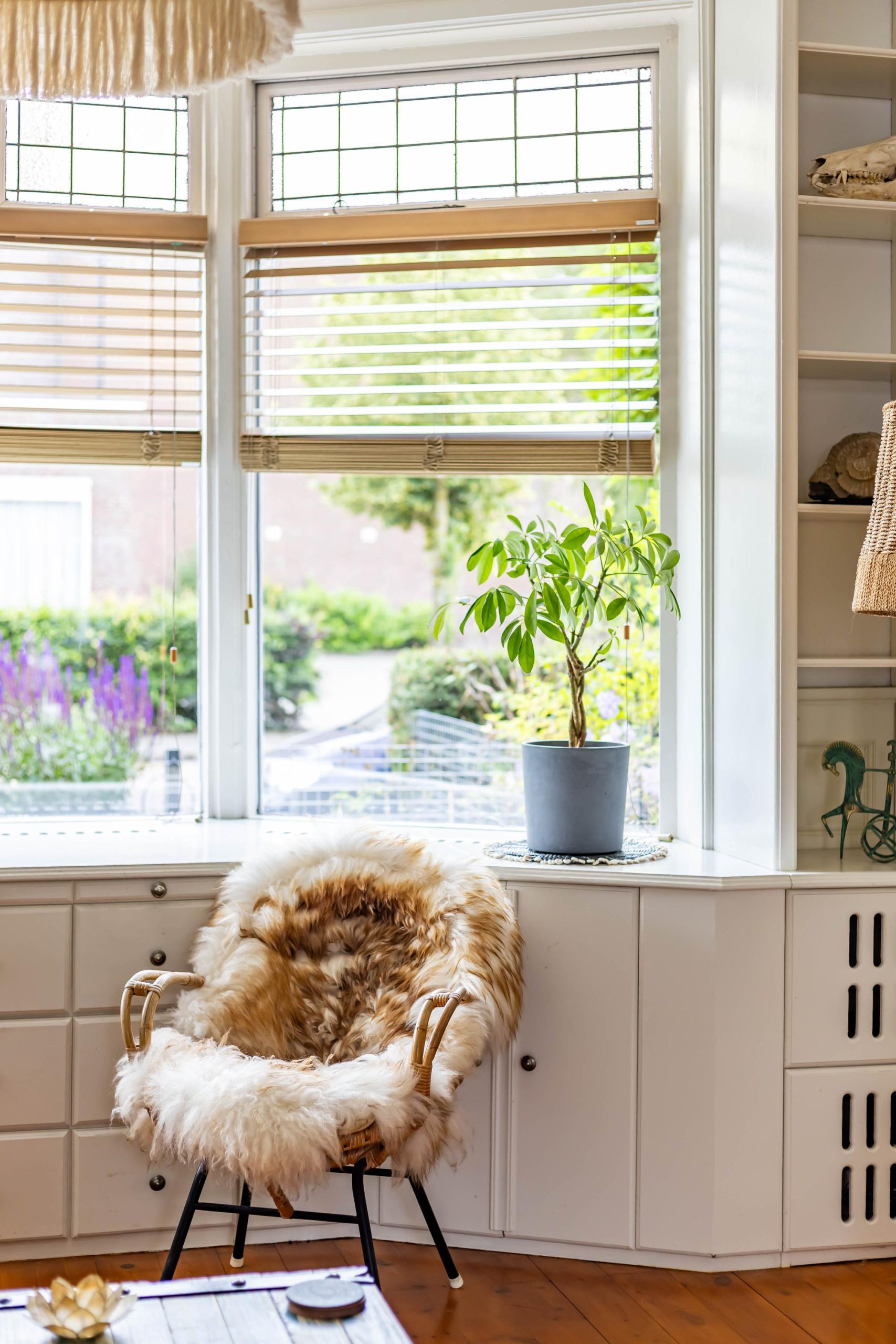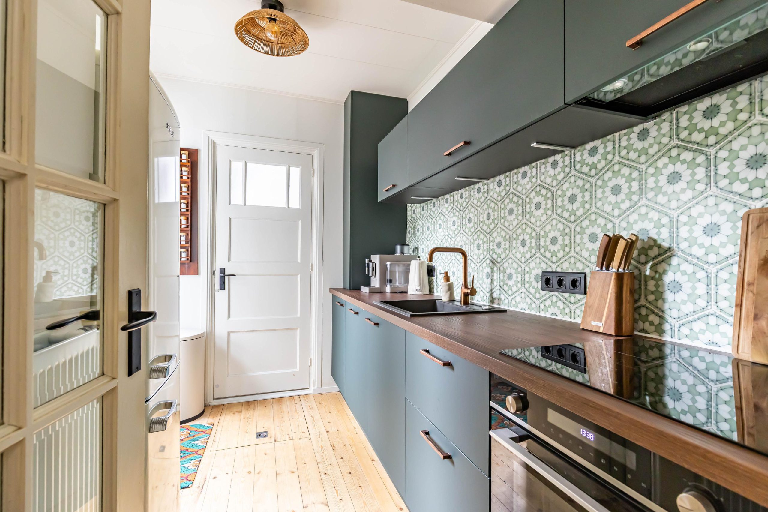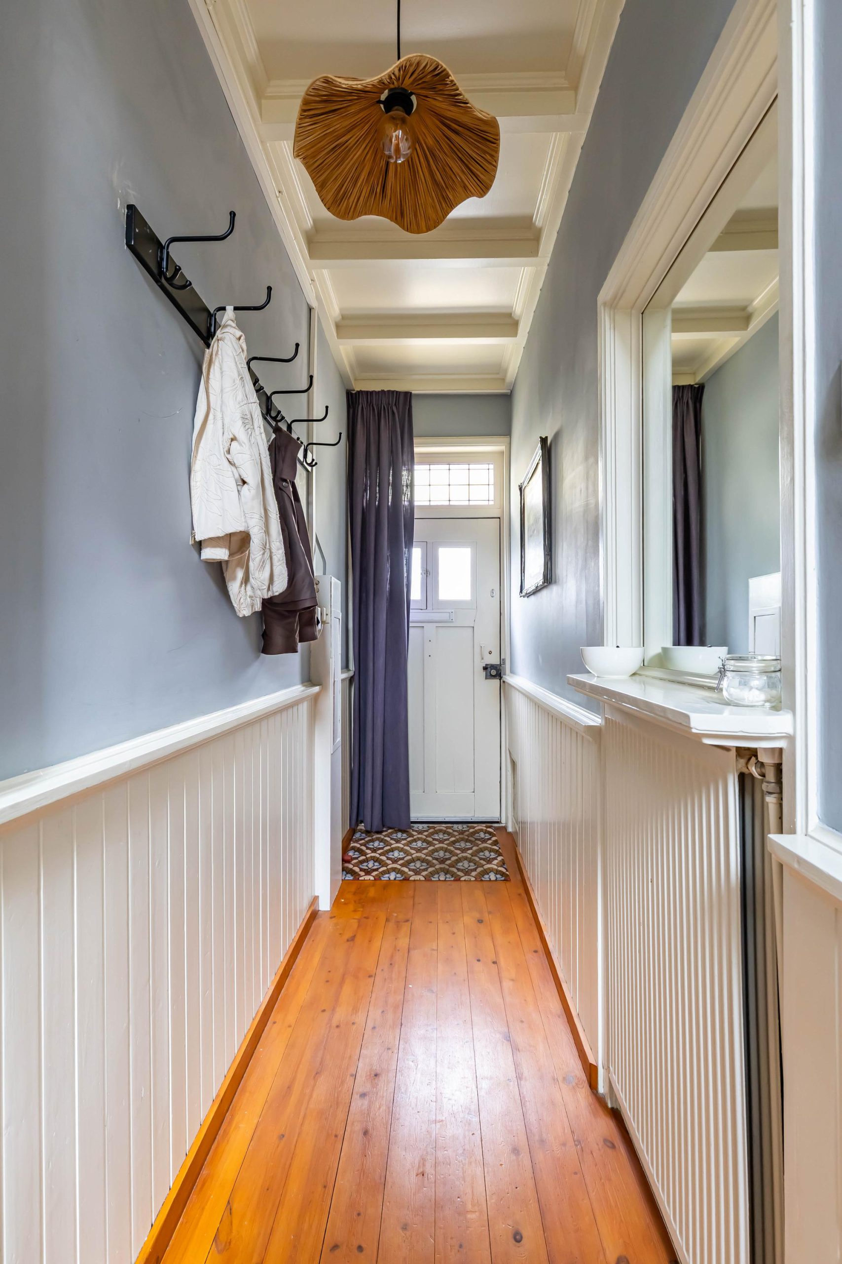 Je komt binnen in een ruime hal met originele jaren ’30 details zoals lambrisering, glas-in-lood en een hoog plafond. Onder de trap bevindt zich een praktische kelder. De gezellige woonkamer heeft aan de voorzijde een erker met handige inbouwkasten en glas-in-loodramen. Via de openslaande deuren stap je direct de zonnige achtertuin in, ook bereikbaar via een buitendeur in de keuken. De houtkachel in de woonkamer zorgt voor extra sfeer en warmte.
