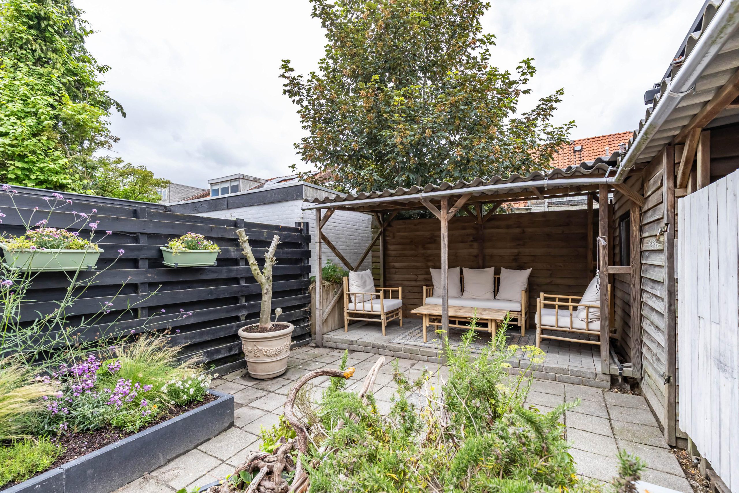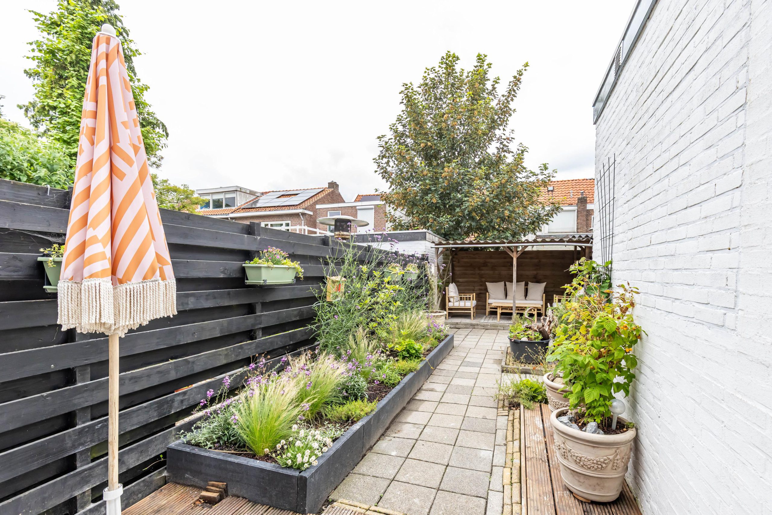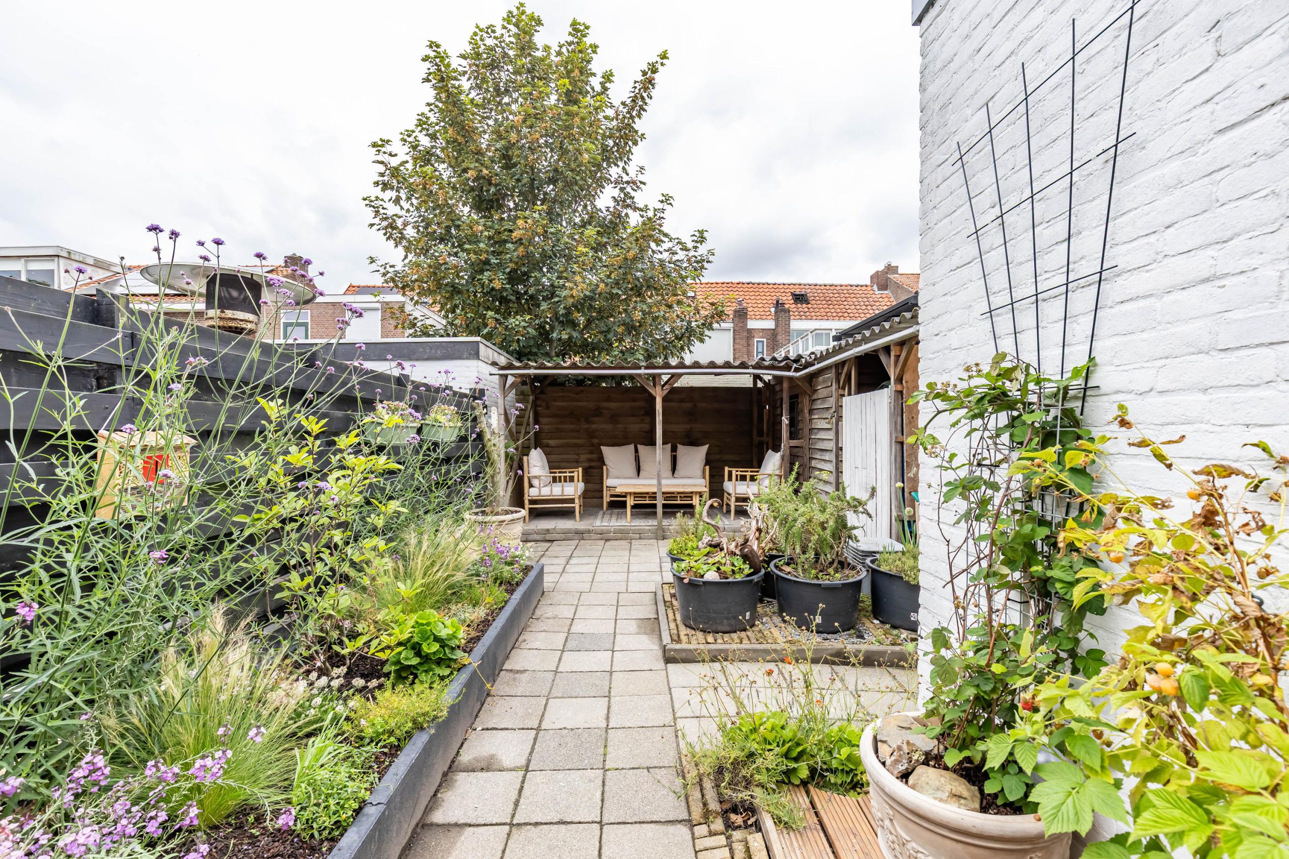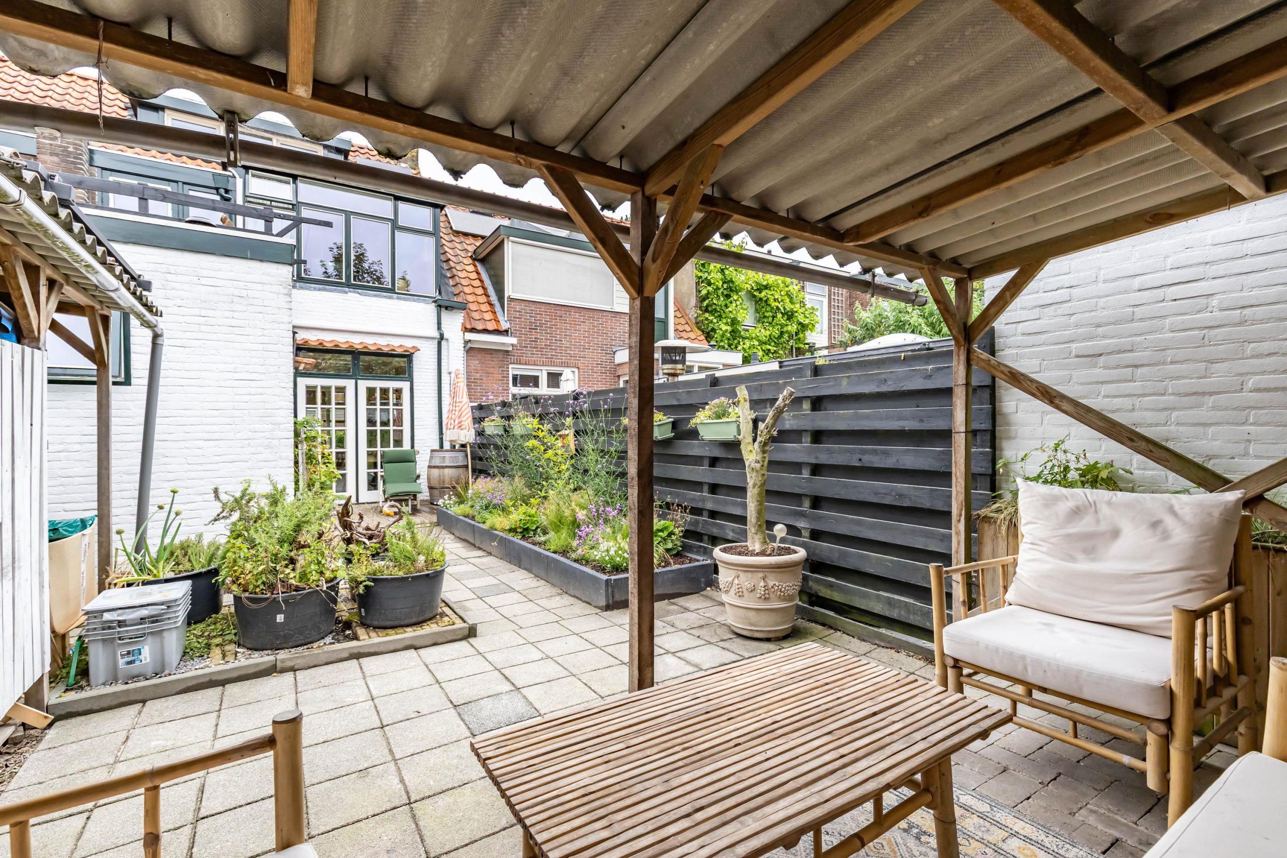 De fraai aangelegde achtertuin beschikt over een praktische overkapping en is bereikbaar via een achterom: ideaal voor fietsen of afvalcontainers.