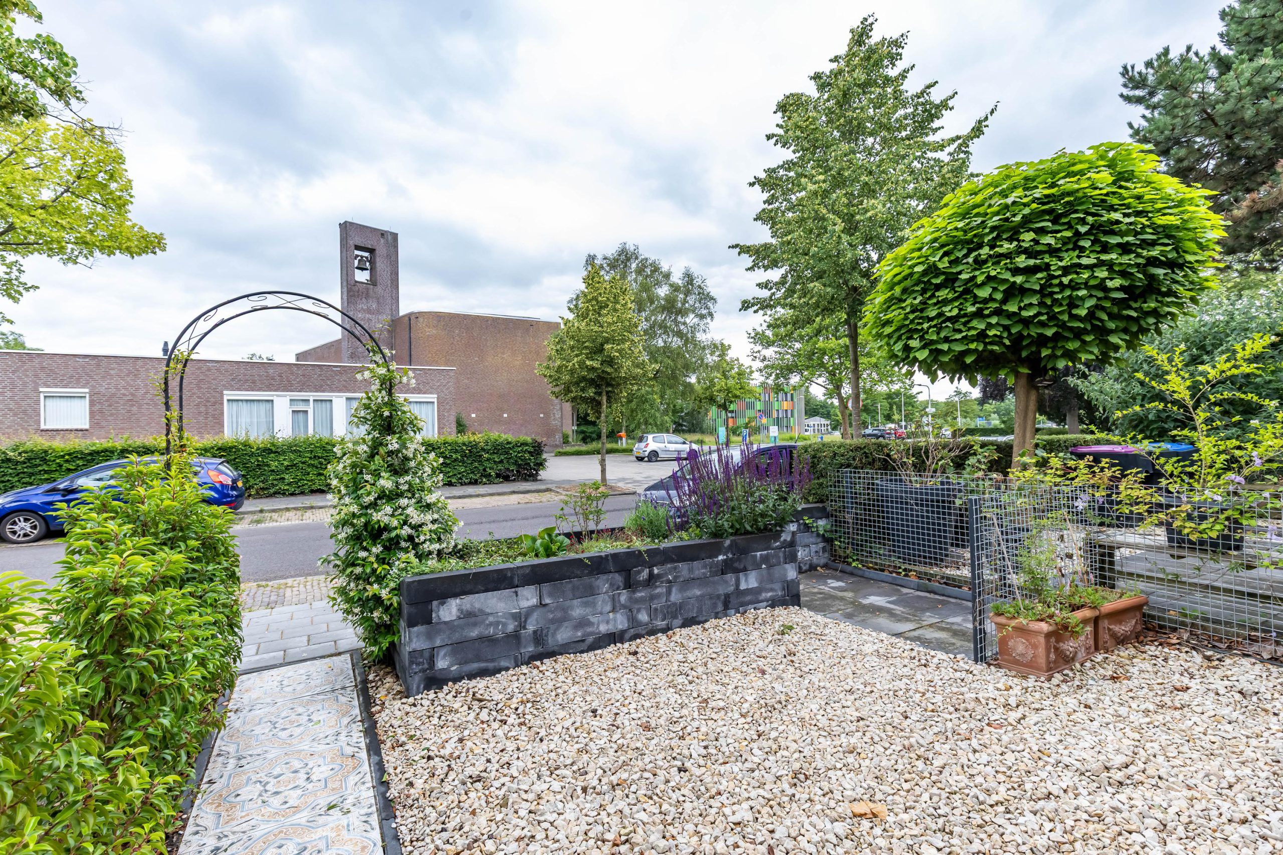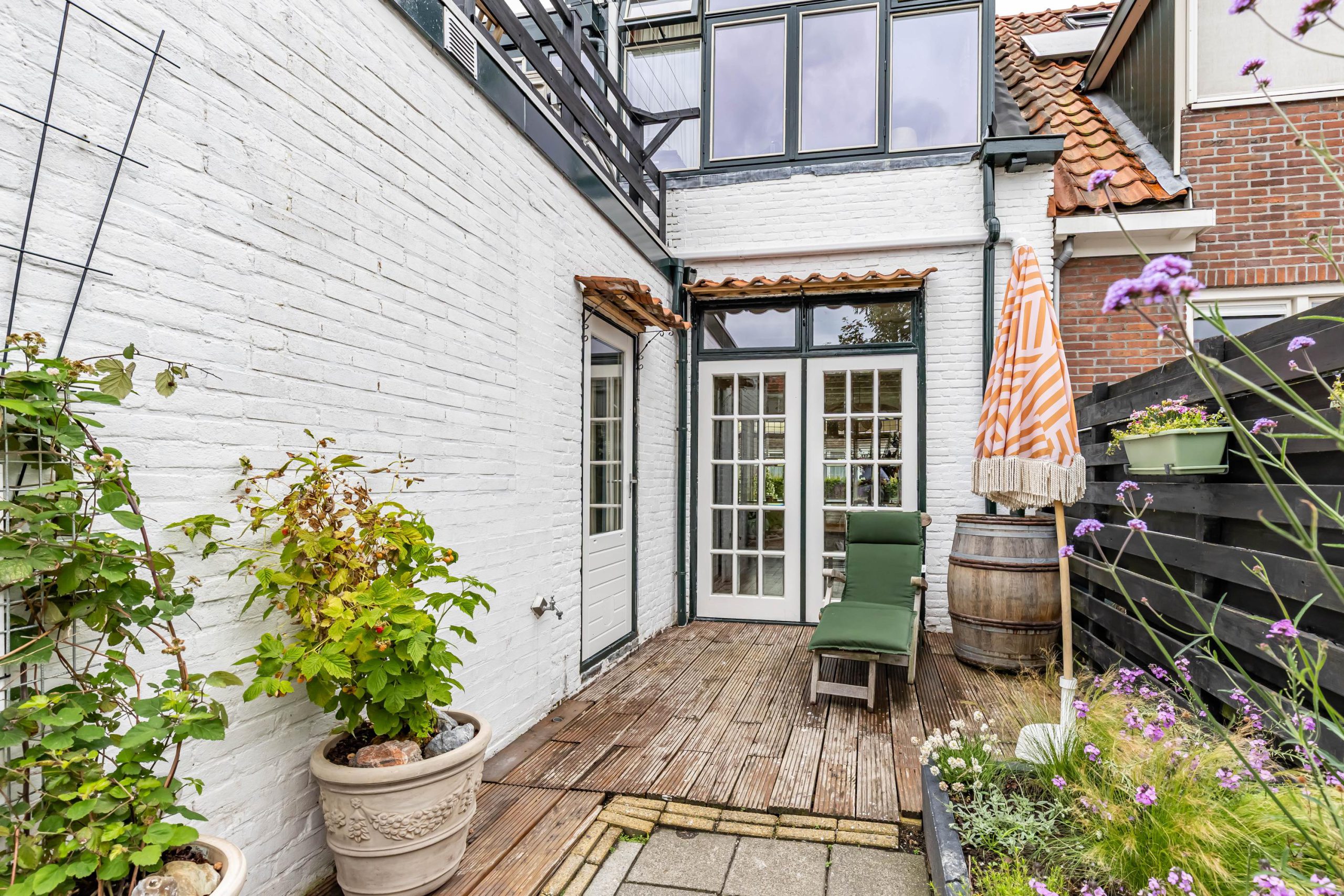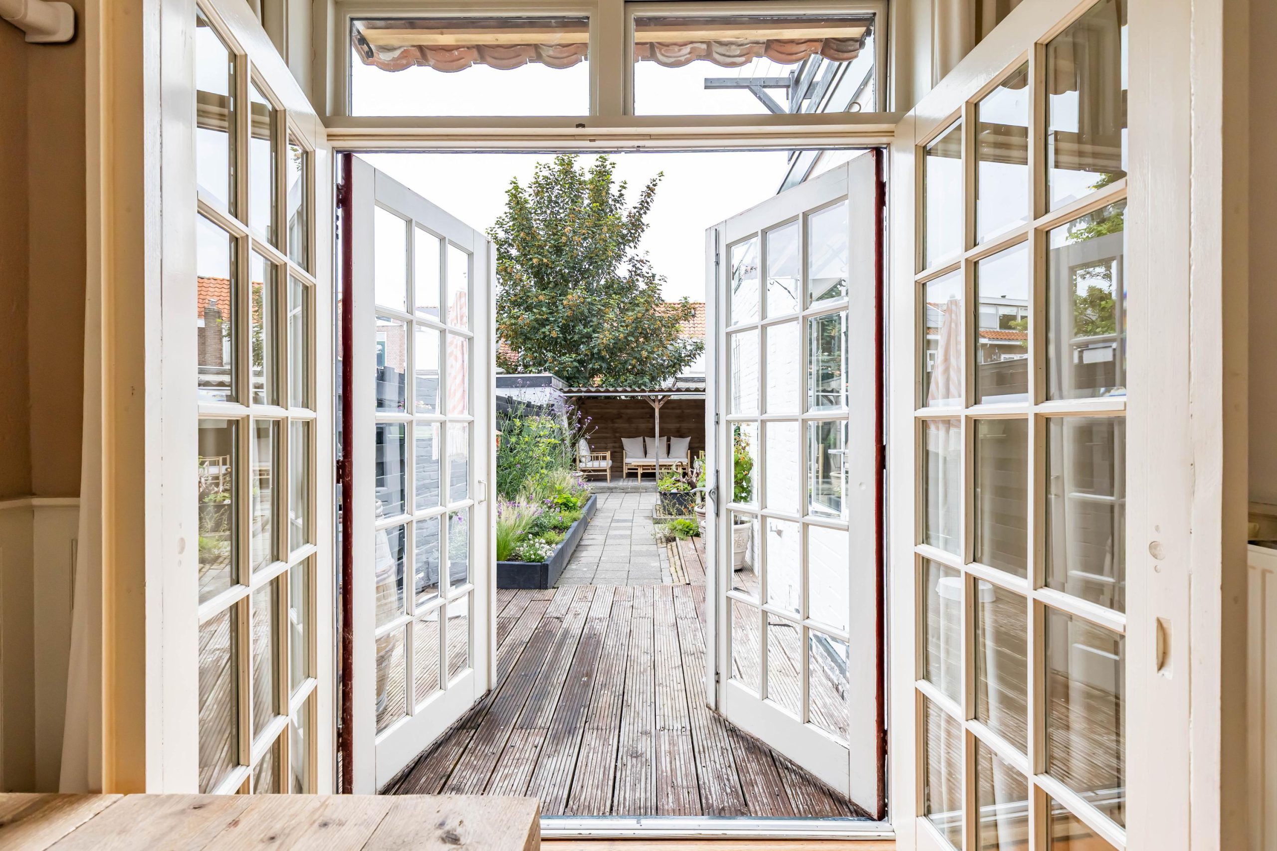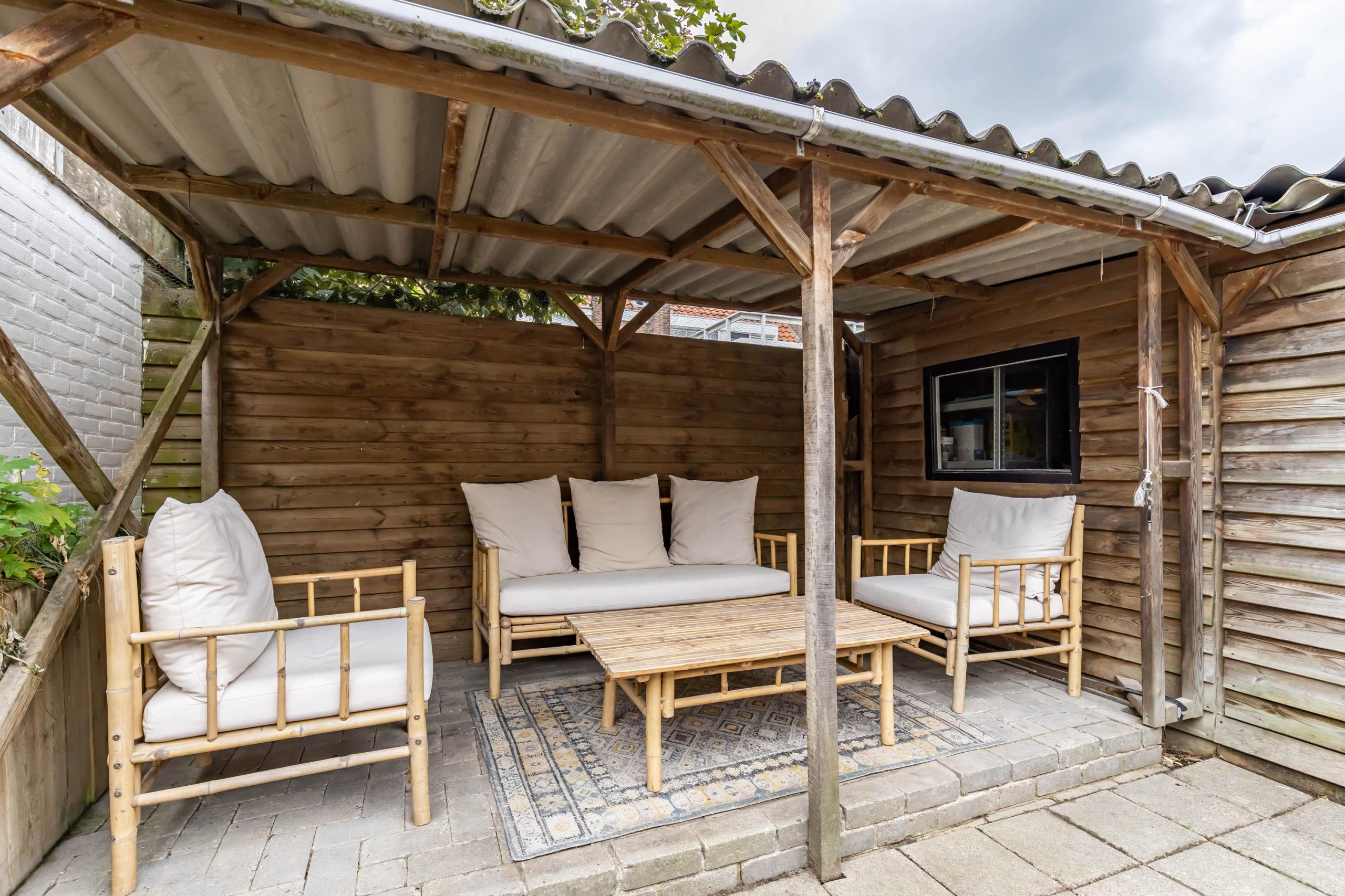 De fraai aangelegde achtertuin beschikt over een praktische overkapping en is bereikbaar via een achterom: ideaal voor fietsen of afvalcontainers.