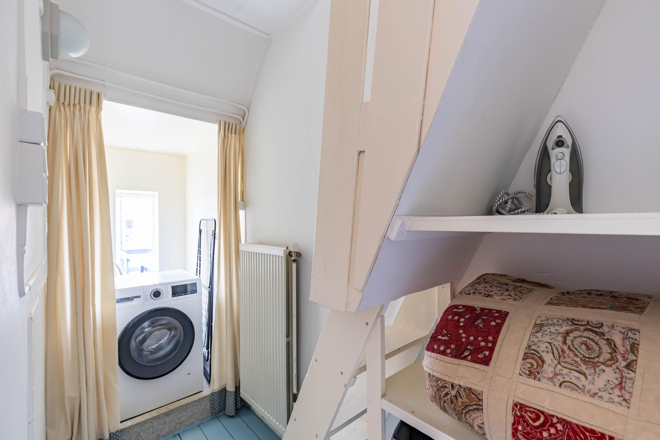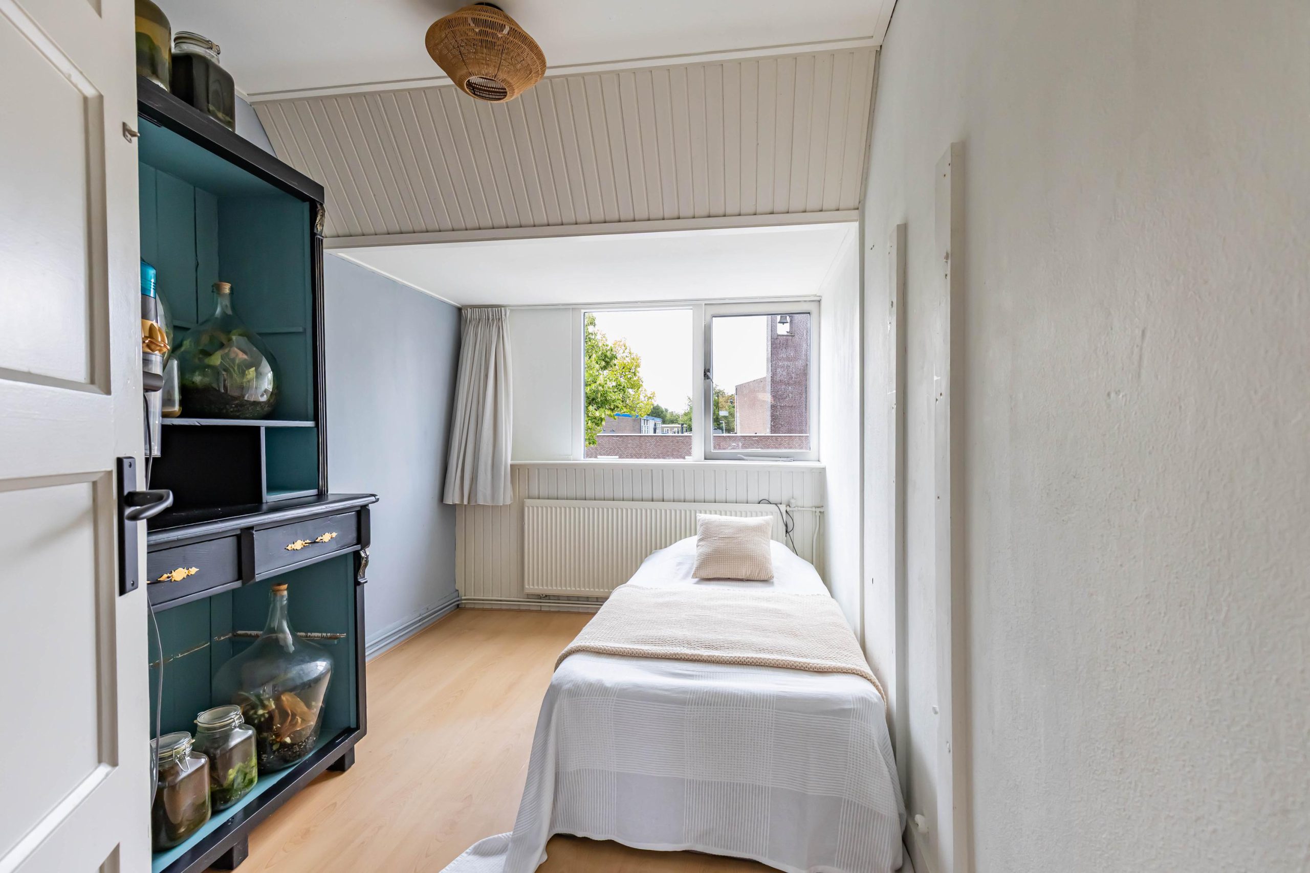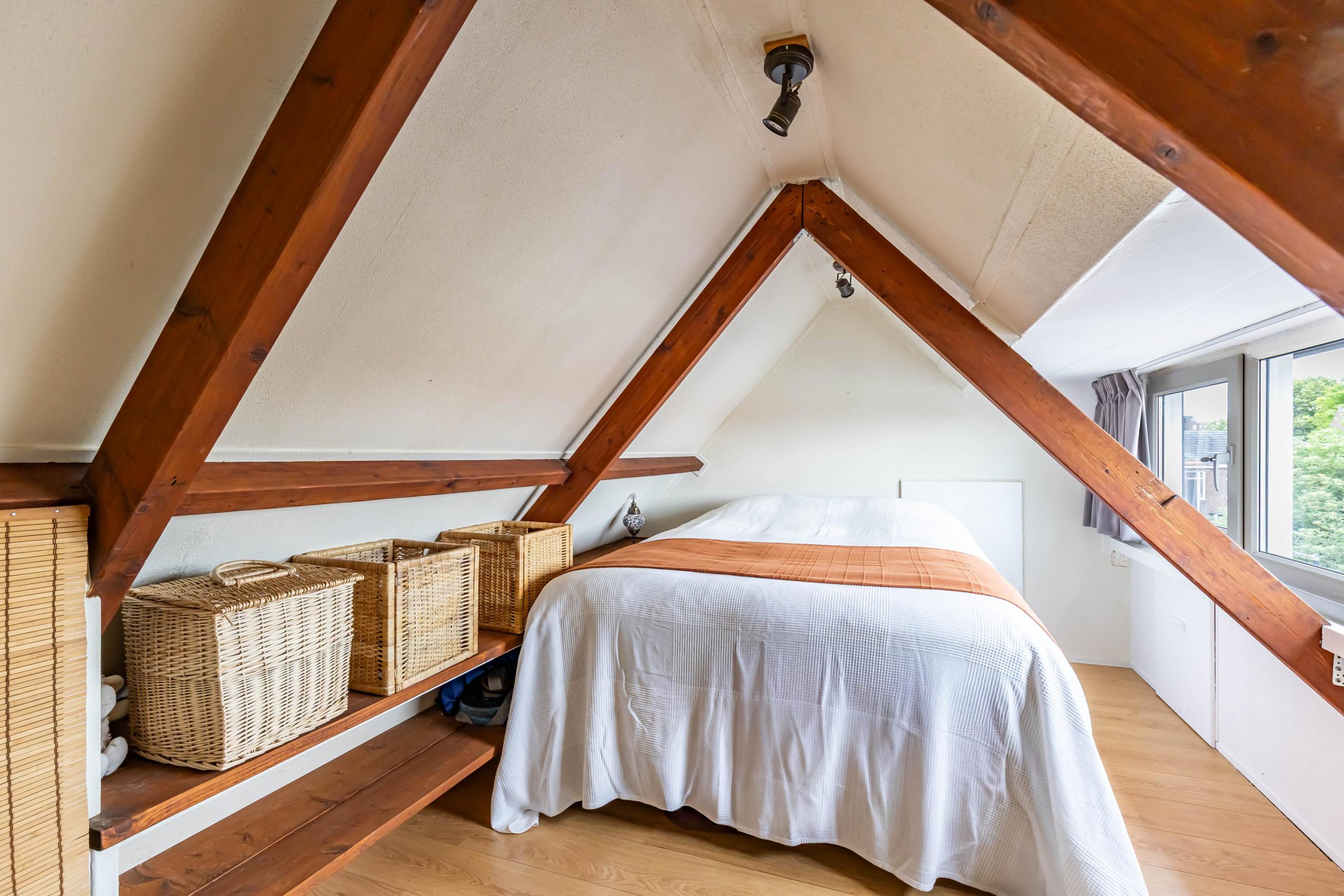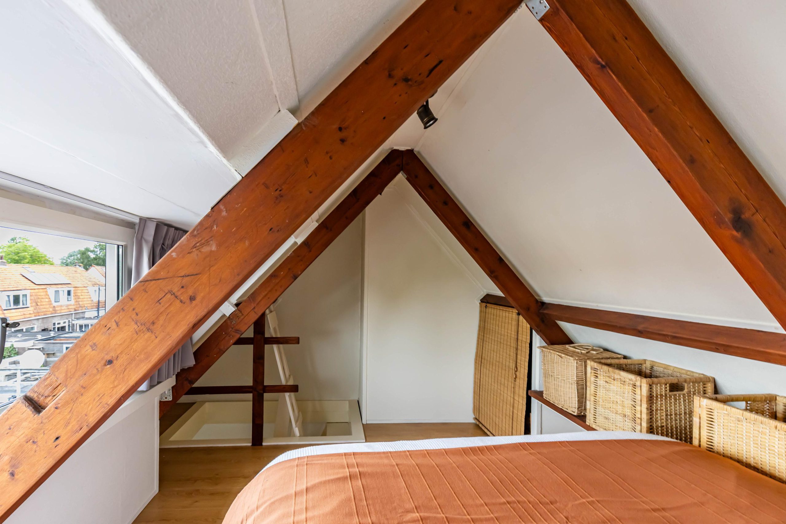 De zolderkamer is bereikbaar via een vaste, steilere trap en doet dienst als sfeervolle vierde slaapkamer. Dankzij de kunststof dakkapel is de ruimte heerlijk licht en de zichtbare houten balken geven het geheel een authentiek karakter. Achter de knieschotten en achter het bed is extra bergruimte gecreëerd.