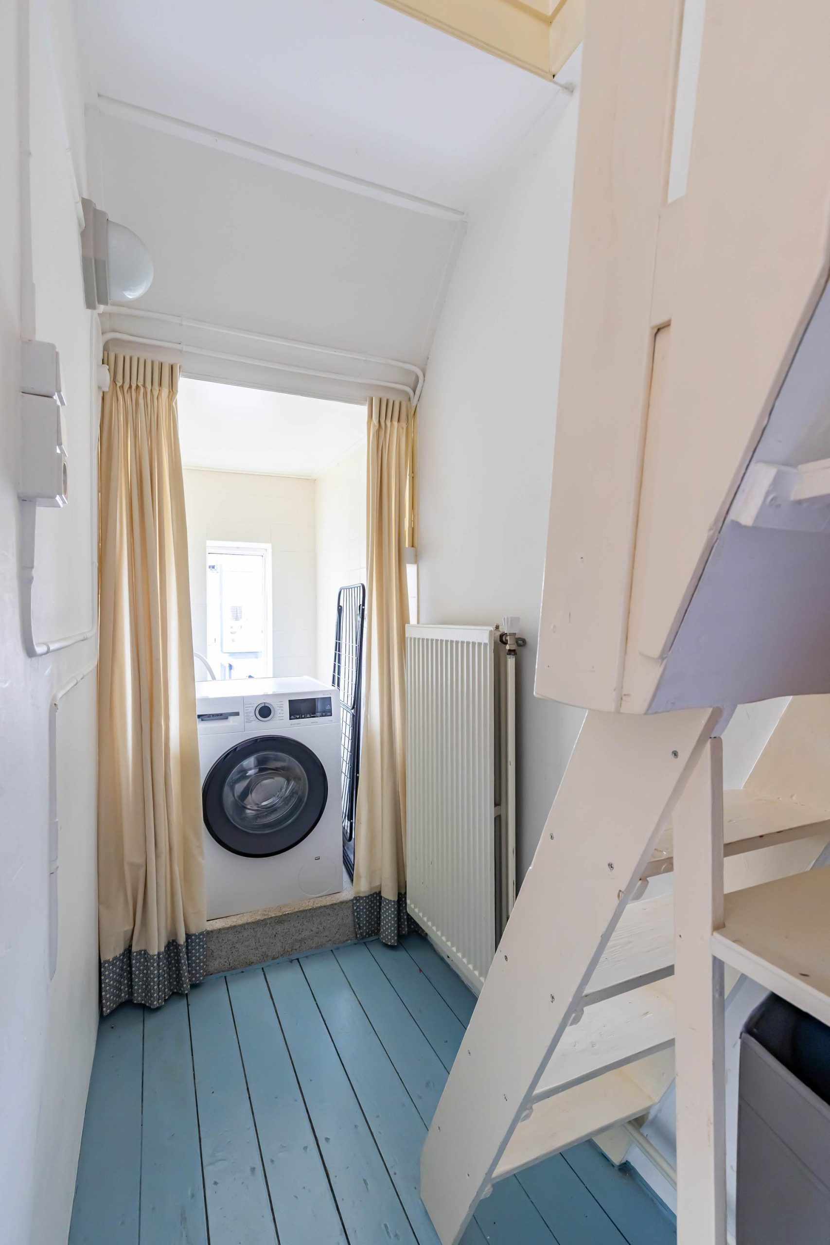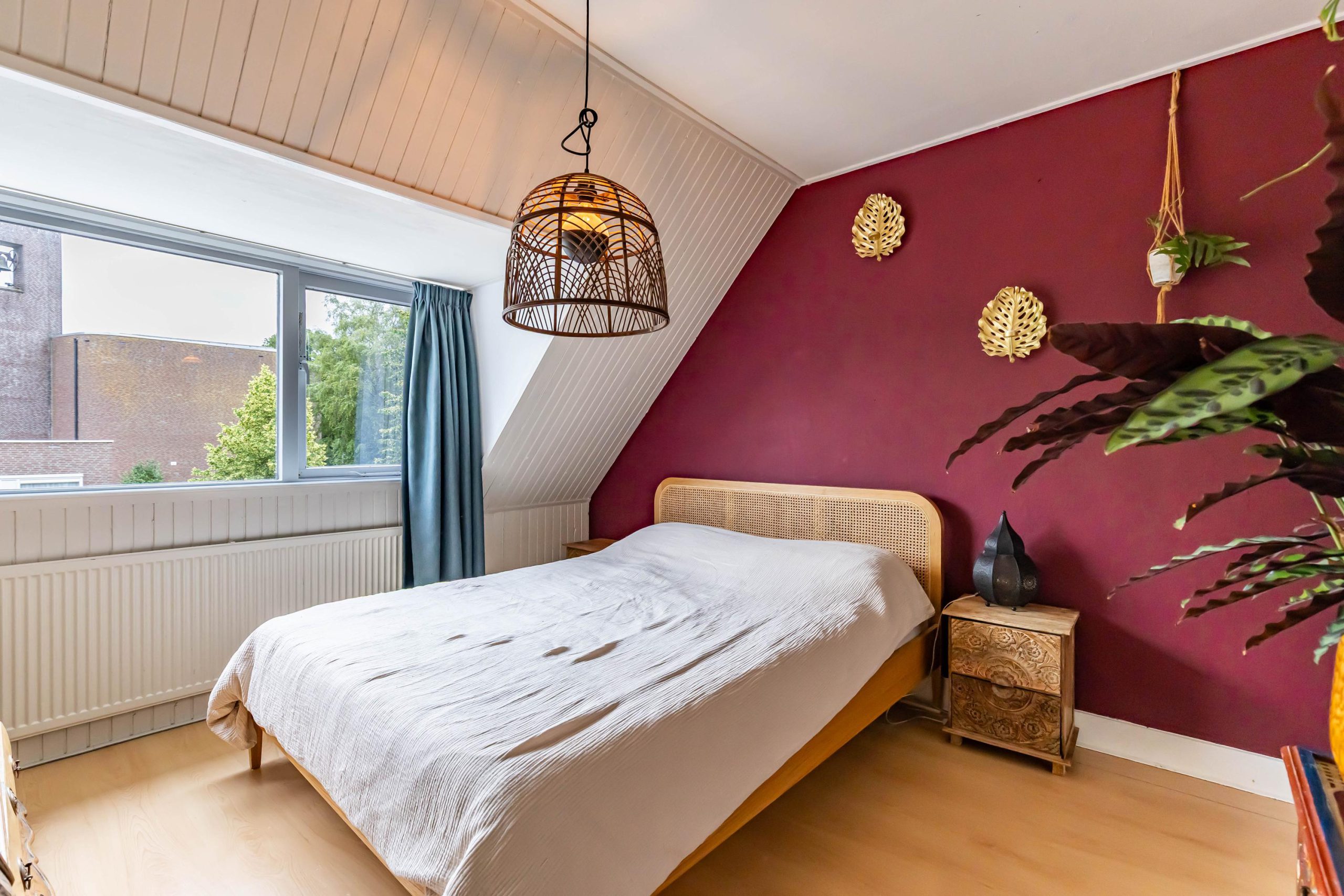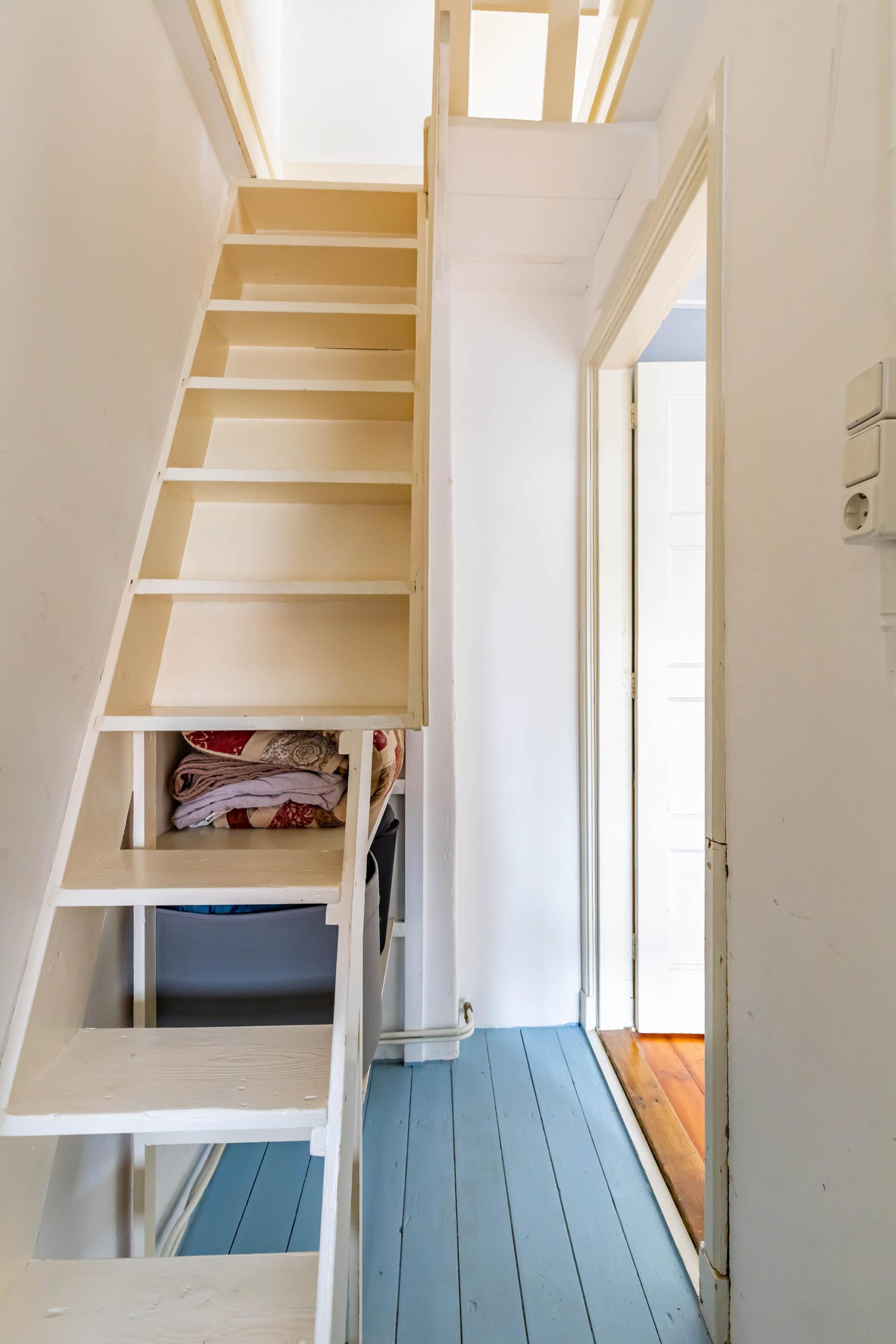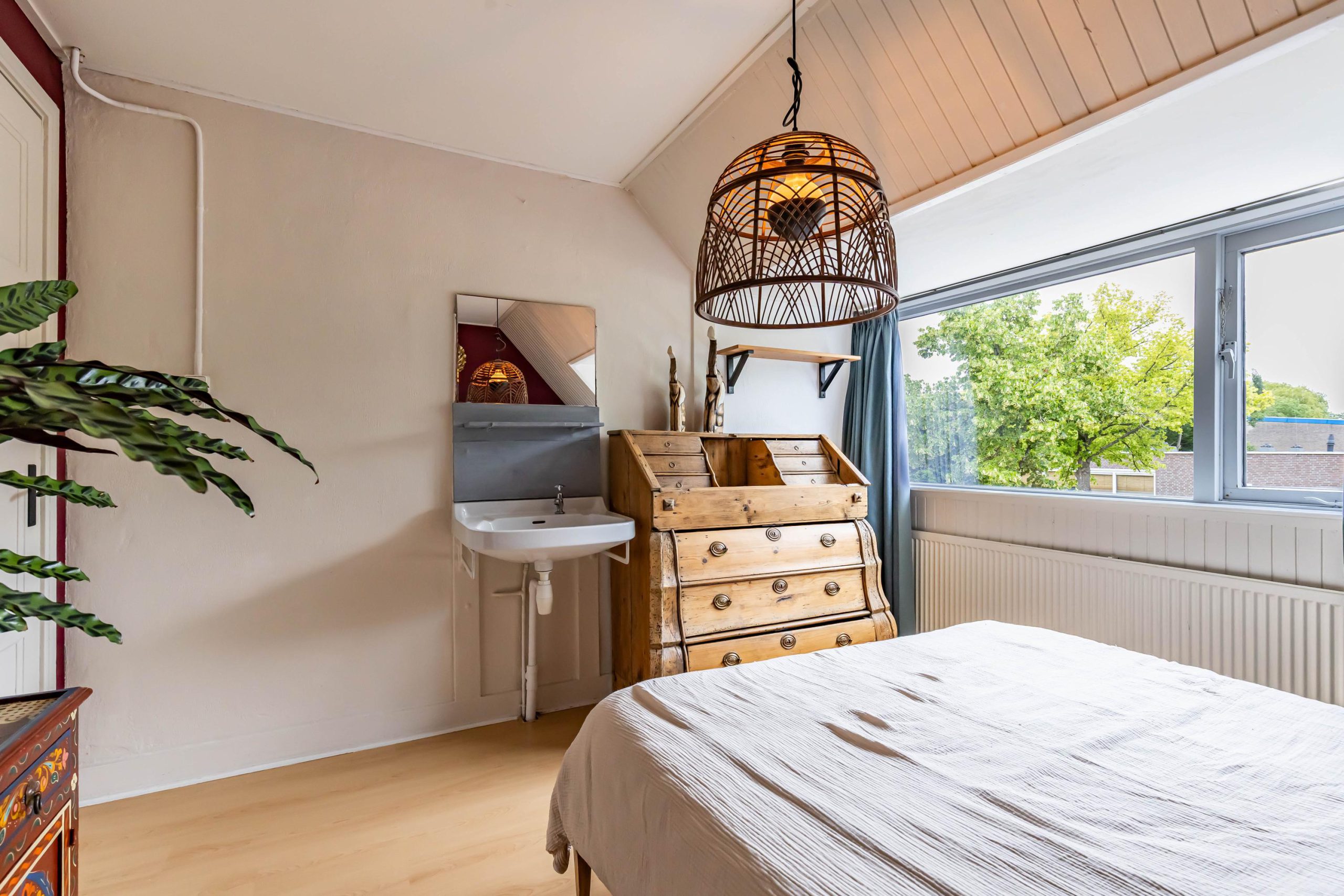 De zolderkamer is bereikbaar via een vaste, steilere trap en doet dienst als sfeervolle vierde slaapkamer. Dankzij de kunststof dakkapel is de ruimte heerlijk licht en de zichtbare houten balken geven het geheel een authentiek karakter. Achter de knieschotten en achter het bed is extra bergruimte gecreëerd.