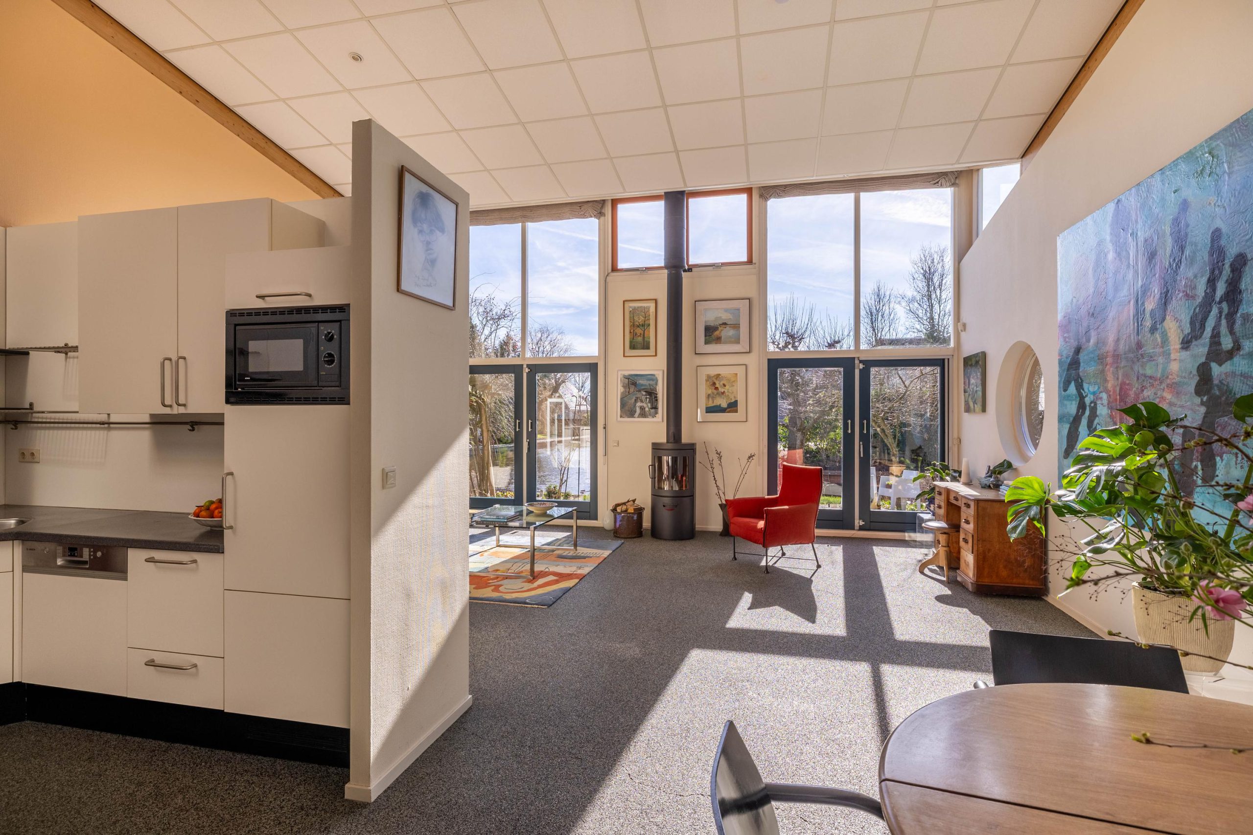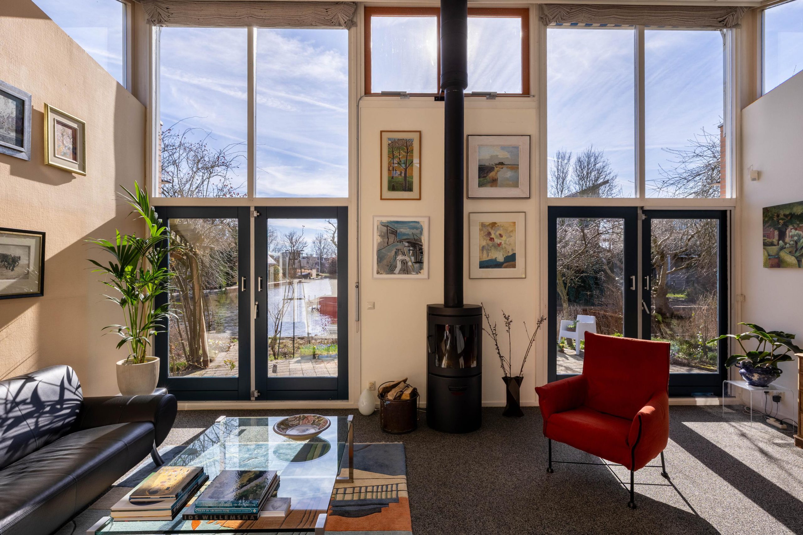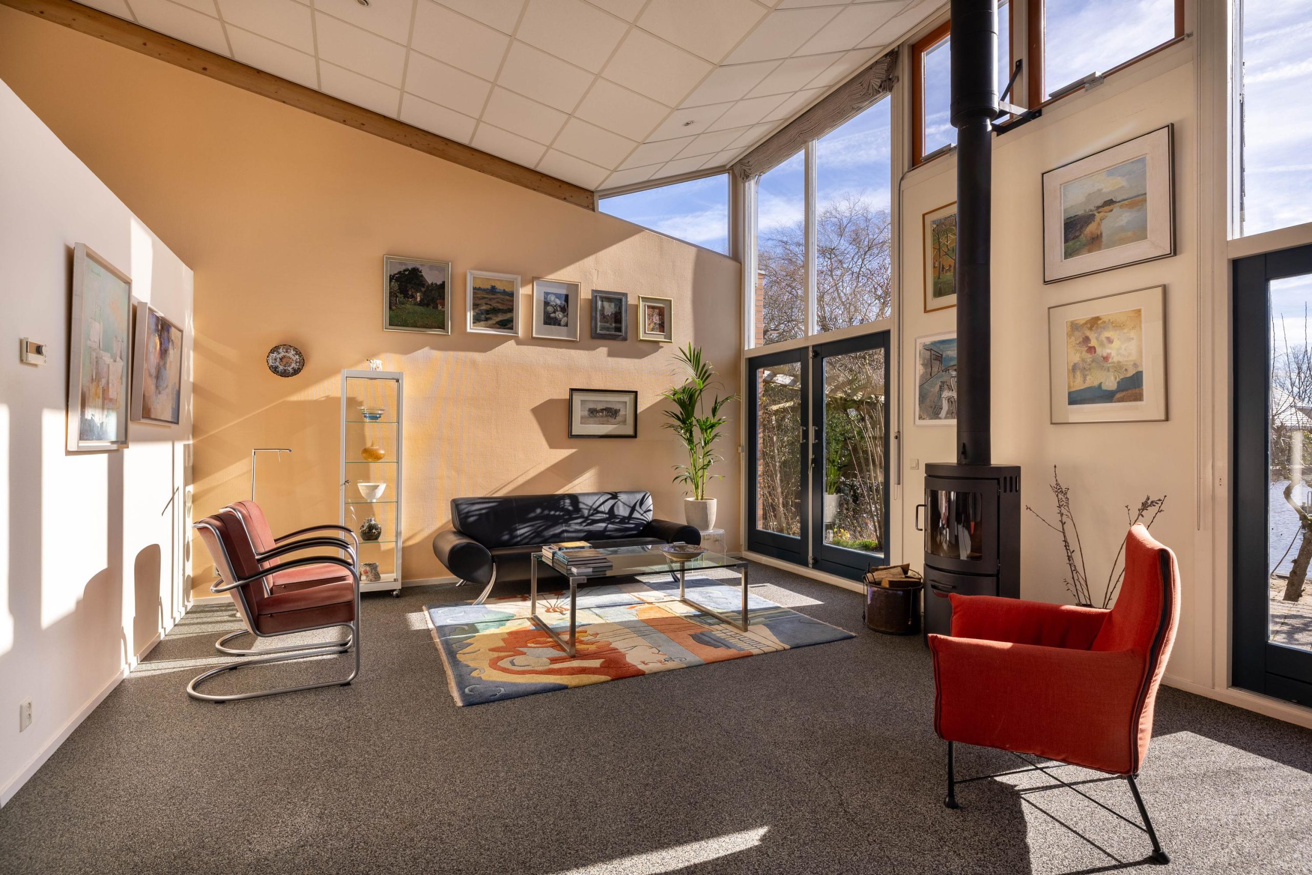 De woonkamer vormt het hart van het huis. Hier spelen licht en uitzicht de hoofdrol. Grote raampartijen zorgen voor een prachtig zicht op de tuin en het water, terwijl de zon gedurende de dag op verschillende manieren naar binnen valt. De houtkachel zorgt voor extra sfeer en warmte op koelere dagen. Dankzij de dubbele openslaande deuren loopt binnen hier moeiteloos over in buiten.