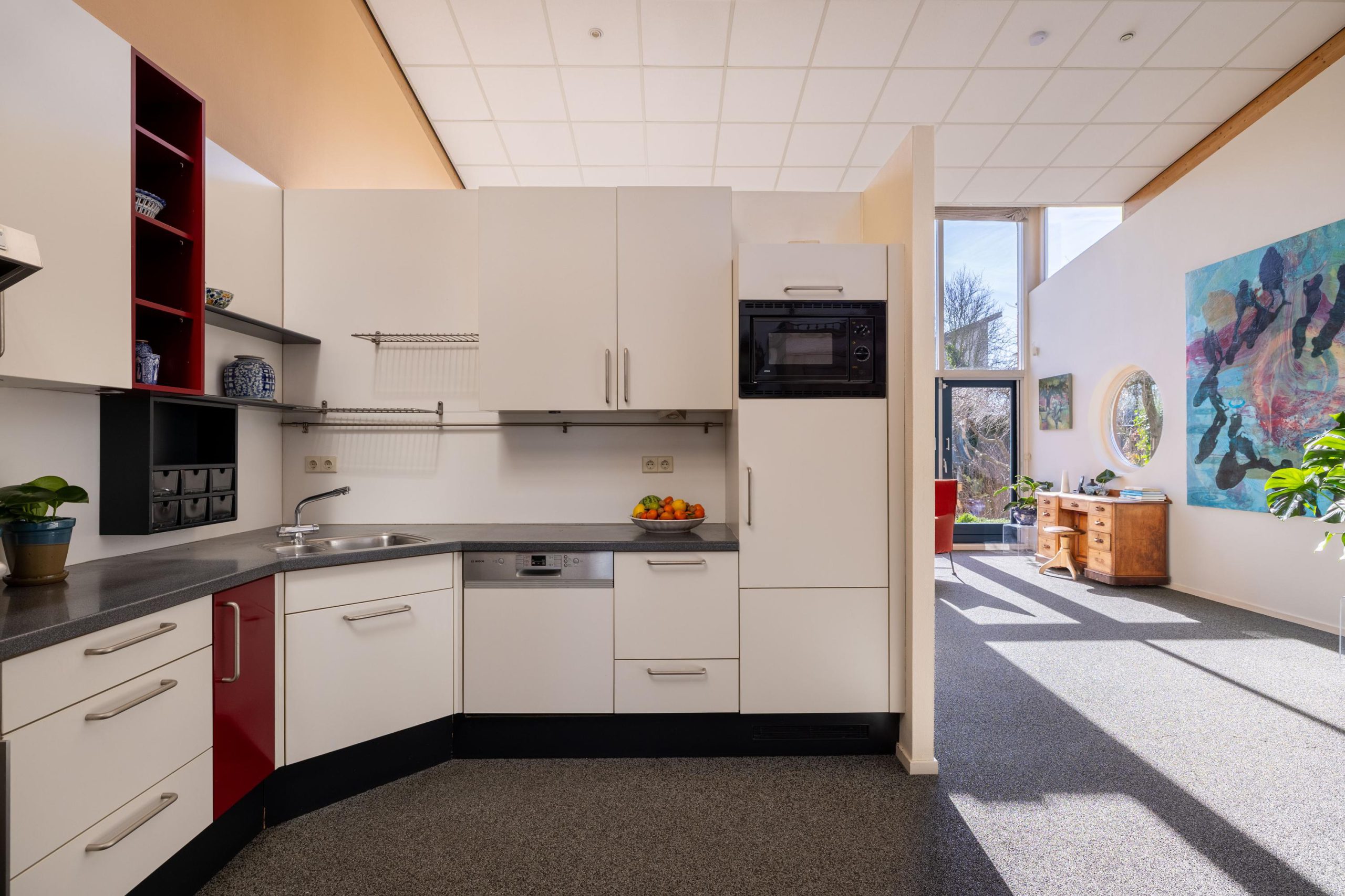 De keuken ligt aan de woonkamer en heeft daarnaast een fijne plek voor de eettafel bij het raam. Ook hier is veel daglicht en uitzicht op de tuin. De keuken is netjes onderhouden en van goede kwaliteit.