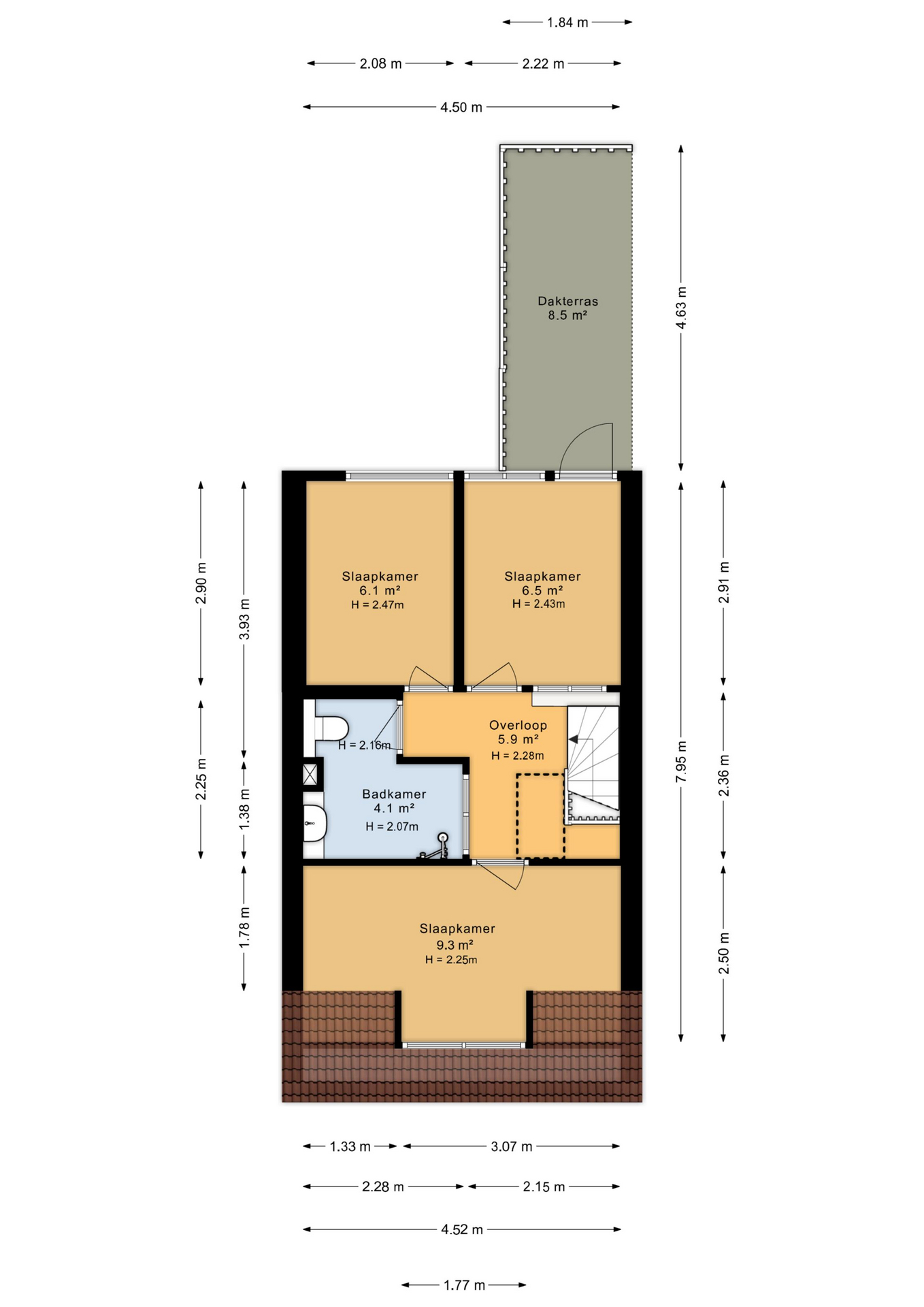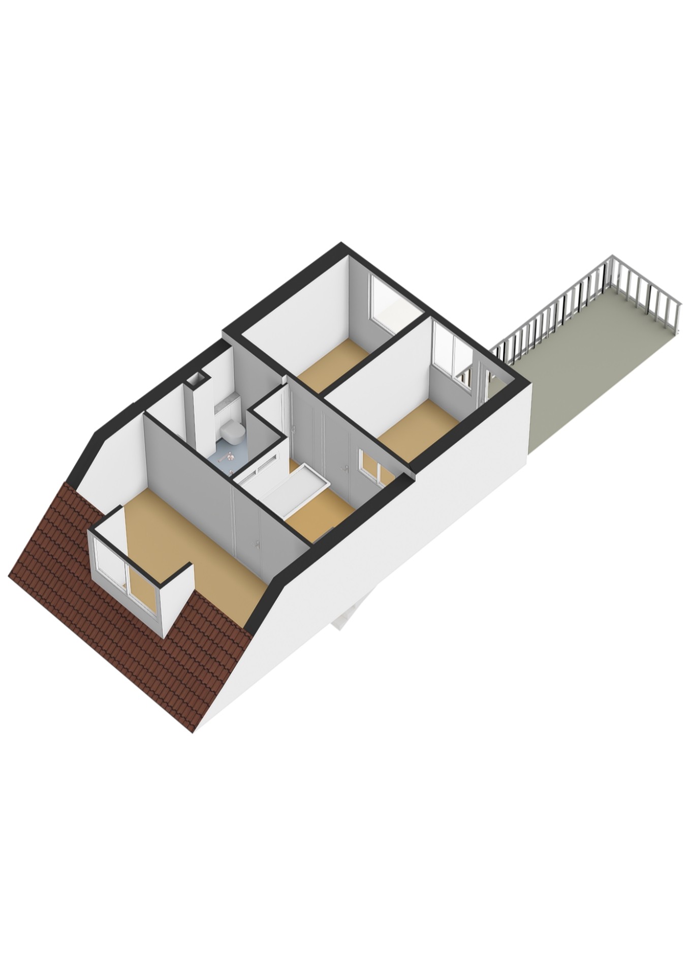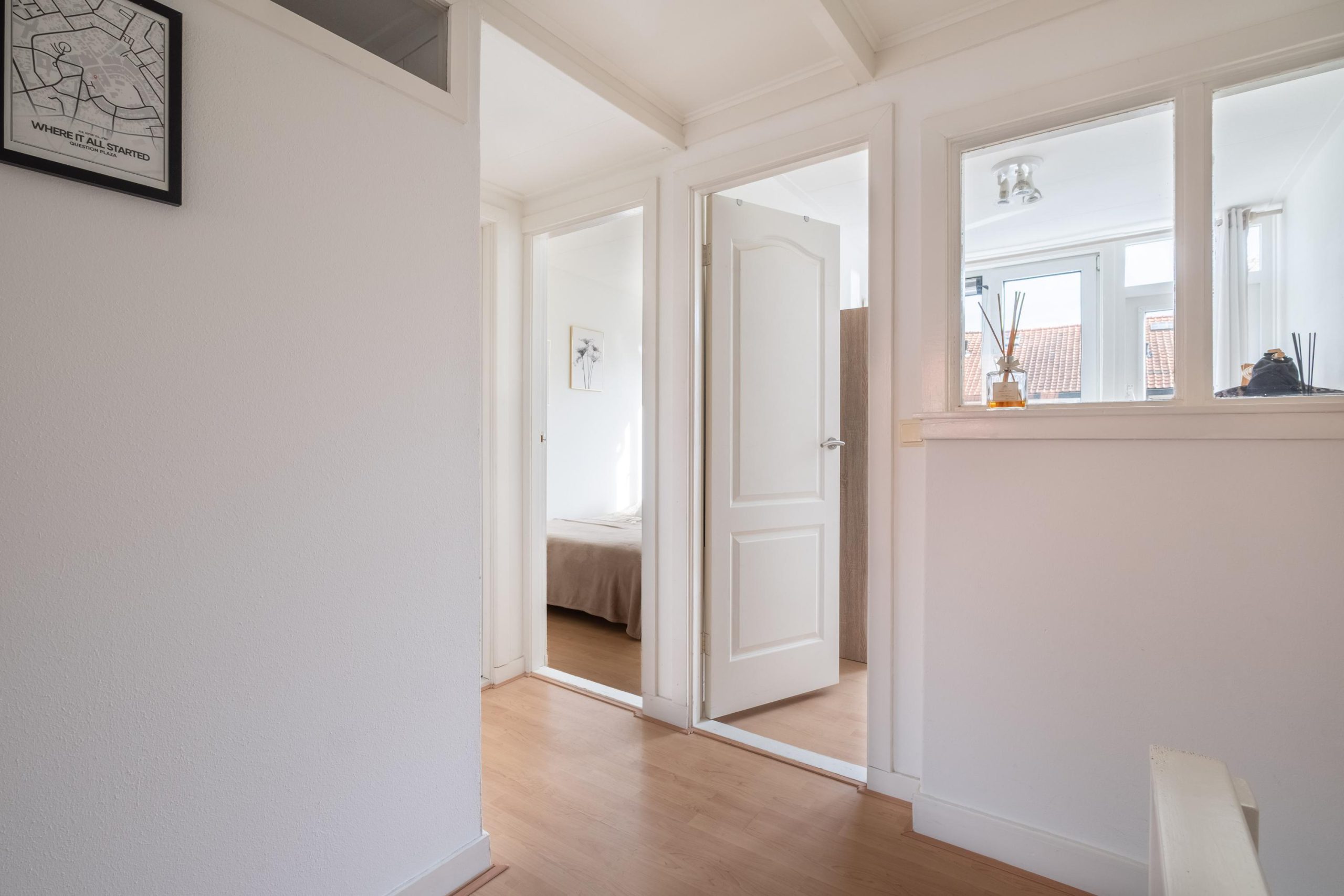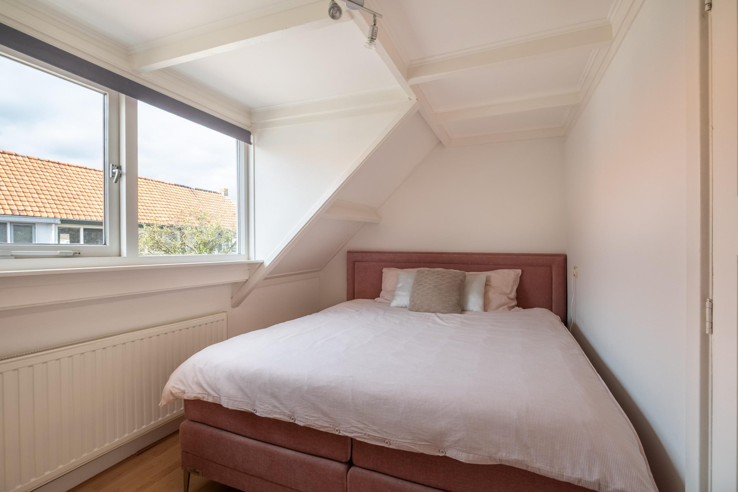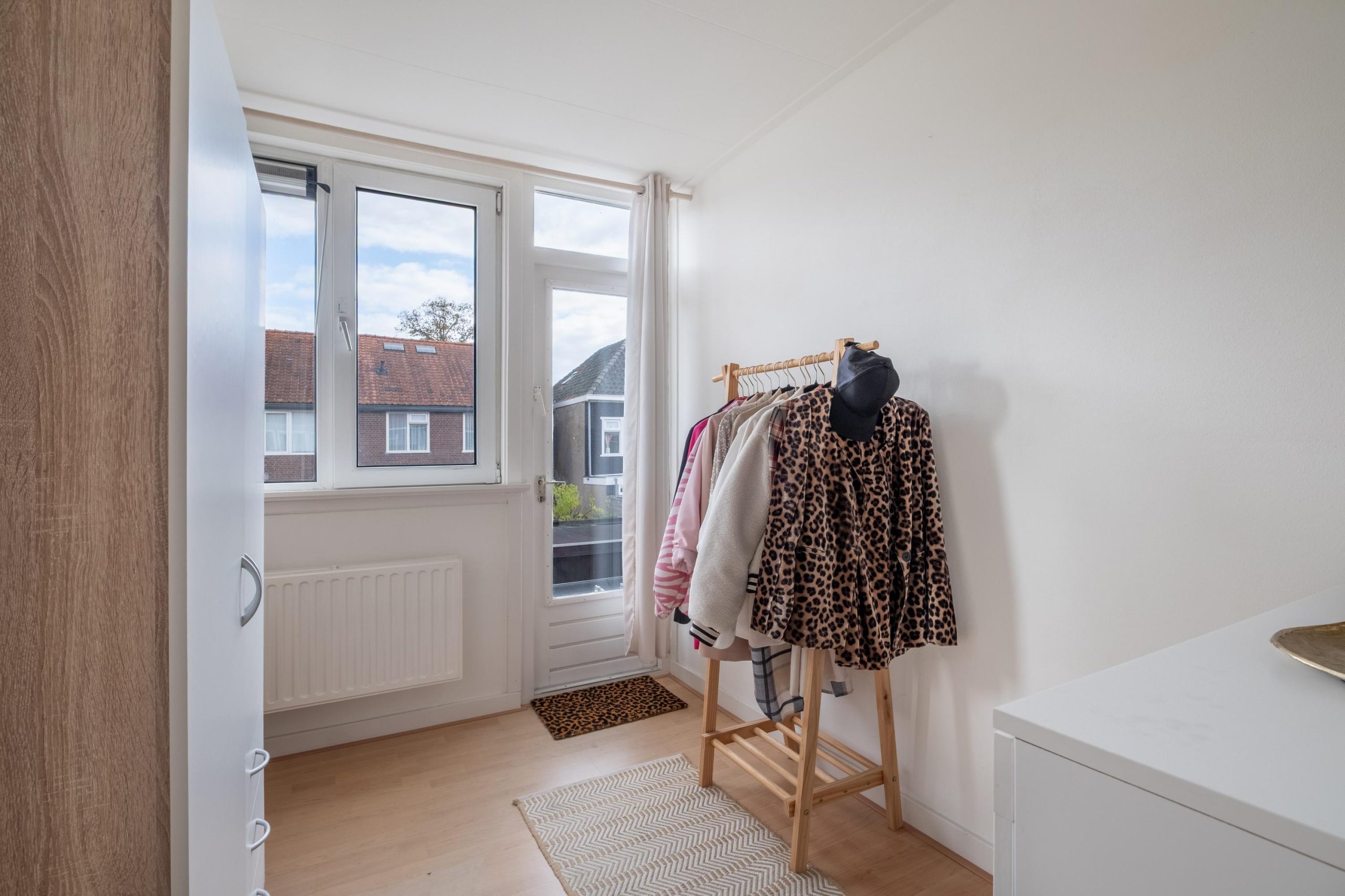 Op de eerste verdieping bevinden zich drie slaapkamers. De kamer aan de voorzijde heeft een mooi lichtinval, de twee kamers aan de achterzijde zijn prettig van formaat. Eén ervan biedt toegang tot het dakterras boven de bijkeuken – een zonnige plek waar je ’s zomers extra kunt genieten.
