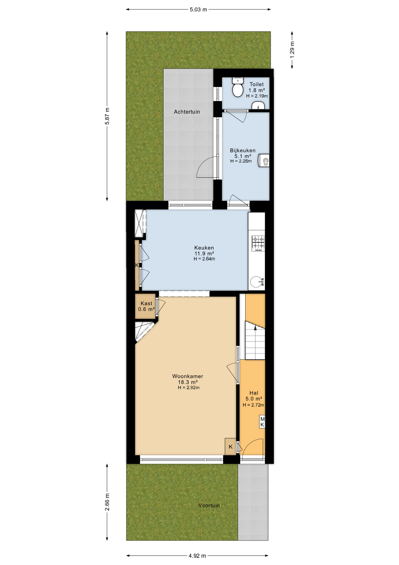 De woonkeuken heeft een gezellige opstelling met 4-pits gasfornuis, oven, koelkast en vaatwasser. De naastgelegen bijkeuken is lekker licht en praktisch ingericht, met aansluiting voor witgoed en de cv-ketel. Ook heb je hier toegang tot het losse toilet. Vanuit de bijkeuken stap je direct de tuin in.