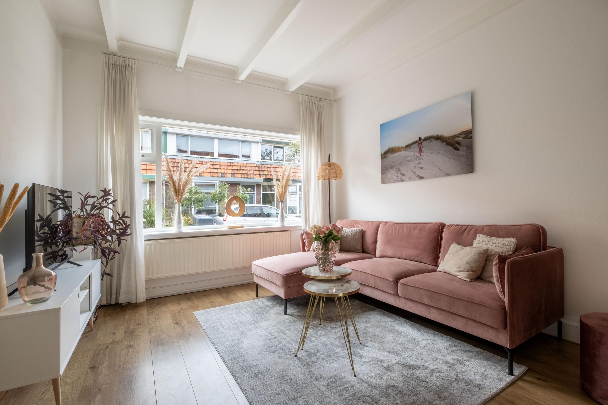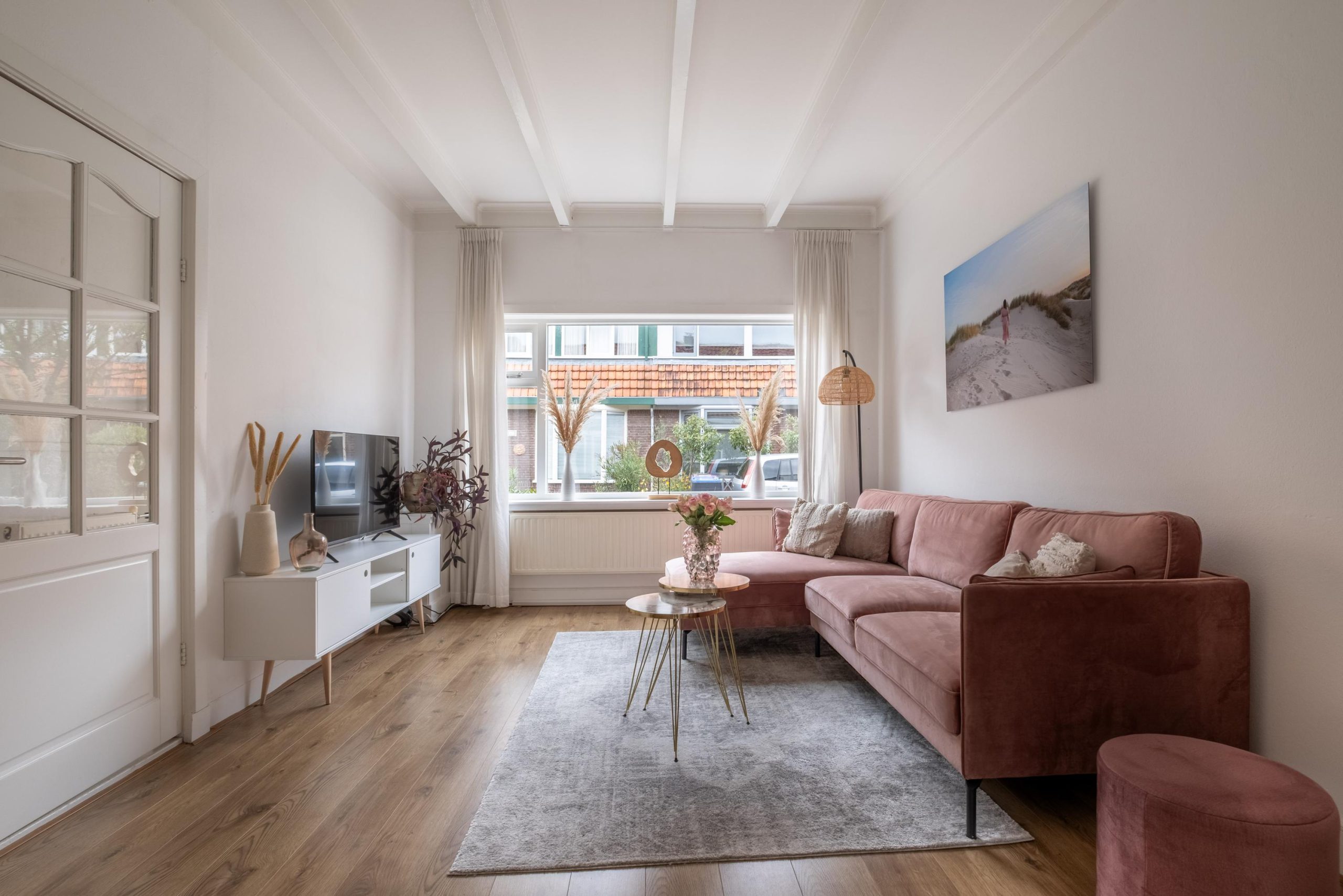 Lichte woonkamer met hoge plafonds