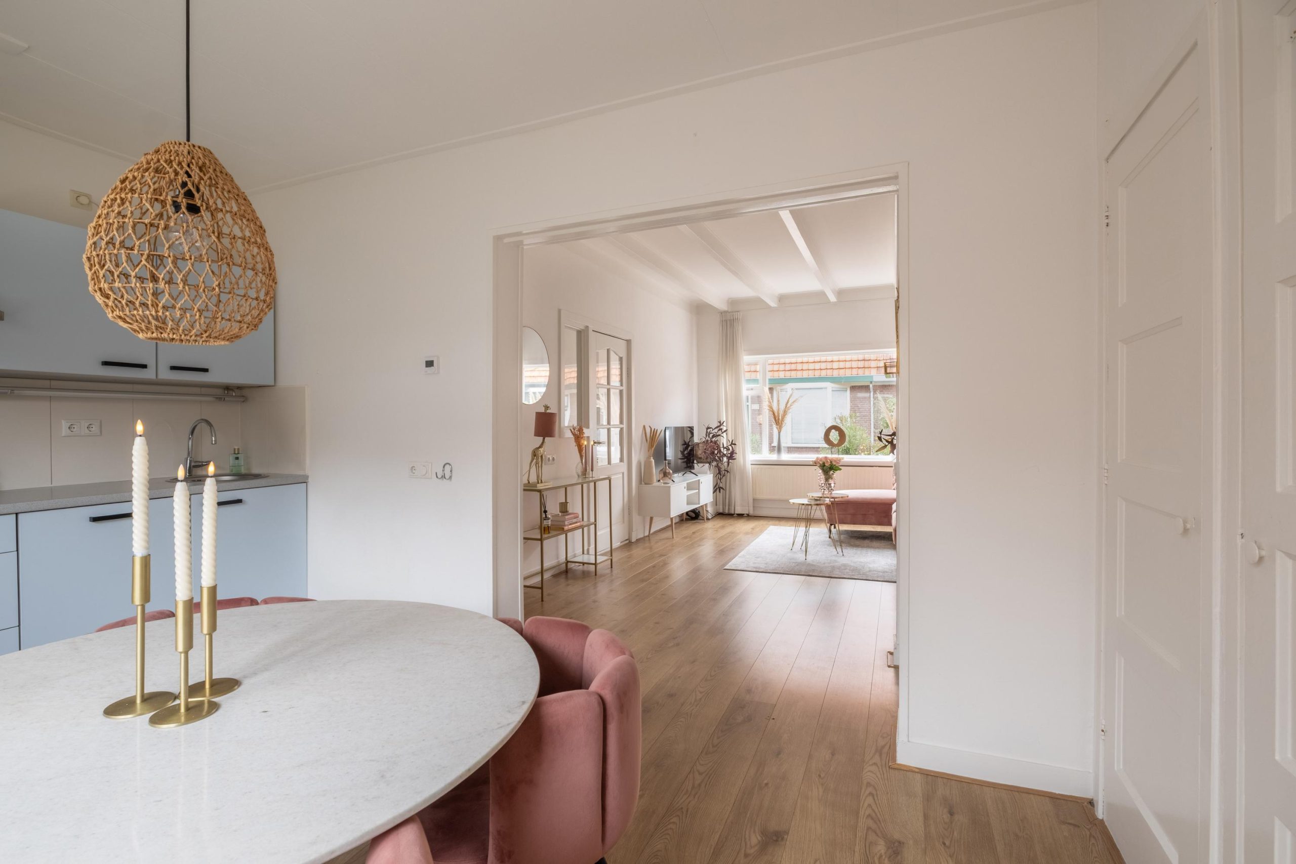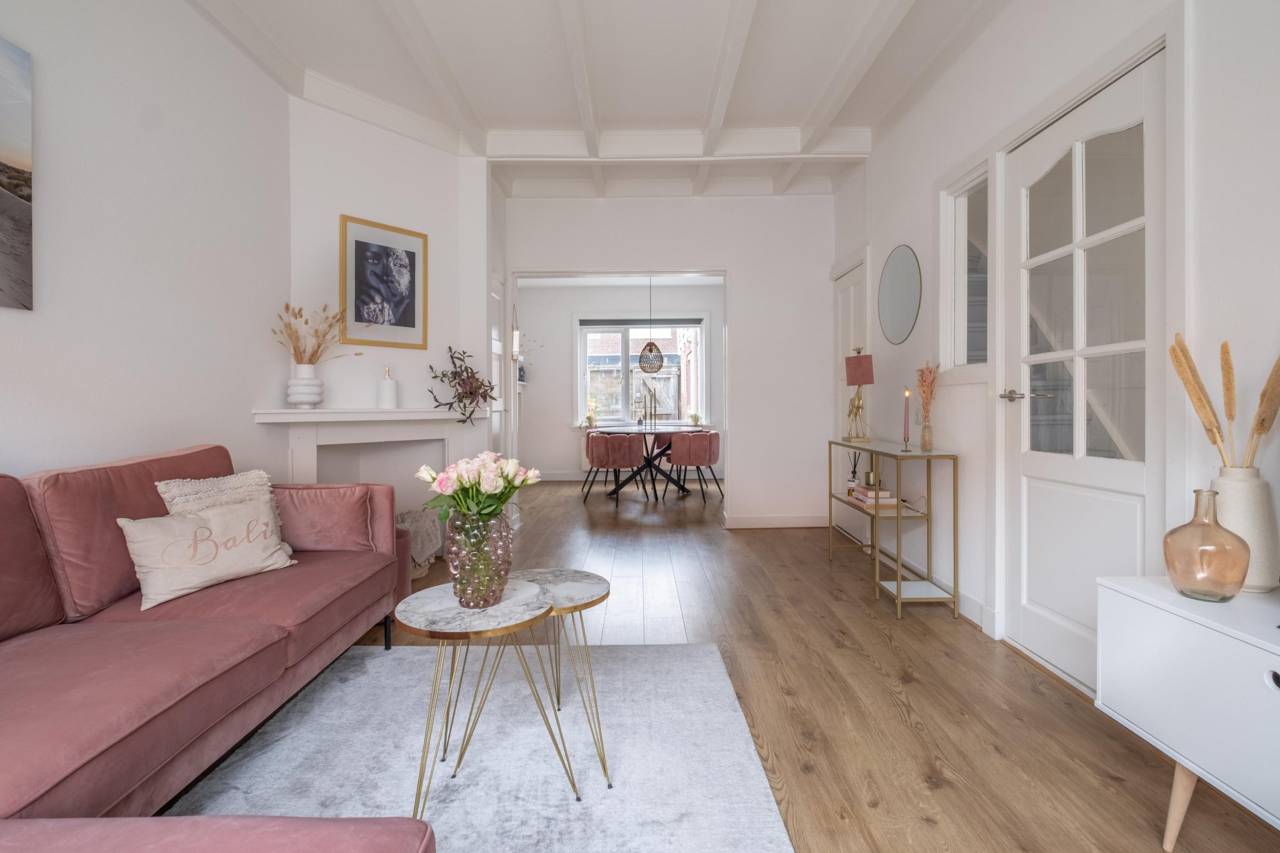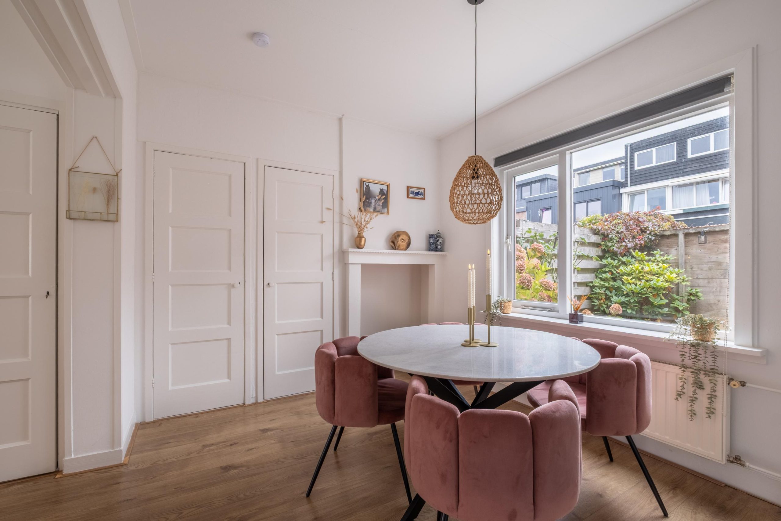 De woonkamer is ruim en sfeervol tegelijk. De hoge balkenplafonds, houten details en twee sierlijke schouwen geven de ruimte karakter. Dankzij de grote ramen is het heerlijk licht, en met maar liefst vier vaste kasten is er verrassend veel bergruimte. Aan de achterzijde ligt de eetkamer – perfect voor lange avonden aan tafel, met zicht op de tuin.
