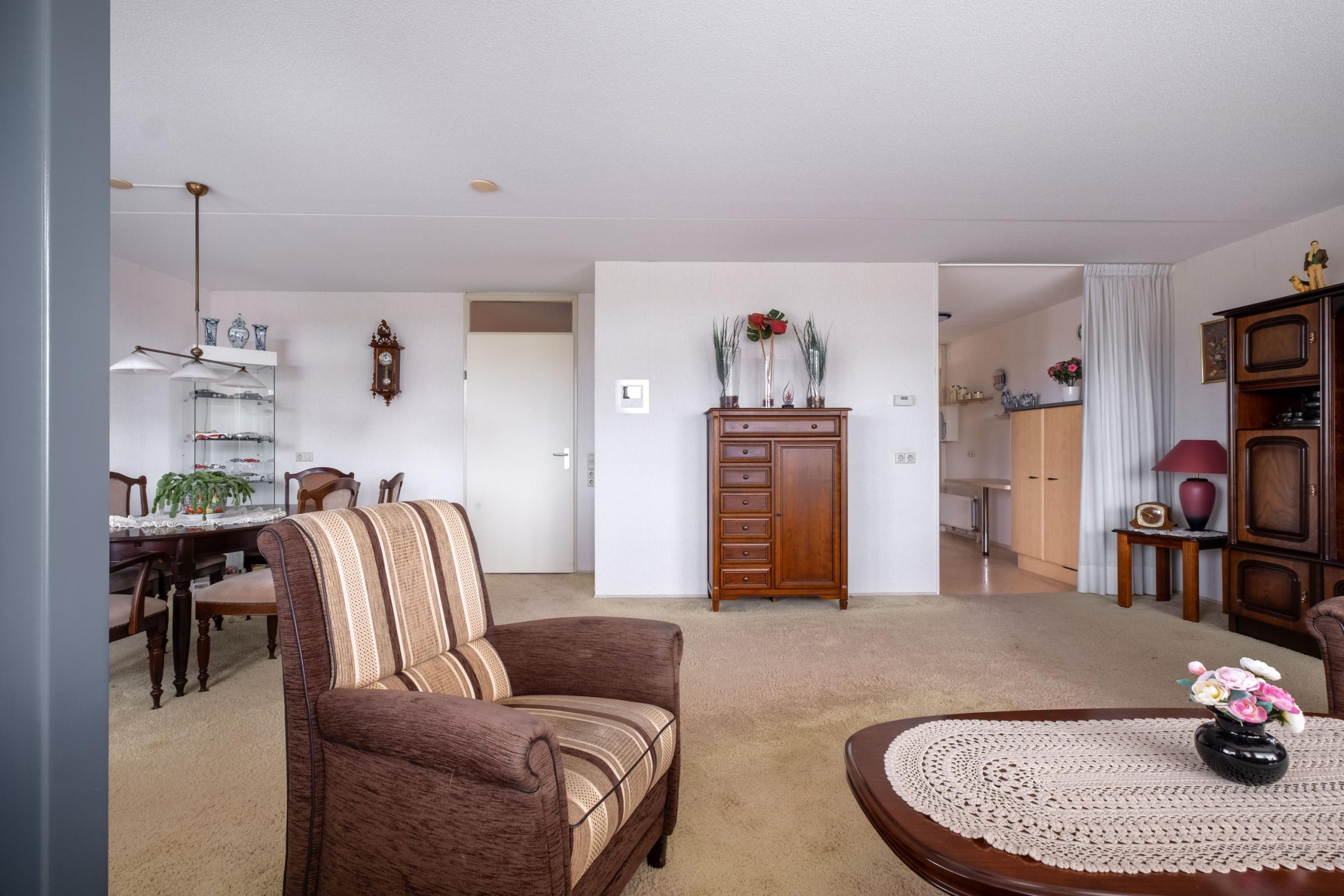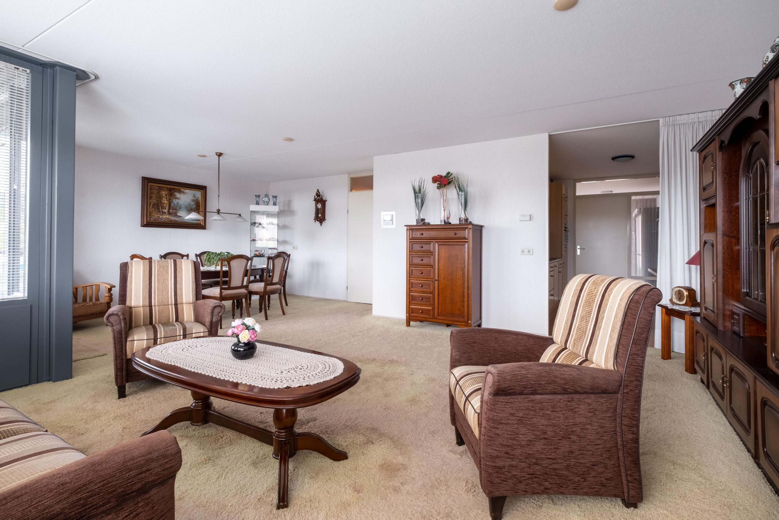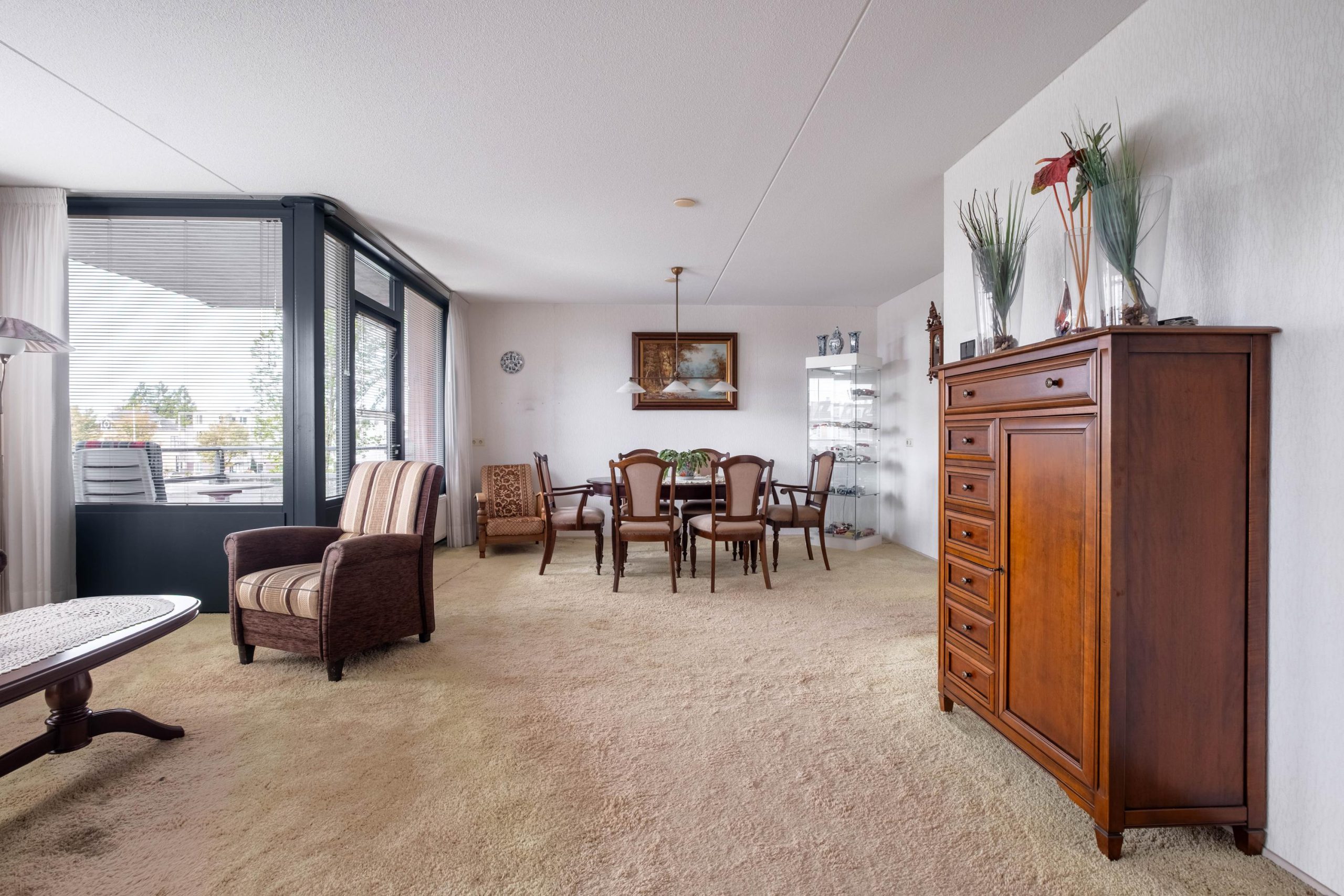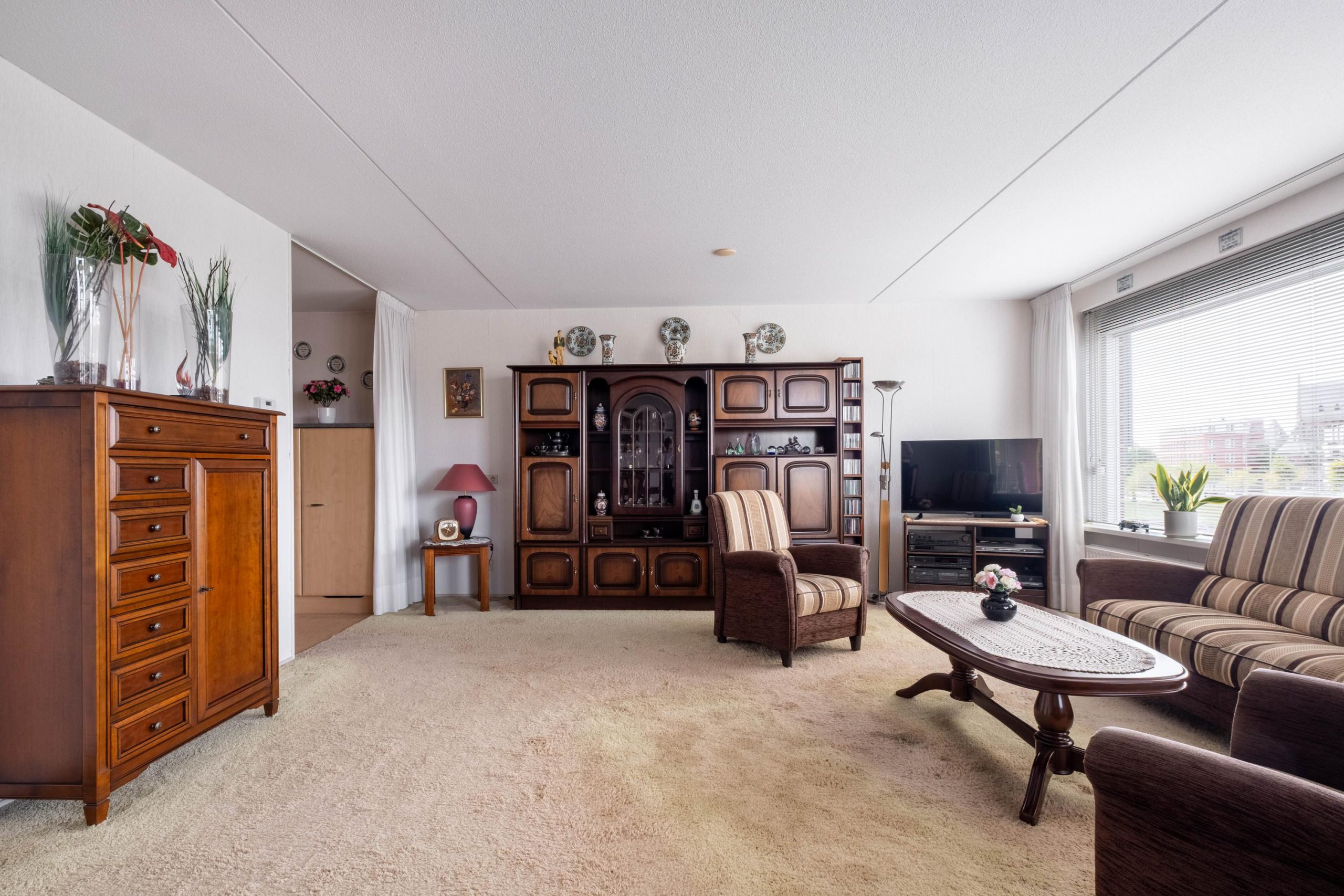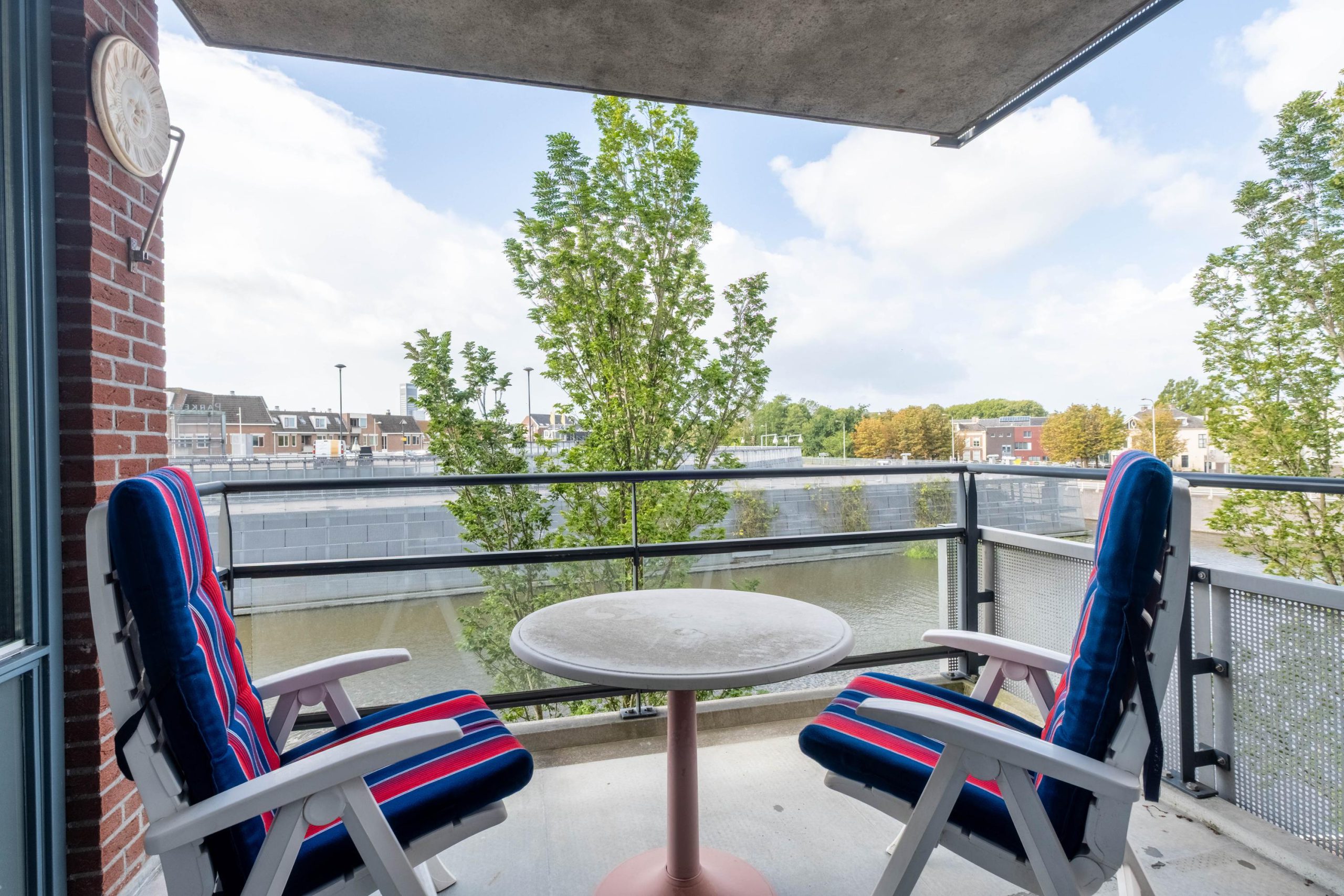 De woonkamer voelt licht en ruim, met grote ramen en een prachtig uitzicht over het water. Vanuit hier loop je zo het balkon op, waar je een heerlijk buitenzitje hebt met volop privacy en uitzicht.