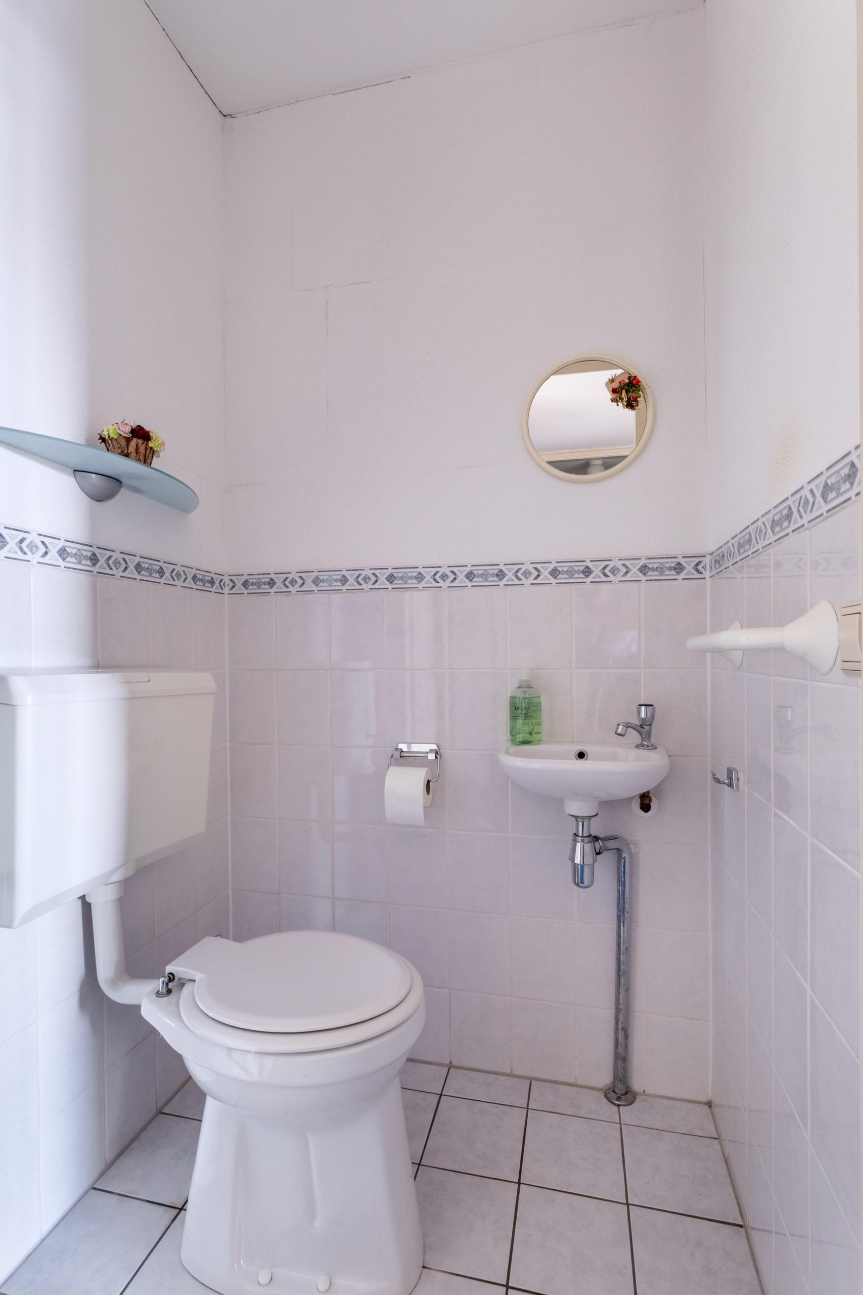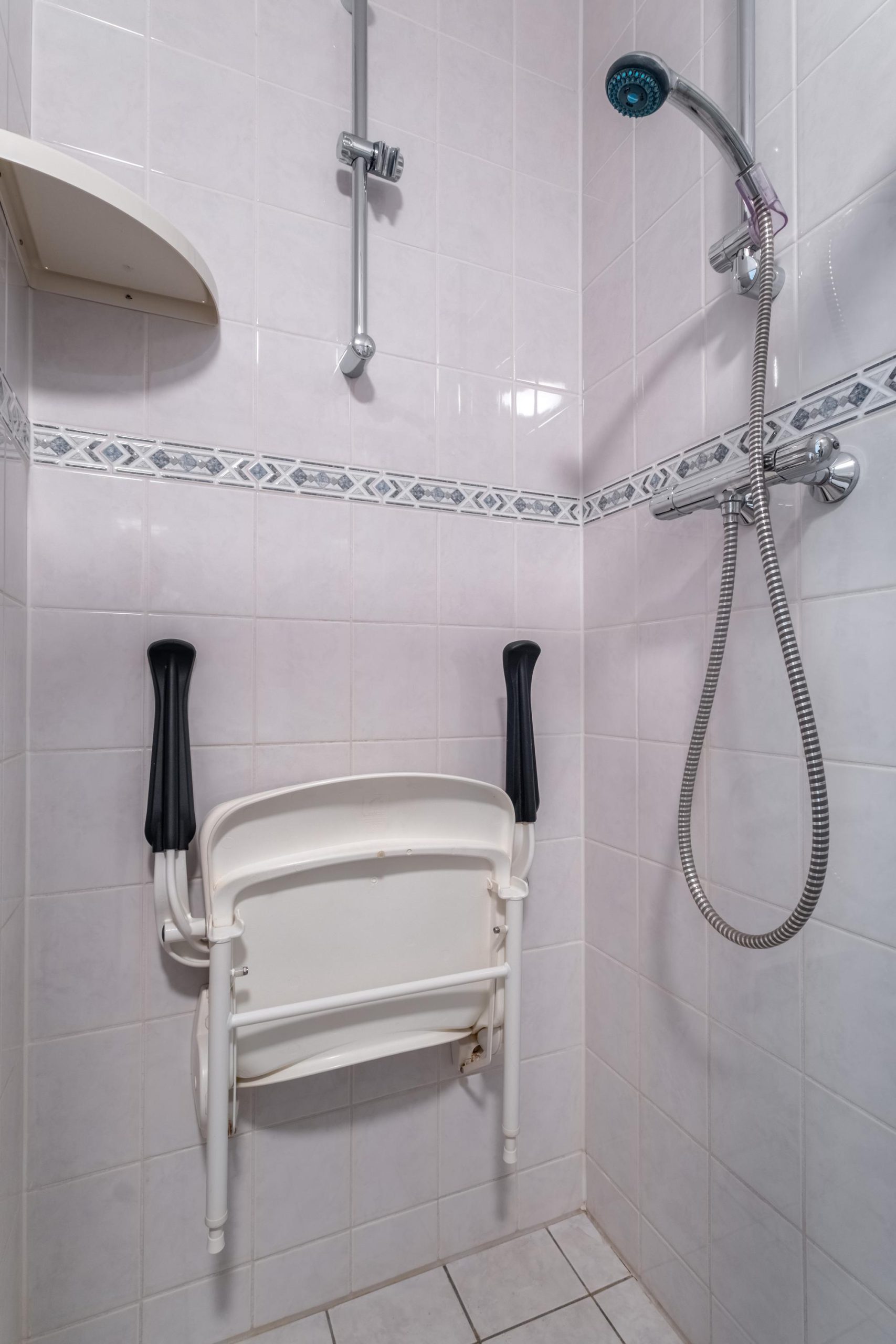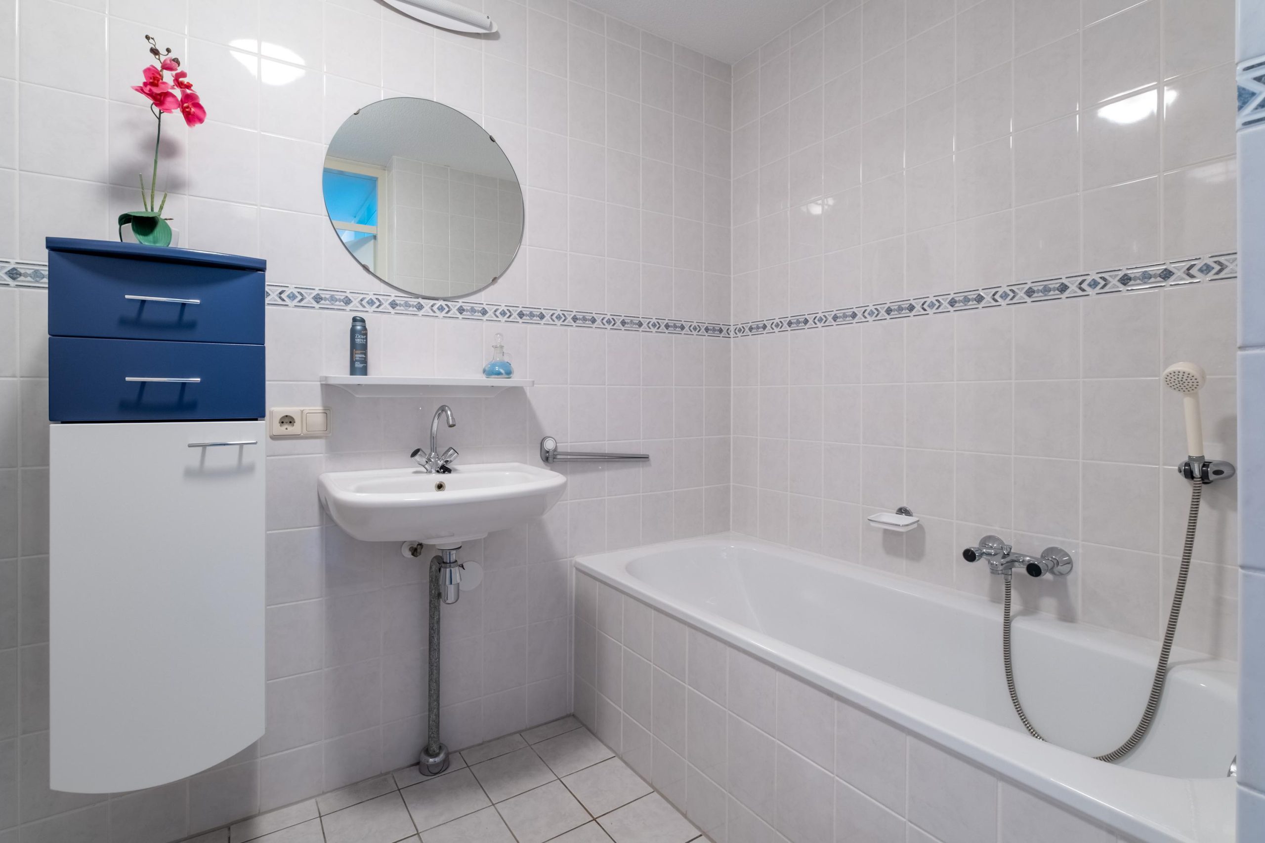 De badkamer is ingericht met een douche, wastafel en ligbad. Daarnaast is er een separaat toilet.