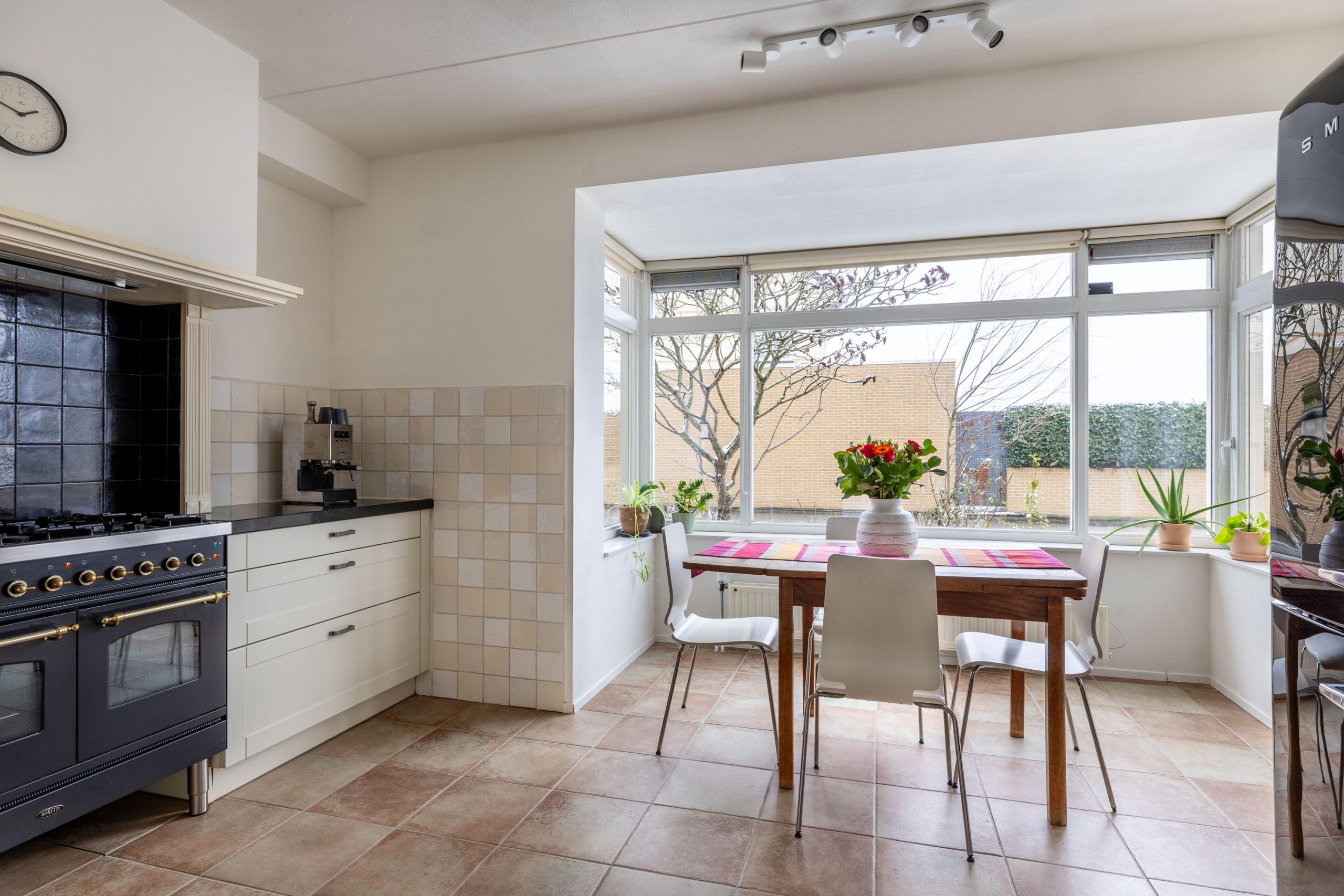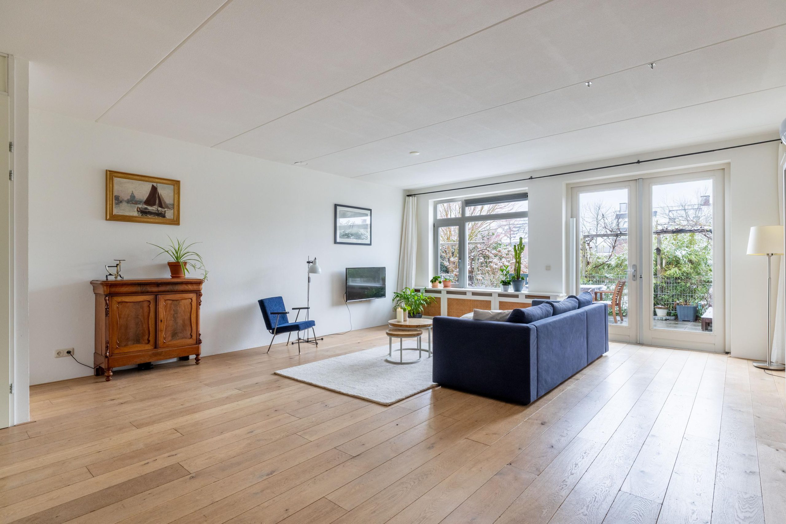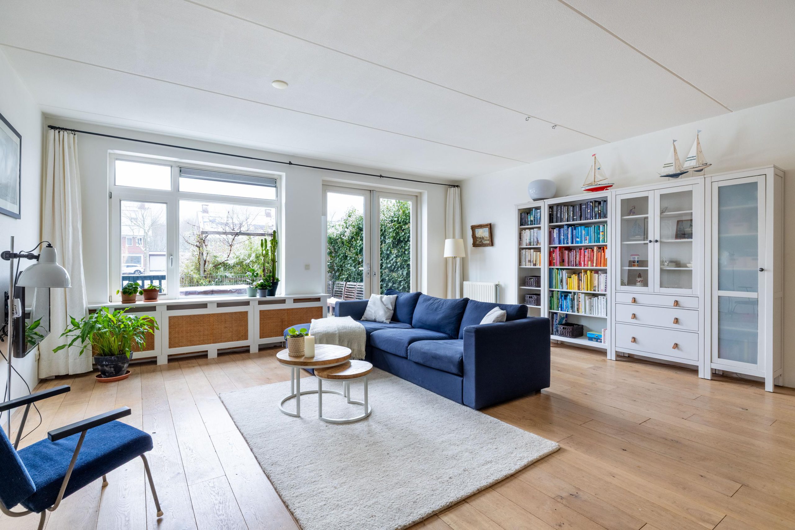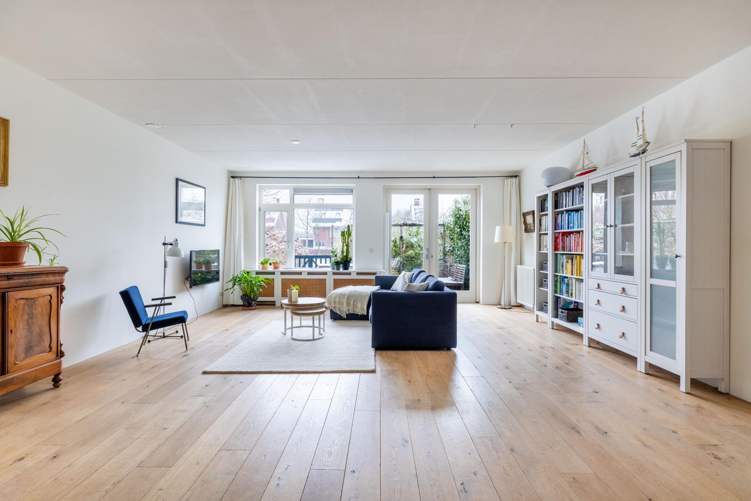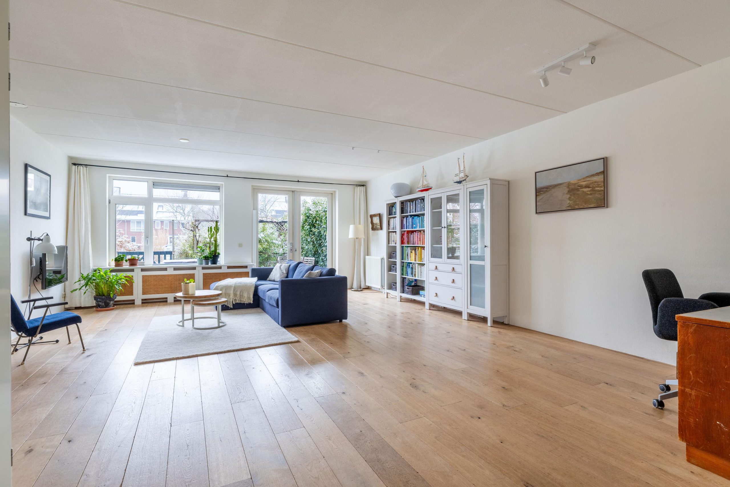 De woonkamer is uitgebouwd, wat zorgt voor extra leefruimte en een fijne, open sfeer. Dankzij de grote raampartijen valt het daglicht rijkelijk naar binnen en staat de woonkamer in directe verbinding met de achtertuin. Via de tuindeur loop je zo naar buiten, waardoor binnen en buiten op een natuurlijke manier in elkaar overlopen.