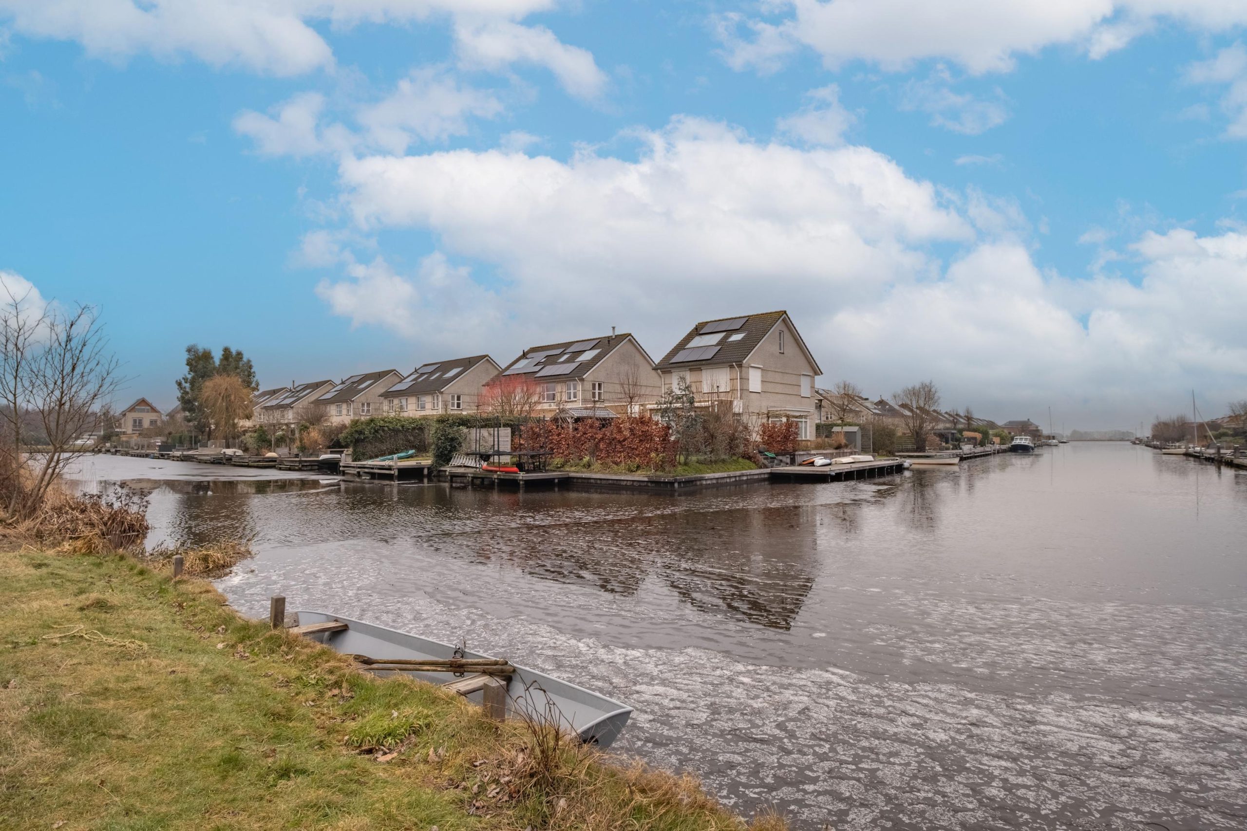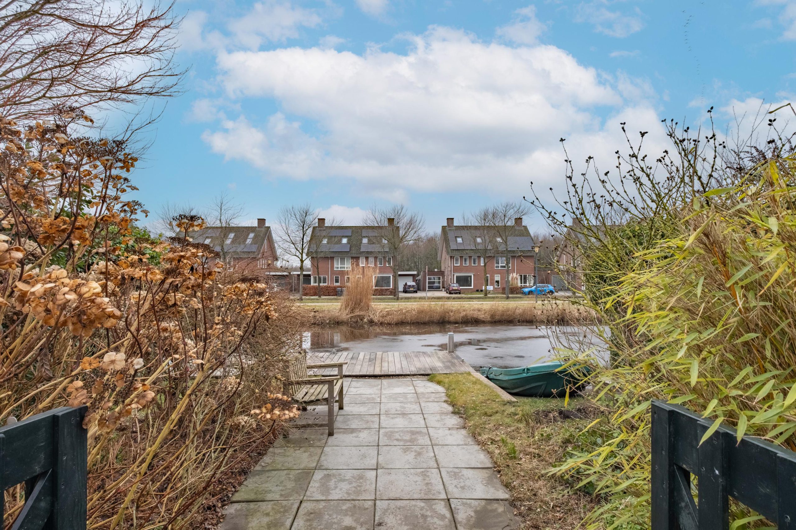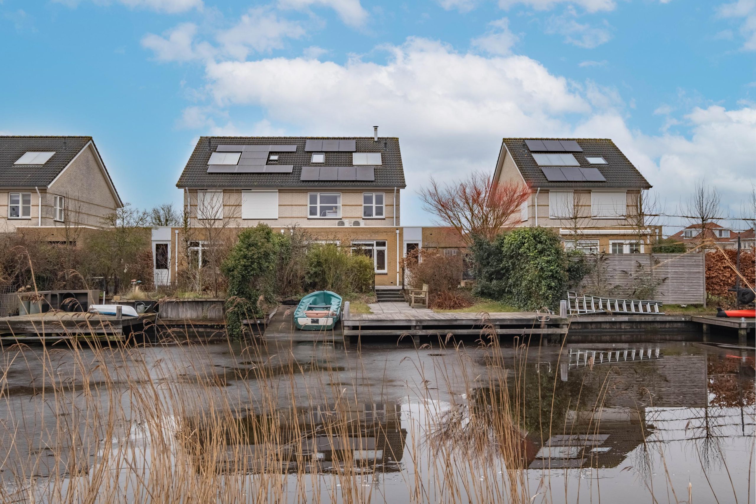 De achtertuin ligt gunstig op het westen en grenst direct aan open vaarwater. Met circa 10 meter eigen oever, steiger en een eigen helling om de boot uit het water te halen. Hier geniet je volop van de zon, water en rust.