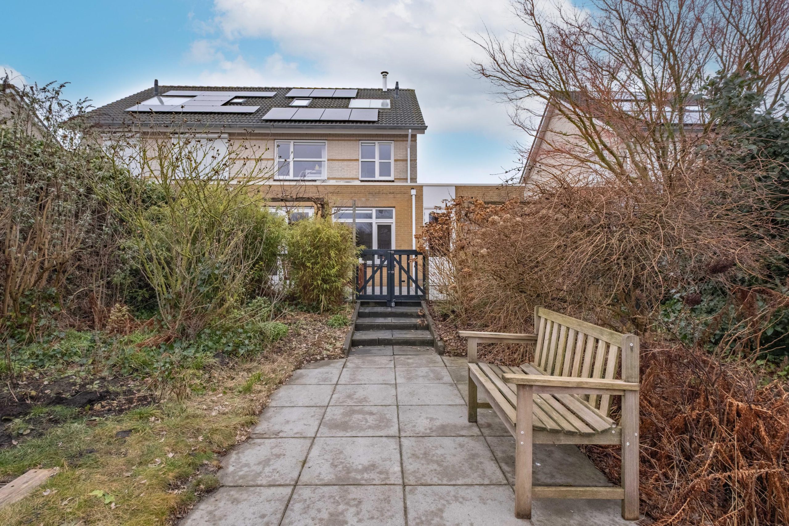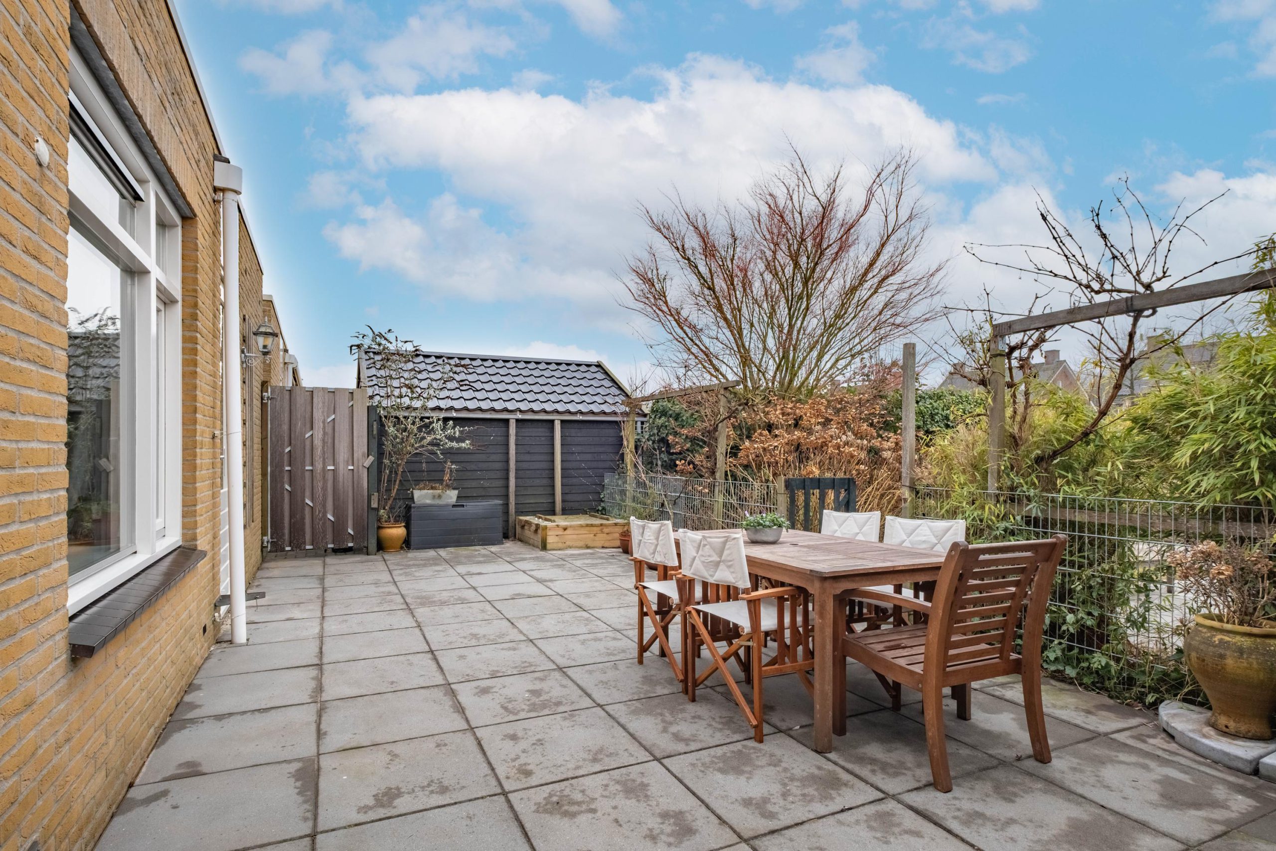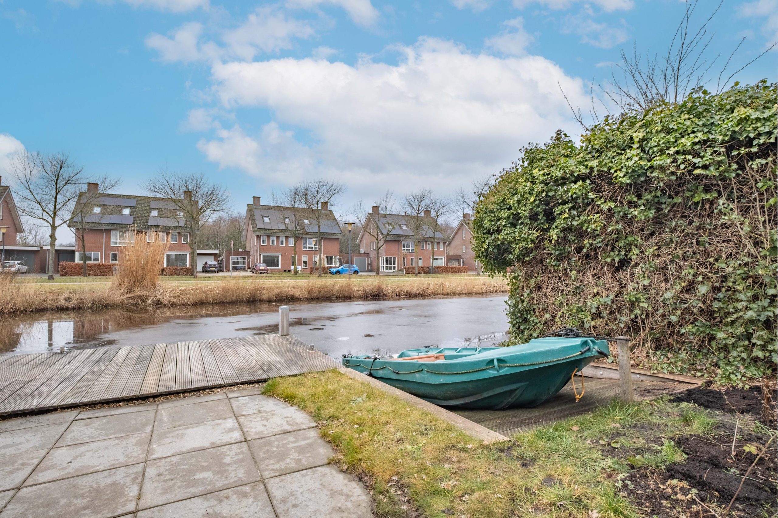 De achtertuin ligt gunstig op het westen en grenst direct aan open vaarwater. Met circa 10 meter eigen oever, steiger en een eigen helling om de boot uit het water te halen. Hier geniet je volop van de zon, water en rust.