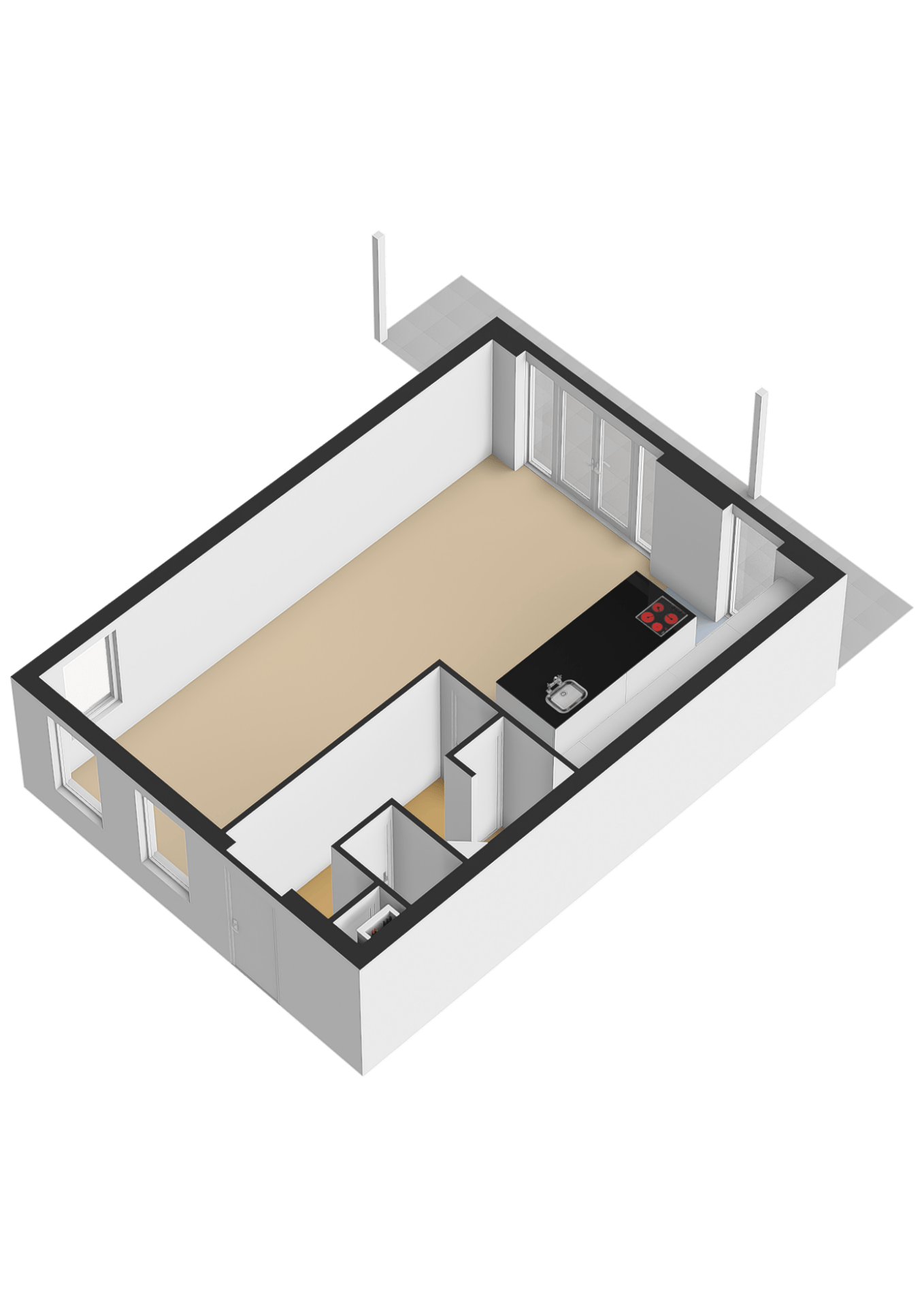 Via de entree kom je binnen in de hal met toilet, trapopgang en toegang tot de woonkamer. De woonkamer aan de voorzijde van de woning is een lichte en comfortabele leefruimte met grote ramen en prettig zicht op de straat.