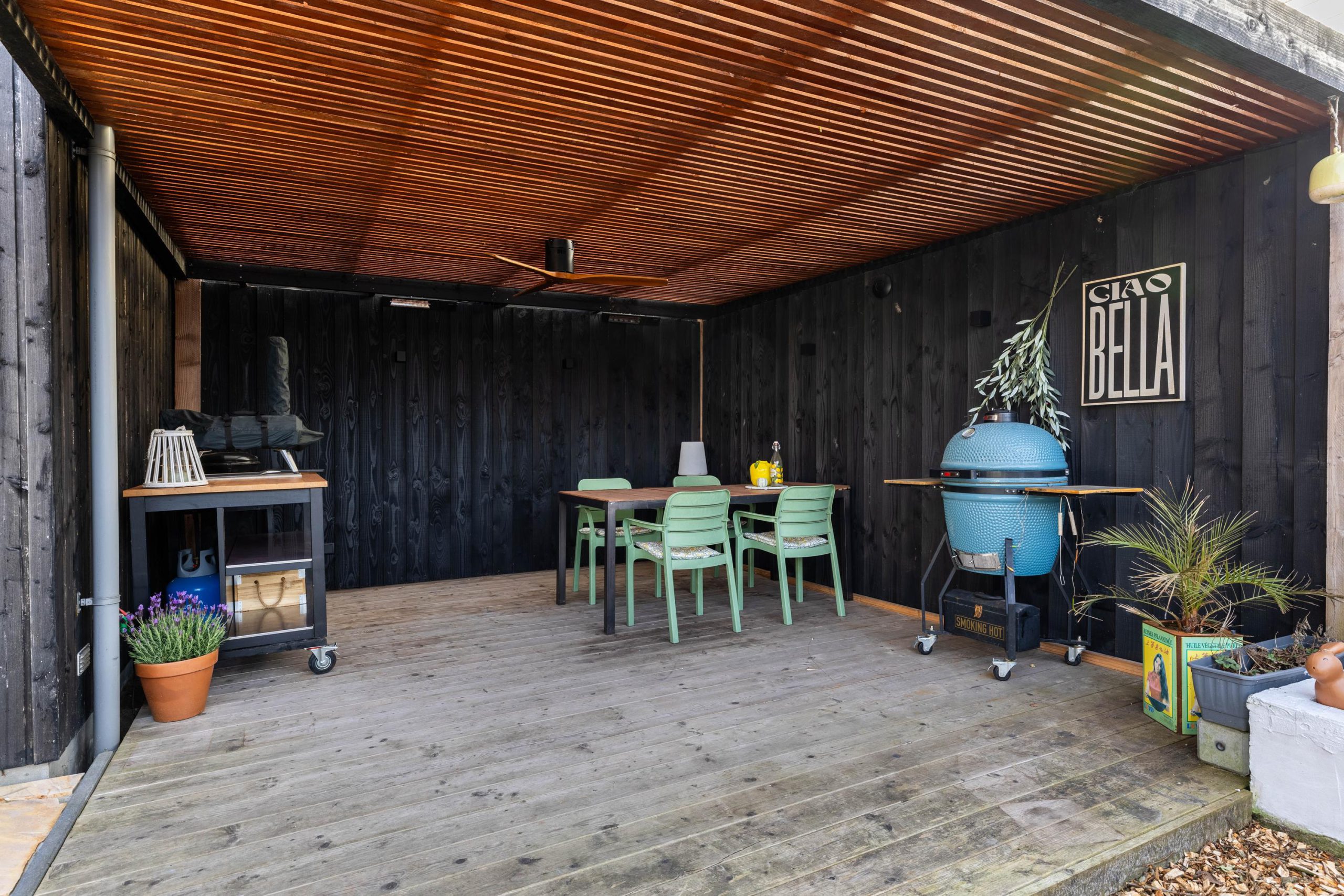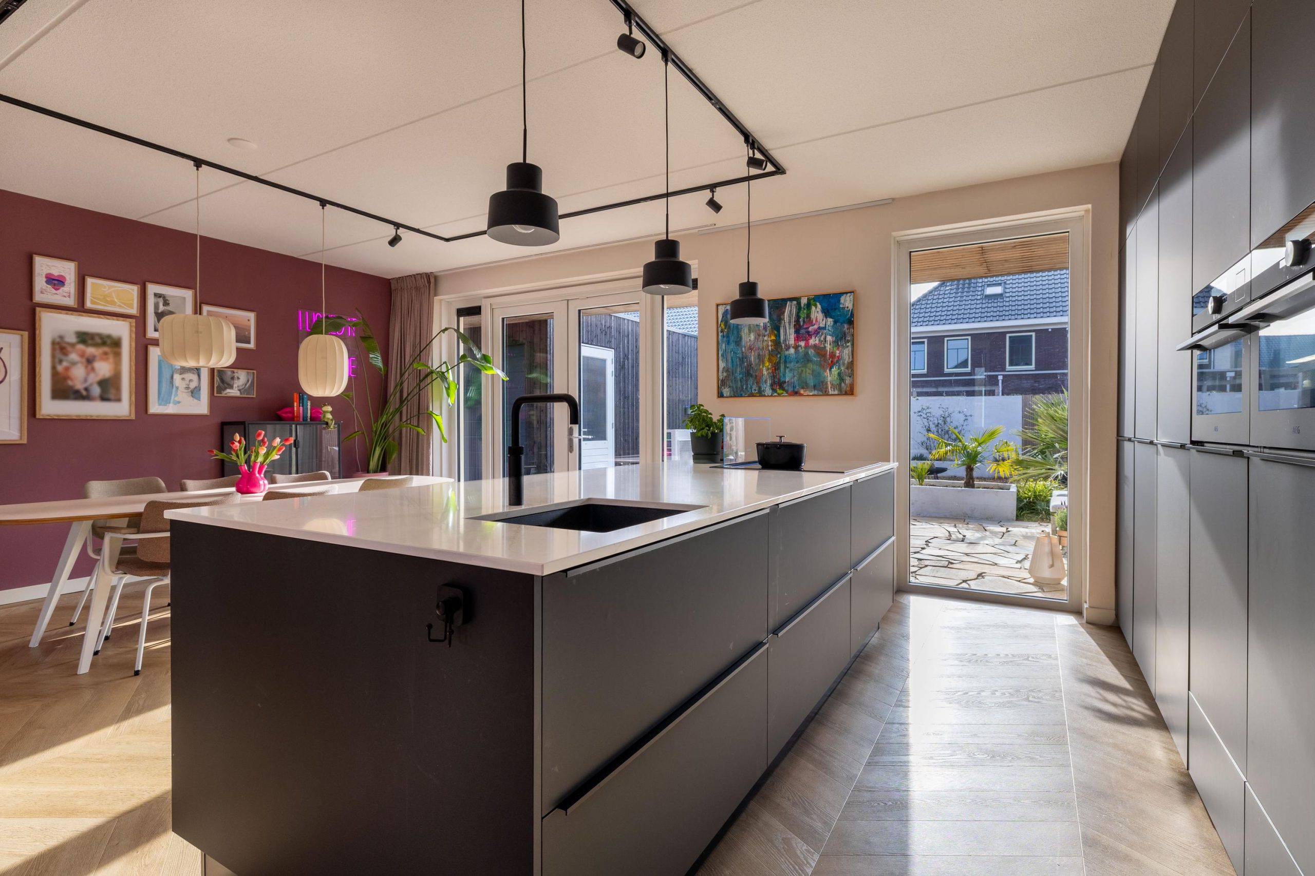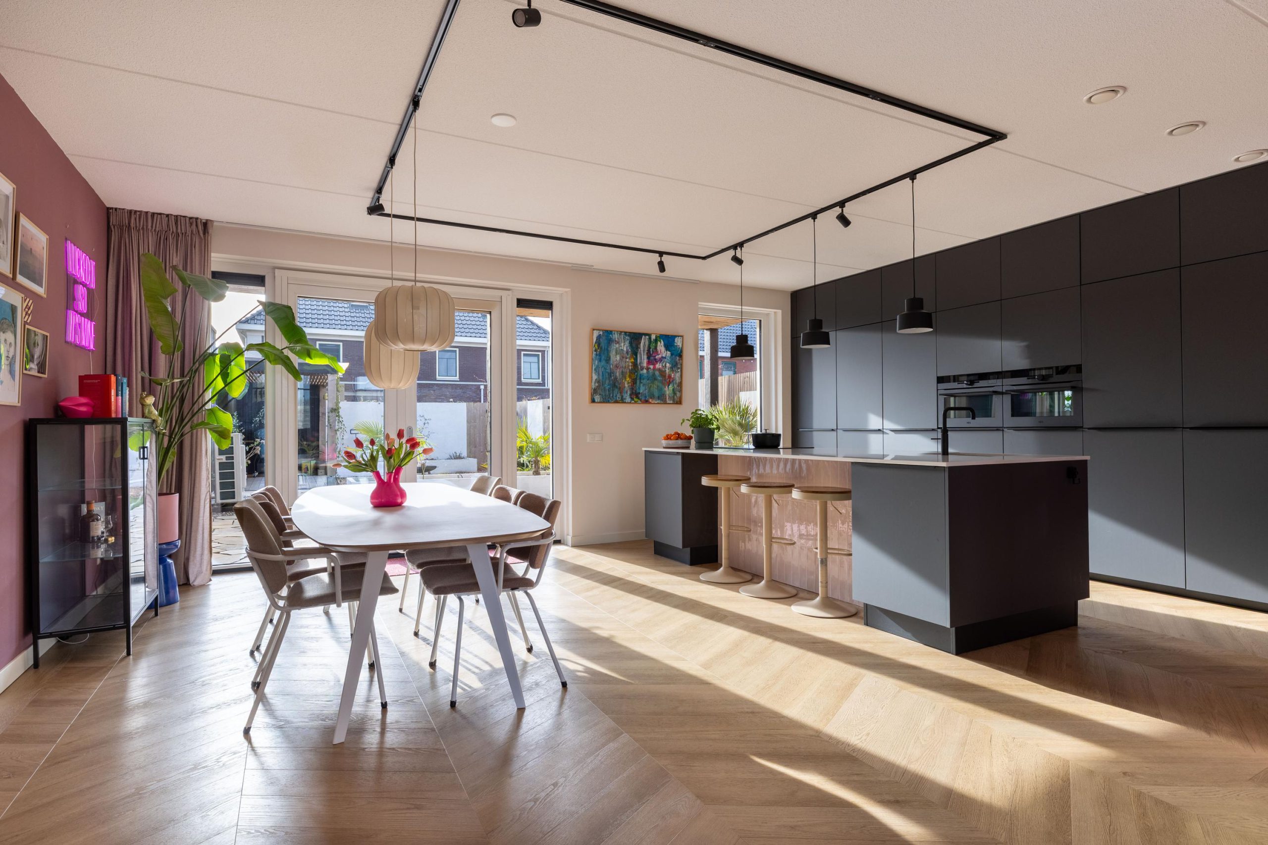 Aan de achterzijde bevindt zich de ruime woonkeuken met eetgedeelte, een echte blikvanger van de woning. De moderne keuken is strak vormgegeven en luxe uitgerust met hoogwaardige inbouwapparatuur, waaronder een Quooker, combi-oven, stoomoven en een unieke designafzuiging. Veel apparatuur is bovendien slim te bedienen via wifi. Dankzij de royale opzet is er volop ruimte voor een grote eettafel, waardoor dit de centrale plek van het huis vormt om te koken, eten en samen te komen. Via openslaande deuren heb je direct toegang tot de tuin.