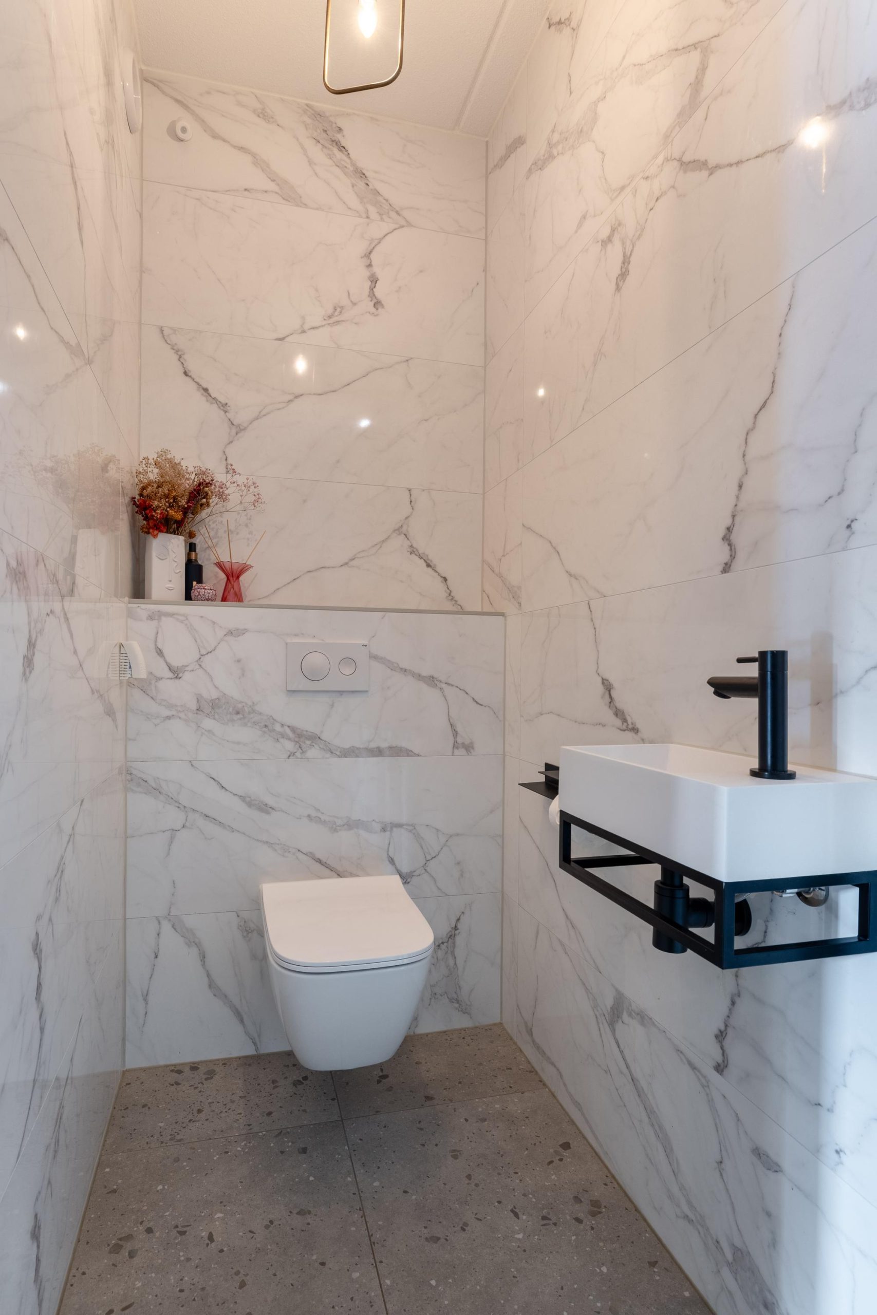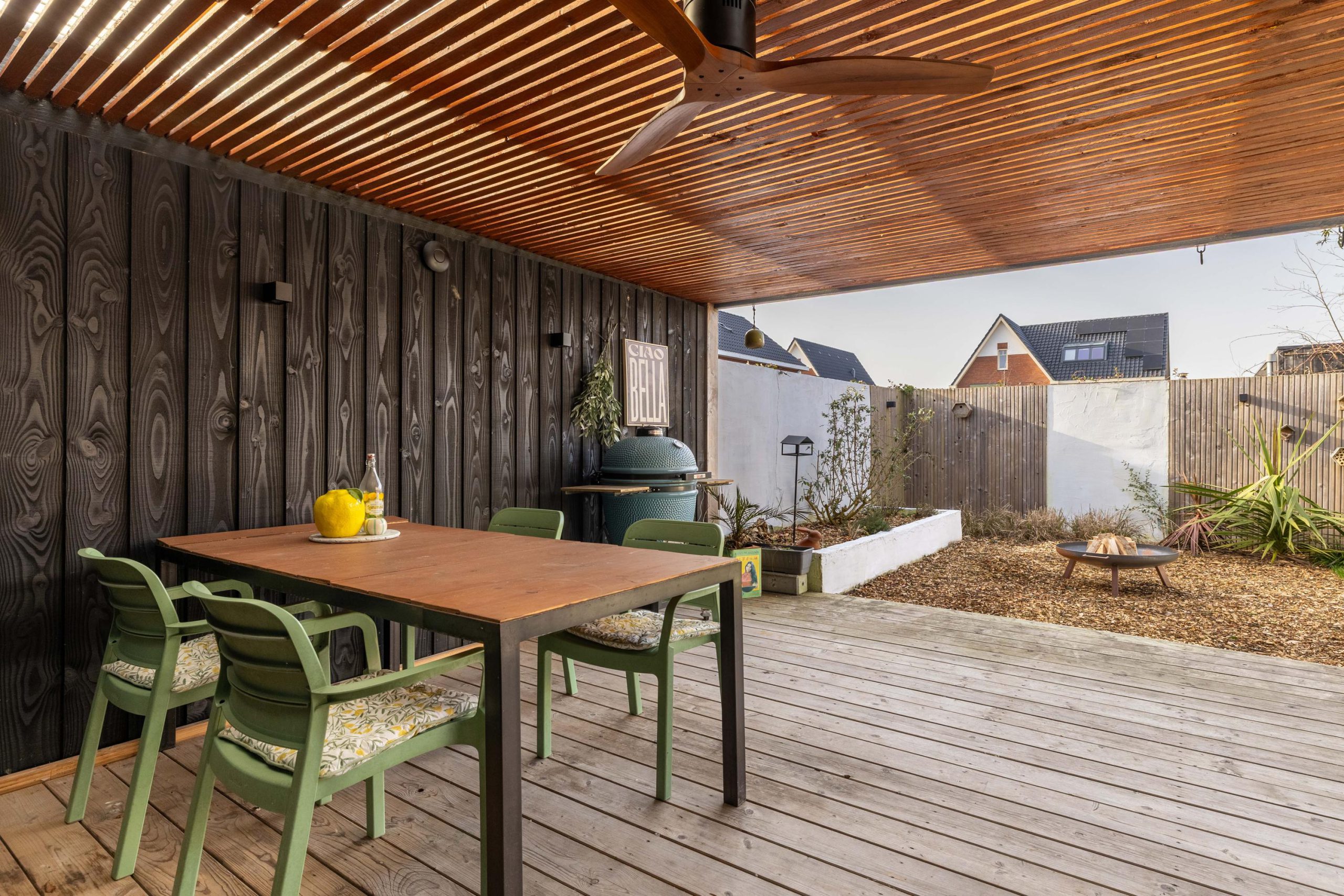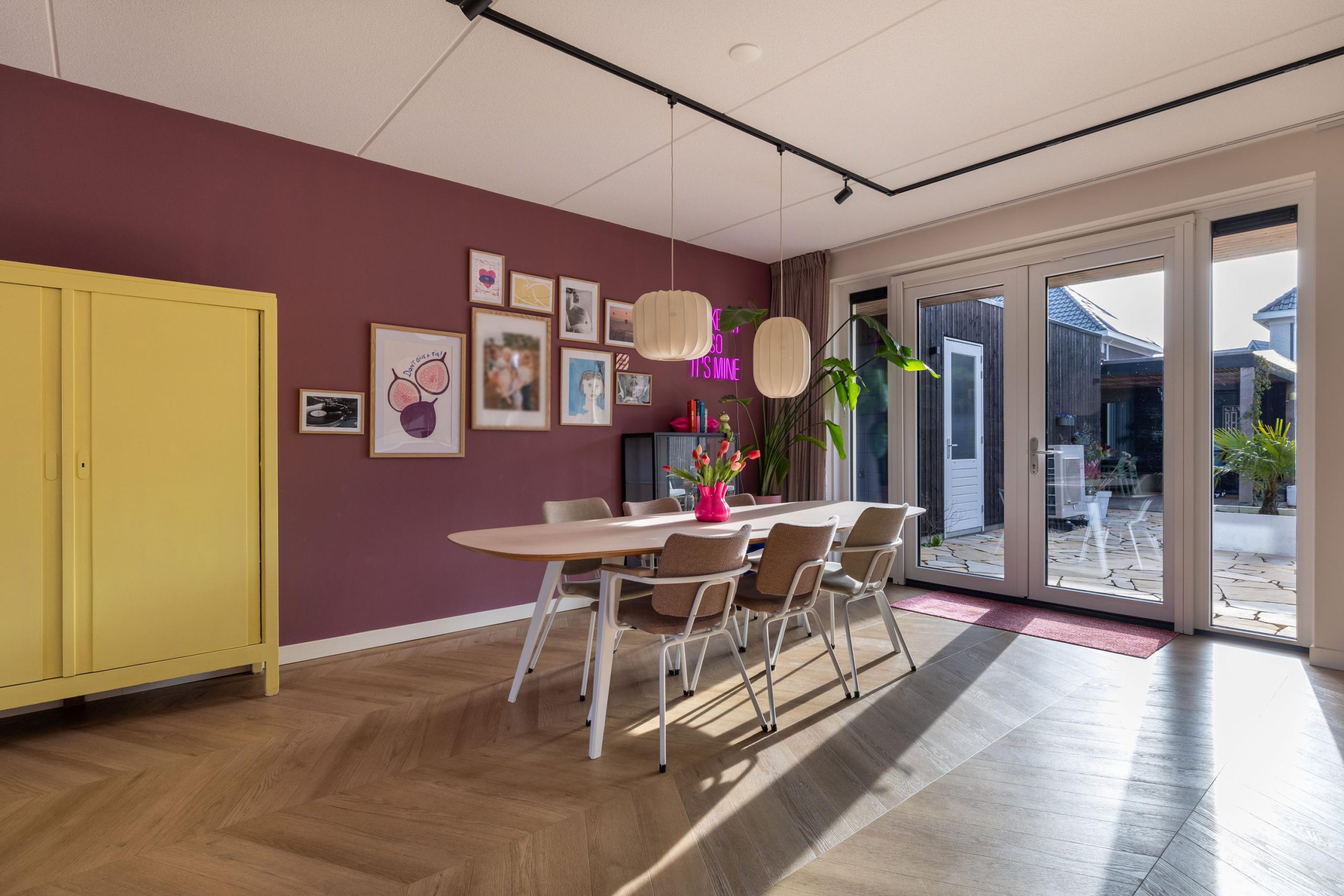 Aan de achterzijde bevindt zich de ruime woonkeuken met eetgedeelte, een echte blikvanger van de woning. De moderne keuken is strak vormgegeven en luxe uitgerust met hoogwaardige inbouwapparatuur, waaronder een Quooker, combi-oven, stoomoven en een unieke designafzuiging. Veel apparatuur is bovendien slim te bedienen via wifi. Dankzij de royale opzet is er volop ruimte voor een grote eettafel, waardoor dit de centrale plek van het huis vormt om te koken, eten en samen te komen. Via openslaande deuren heb je direct toegang tot de tuin.