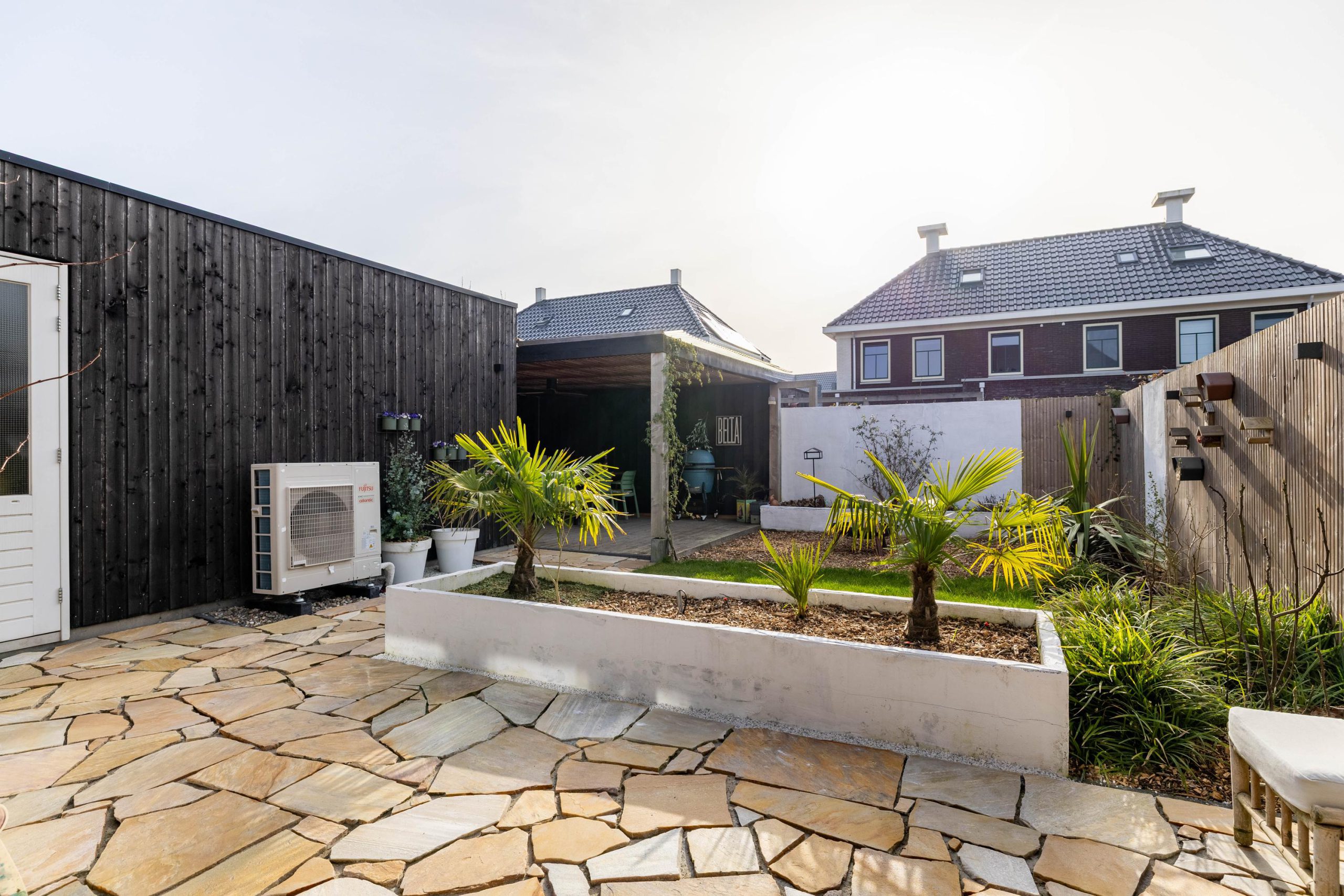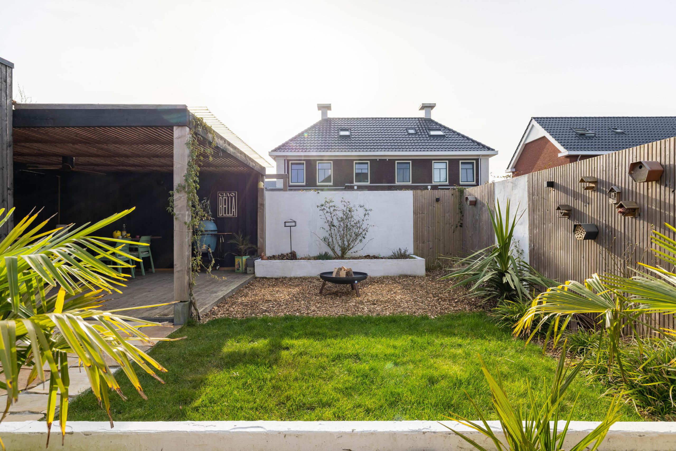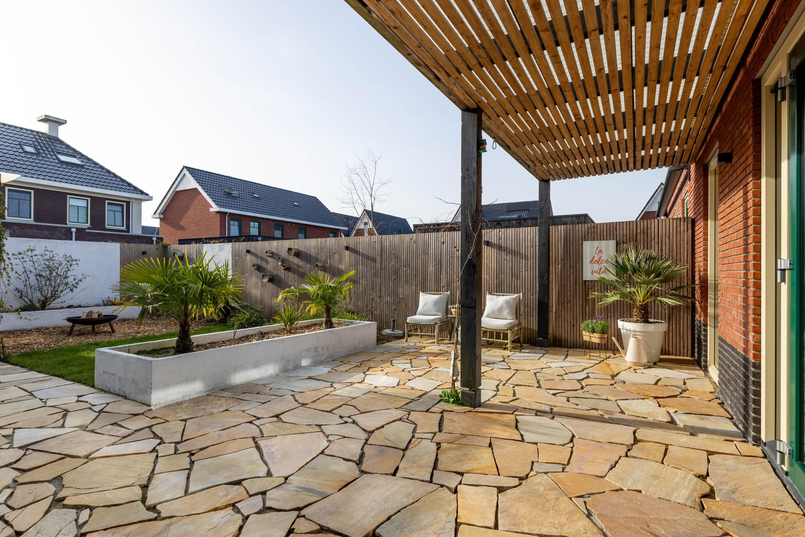 De achtertuin ligt gunstig op het zuidoosten en biedt volop zon. De tuin is netjes aangelegd in mediterrane stijl en biedt voldoende ruimte voor meerdere zitplekken. Vanuit de tuin heb je toegang tot de ruime garage met vliering en elektrische deur. Achter de garage bevindt zich bovendien een overkapping waar je in de middag en avond nog heerlijk kunt zitten.