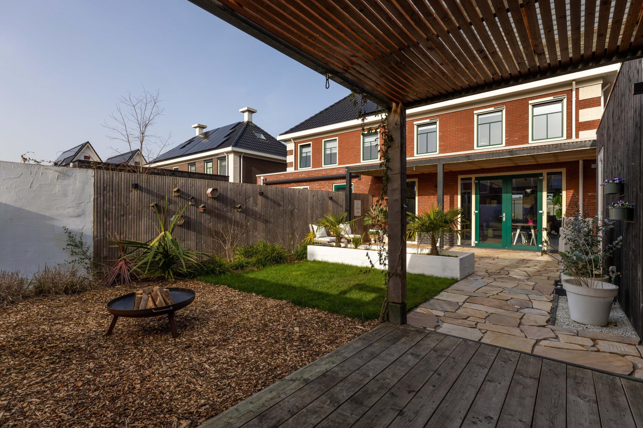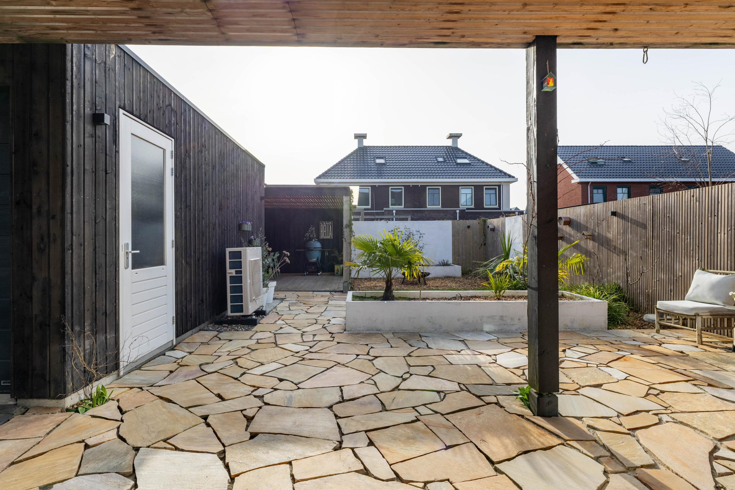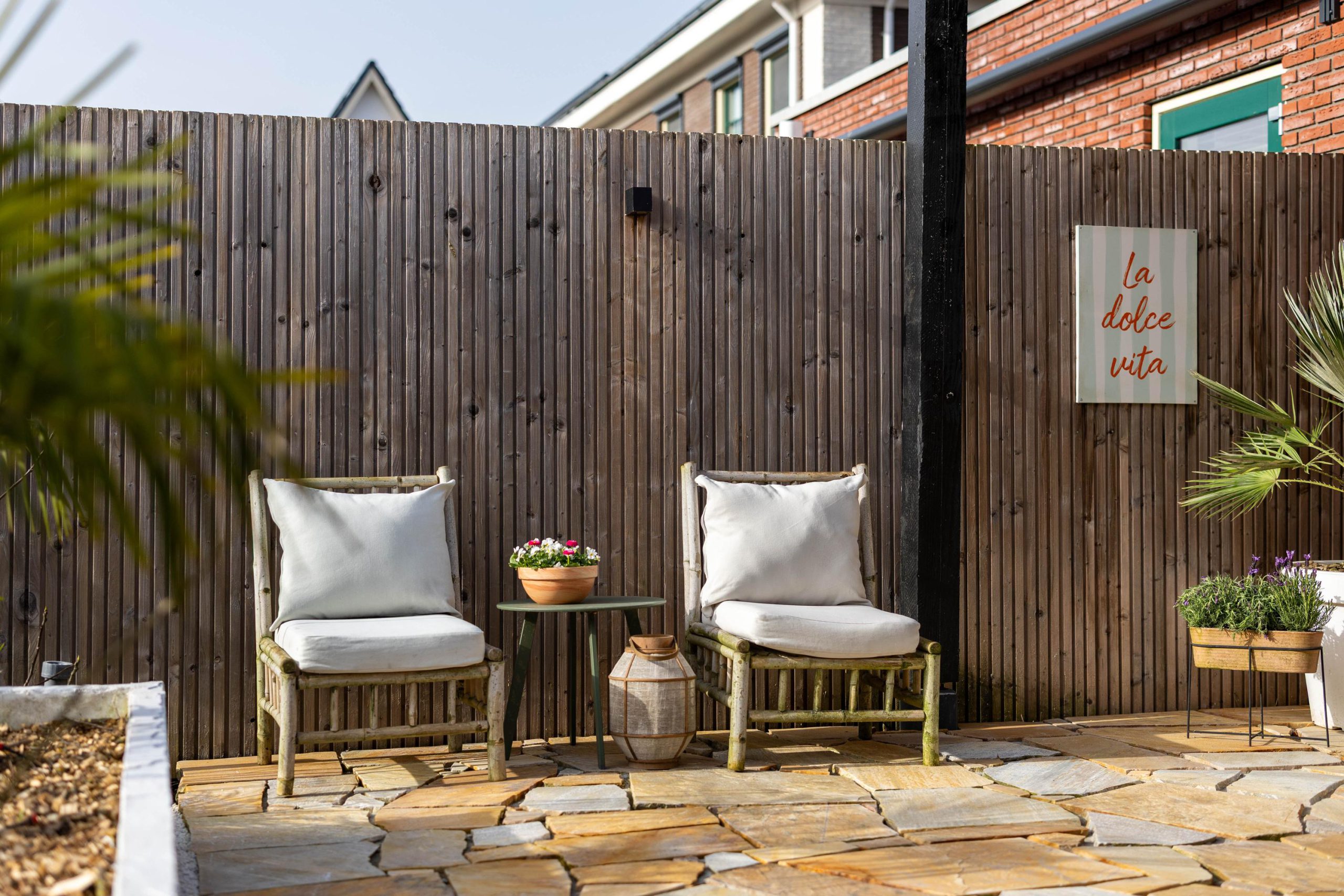 De achtertuin ligt gunstig op het zuidoosten en biedt volop zon. De tuin is netjes aangelegd in mediterrane stijl en biedt voldoende ruimte voor meerdere zitplekken. Vanuit de tuin heb je toegang tot de ruime garage met vliering en elektrische deur. Achter de garage bevindt zich bovendien een overkapping waar je in de middag en avond nog heerlijk kunt zitten.