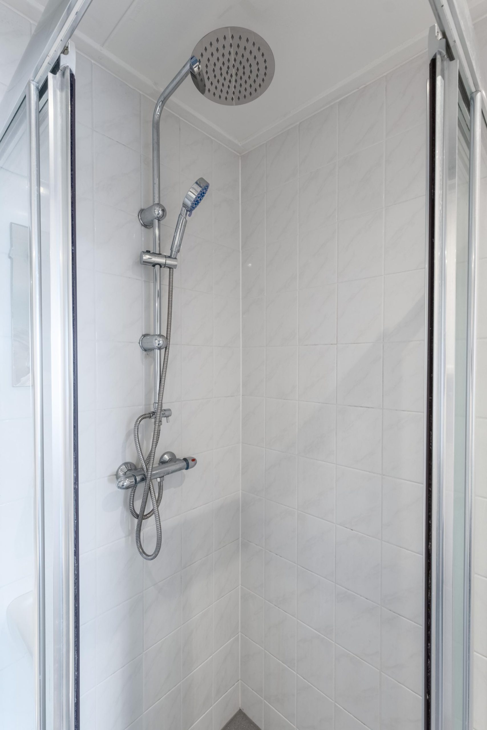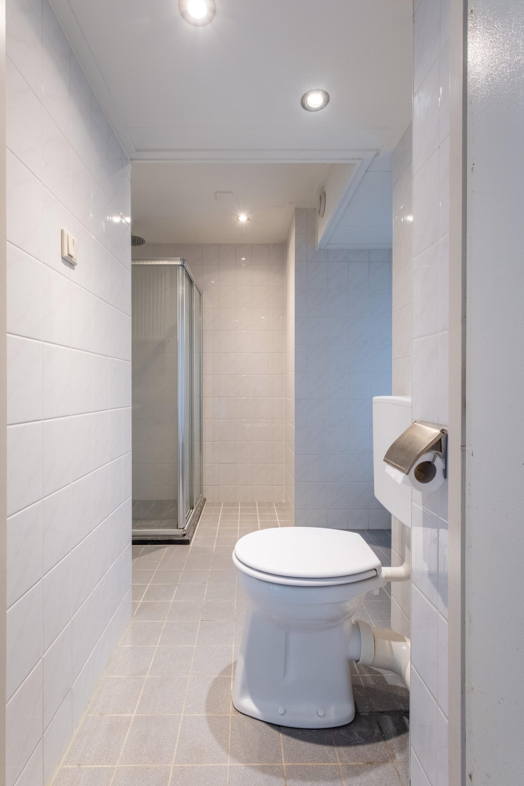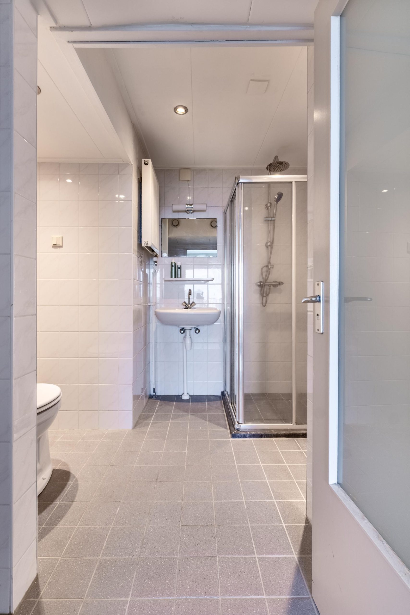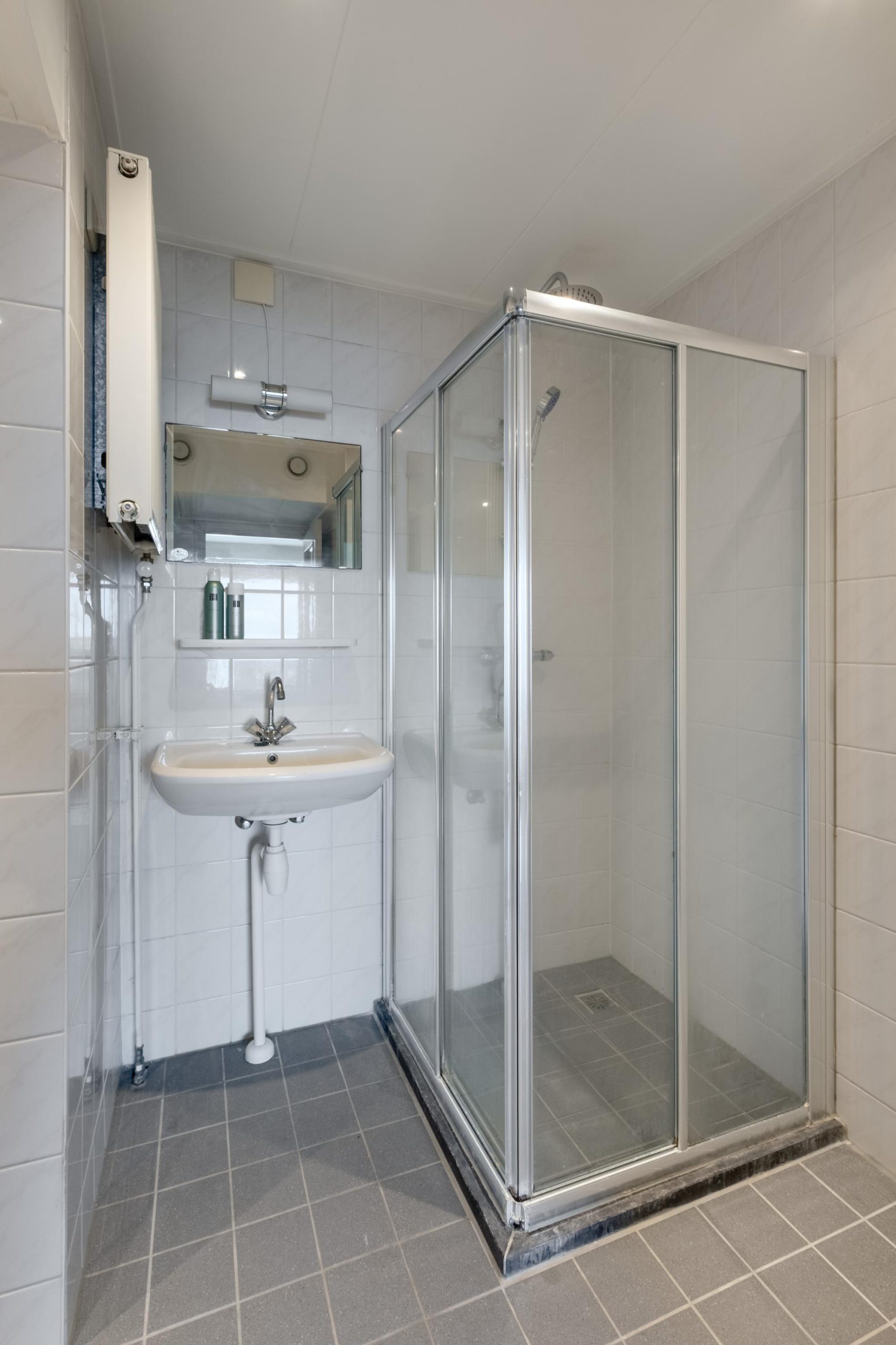 De slaapkamer grenst aan de woonkamer. Vanuit hier bereik je direct de badkamer, die ook via de hal toegankelijk is. De badkamer is compleet met douche, wastafel, toilet en een aansluiting voor de wasmachine.