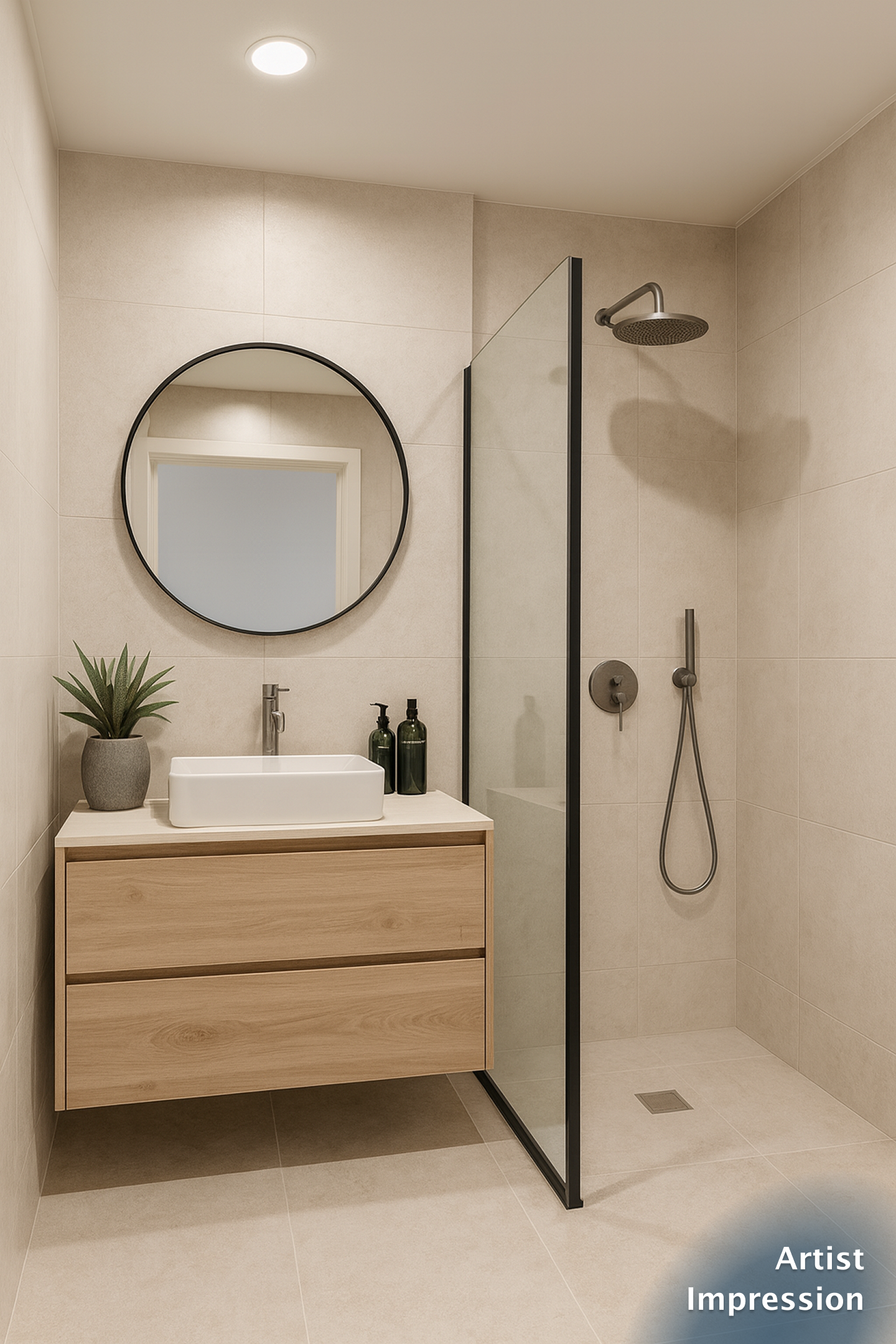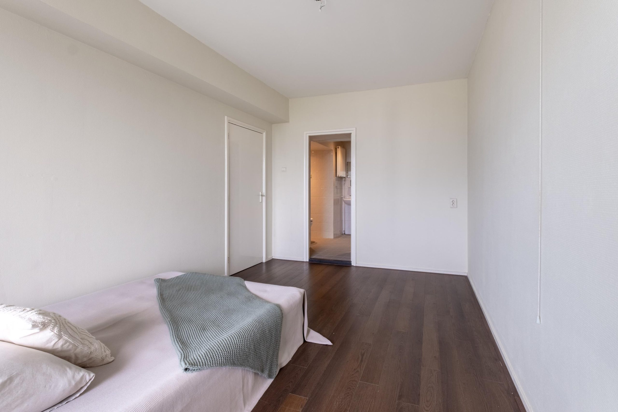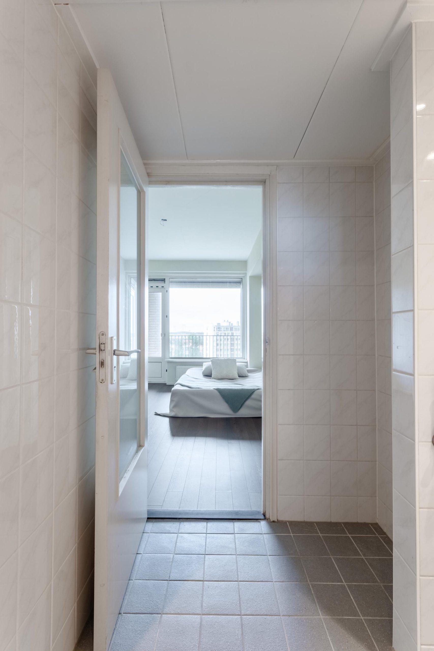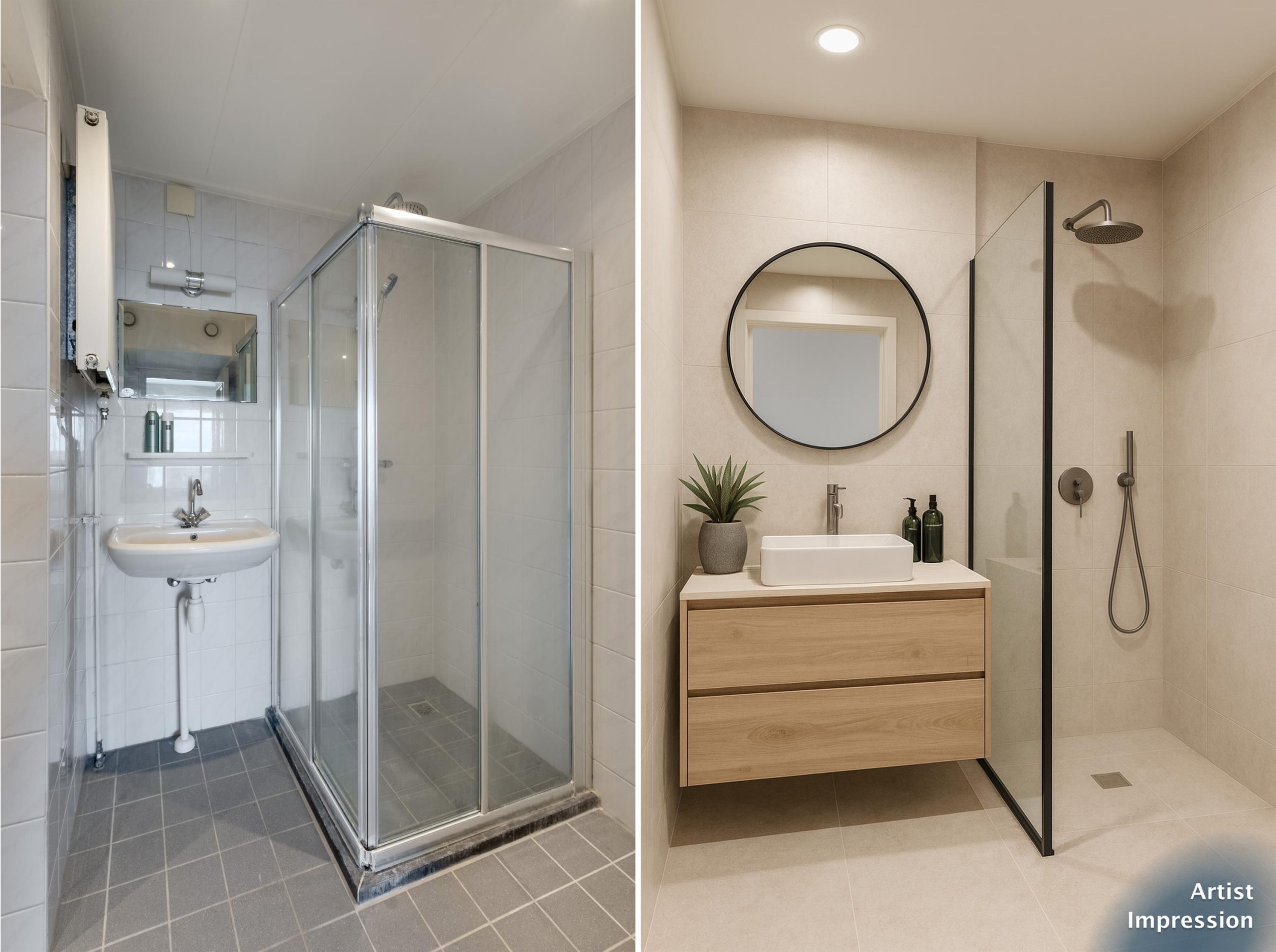 De slaapkamer grenst aan de woonkamer. Vanuit hier bereik je direct de badkamer, die ook via de hal toegankelijk is. De badkamer is compleet met douche, wastafel, toilet en een aansluiting voor de wasmachine.